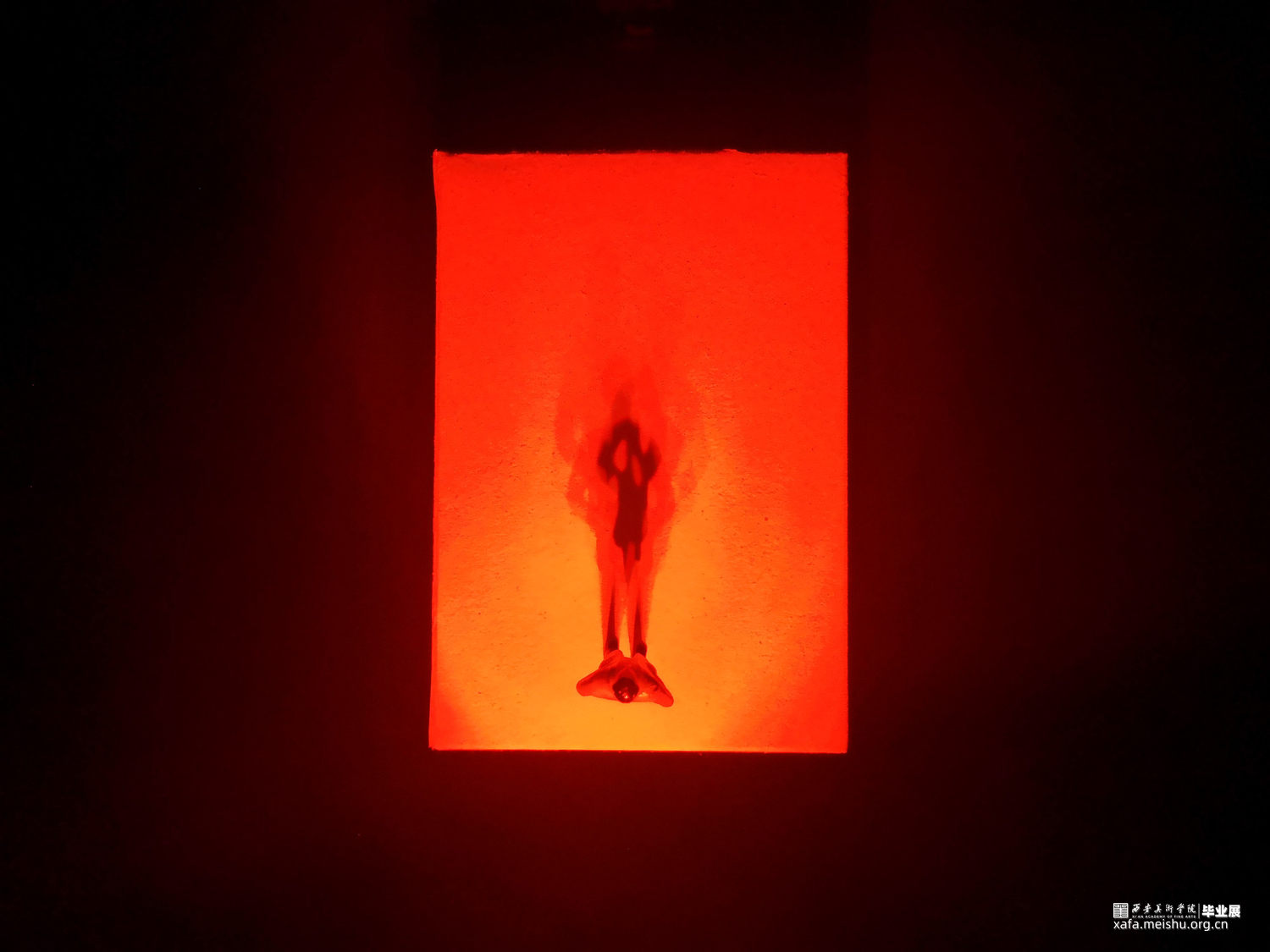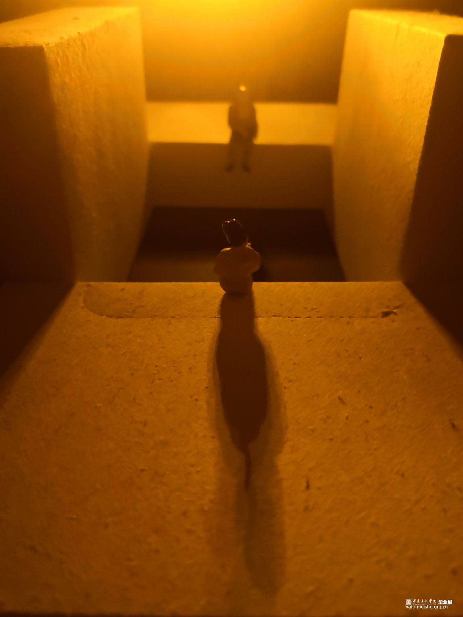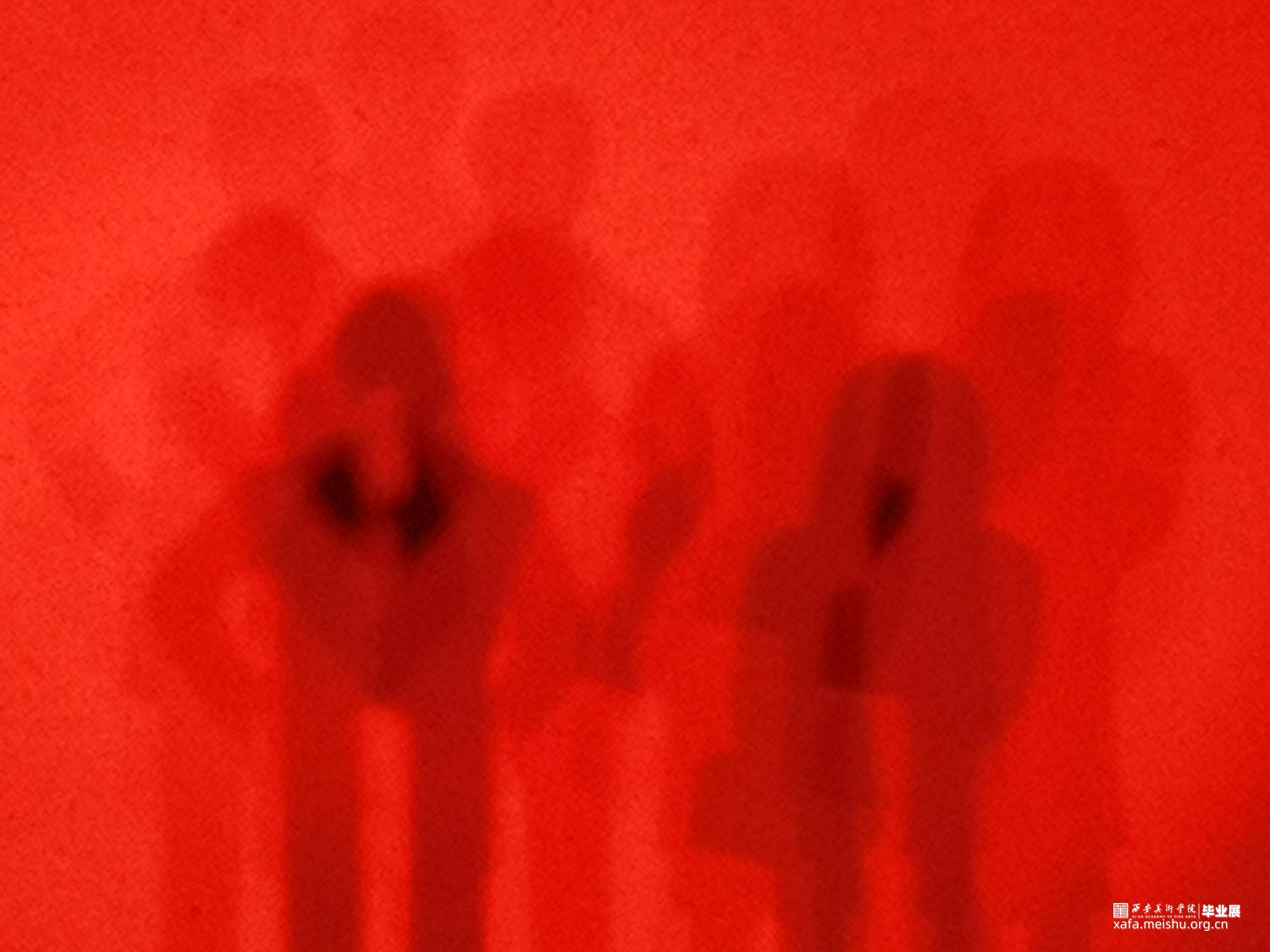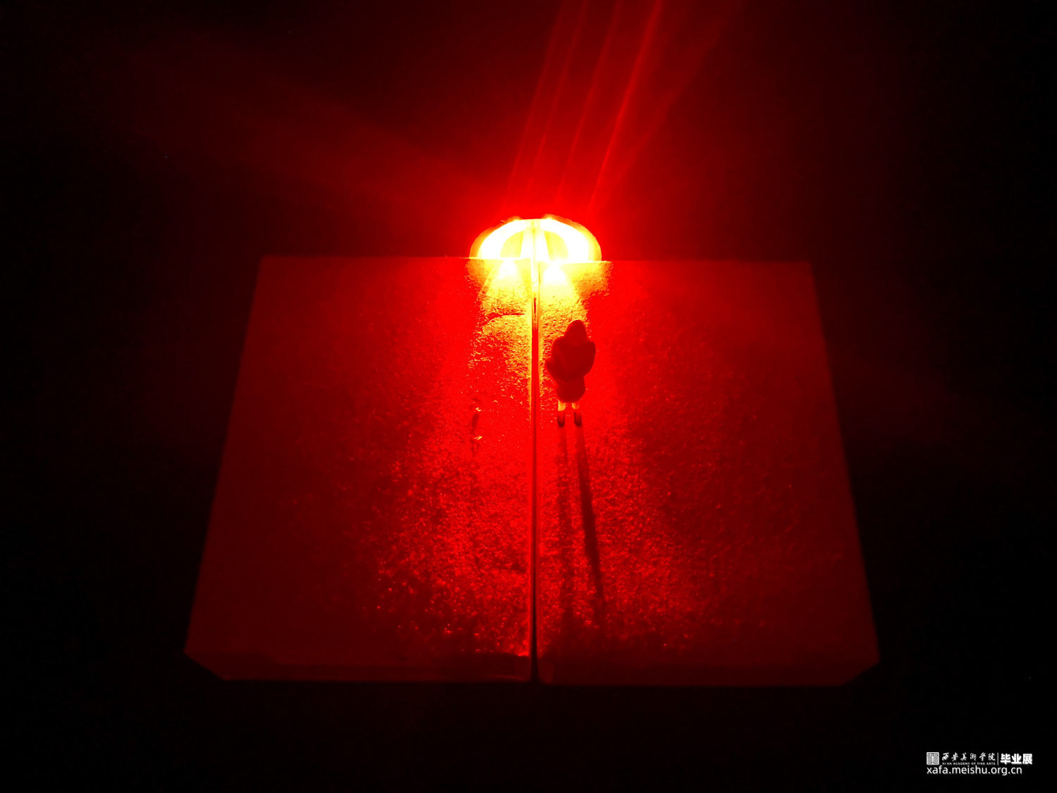 纸盒、小人与光影是折纸与纸盒的延伸实验,红色的灯光是我借用我爸铁路上使用的三色信号手电筒中红色的灯照射而形成的光影,红色在交通信号里代表禁止通行,红色同样具有强烈的视觉效果和使人兴奋的扩张色,在折纸与纸盒中我是用纸张本来的颜色去形成统一的人和人之间的关系,当颜色进入的时候,纸盒本身变得通透起来,人物关系在画面的氛围中显得有人情味道,同时又放大了疏离感。
