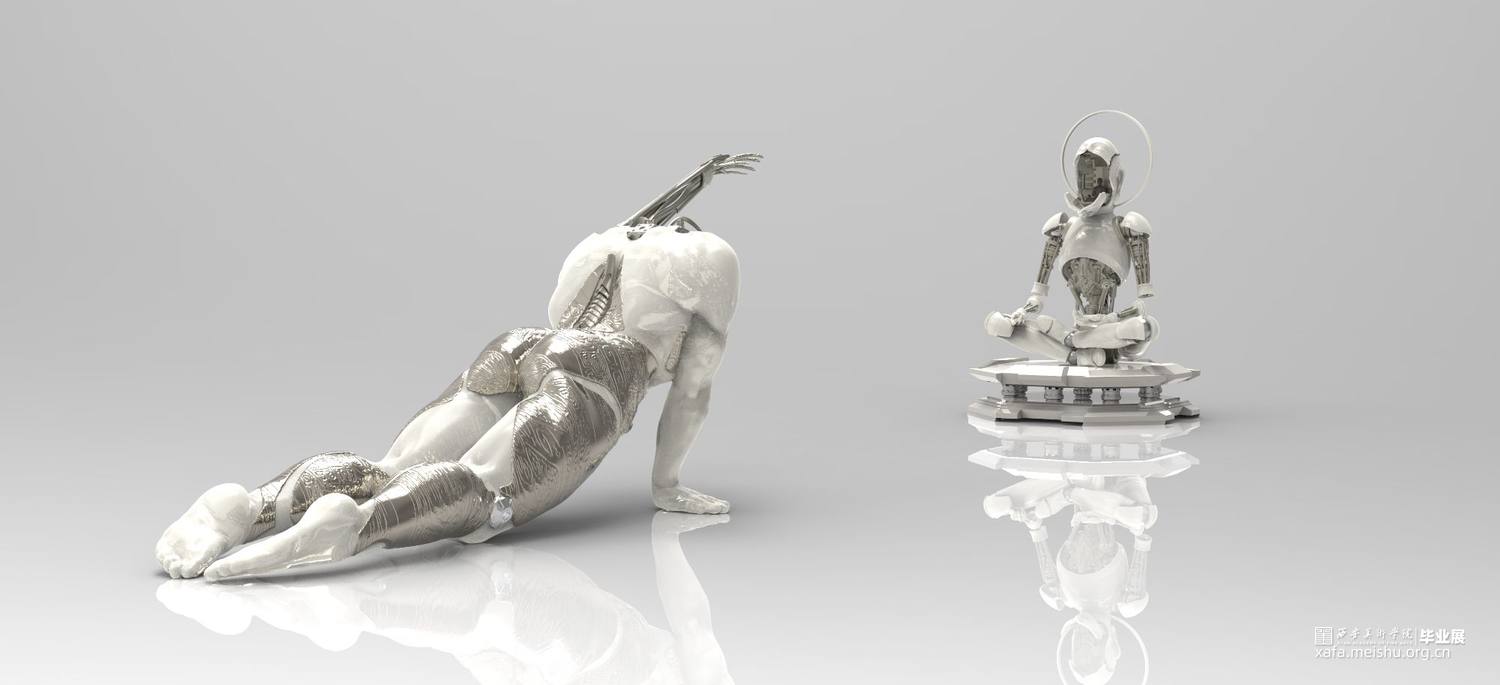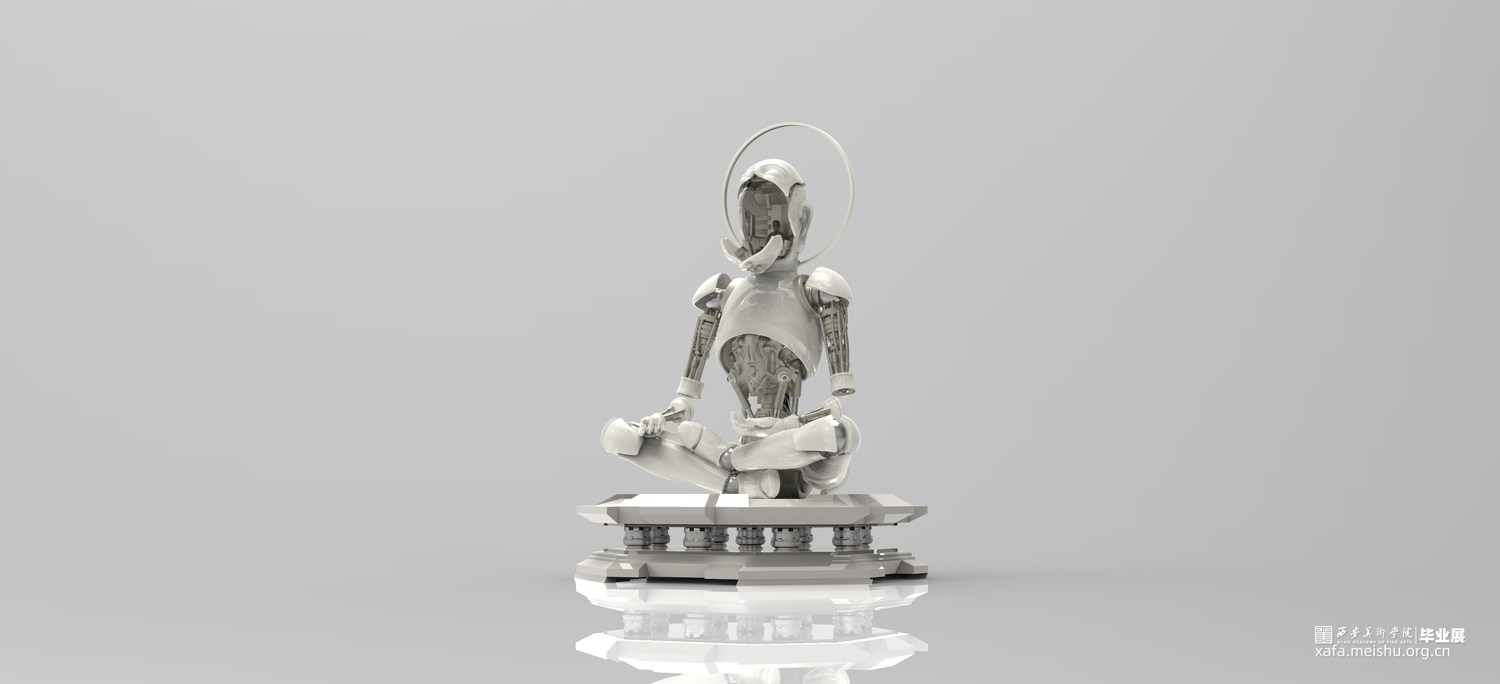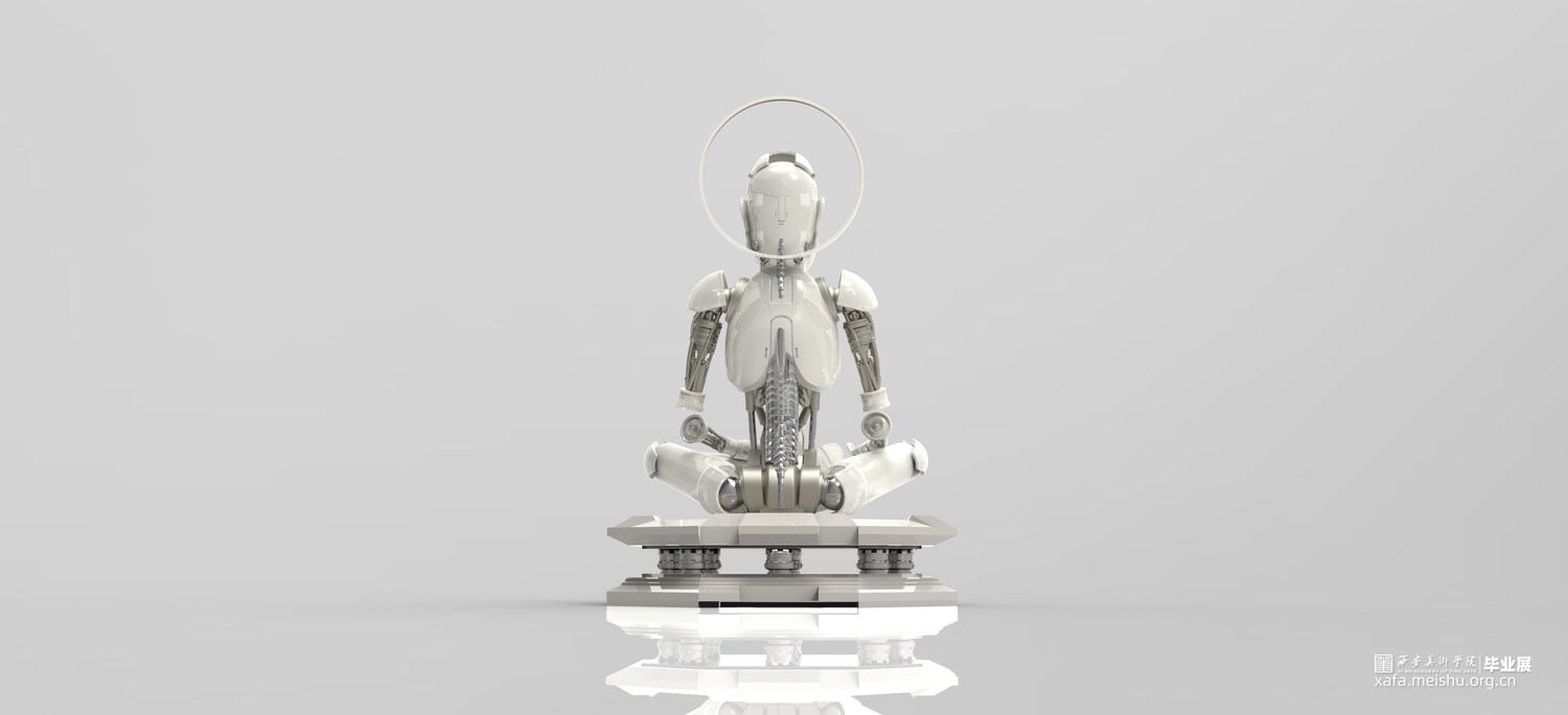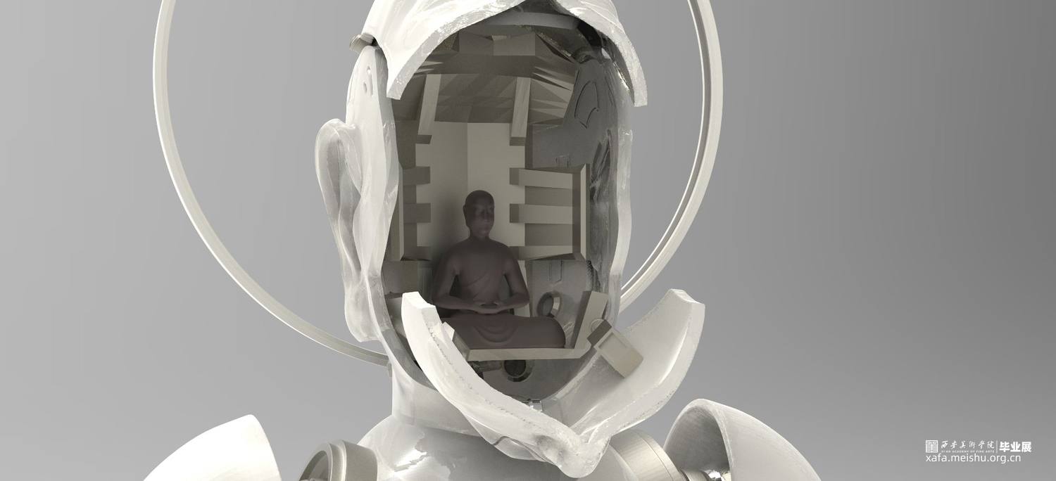 一个改造机械人拜向一尊机械坐佛,机械坐佛的脸部打开,一尊传统佛像坐于其中。传统佛像代表内在,表现为思想,而机械部件代表外在,表现为技术。法性之理圆融于诸现象中,任何技术的内核都是思想。