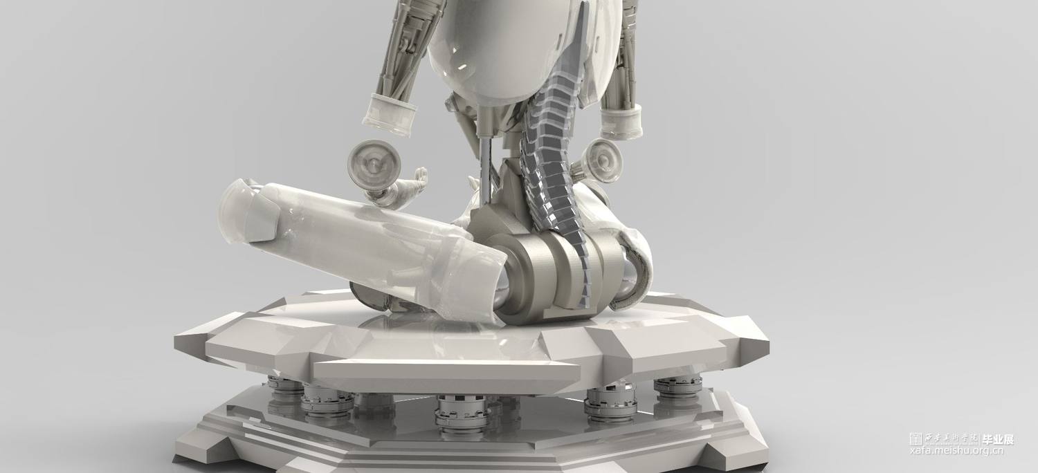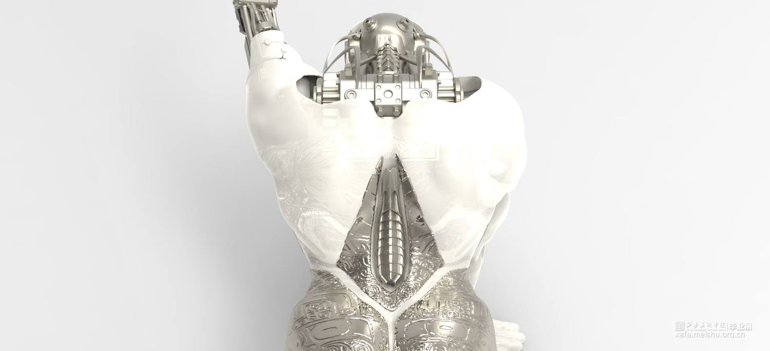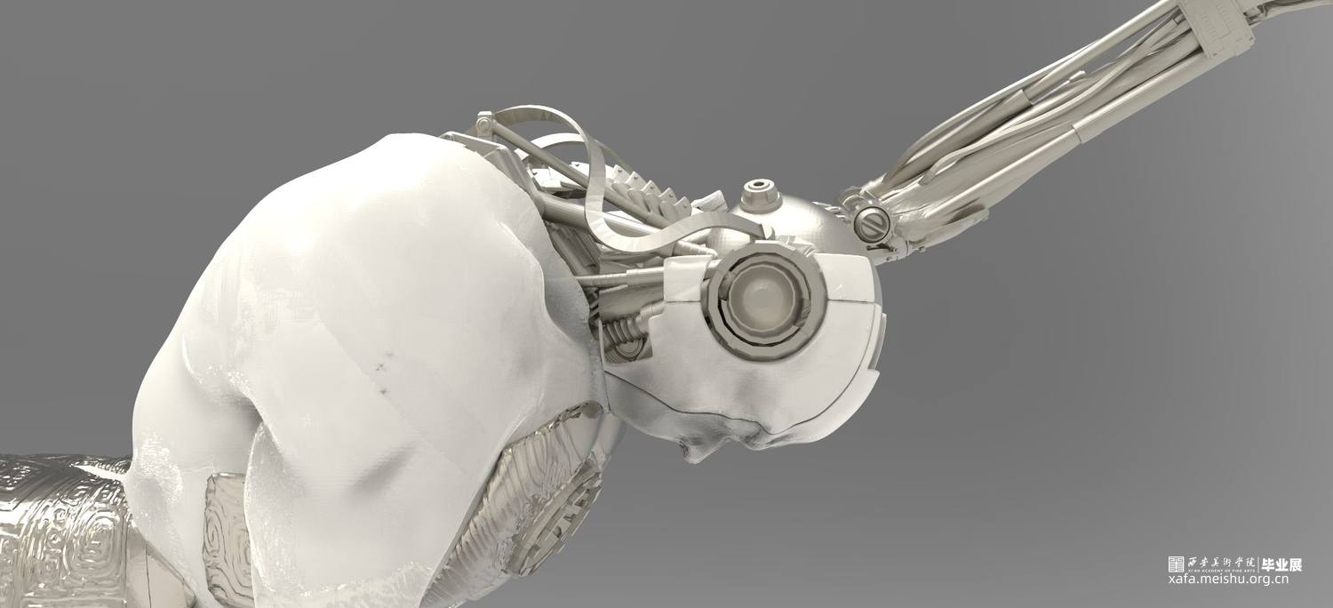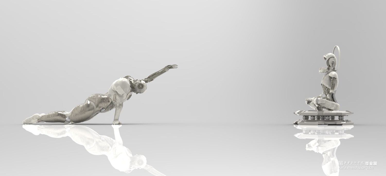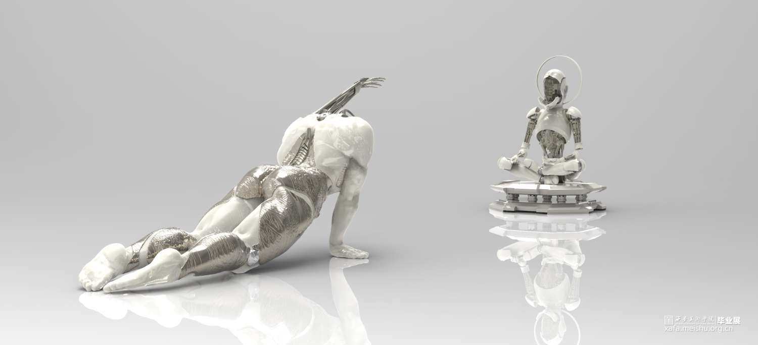 一个改造机械人拜向一尊机械坐佛,机械坐佛的脸部打开,一尊传统佛像坐于其中。传统佛像代表内在,表现为思想,而机械部件代表外在,表现为技术。法性之理圆融于诸现象中,任何技术的内核都是思想。