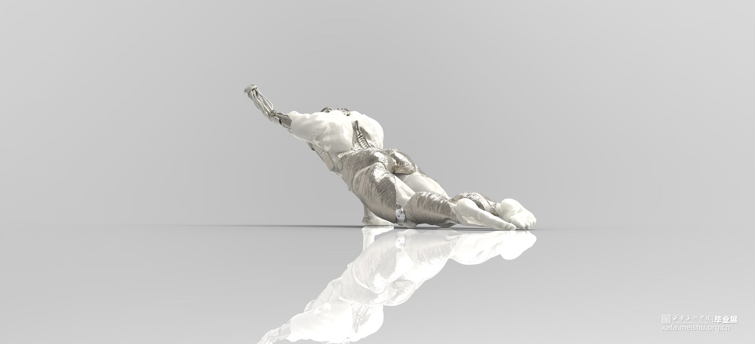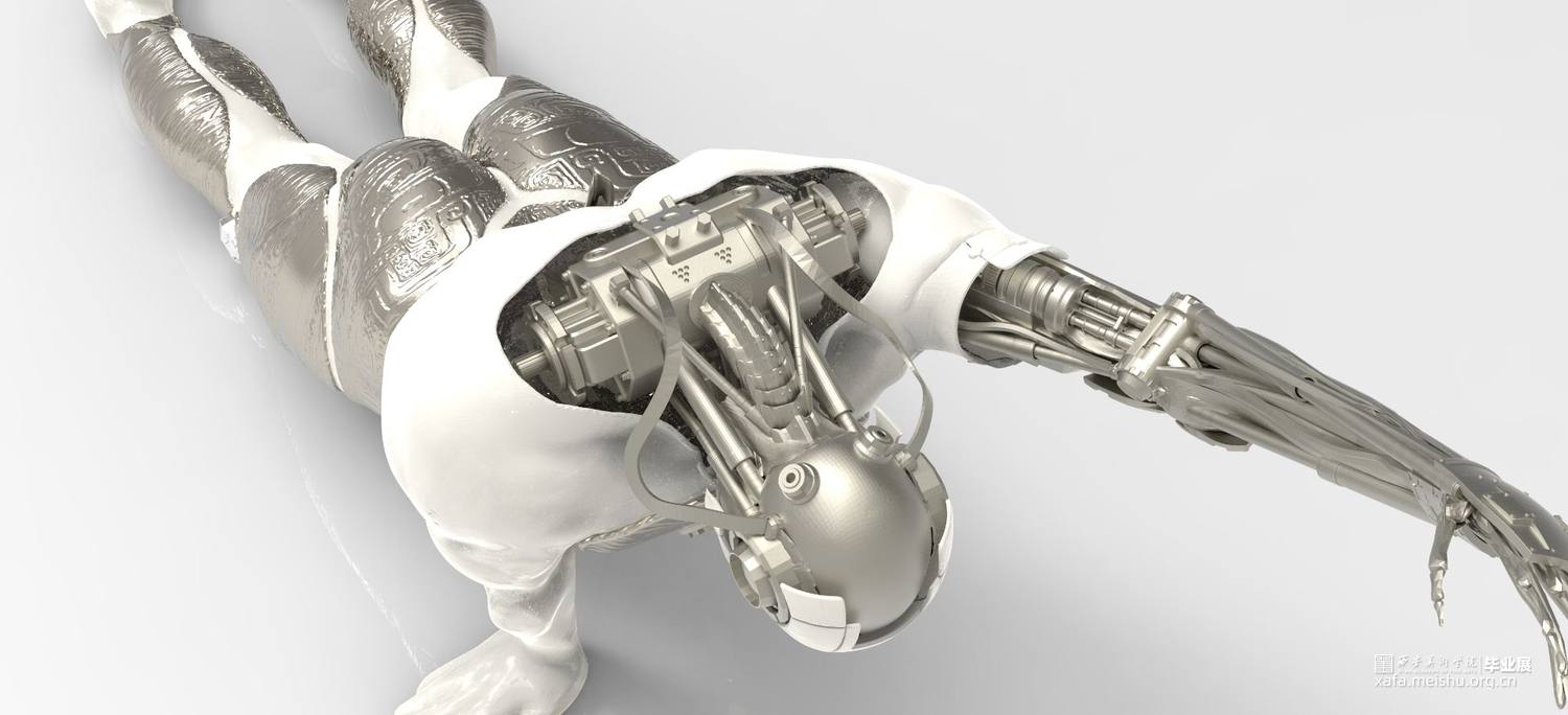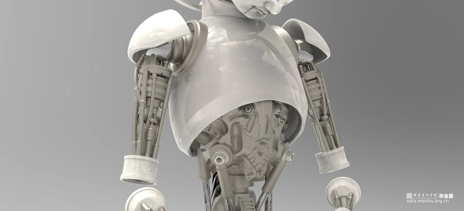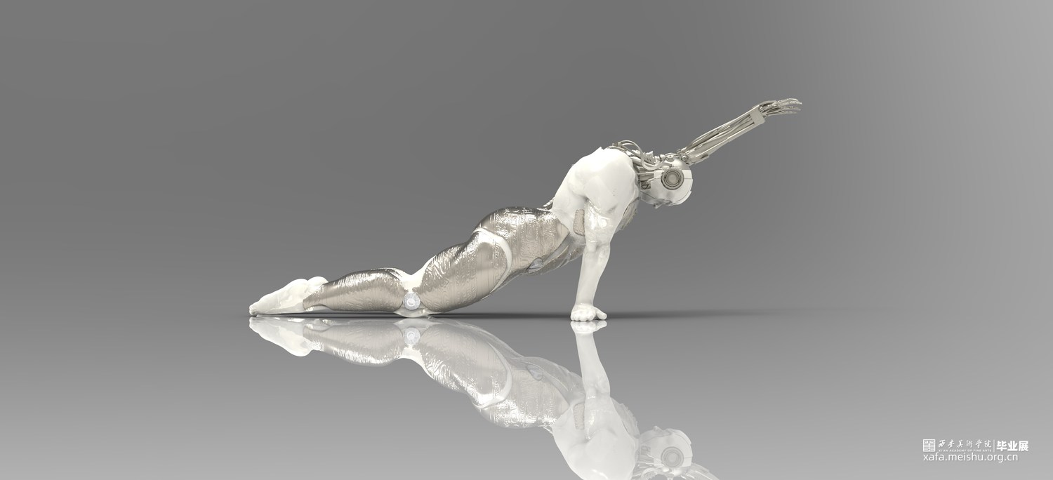 一个改造机械人拜向一尊机械坐佛,机械坐佛的脸部打开,一尊传统佛像坐于其中。传统佛像代表内在,表现为思想,而机械部件代表外在,表现为技术。法性之理圆融于诸现象中,任何技术的内核都是思想。