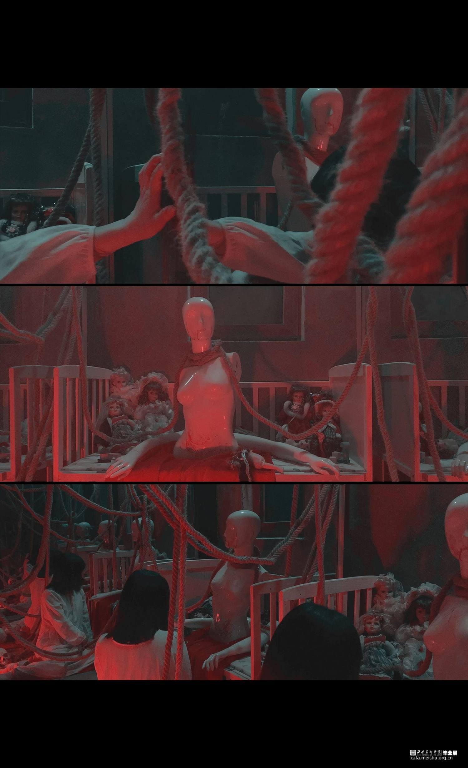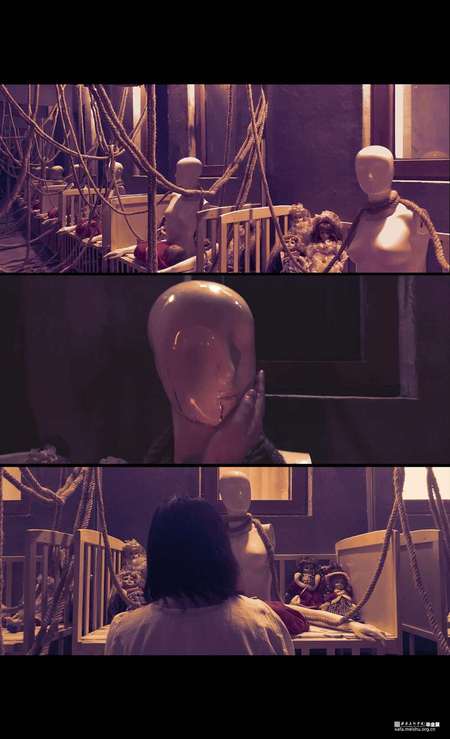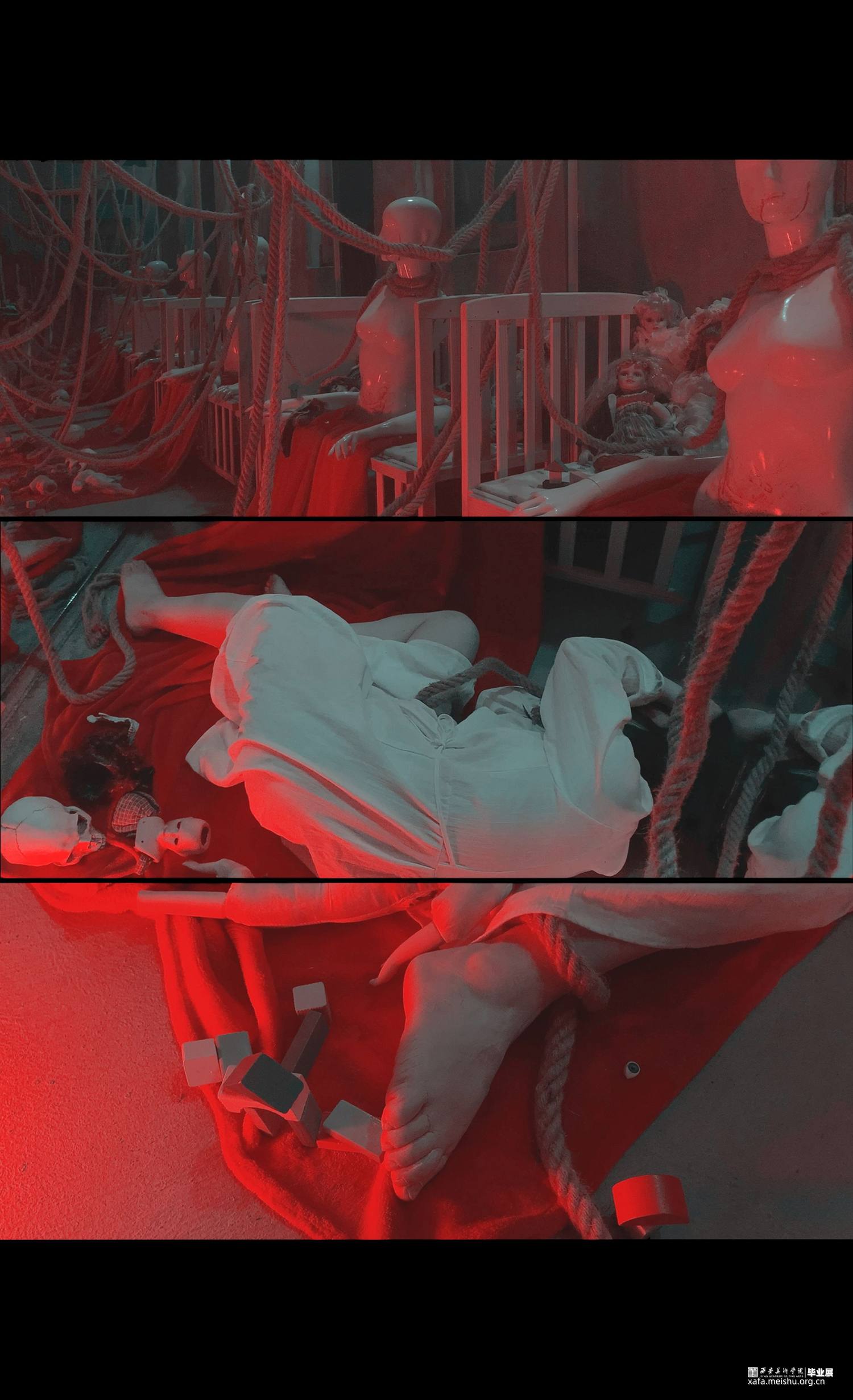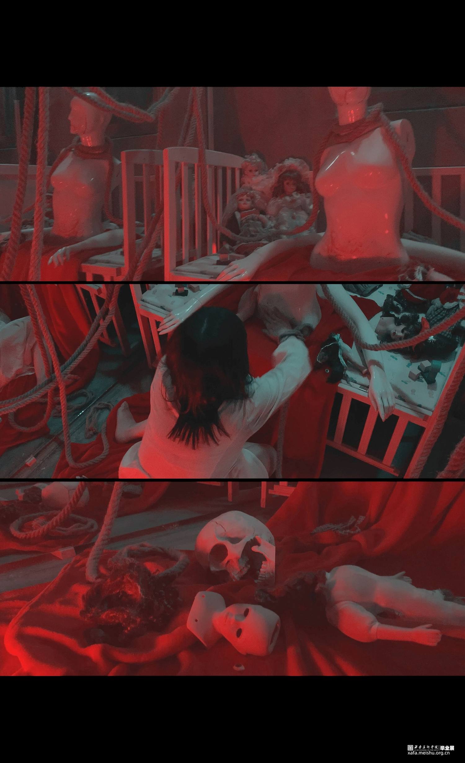 装置部分:狭小密闭的空间被相对而立的巨大镜面无限延伸,使自由看似触手可及,实则无法实际突破。交叠的绳索在镜面空间中越发错综凌乱,将母亲束缚的支离破碎,无力逃离,而满地残碎的玩偶又无时不提醒着她失去的无尽痛苦。
