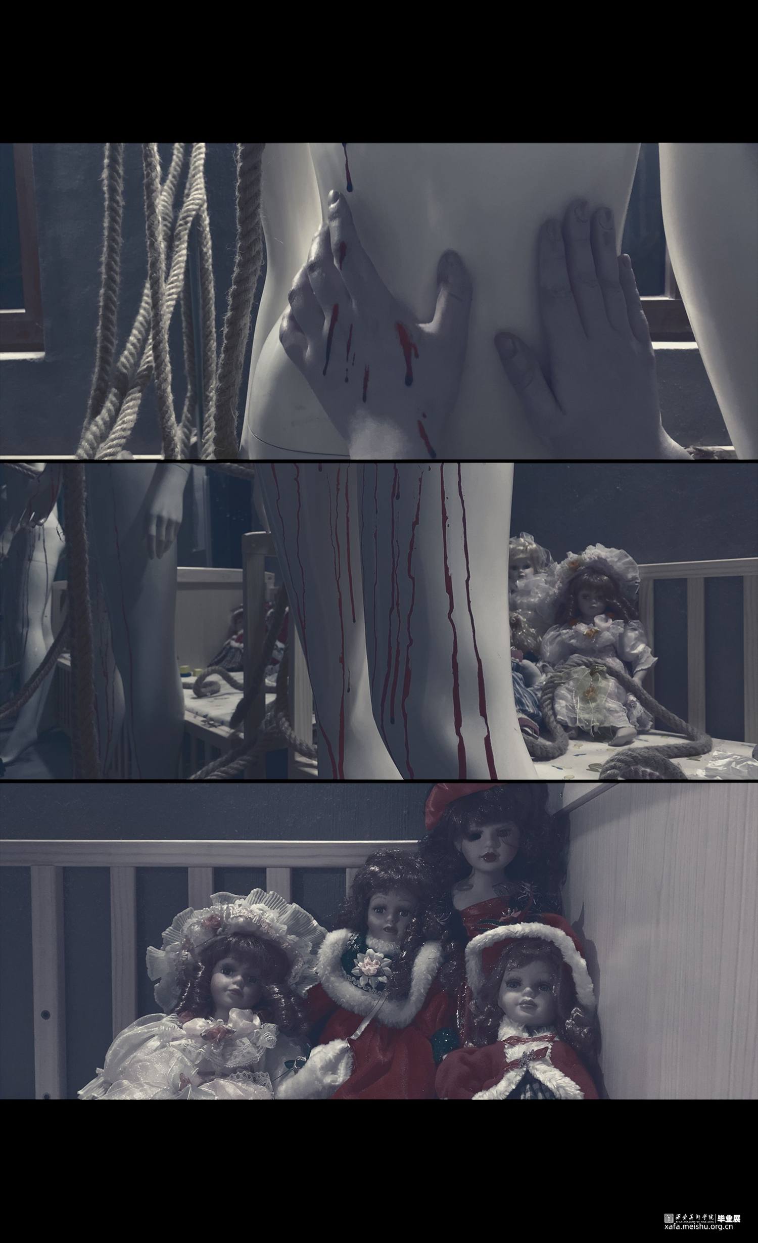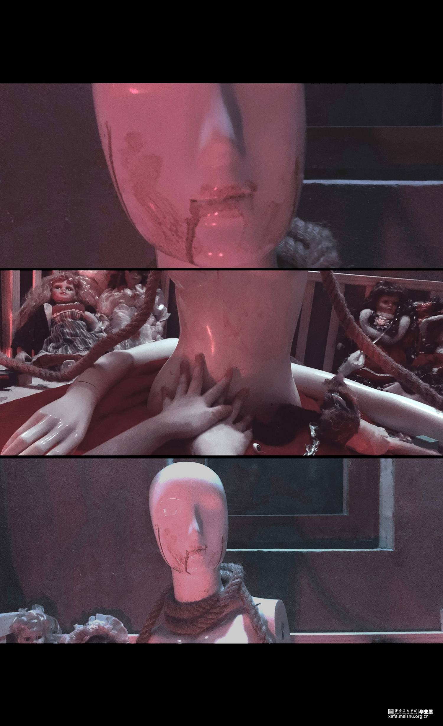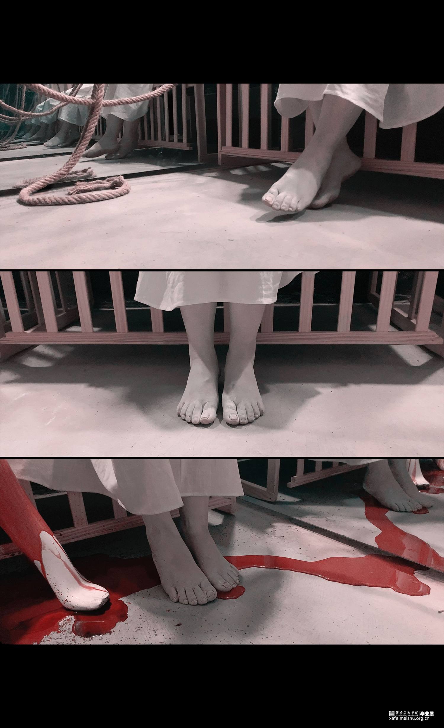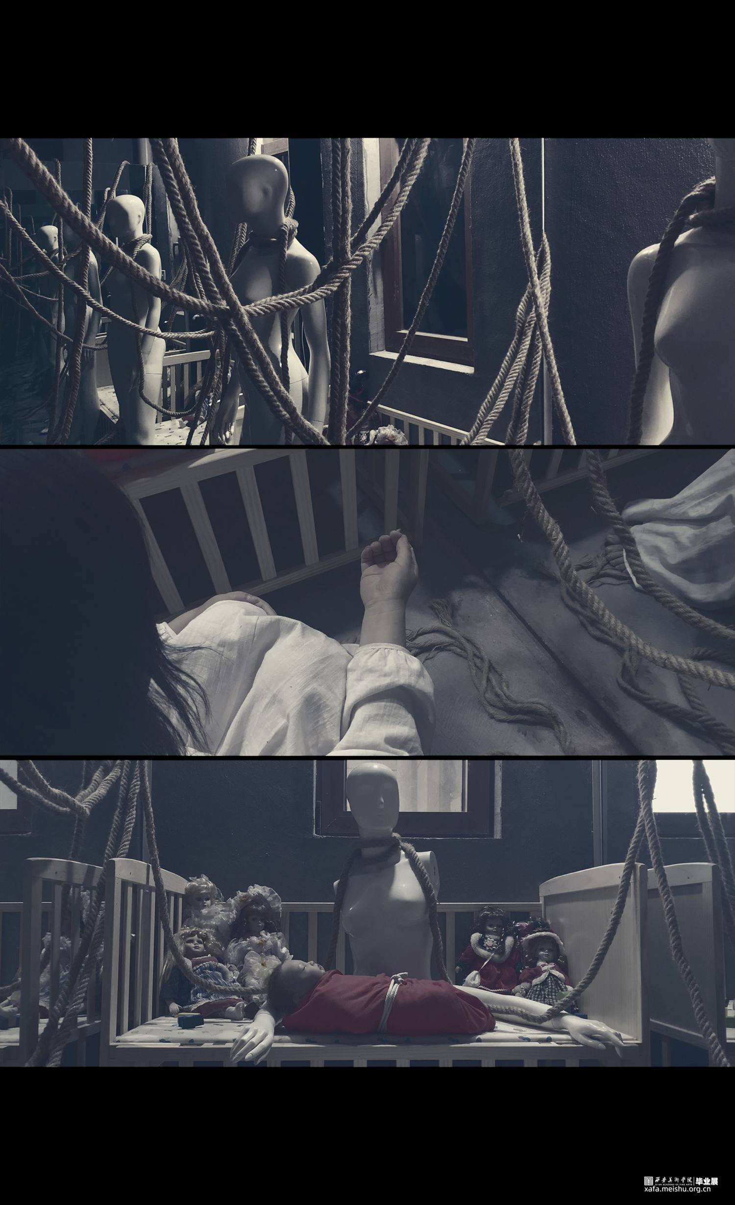 装置部分:狭小密闭的空间被相对而立的巨大镜面无限延伸,使自由看似触手可及,实则无法实际突破。交叠的绳索在镜面空间中越发错综凌乱,将母亲束缚的支离破碎,无力逃离,而满地残碎的玩偶又无时不提醒着她失去的无尽痛苦。