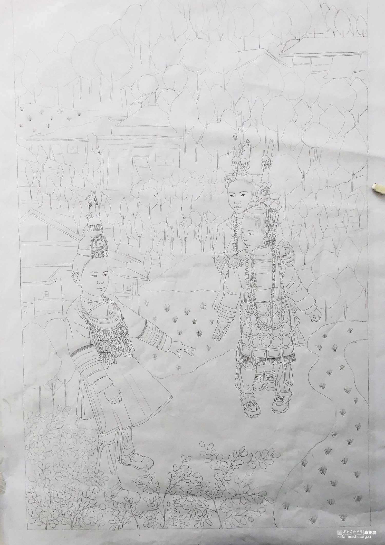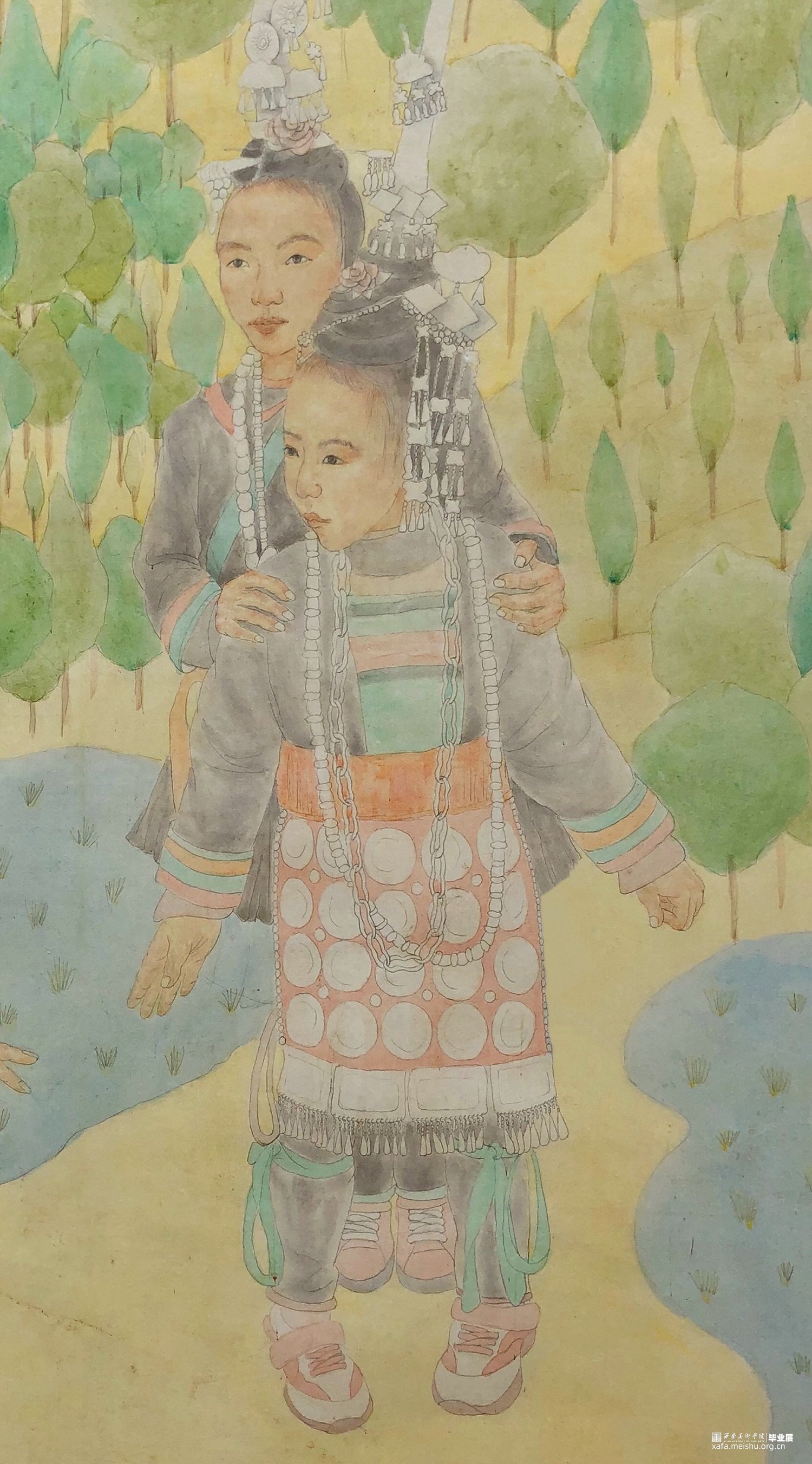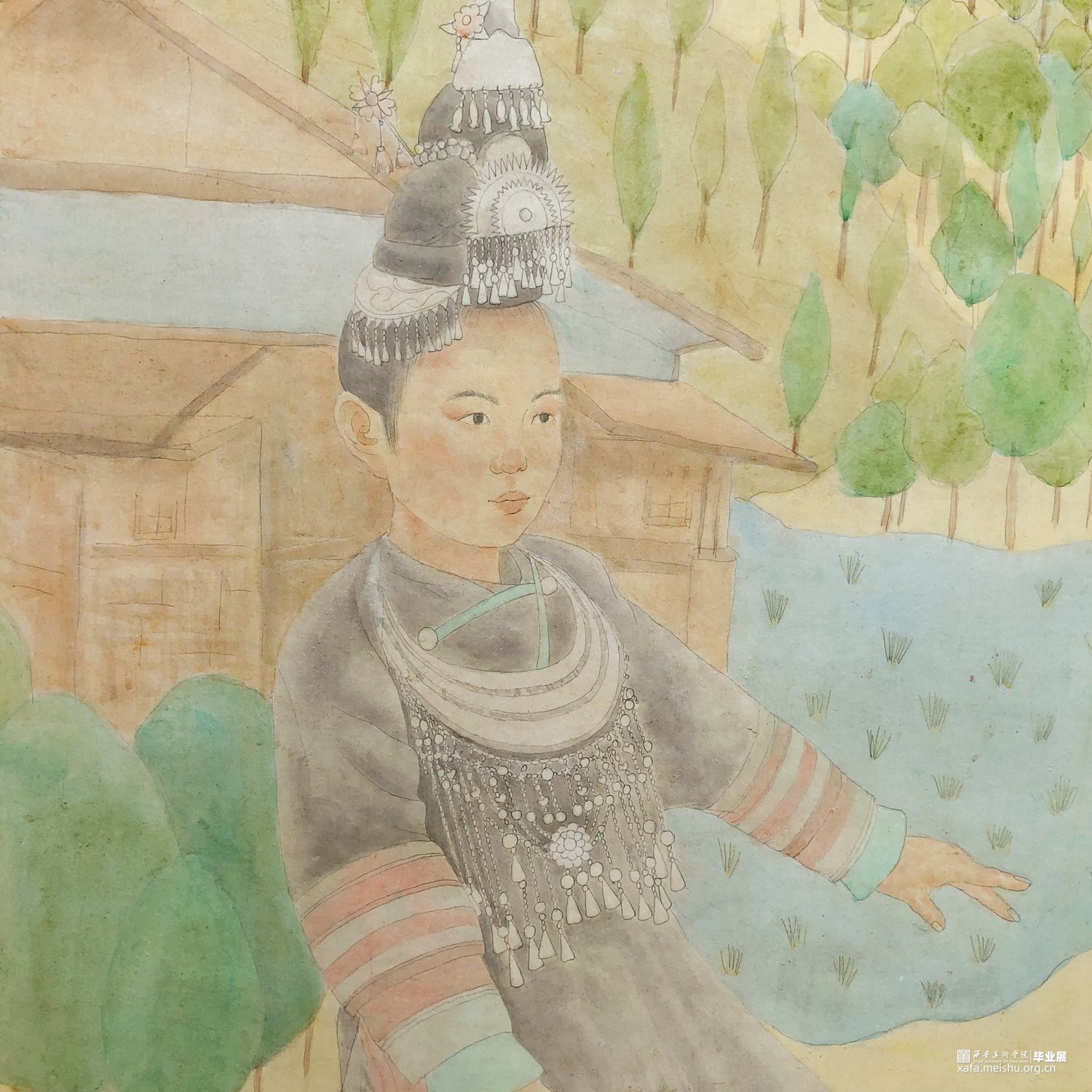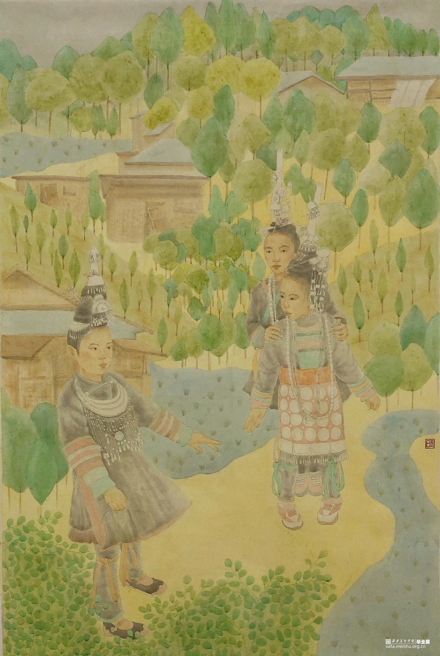 我的作品《山歌》是因一次下乡写生为原形,以贵州侗族为主题的创作,那里的自然环境和甜美的小姑娘给我留下了深刻的印象,在我的构思中我希望给人带来恬静、舒服的视觉享受,同时也想激发和培养人们热爱生活,热爱大自然的高尚情操。