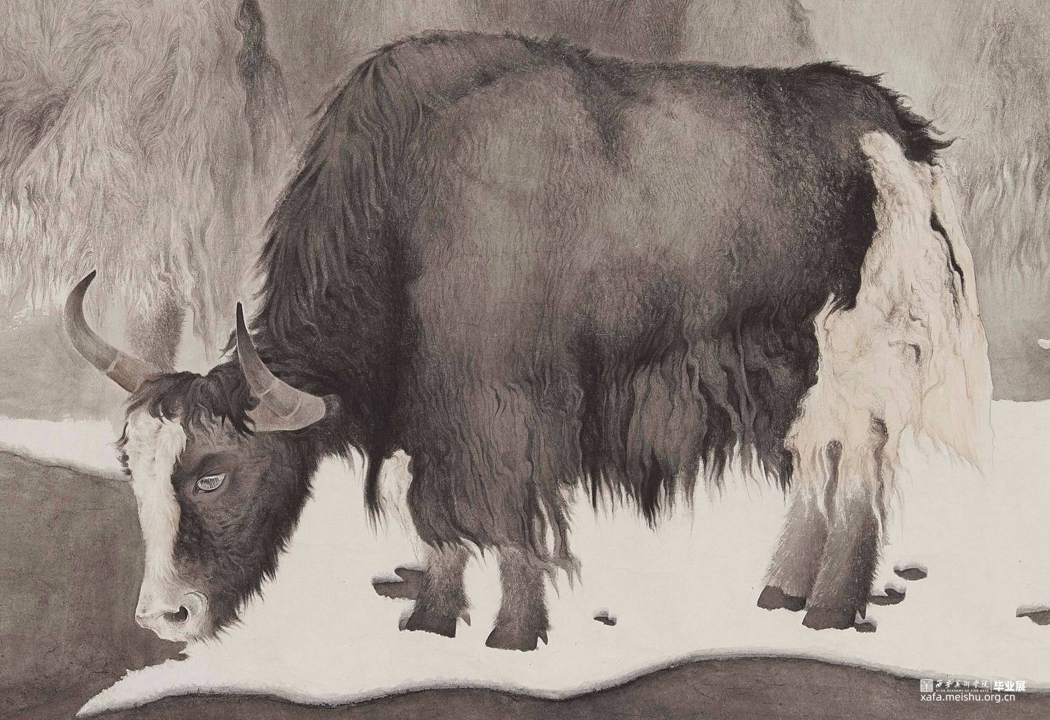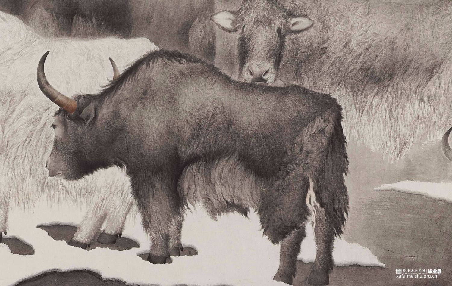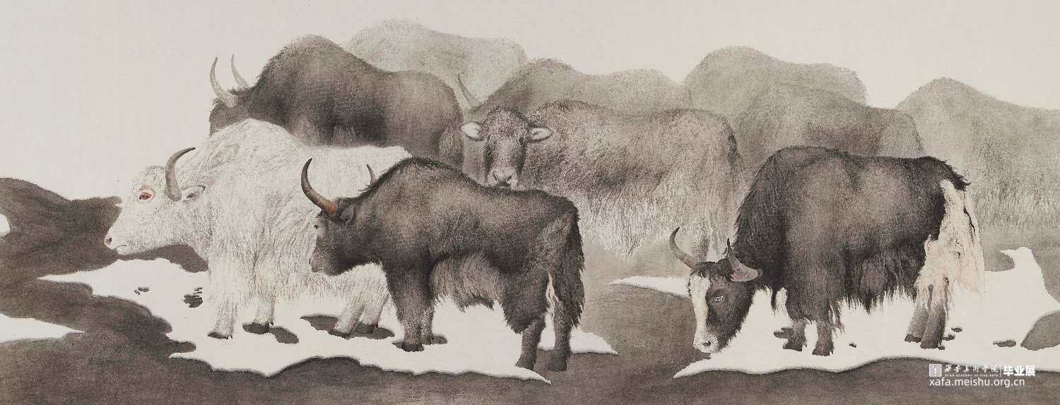 漫步在那片纯白的雪原,茫茫的白色足以刺痛神经,那跳跃的急促的飞雪,似乎要侵占这片雪原上仅剩不多的色彩……除却雪原的狂野粗旷,她还有安静温柔的一面。我见过最安静的场景,那便是雪后的牦牛群,它们悠闲的晃着,走老远也吃不到几根草。它的惬意,也带给了我感官的享受。作品的创作主线围绕着高原雪后的牦牛群,致力于表现雪光给人视觉带来的恍惚感还有牦牛和雪原这种动静的平衡关系。