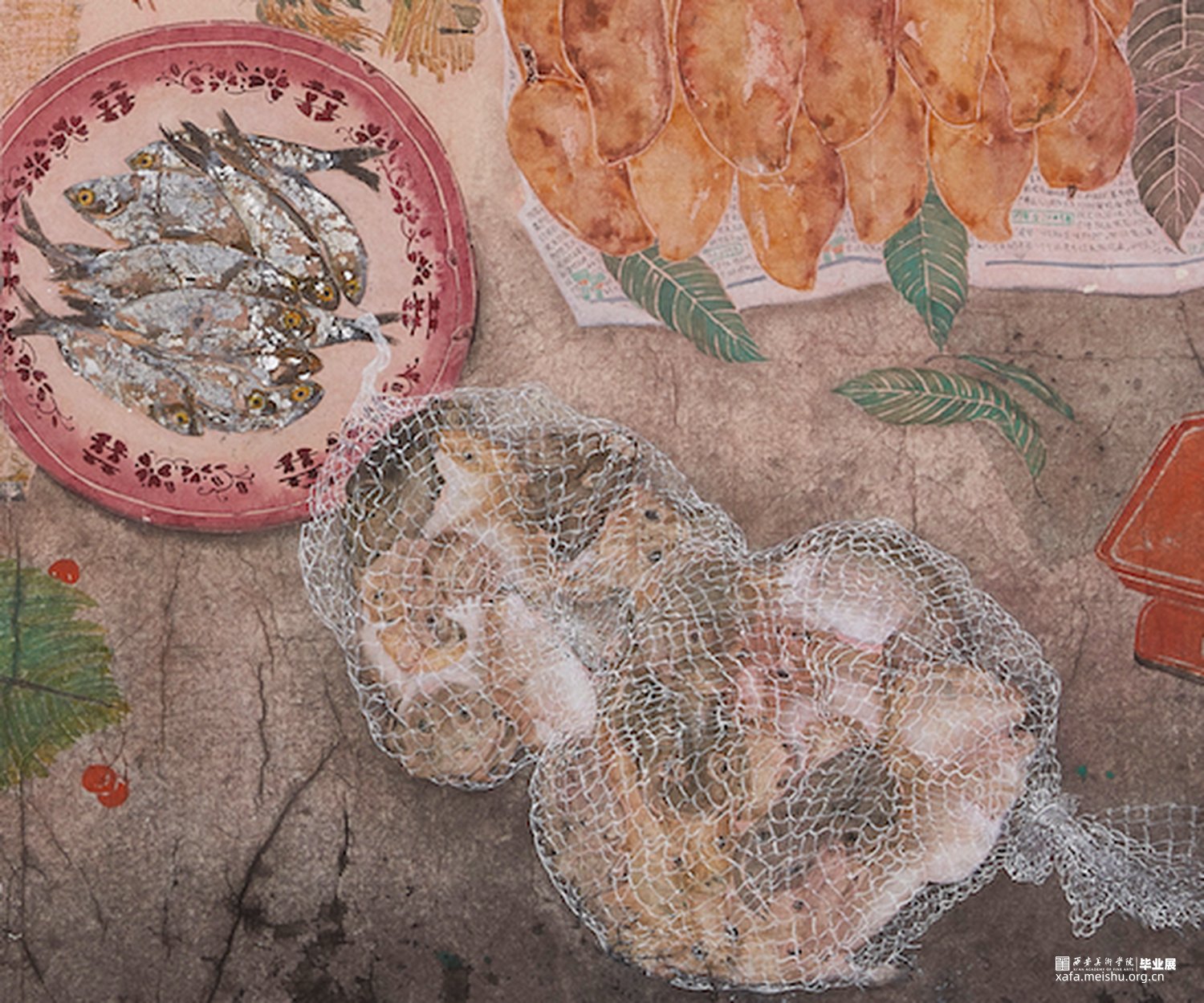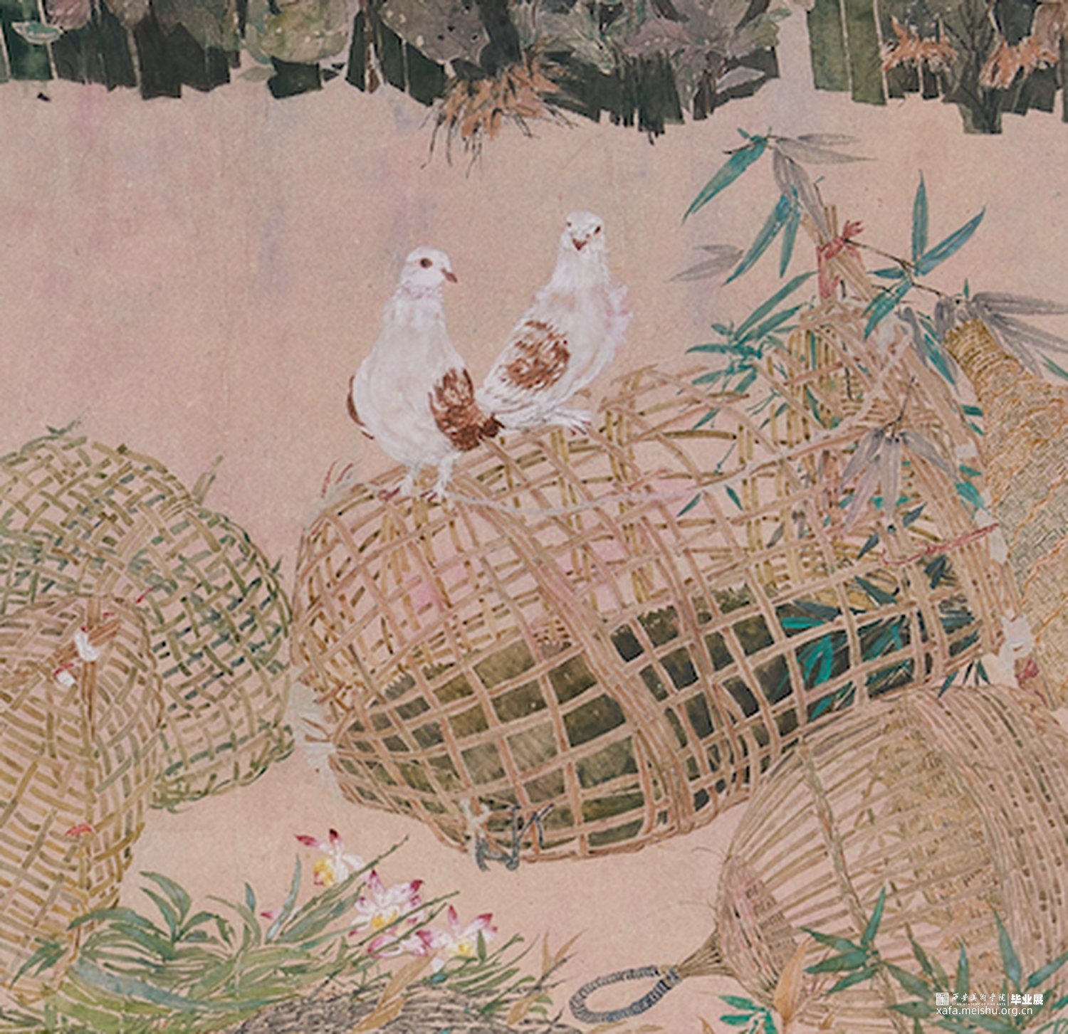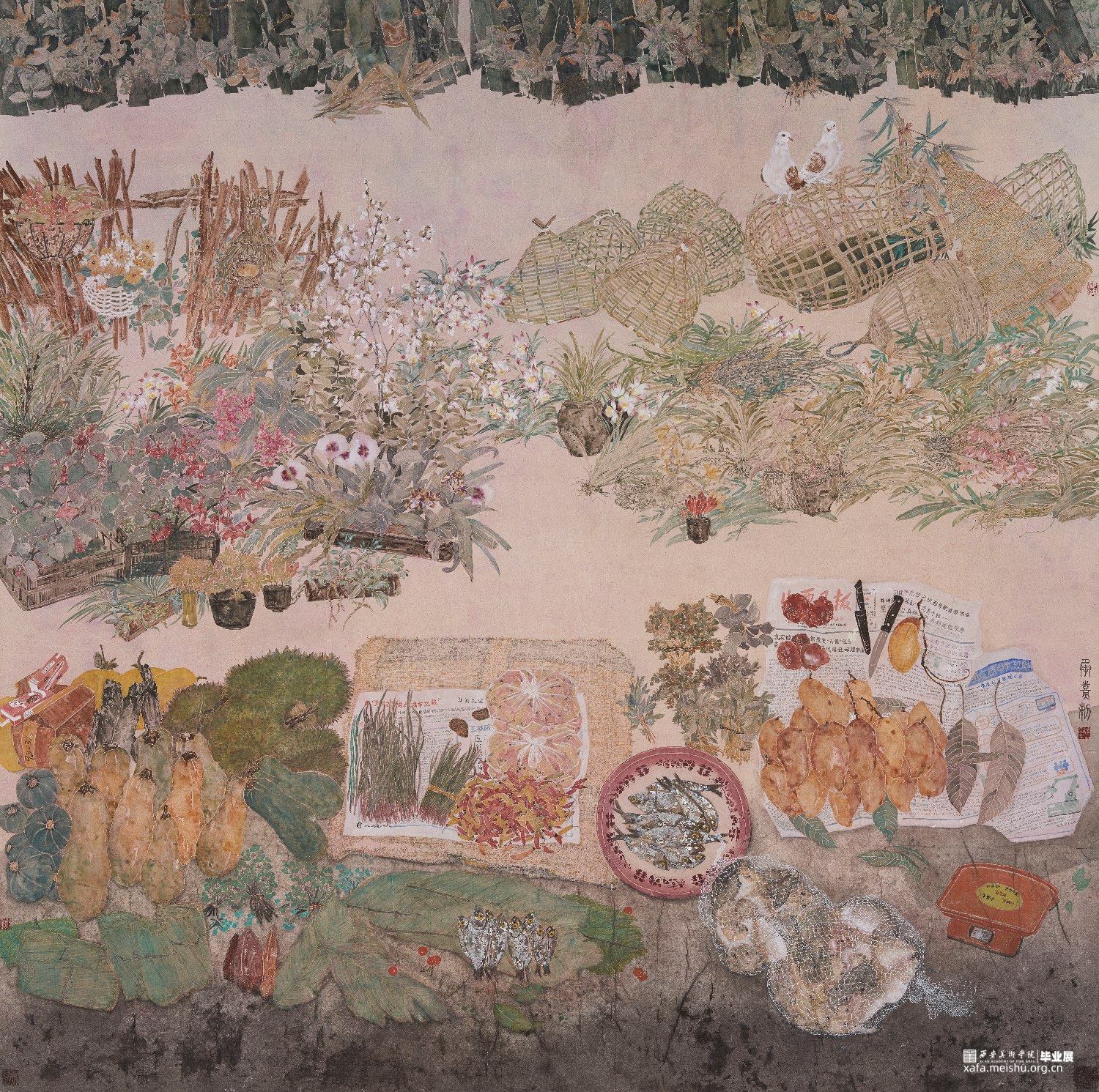 本创作以勐仑小镇的集市为主题。重点放在当地人的日常生活中,笼中的野鸡、林间的竹根、篱笆下的花卉等,构成了独具特色、丰富多样的绘画素材。画面中利用象征、谐音的艺术手法来表达吉祥寓意,如“鱼”同“余”,寓意年年有余;“鸡”同“吉”,象征吉祥如意;两只白色的“元宝鸽”则有“富埒陶白”、“好事成双”之意;以及芭蕉寓意“富贵”、石斛谐音“是福”、竹子代表“平安”等,使画面追求饱满,设色淡雅、题材丰富、寓意吉祥。