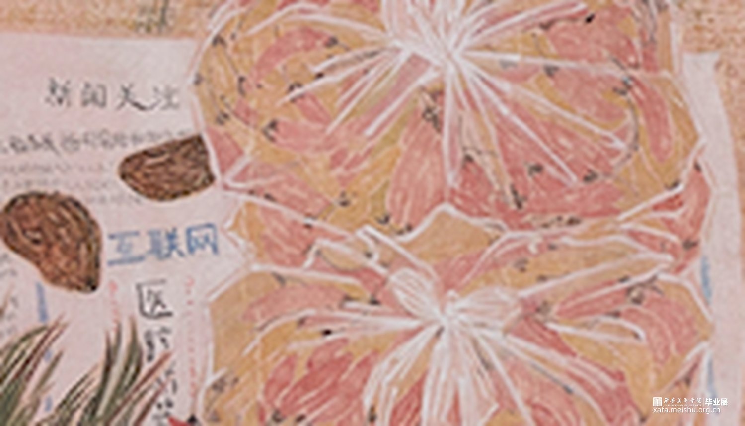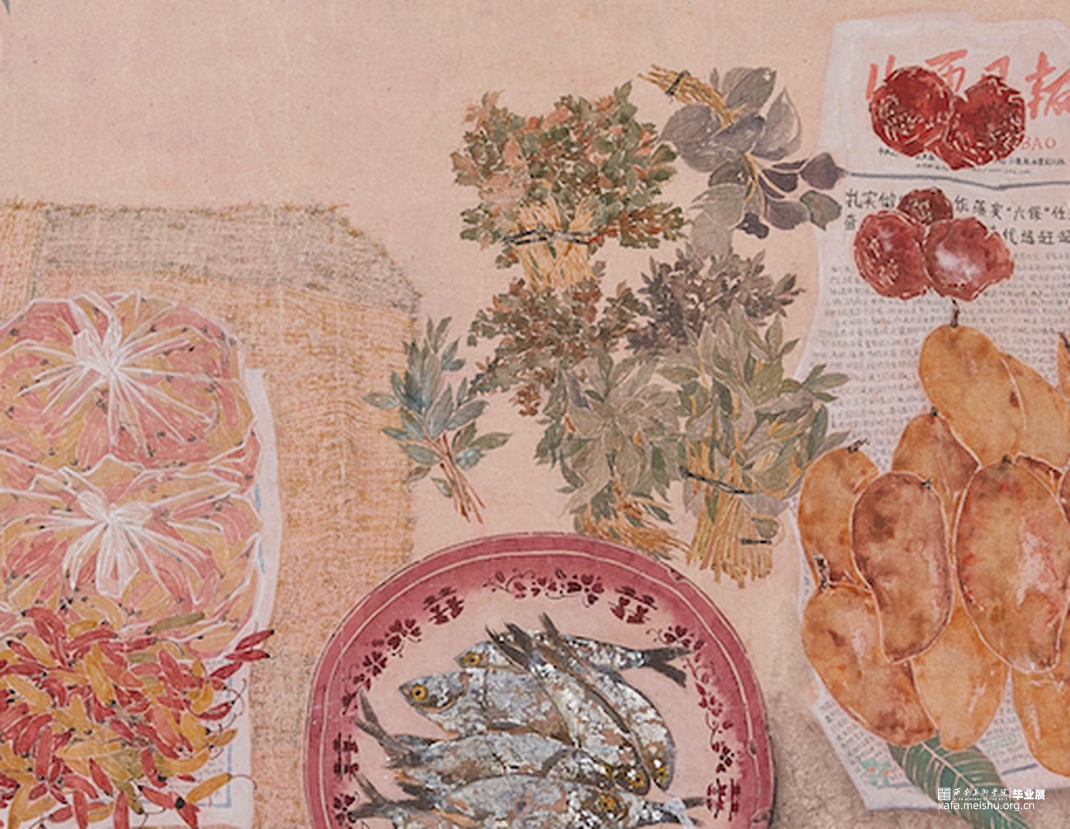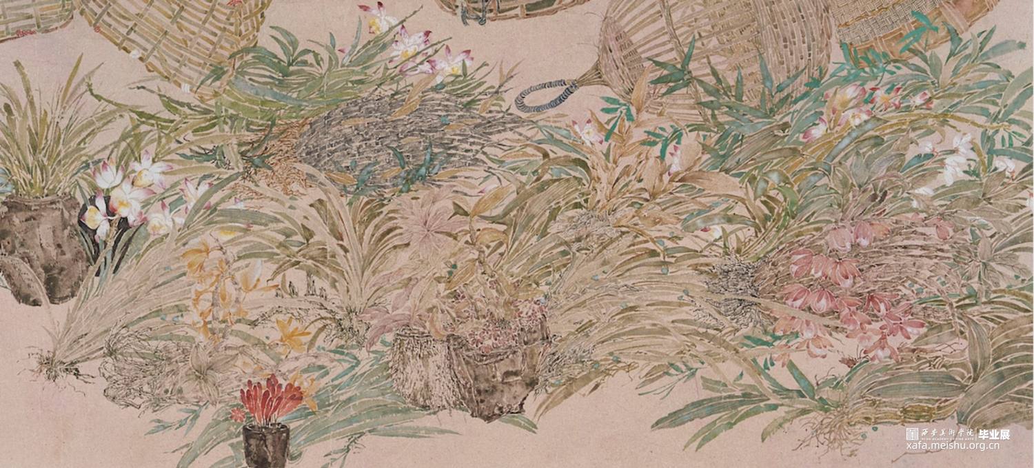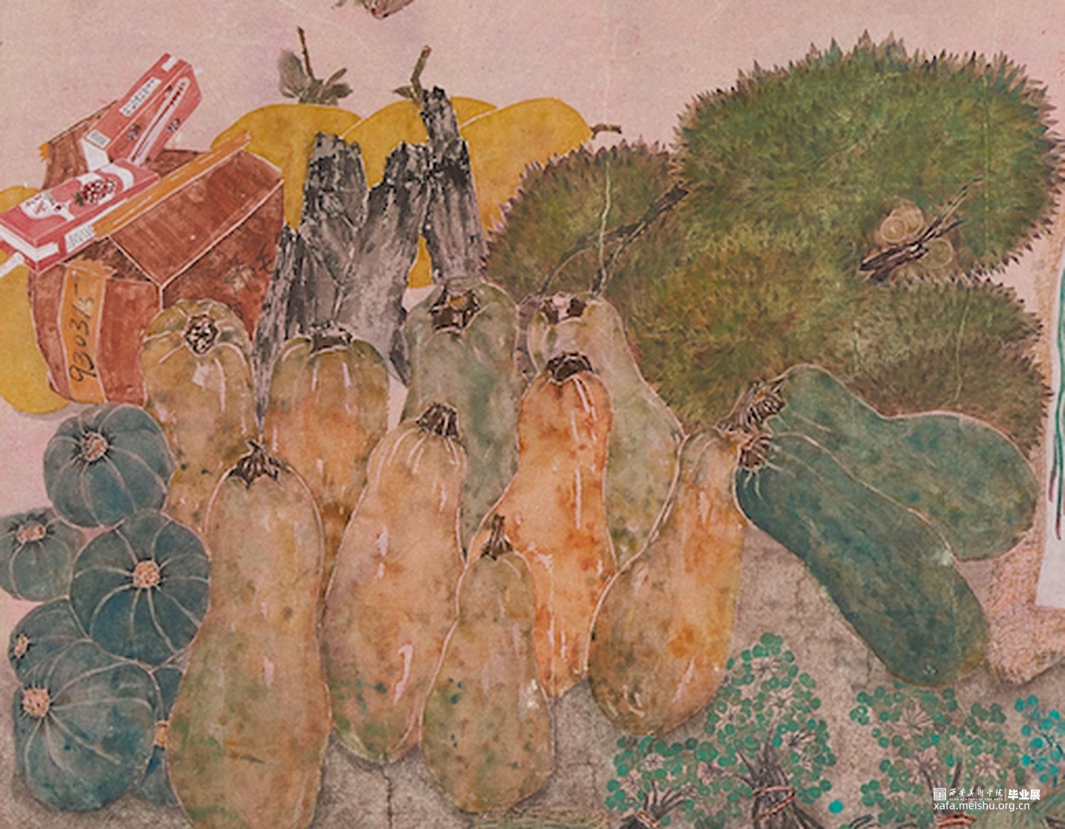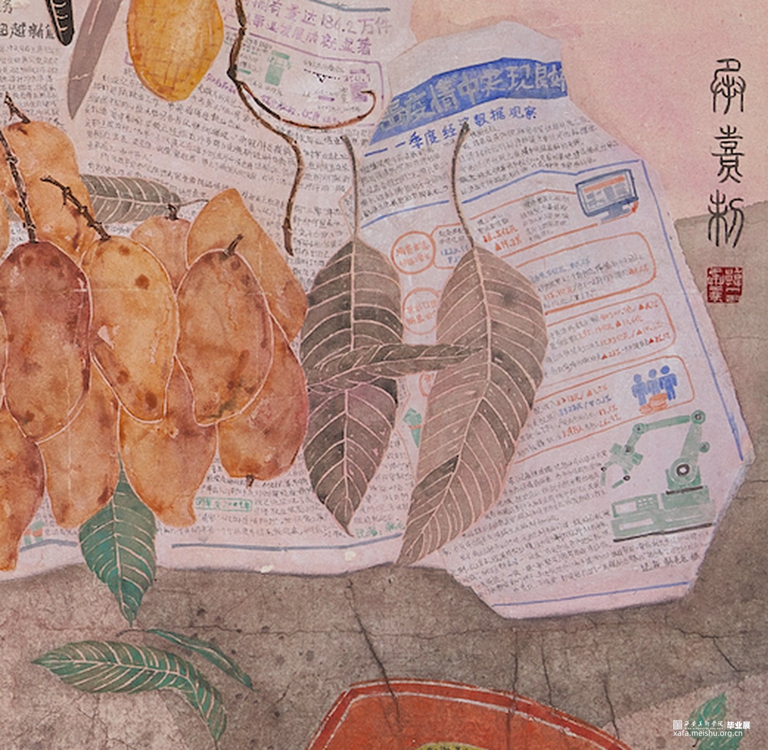 创作主题确定、素材收集完成后,我绘制了线描稿、色稿,采用传统“S”形构图进行排列组合,整副画面以没骨重彩、淡彩为主。确定石斛为画面的主体,舒展自然,中峰用笔注重起笔、收笔和用笔的轻重、顿挫、提按,间以用水要讲究。枝与枝的疏密,细长枝与杂乱根须的长短、粗细和用色的浓淡不一。下方画一组芒果和南瓜、成团和散落的瓜果外形与石斛枝根长细线条形成对比。注意点写用笔,线的质感,色与水的微妙变化,留白产生光的感觉;画面中下位置的报纸、麻袋以方格线的穿插划分,辣椒、韭菜纵散落其中,连成一片,整体线条的运用相互呼应,合而不合。用笔要清晰明朗,虚实得当,中锋、侧锋并用勾勒外形,纯以“写”用笔,间或以复笔加水写之,画时注重用色的深浅不一和干湿变化;画一组盆景花卉,用笔中锋转侧锋,正反叶子穿插以花青浓淡为主,注重用水的点写下塑造复瓣的效果,叶子没骨平涂,碎而不乱。在叶脉留白与叶子外形上,要注意画面线的视觉感、光感和质感。为了加强画面的层次,在背景后方置一排竹根,整体竹根外形呈一个山丘形,纯浓墨用笔表现其特有的光感、质感。注意留白和空间关系。整幅画面将就用笔,以写为主,对水与色、色与墨的把握十分注意。
