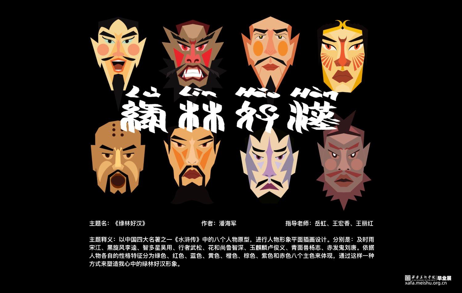 《水浒传》作为绿林好汉人物形象插画作品系列创作的灵感来源,选取了八个个性鲜明、风格突出的人物进行形象设计。无论是在小说中、画面中或者现实生活中,这些人物都扮演着不同的角色,传递着不一样的声音,讲述着不一样的故事,通过不同的媒介,通过绿林好汉系列的延展设计,体会绿林好汉的鲜明性格。
