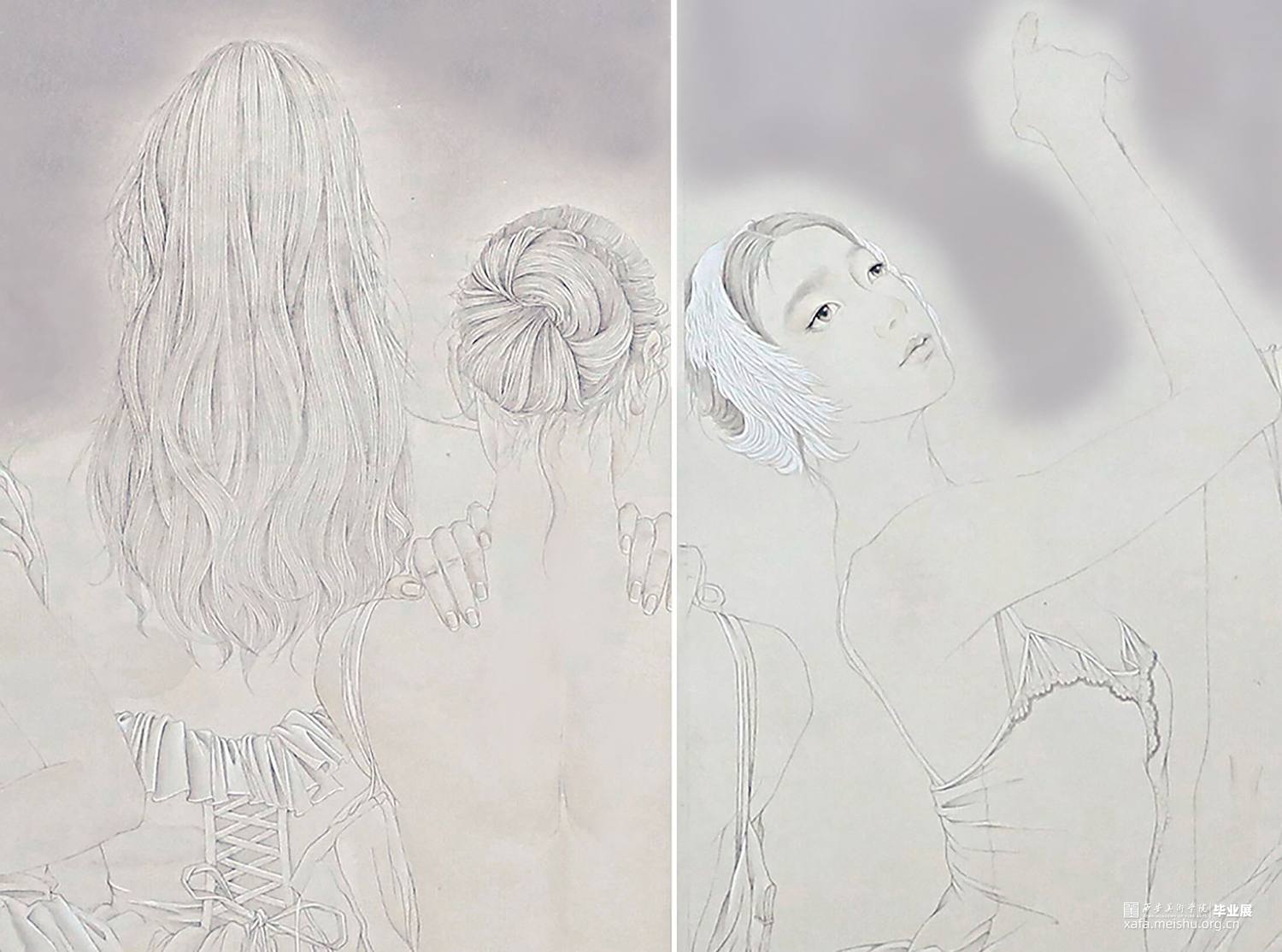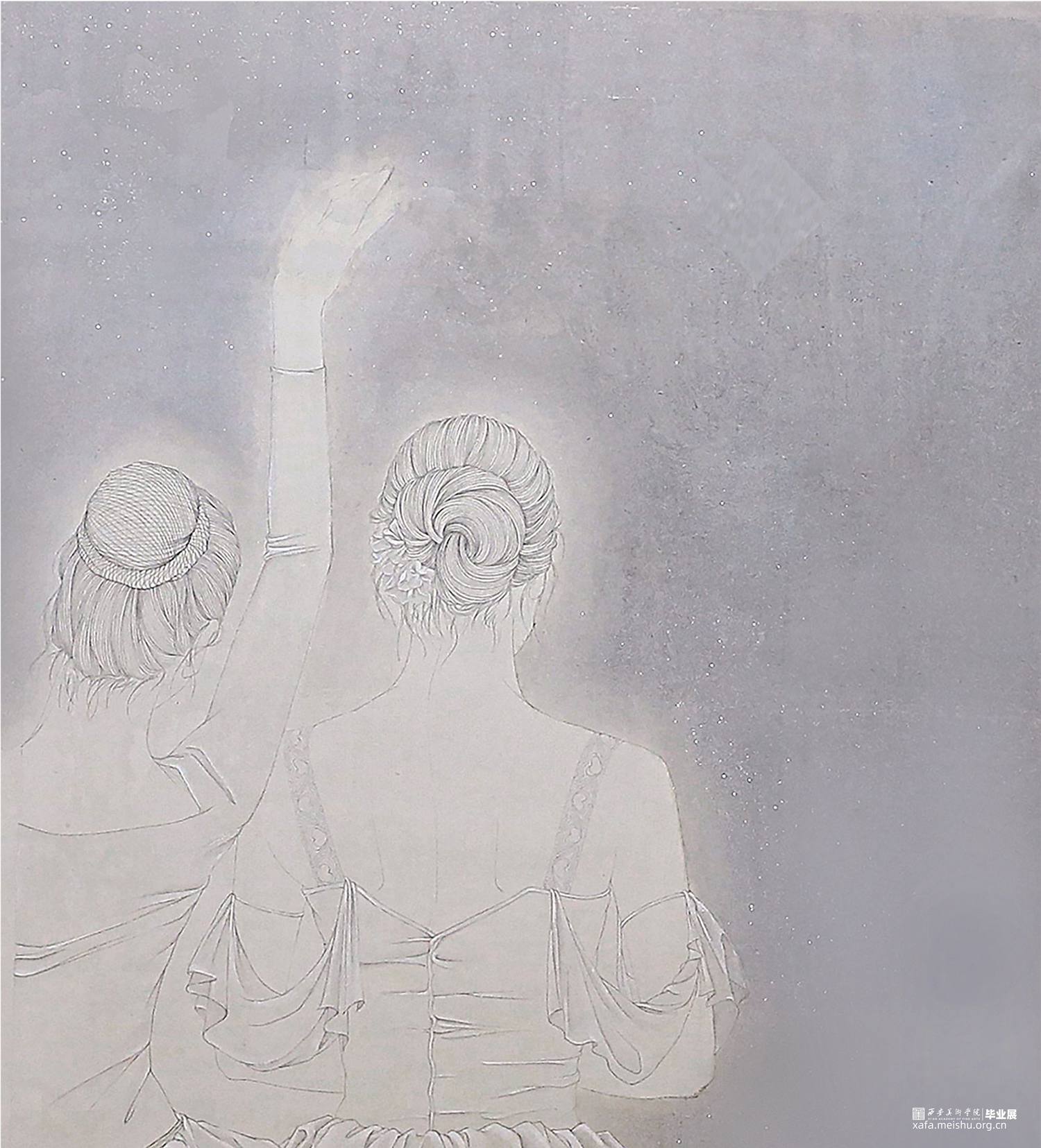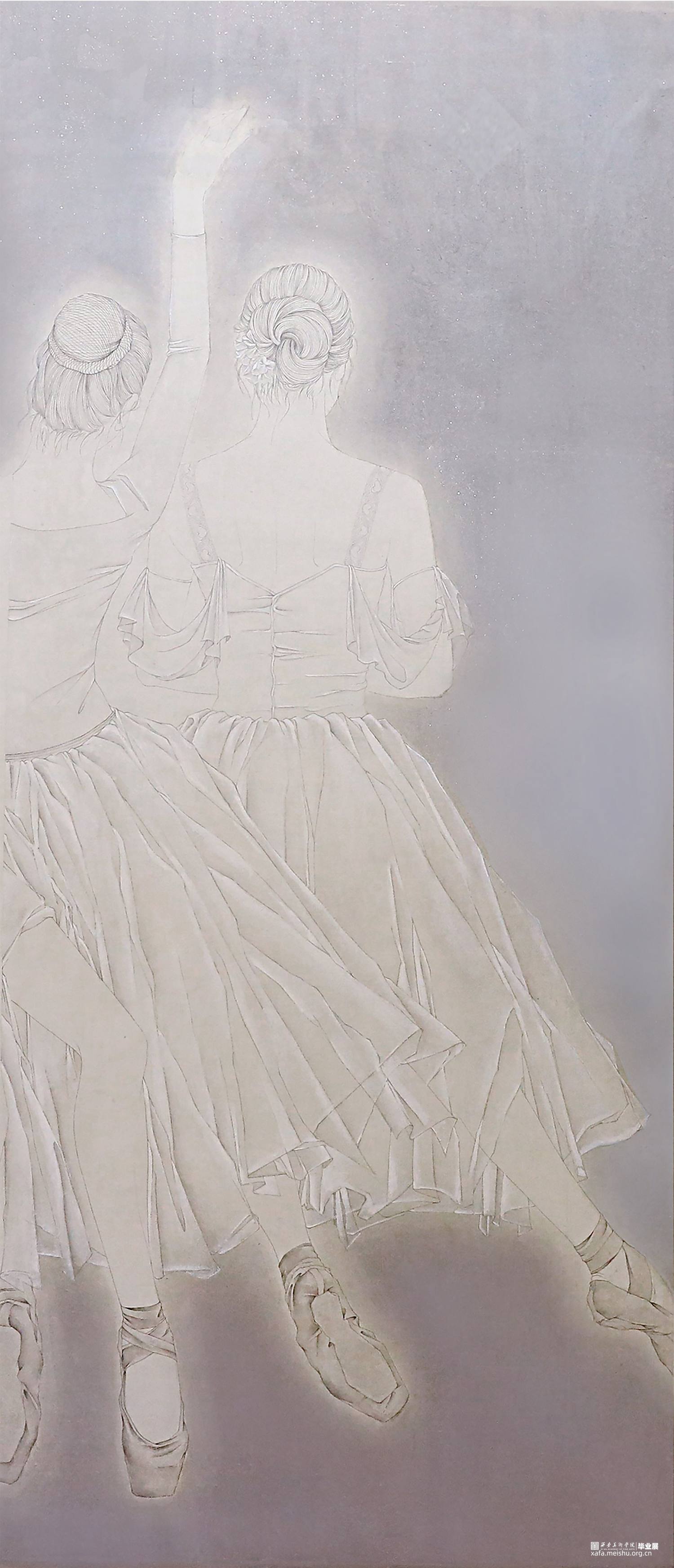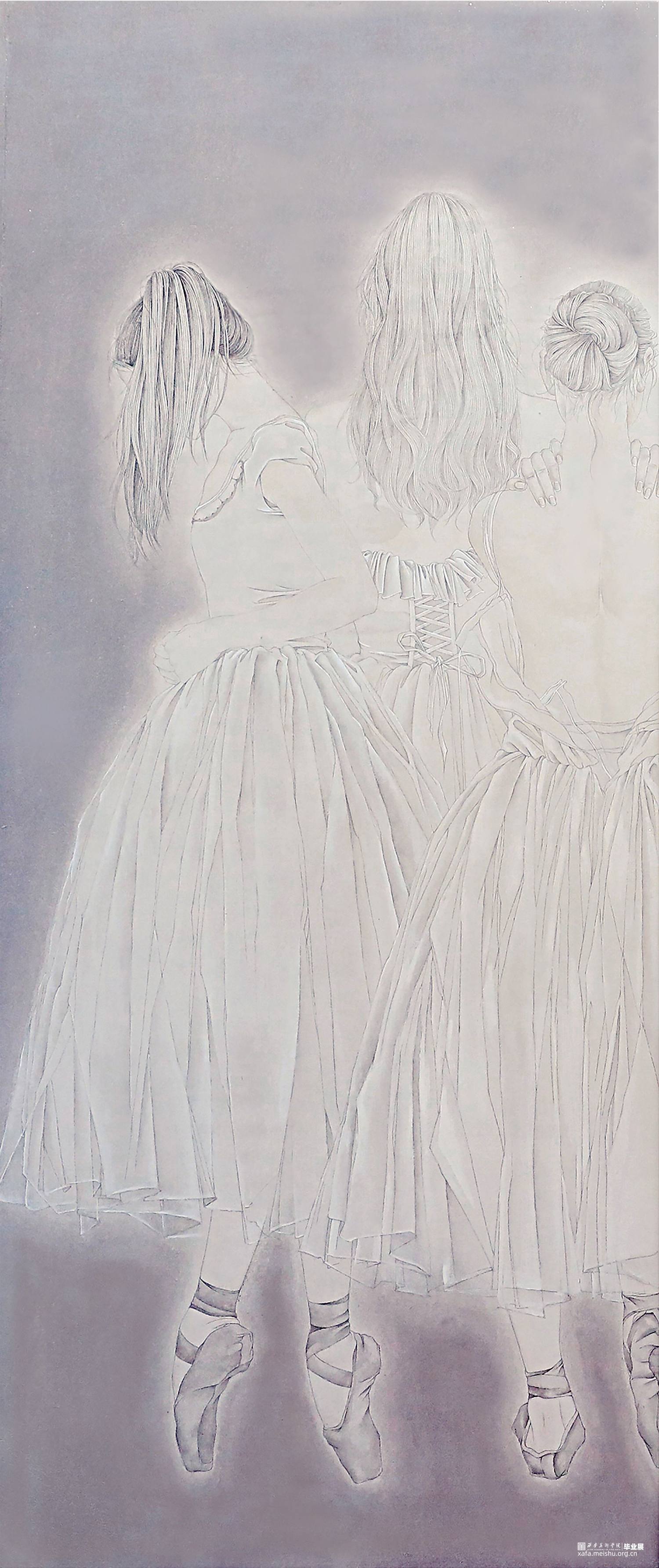 芭蕾舞的舞台是神圣而高雅的,舞台上的芭蕾舞者总给人一种美丽而遥远的感觉,就像一个个触不可及的梦,在创作作品时,我也极力的想去把芭蕾舞者似幻似真的魅力描绘出来。很多人认为芭蕾舞者最美的瞬间是当他们立起足尖,旋转跳跃的时候,但我认为他们站在那里,甚至是背影都是一件极致打磨,不懈追求下的艺术品,给观者的感官带来极大的冲击和享受,我们欣赏芭蕾,不只是欣赏美轮美奂的舞台,优美柔和的舞姿,更是欣赏曼妙舒展的肢体。画中八位舞者或低头,或仰望,或闭目思索,他们穿着不同形制的芭蕾舞服,束着不同的发型,姿态各异,展现着芭蕾舞者特有的气质,那是经过长时间的学习与打磨所沉淀下来的,近乎完美的内在。为了展现芭蕾舞台的梦幻,在色彩上我选用了偏冷的灰紫色色调,为了能更好的表现出芭蕾舞者高贵优雅而又带有神秘的色彩,凸显氛围的朦胧虚幻之感。