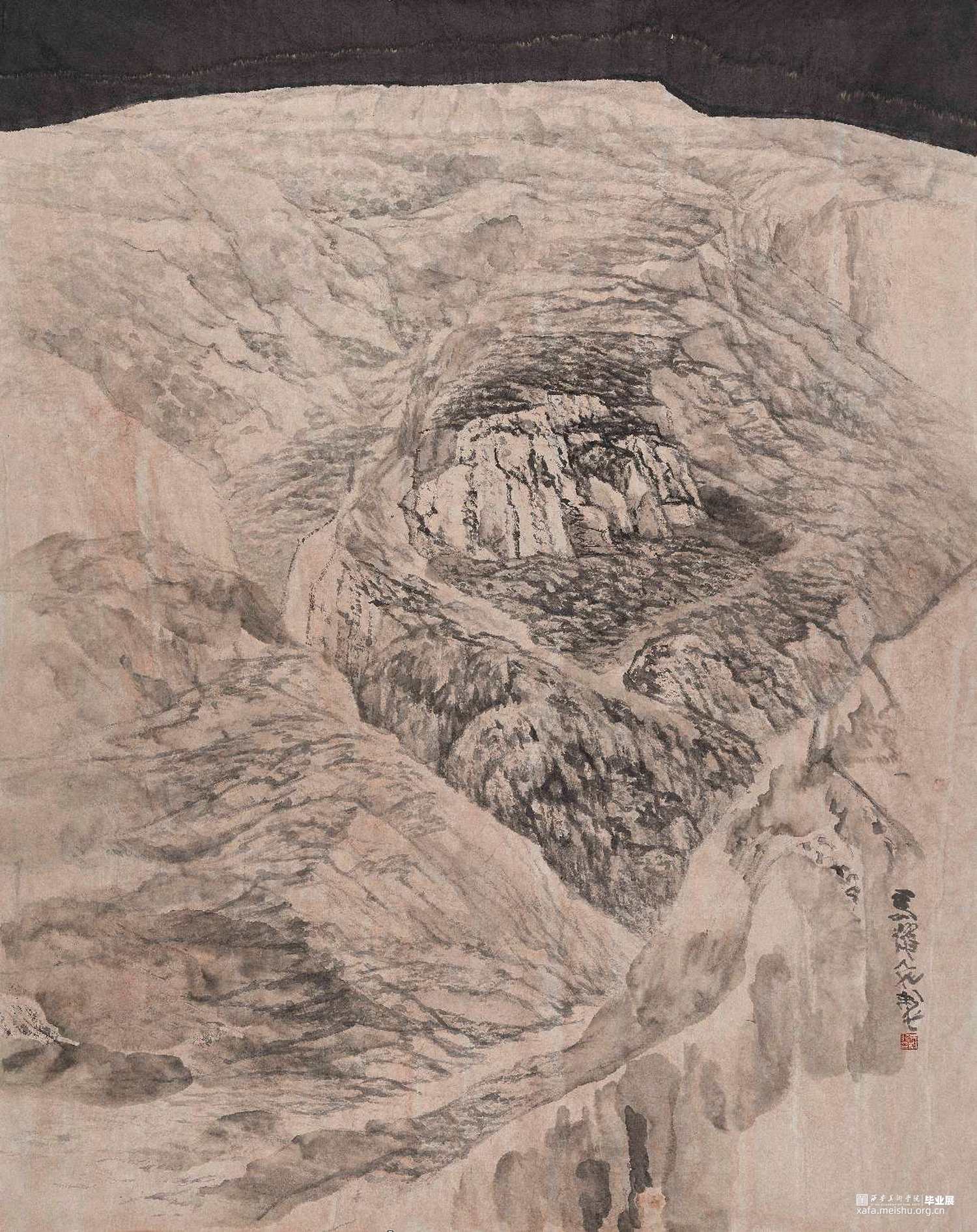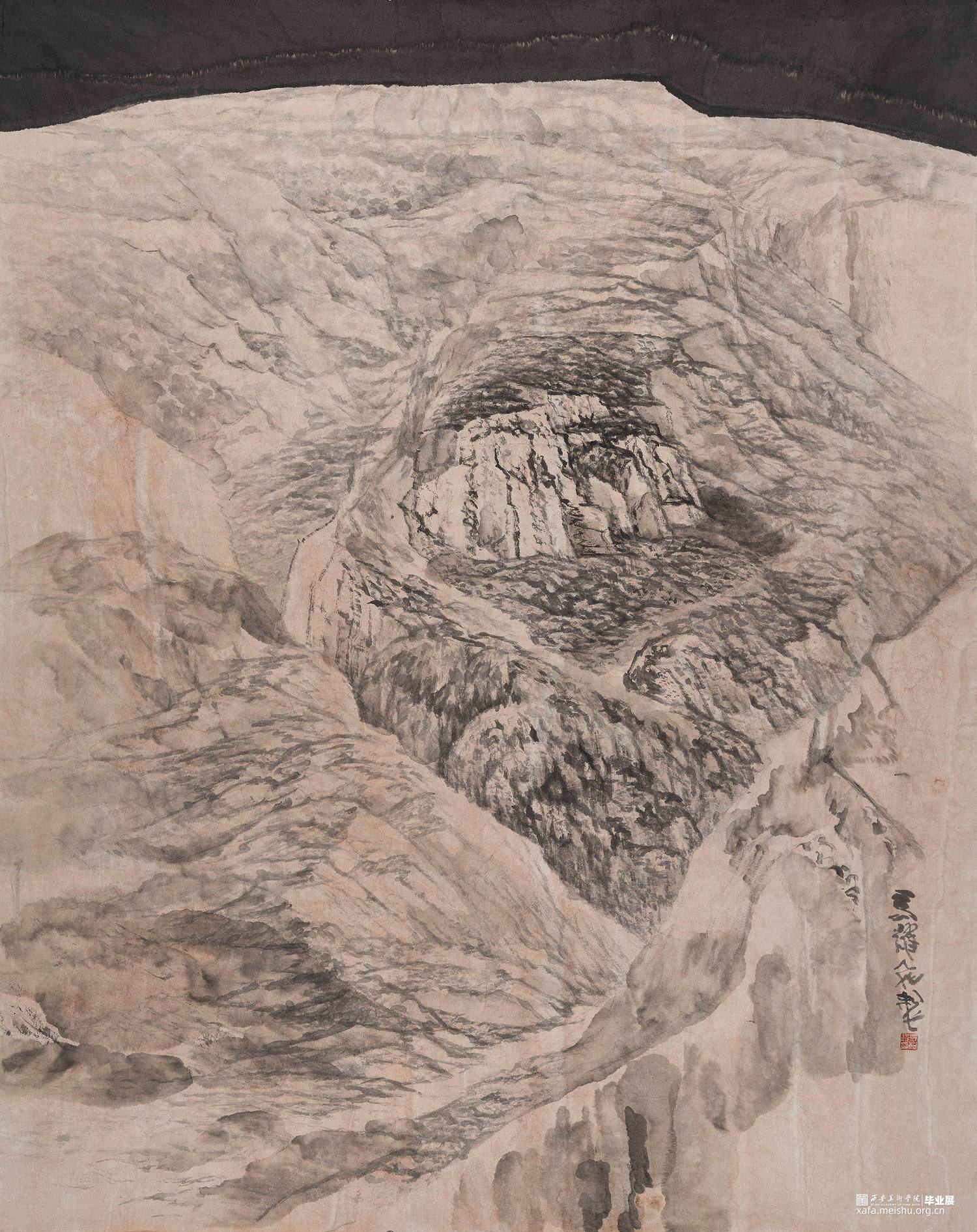 作品运用水墨的形式表现陕北黄土高原的地貌特征。