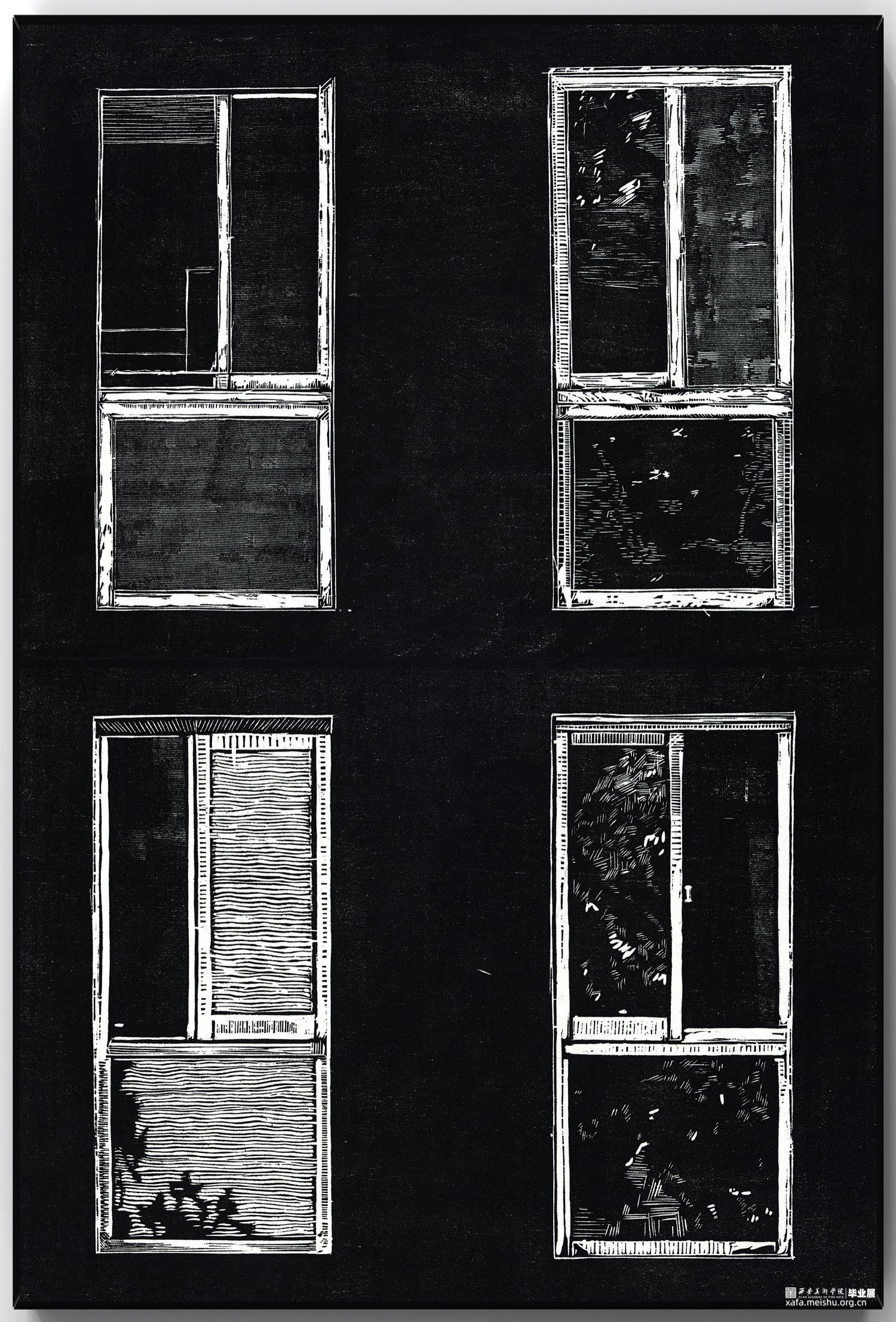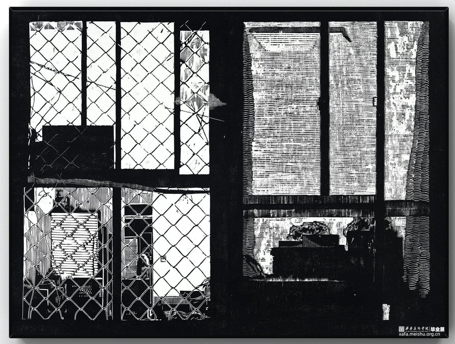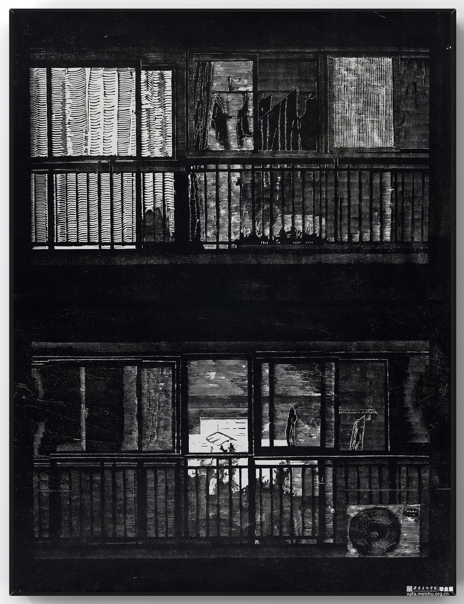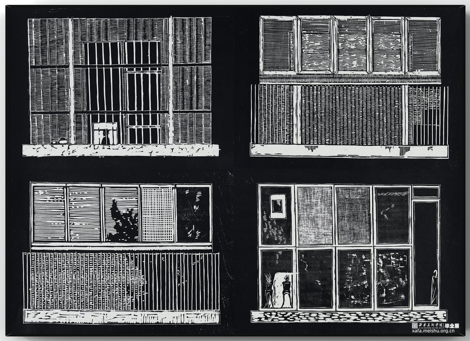 作品是由世事变化之快、城市飞速发展,但人与人之间的距离却越来越疏远感触得来。自己在观察着一扇扇窗口,每一扇窗口的背后都发生着不同的故事。伴随着现代科技的发展,房屋的进深越来越大,人们距离外界的距离也是越来越远。在自己与窗口的对视中,产生出了有关于城市题材的黑白木刻作品。