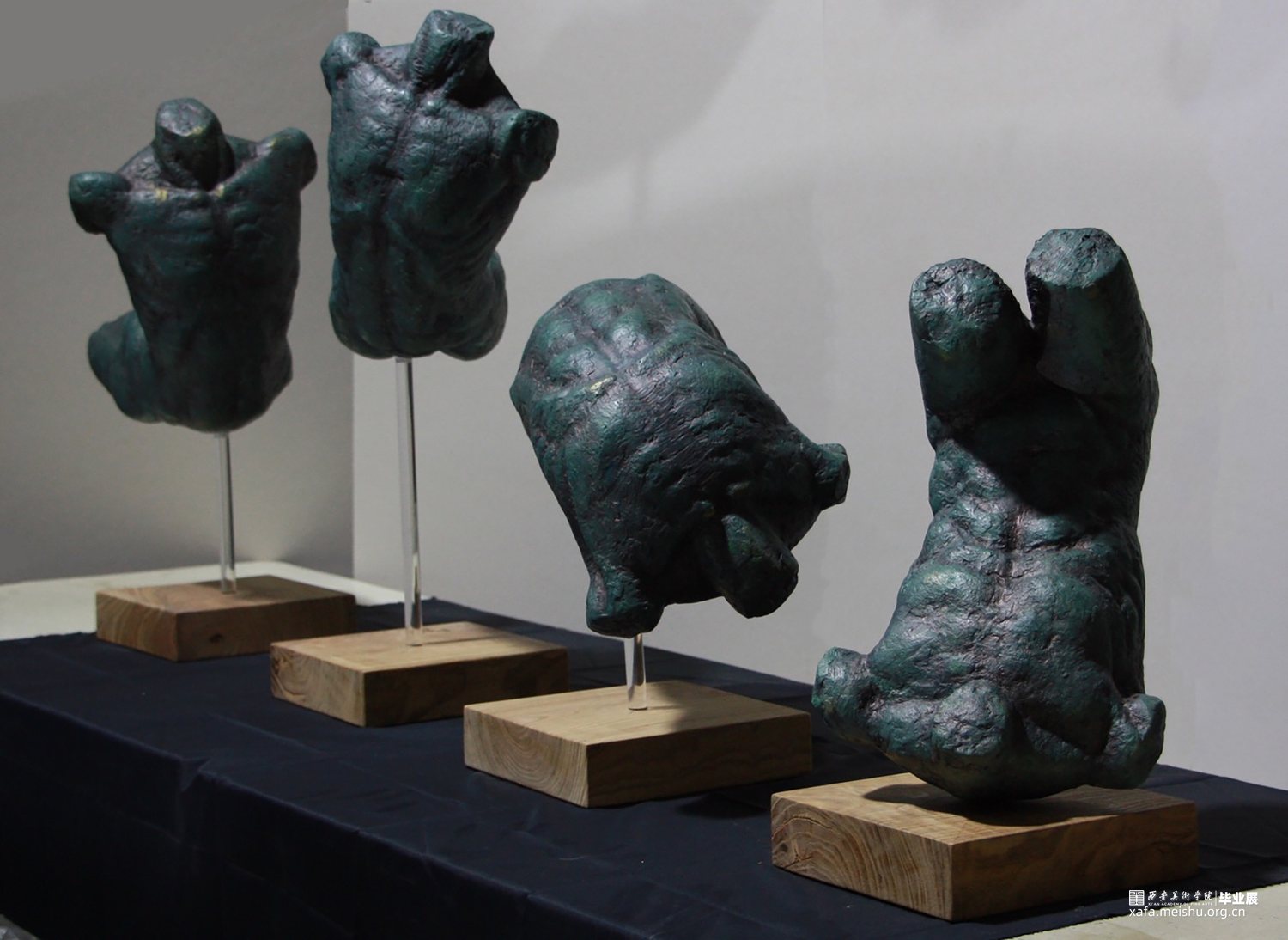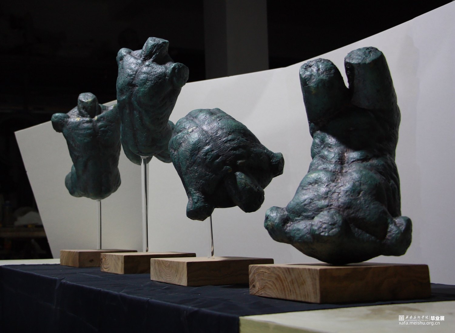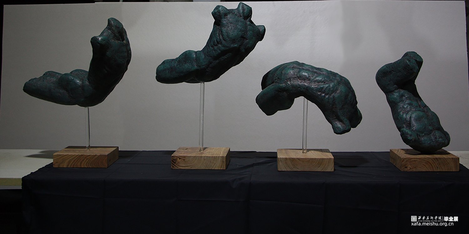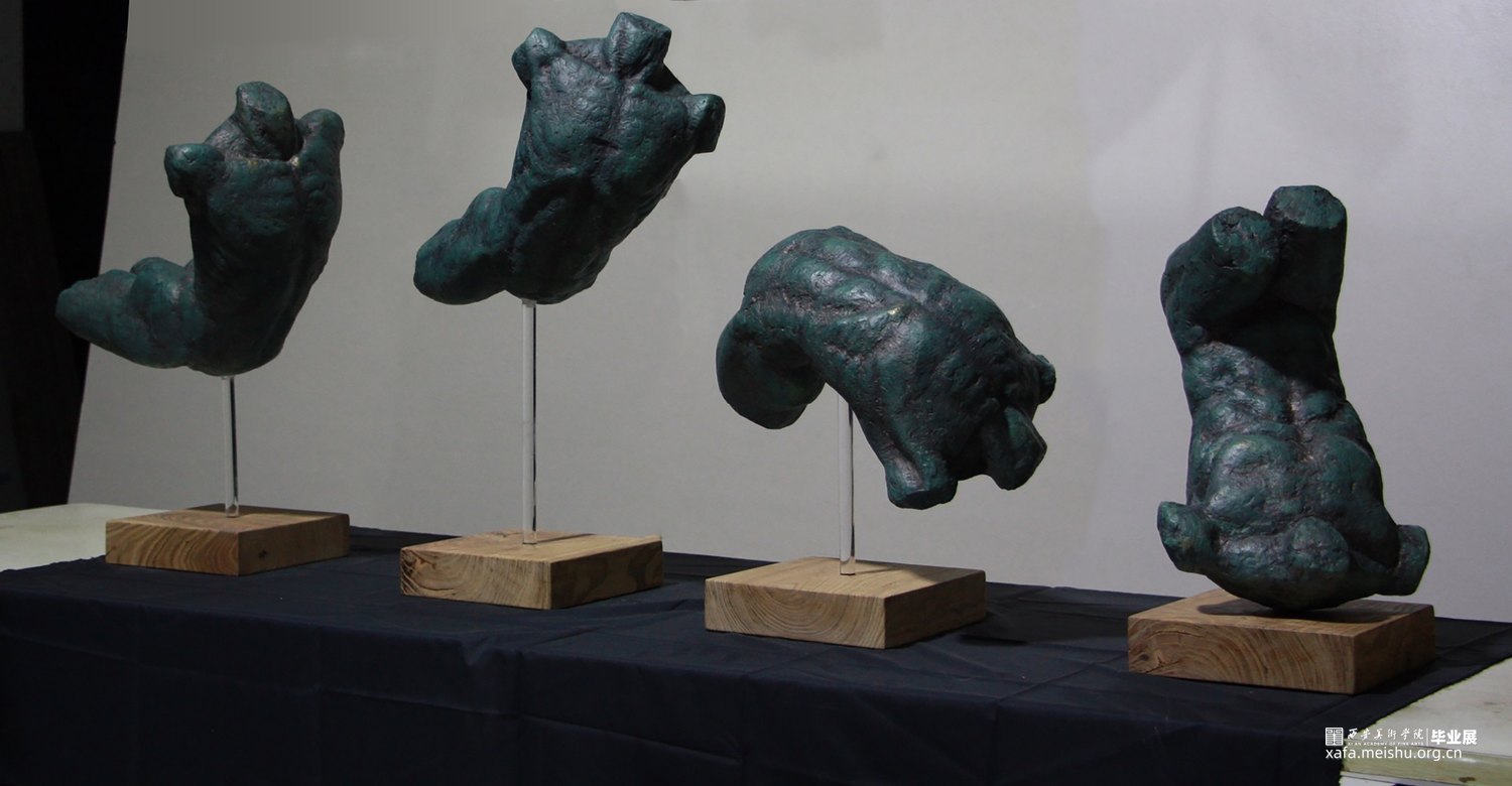 本组作品为四个不同造型的人体躯干,犹如人这一生或是一生中的种种行为行事,从起升到落地。不会以一种姿态一直进行下去,顺应规律,趋势才能放下执拗。作品借鉴了古希腊雕塑饱满和谐的造型美感,在效果上做了仿青铜效果处理。