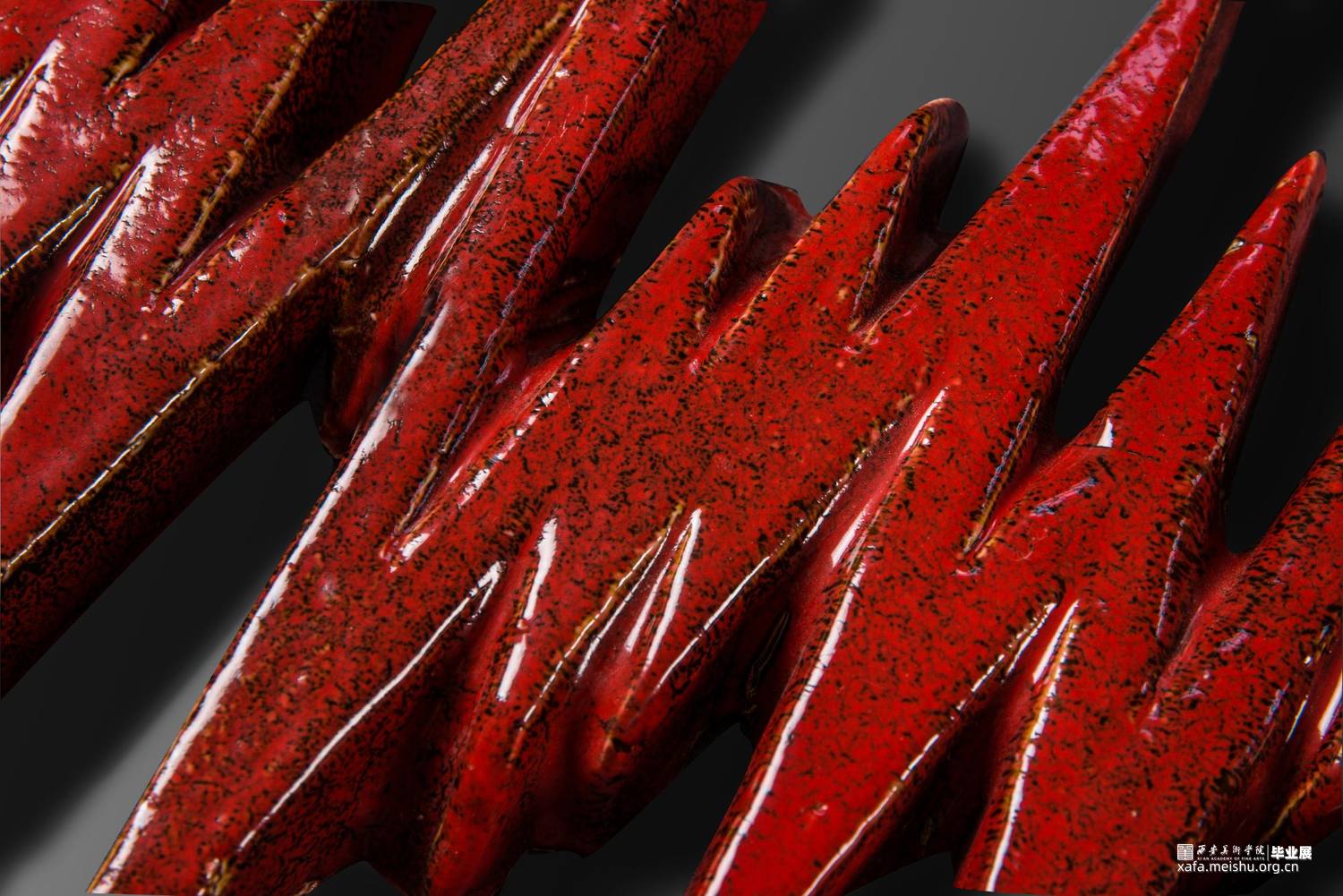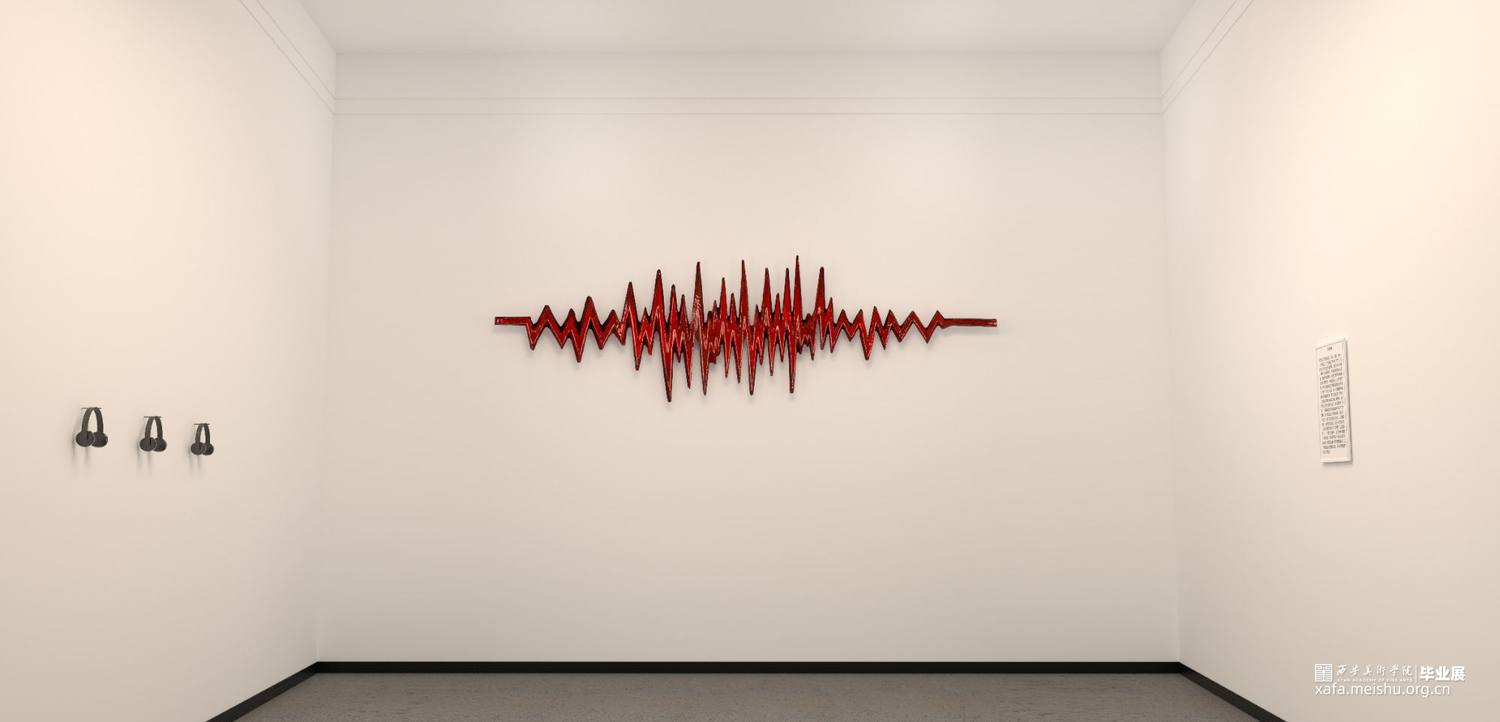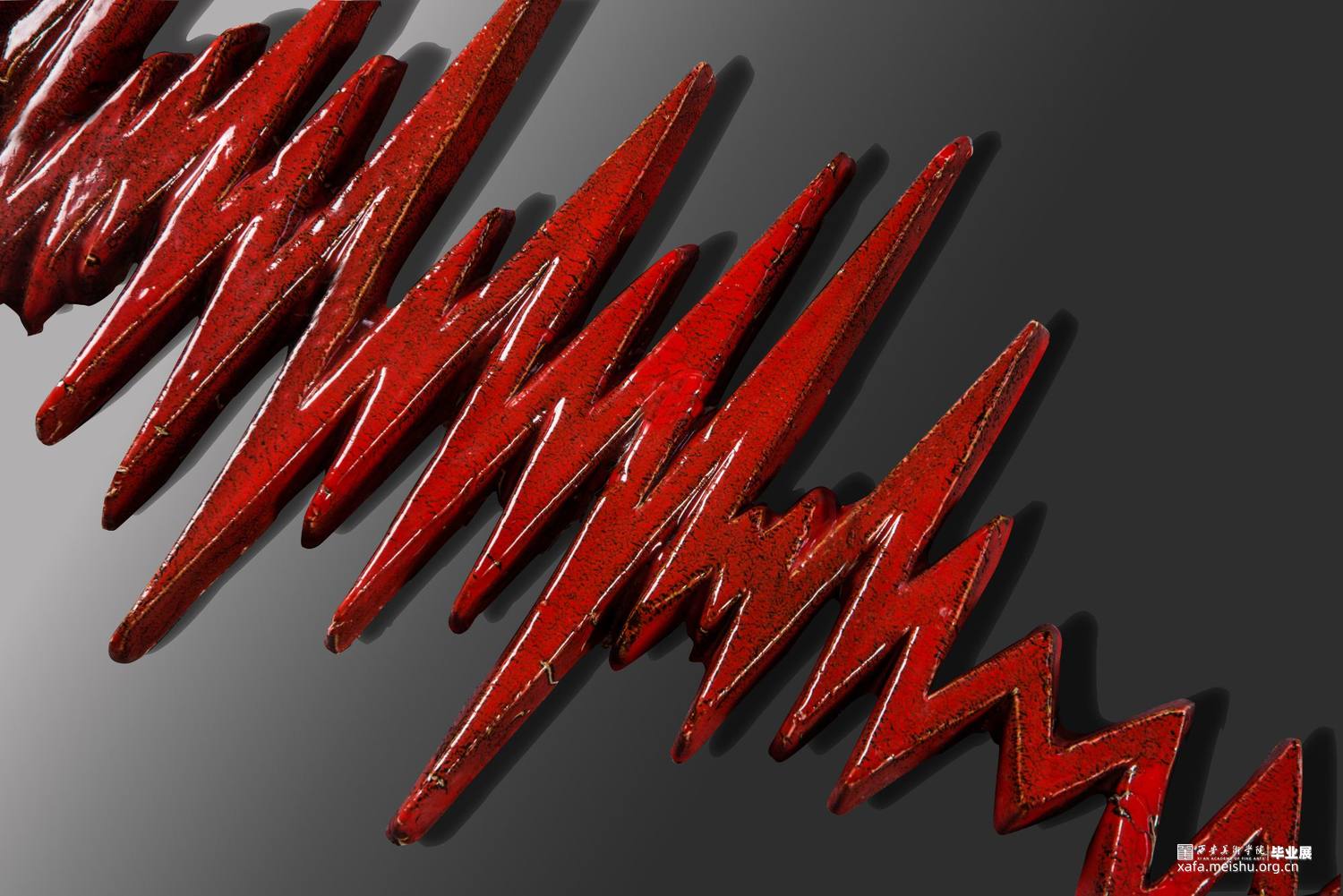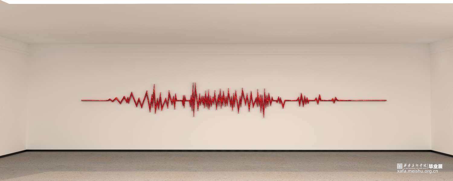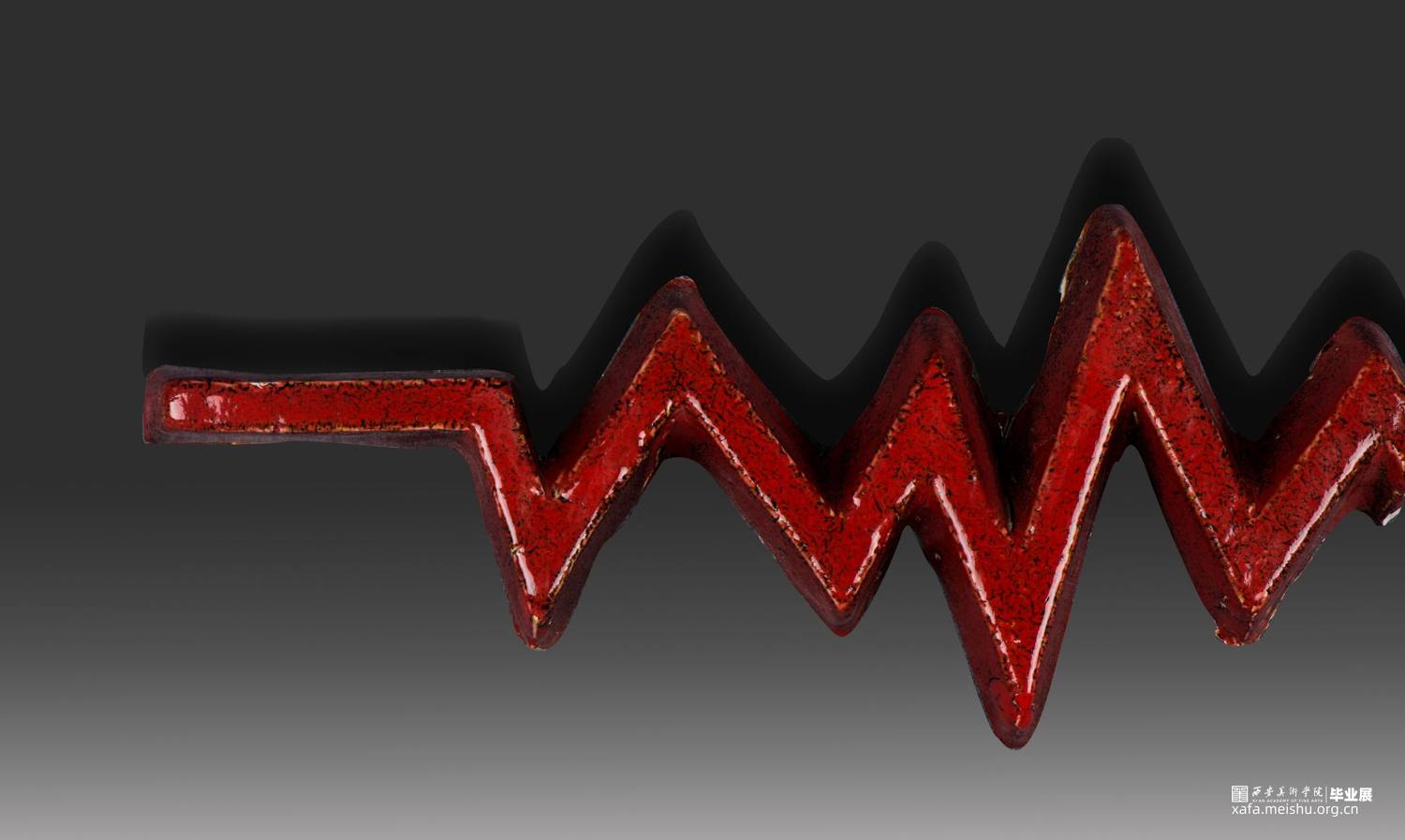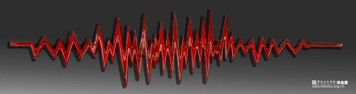 该作品是根据屠宰场对动物们残忍屠杀进行的后续创作,通过调研与整合多种资源,将屠杀动物过程的录音收集起来,再通过软件解码获取到整段录音的音波线。将音波线放大,得到有“节奏”的银屏,大致分为三个阶段:第一,不安和焦虑;第二,歇斯底里与惊恐;第三,苟延残喘和失去脉搏。 通过整合这些音频,就想要将音频重要的节点以及强烈的节奏变化,通过陶艺作品表达出来。整件作品利用表示血液的正红色为主要基调,红色的“心电图”代表动物的心率和生命体征,以及由此产生的强烈的视觉冲击力,表达了作品中血腥的紧张情绪。