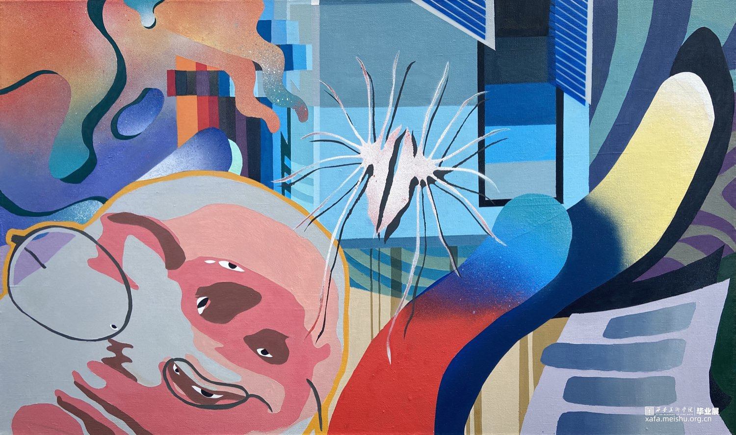 其中我使用了喷漆作为特殊材料,丰富画面的同时可以感受到无需调和的胶质颜色带来的极简与单纯。我将画面进行分割,仿佛故事一般展现又仿佛一块块屏幕,最后以直白的效果冲击着观者的眼睛,希望可以引起观者的思考。