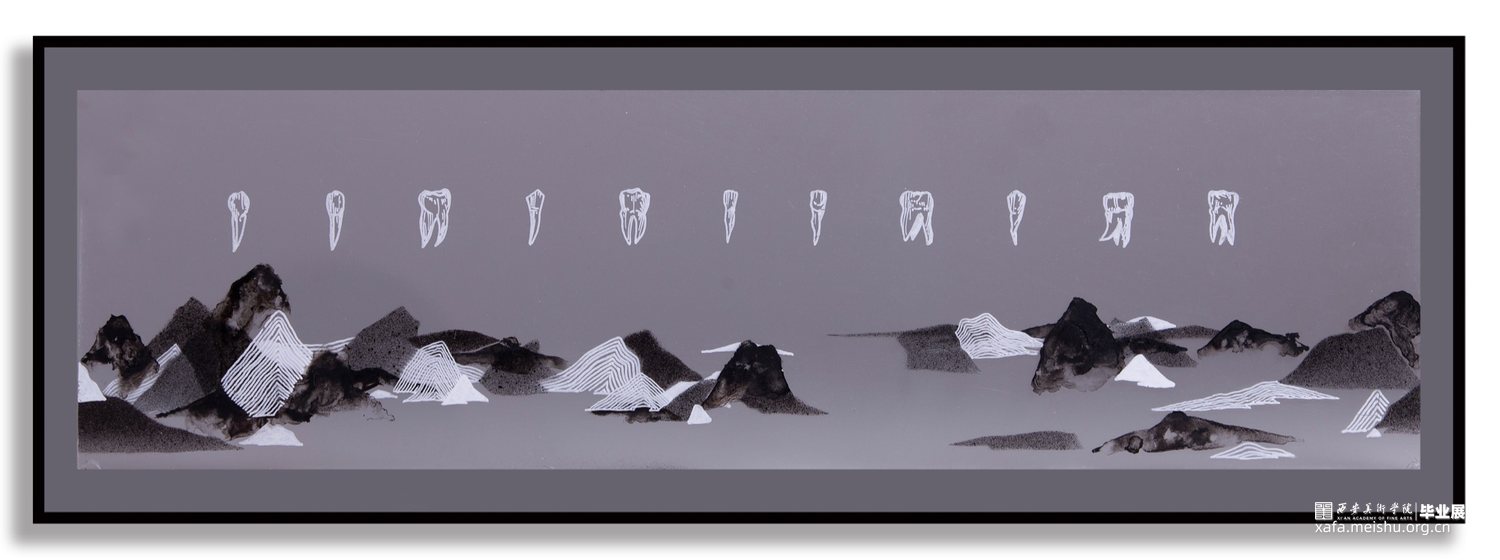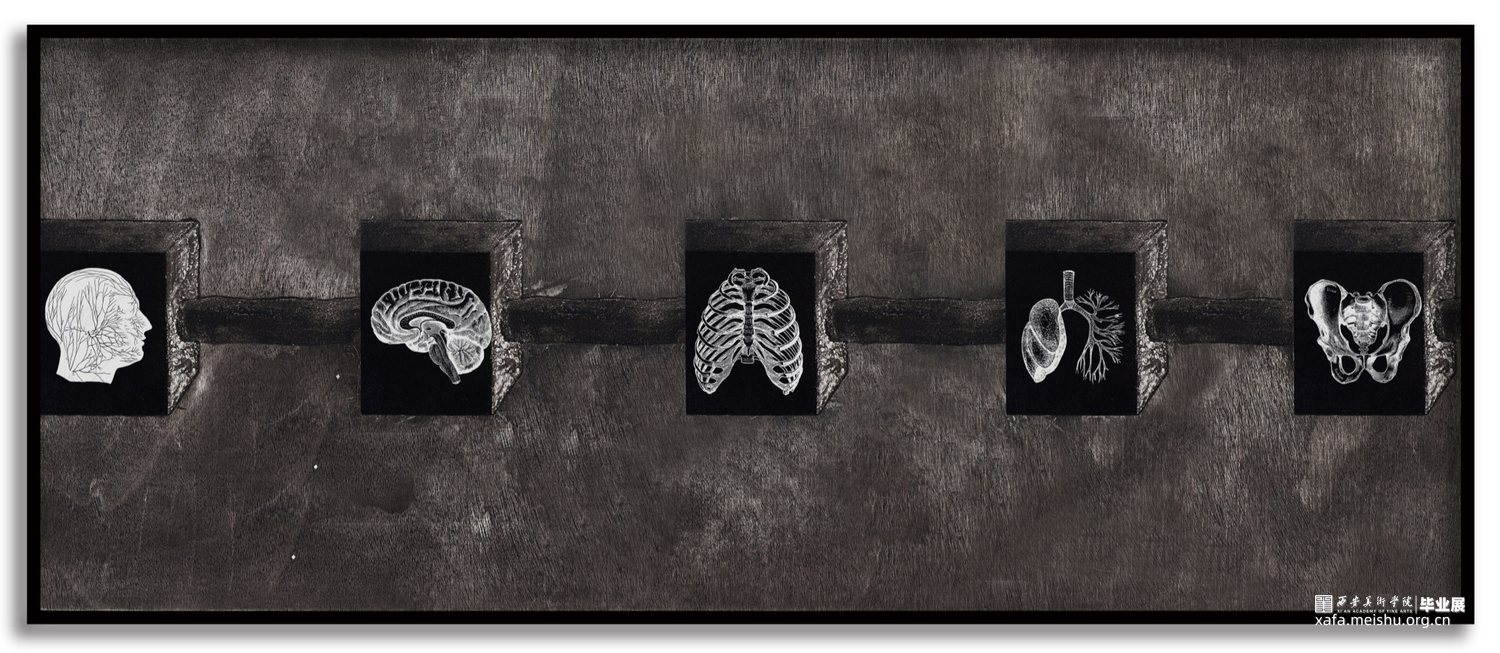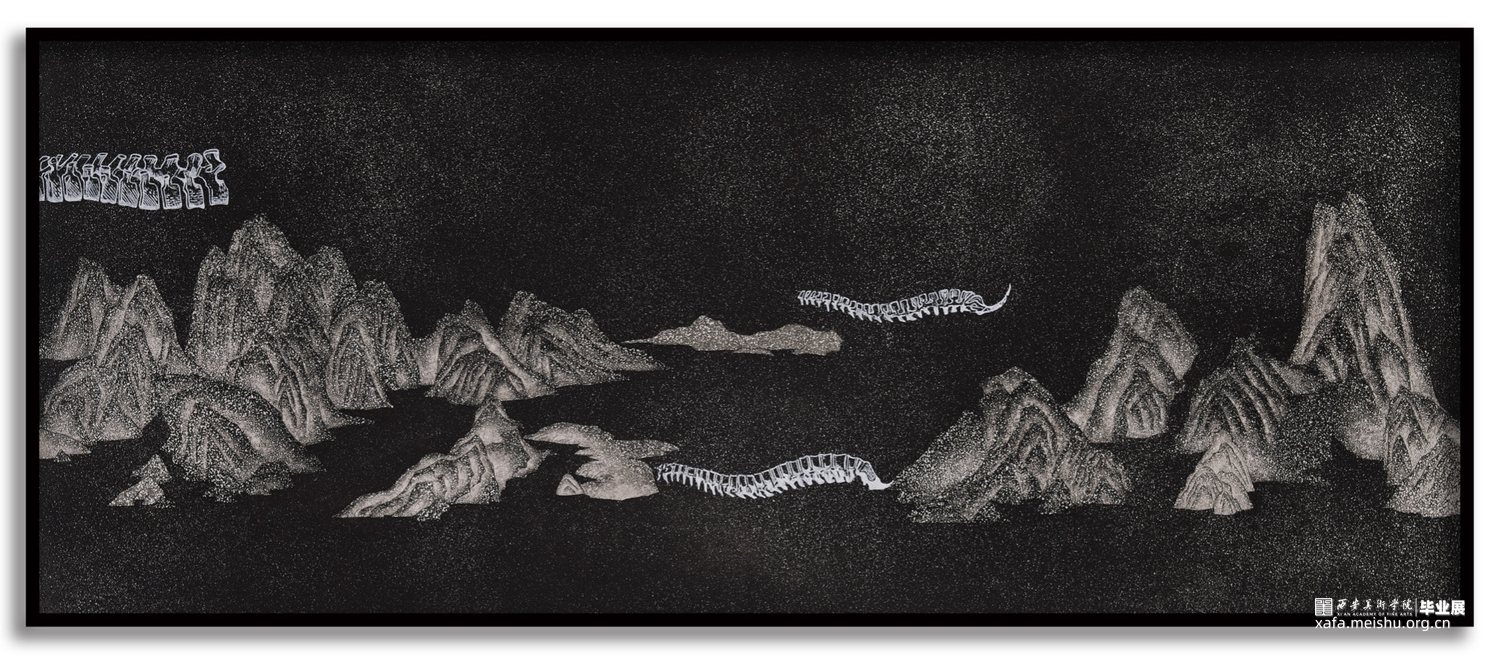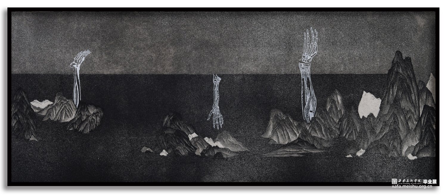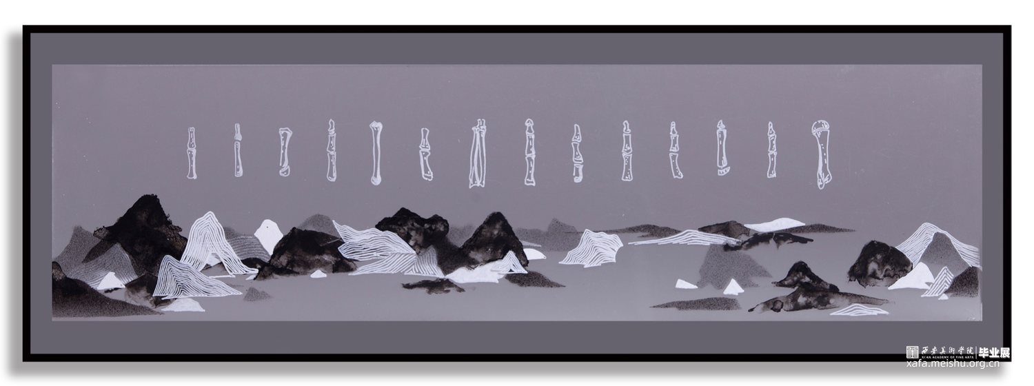 我还描绘了一些山水组成的化石,睡觉的时候弯曲的脊柱贴合着山石的形状,河水和溪流就是我的耳道,海水里藏着我的脑子,山石里藏着我的眼睛,缝隙里藏着我的四肢,沉睡的化石就是我的身体。我试图将骨骼器官和山石结合在一起,尝试绘制了一些小图,将骨骼拆分开和山石结合起来。