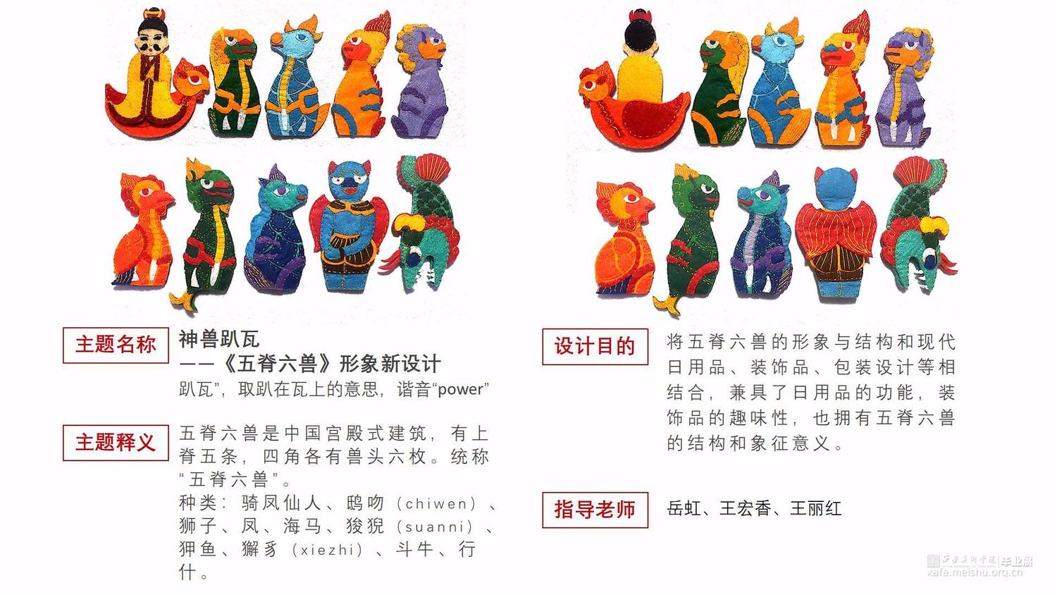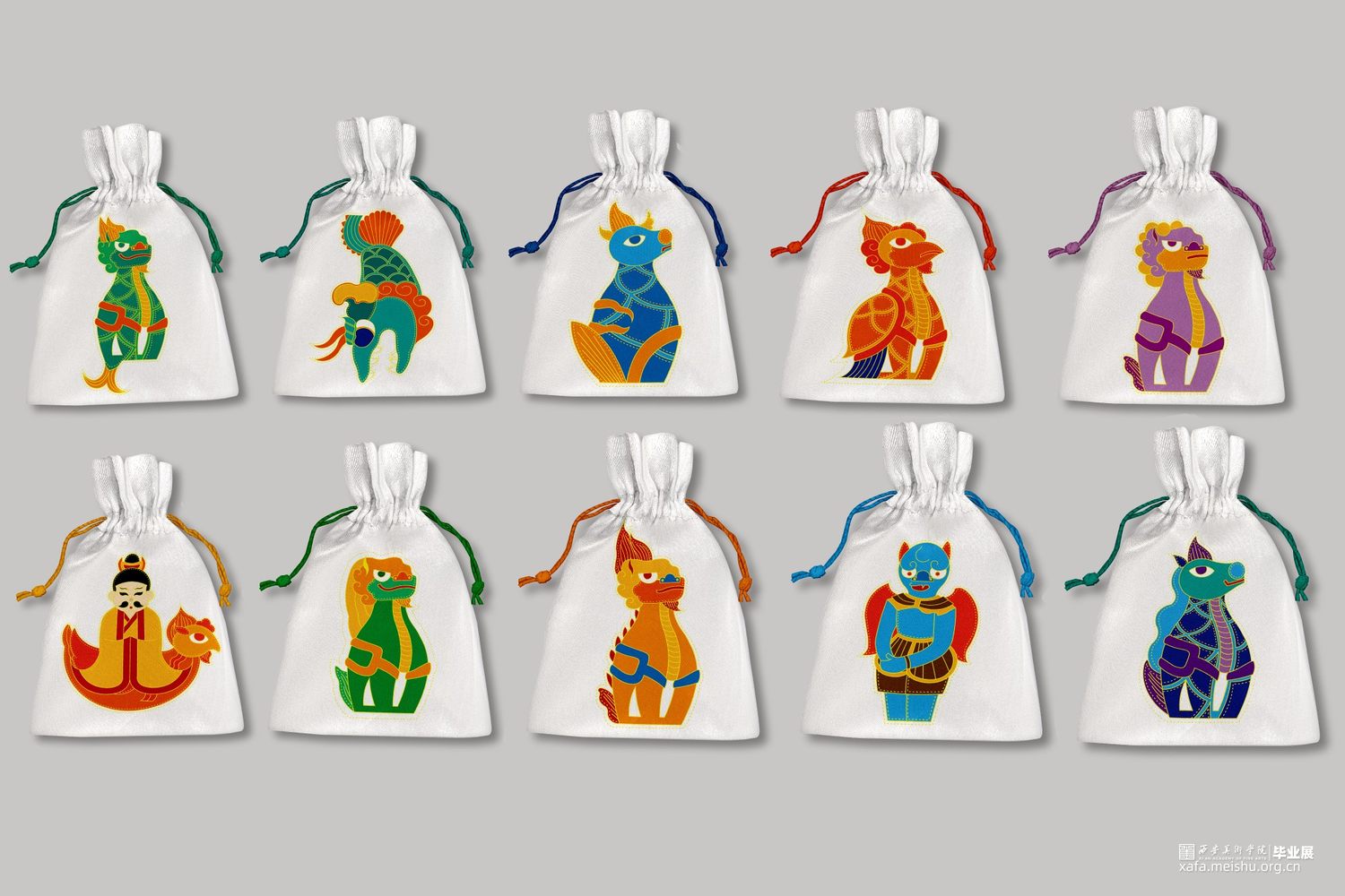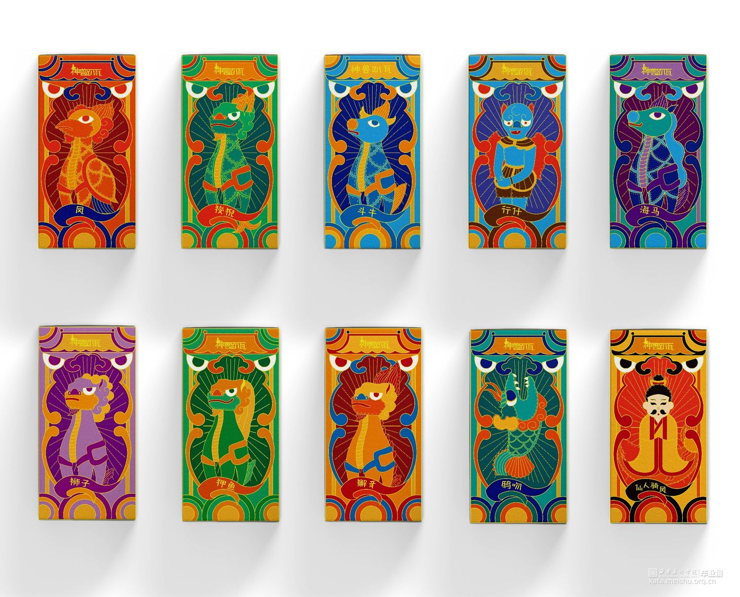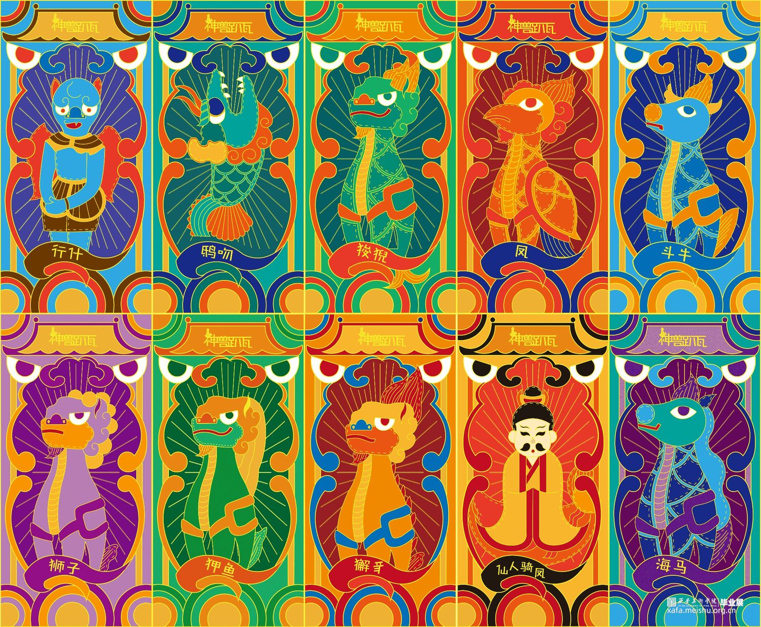 在创作中,不会完全遵照五脊六兽在人们认知中模样狰狞、呲牙咧嘴的形象,会有所美化,并夸大其作为屋脊兽特有的吉祥、装饰美和镇宅三重功能,挑选骑凤仙人、鸱吻(chiwen)、狮子、凤、海马、狻猊(suanni)、狎鱼、獬豸(xiezhi)、斗牛、行什十个神兽进行形象再设计,以十张神兽形象插画为设计主体展现其艺术魅力。