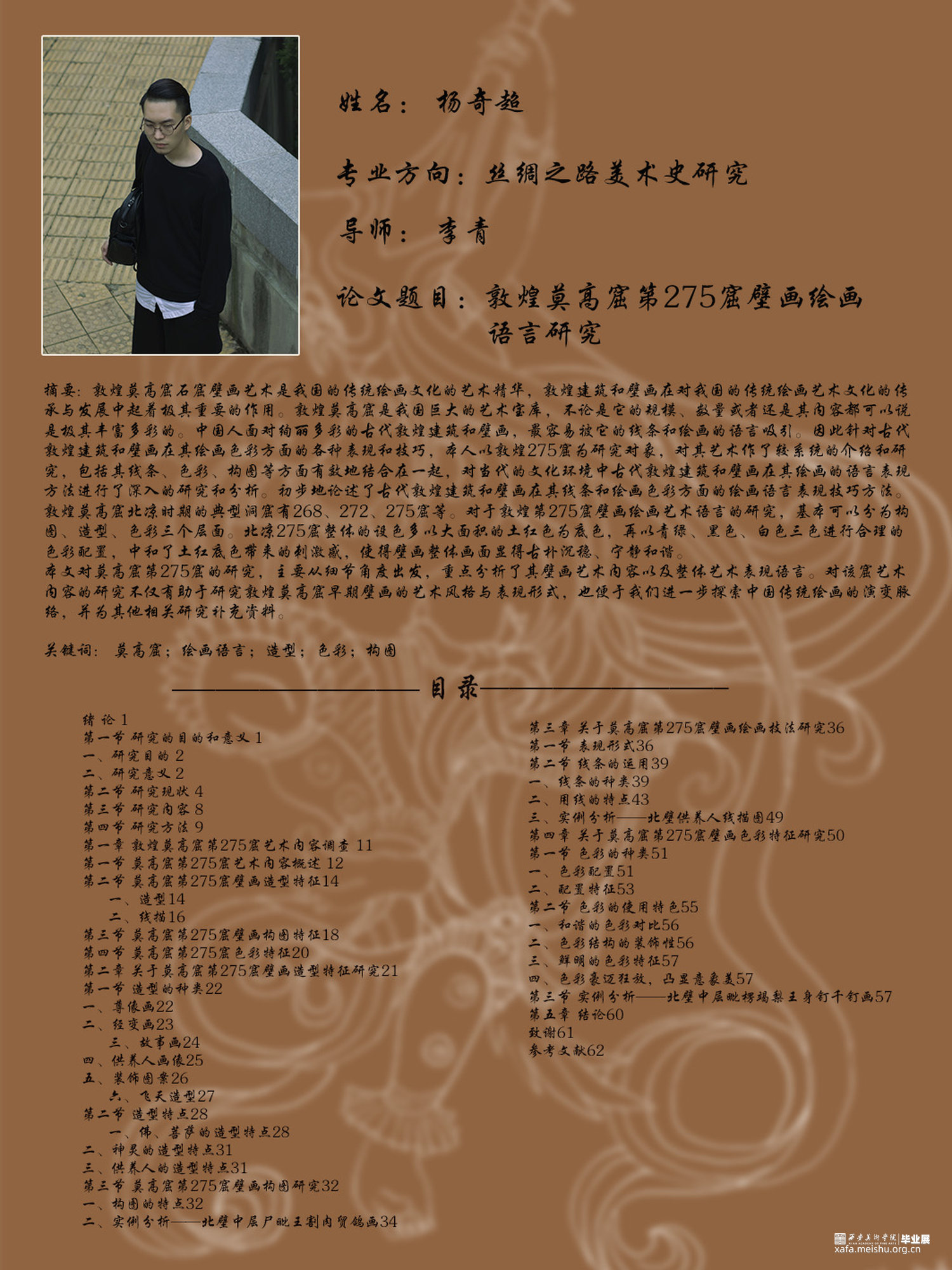 本篇论文以现当代绘画与美术学理论为基础,从一个相对新颖的研究视角出发,对敦煌莫高窟第275窟其画绘画绘画语言作了较系统的介绍和研究,本文可以为前人研究成果进行补充。