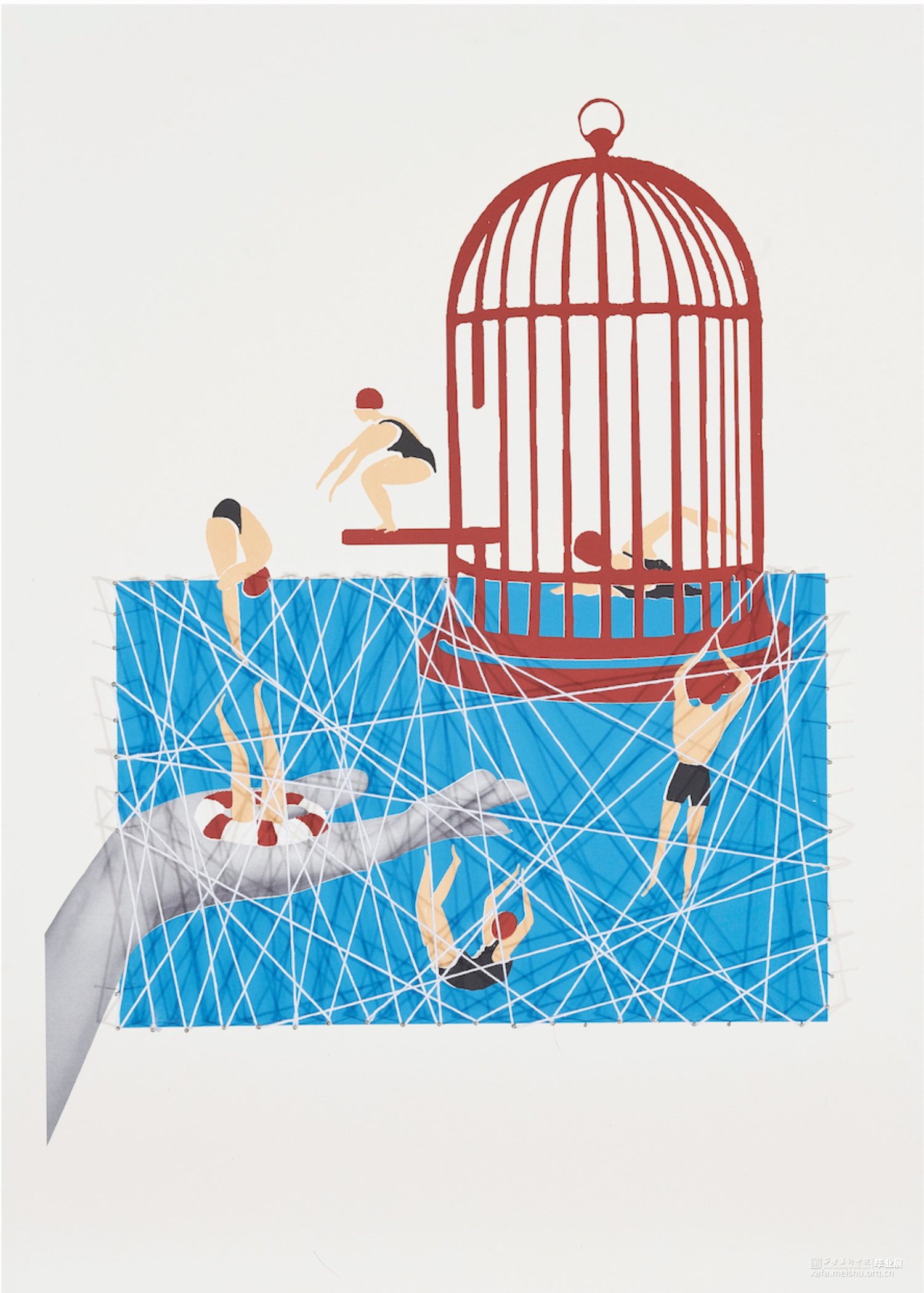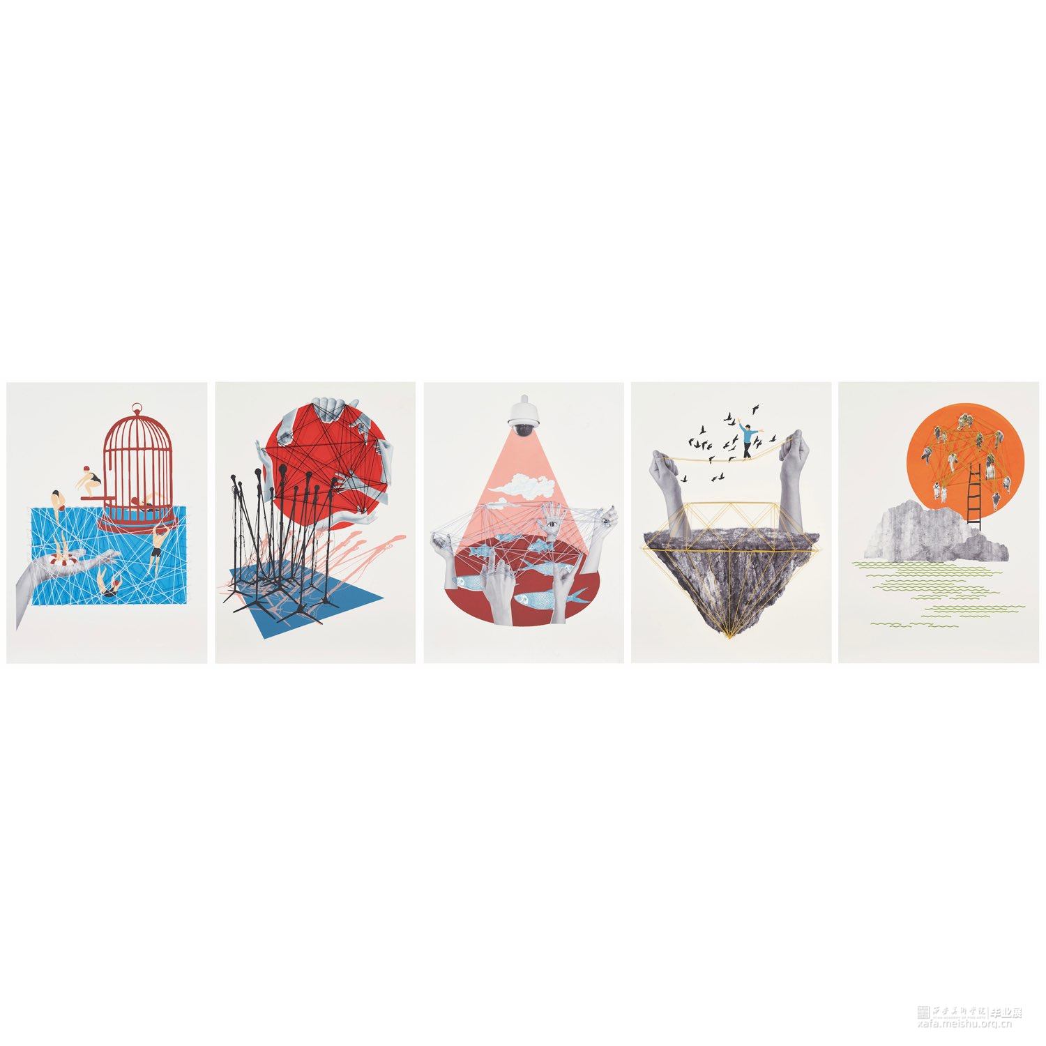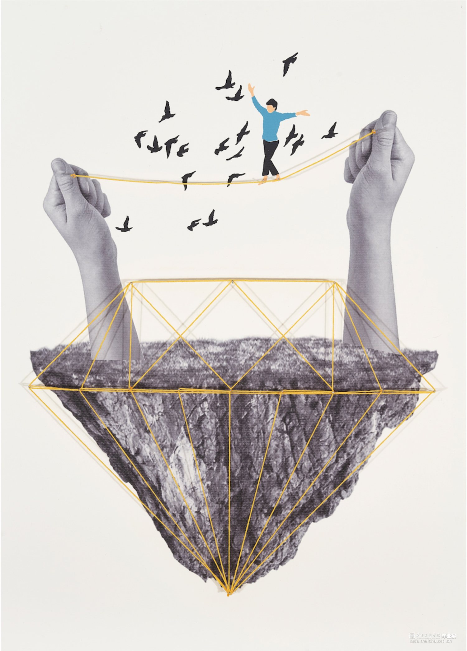 《空间游戏》系列作品利用超现实主义绘画的理念,在创作过程中将客观现实与潜意识、梦境体验、本能感受相融合,将日常图像进行解构、置换,重组,从而产成新的画面,形成多维度空间图像。同时又加入了一些线条和大头针的元素创作在画面外,在光影的作用下,现实与虚拟错织在一起,形成了新的视觉感受。既保留传统的空间刻画方式,又增加了作品的趣味性。