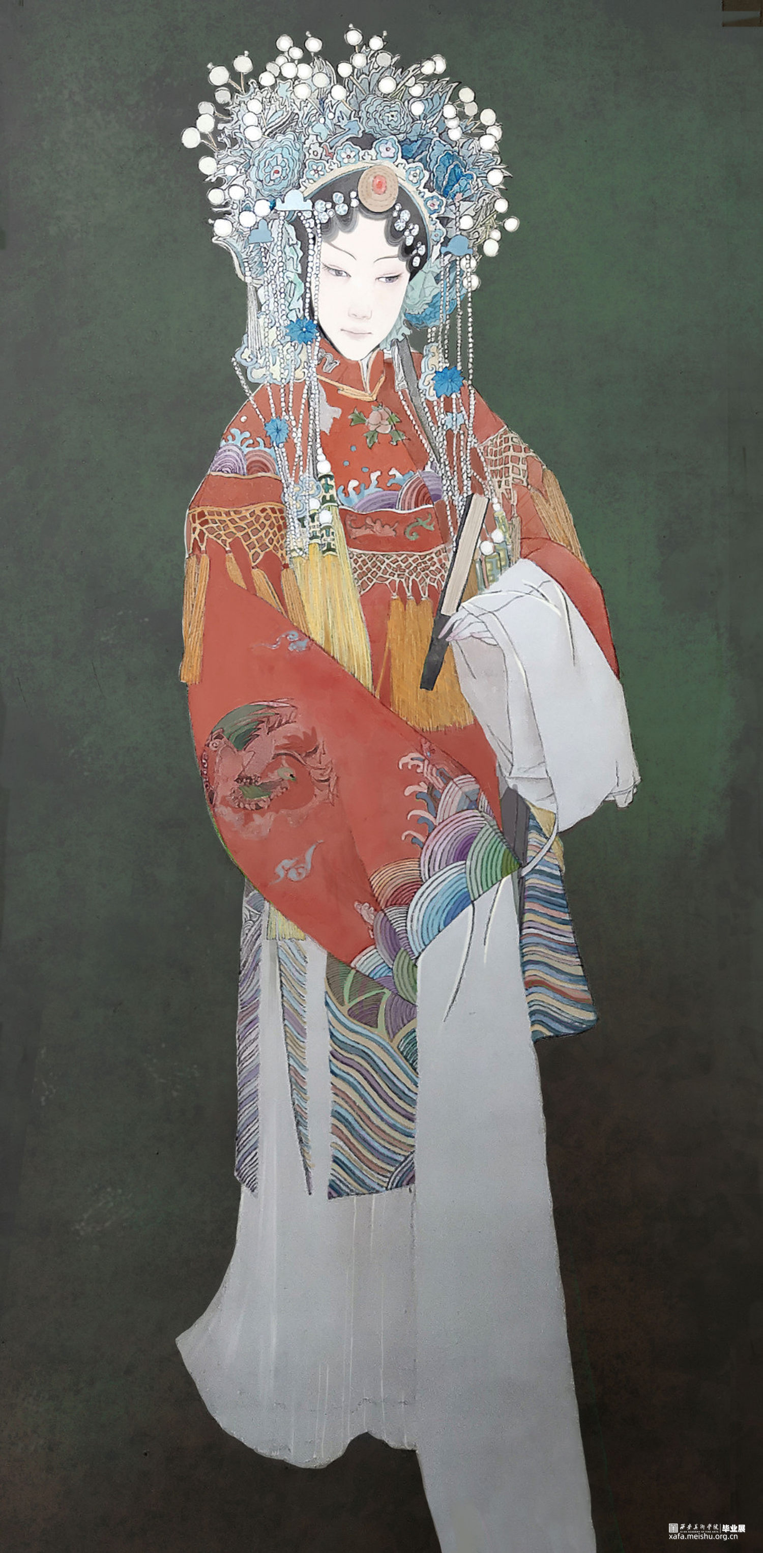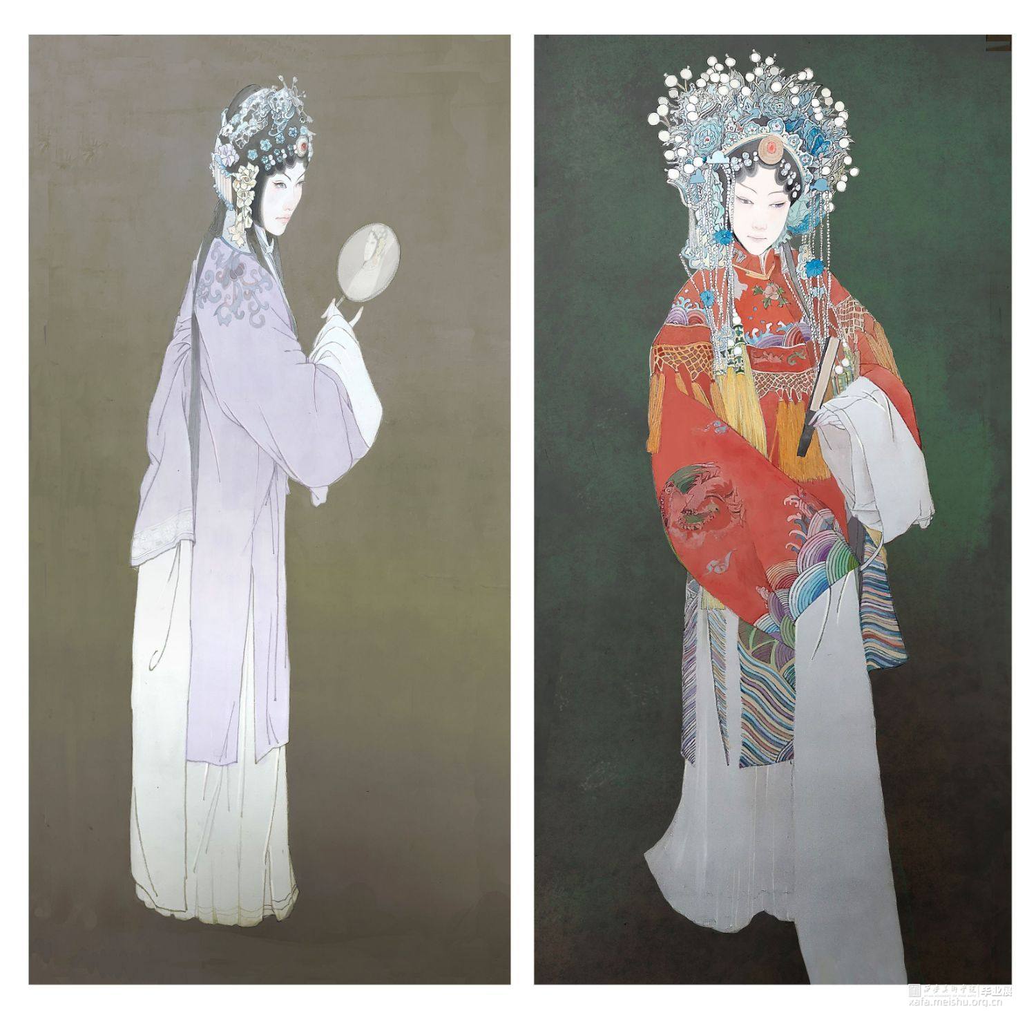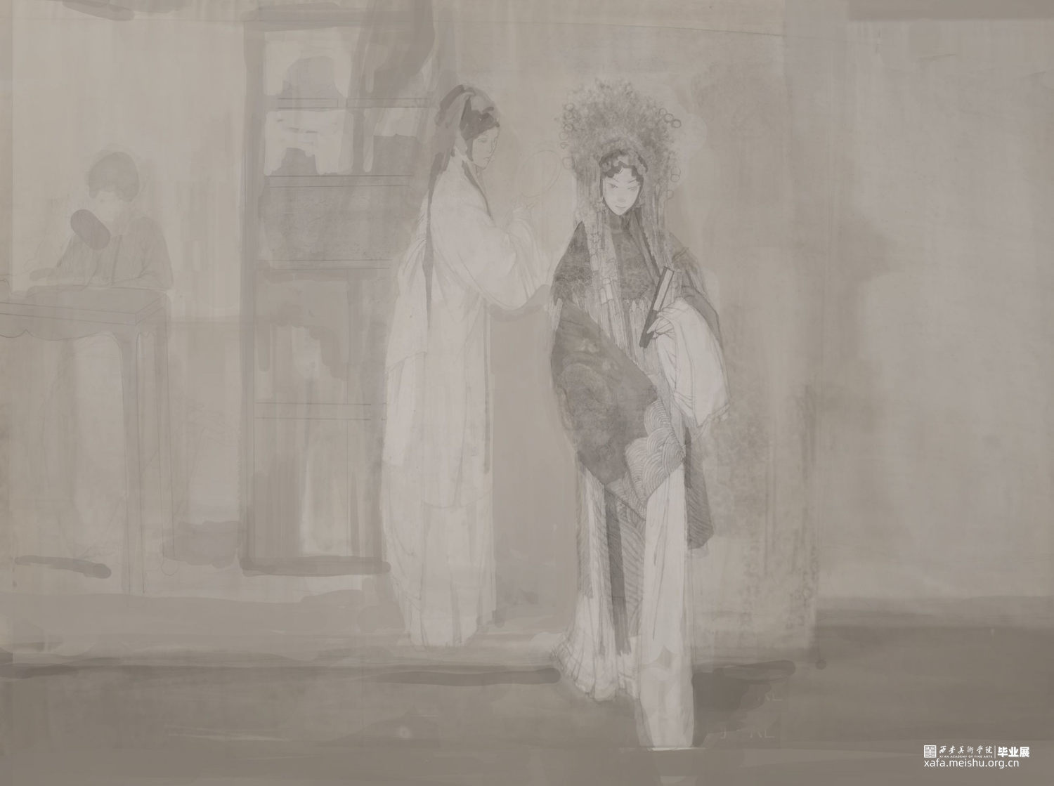 幼时在长辈身边的记忆总像是带着模糊的光晕,伴随着咿呀又遥远的戏曲声音。戏曲是我国国粹,在节奏飞快的当下,我用纸与绢绘制两名人物,希望可以将国粹的艺术与旧日时光凝聚在笔下。在戏曲逐渐淡出大众视野的今日,也可以将戏曲的声与形留下,让其继续散发出光彩。