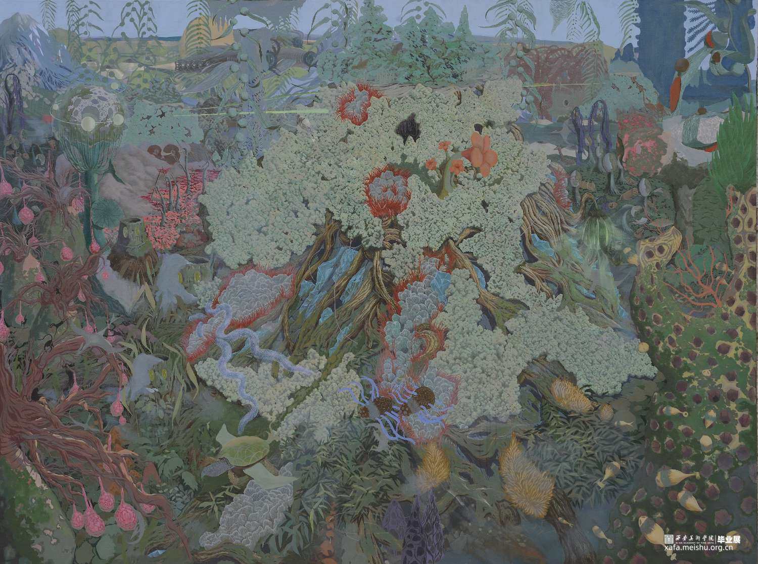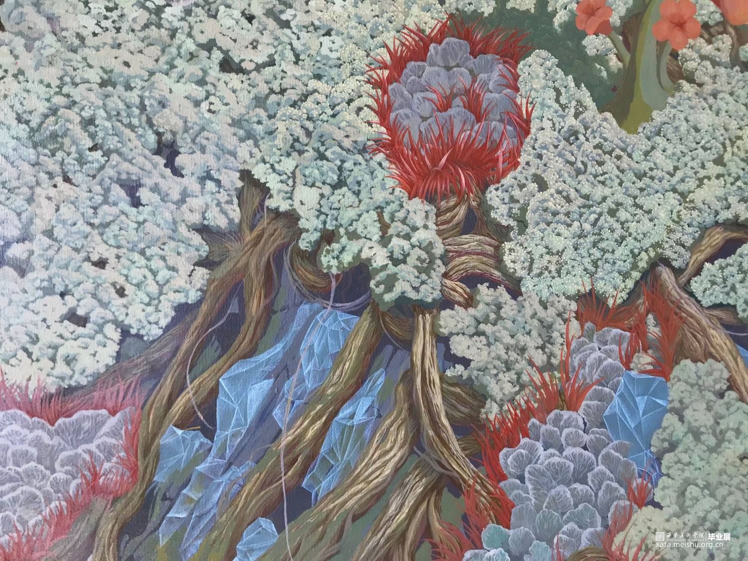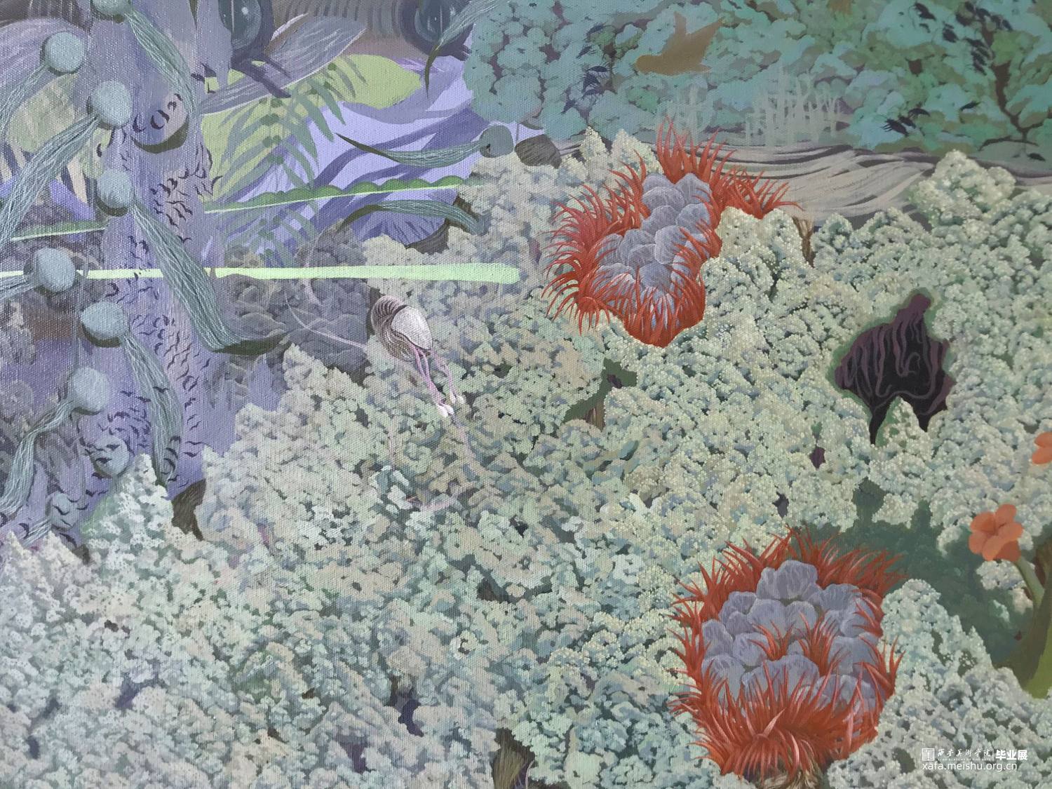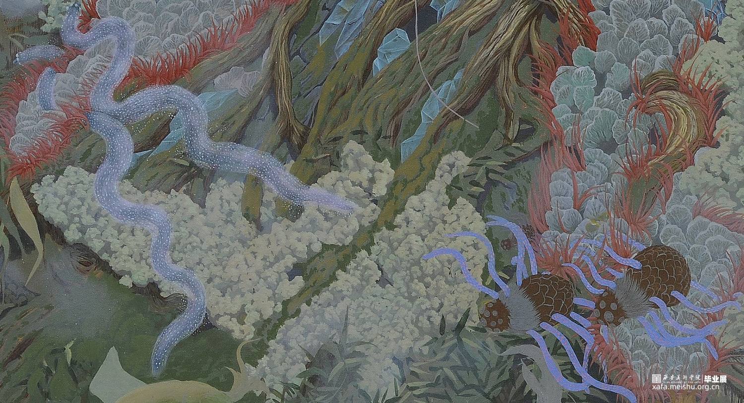 《心灵折叠》这幅作品更多地强调的是人与人之间微妙复杂的联系,我借用自然元素去释放我的内心世界,通过对自身的关系网梳理及对自然物象的理解认识,将两者紧密联系,利用绘画的表征功能,将笼罩在心灵深处的迷雾层层剥开,释放潜在的欲望,深刻剖析自身属性,表达对美好事物的追求和向往。这同样也是我对于青春期后期思想意识转变后的一次总结。构建的是一个与我自身息息相关的且庞杂的世界,画面中每株植物的形态,每片构想的区域,都是思想或某种态度的可视化呈现。