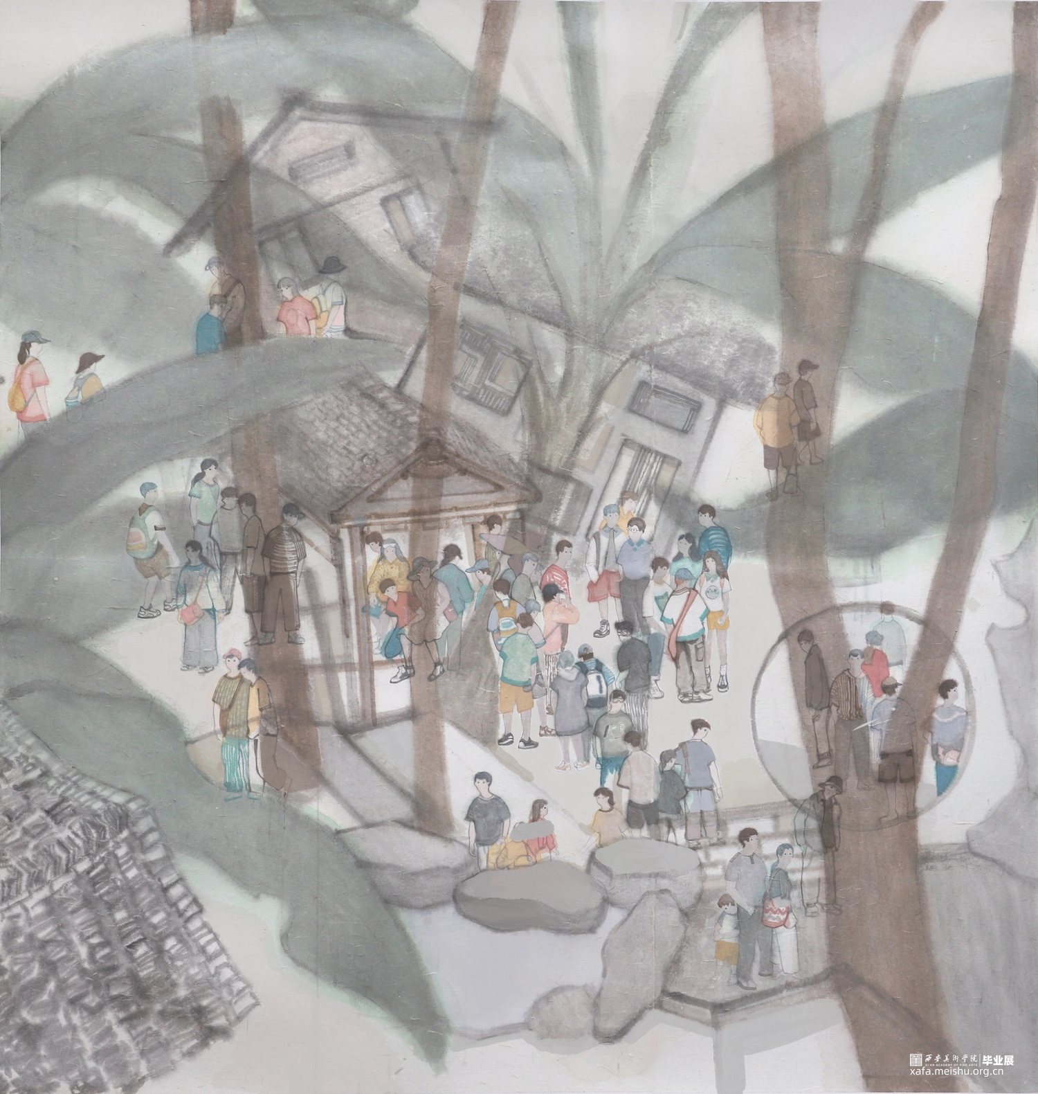 《宿语栖迟》系列3描绘的是夏日芭蕉掩映下的南方园林,游客们三两成组徜徉在林间,倾斜的房屋亭榭容纳着旅途疲惫的游客。我试图将该系列与自己的论文紧密结合,着力于绘画中动态空间意识的运用,芭蕉与树木分割、支撑画面,倾斜的房屋增强了绘画的动态感,画面着重对弯曲变化、倾斜变化、大小变化等规律的应用以追求体现更多的绘画空间。