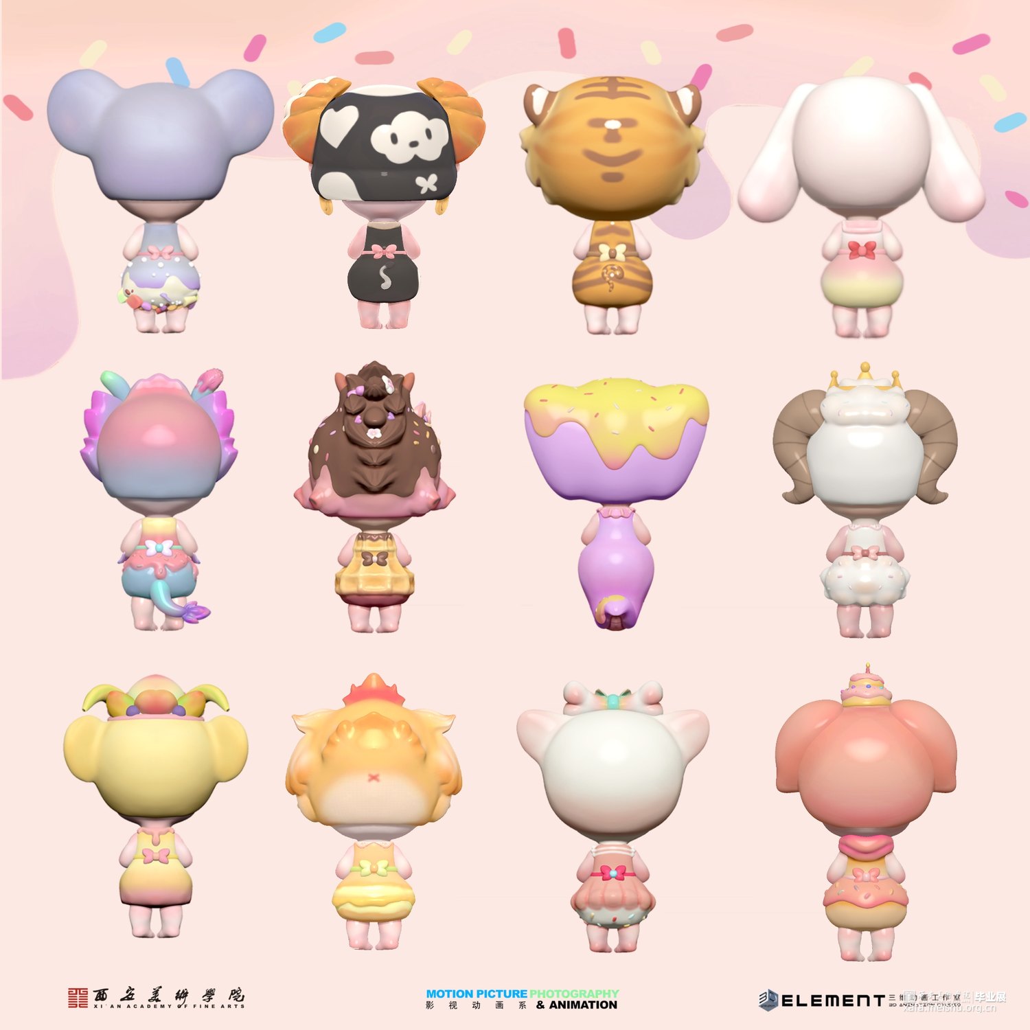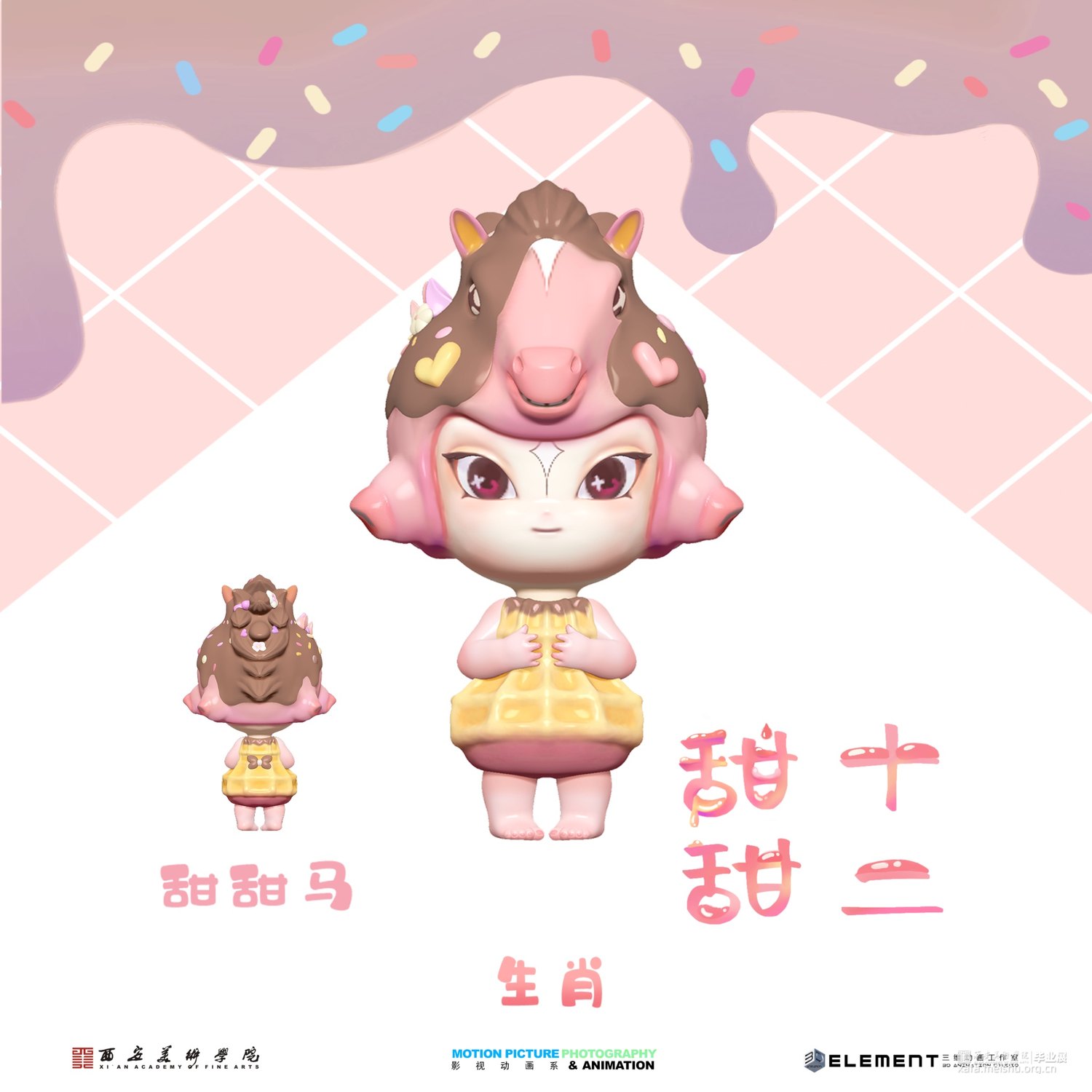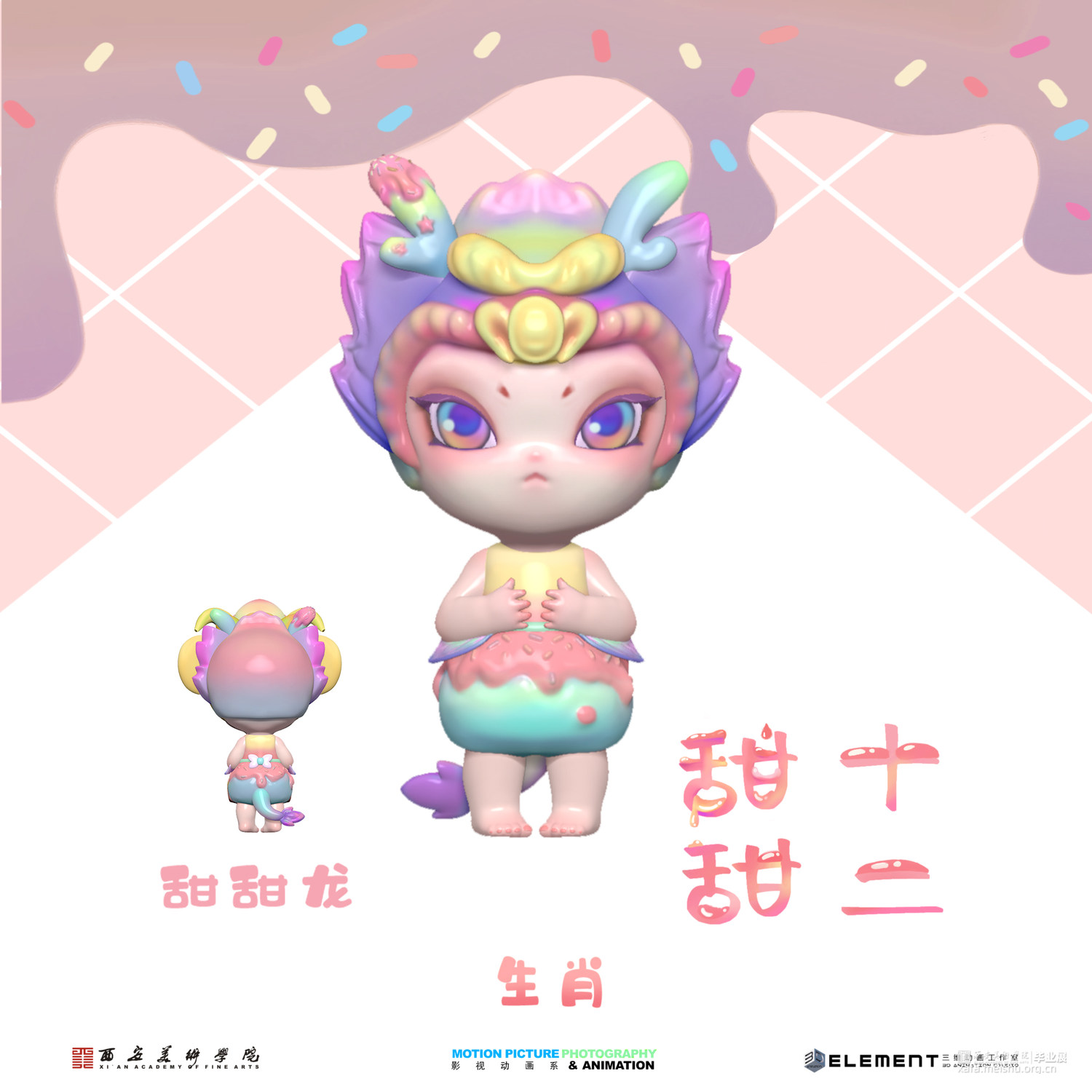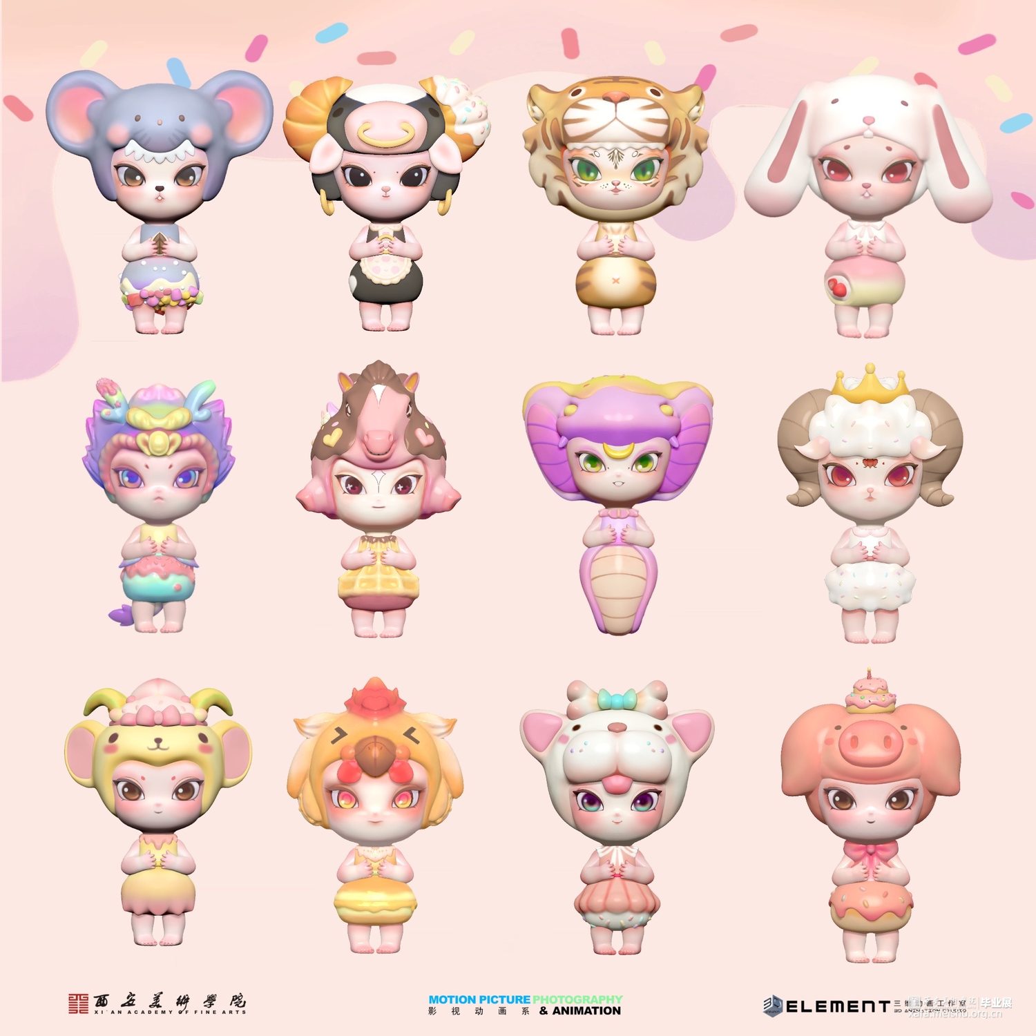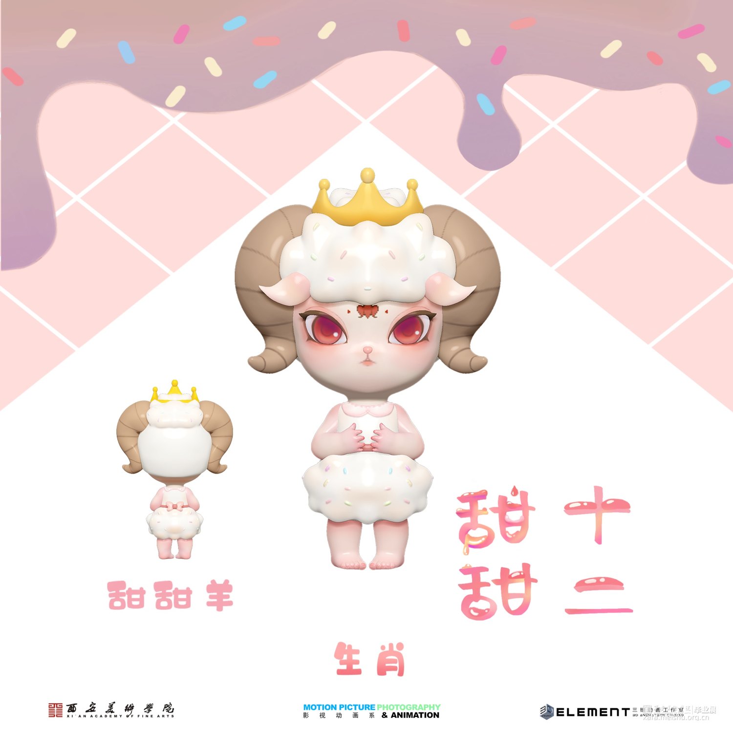 《甜甜十二》打破了以往沉闷的十二生肖印象,首次将甜品元素与十二生肖结合拟人化,粉嫩香甜食欲大动,接地气的同时也弘扬了传统文化,十二生肖不再是博物馆玻璃展厅里高高在上的陈列品,让文物更加贴近生活。在原本的造型上添加了奶油、蛋糕、彩色巧克力碎、面包、水果等等关于甜品里的一些材料。每个娃娃结合一款甜品设计,比如甜甜鼠是平时吃的紫薯水果芋圆甜品想出来的--紫鼠芋圆;甜甜猪是自己过生日吃的生日蛋糕,大家的生日祝福--“猪”你生日快乐;甜甜兔是我最爱吃的甜品雪媚娘觉得两者特征比较相似--雪媚“兔兔”娘,都是白团子所以结合设计的;甜甜龙结合的是五颜六色的甜甜圈等等这样构思。根据设计的造型与相似的甜品结合命名于是就有了