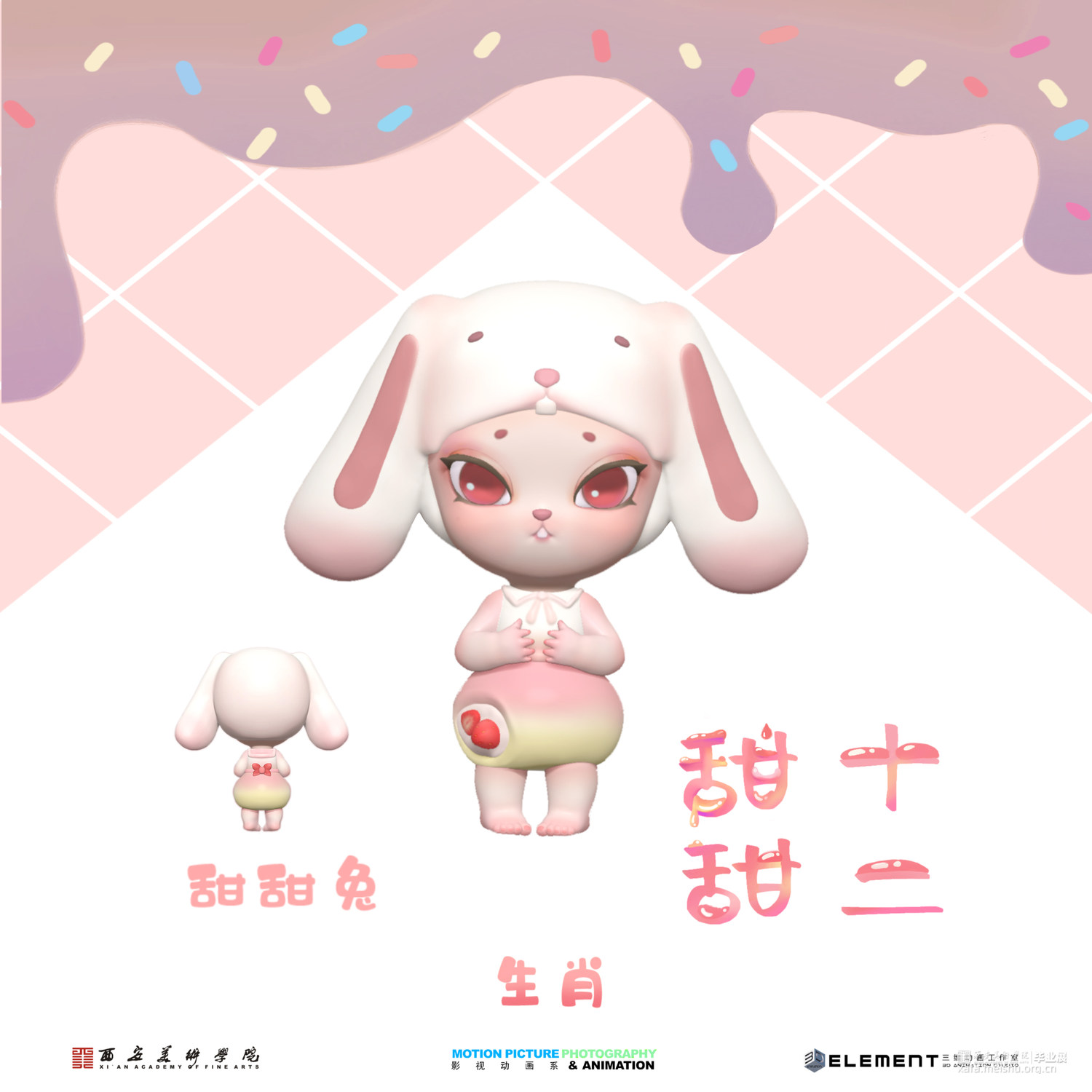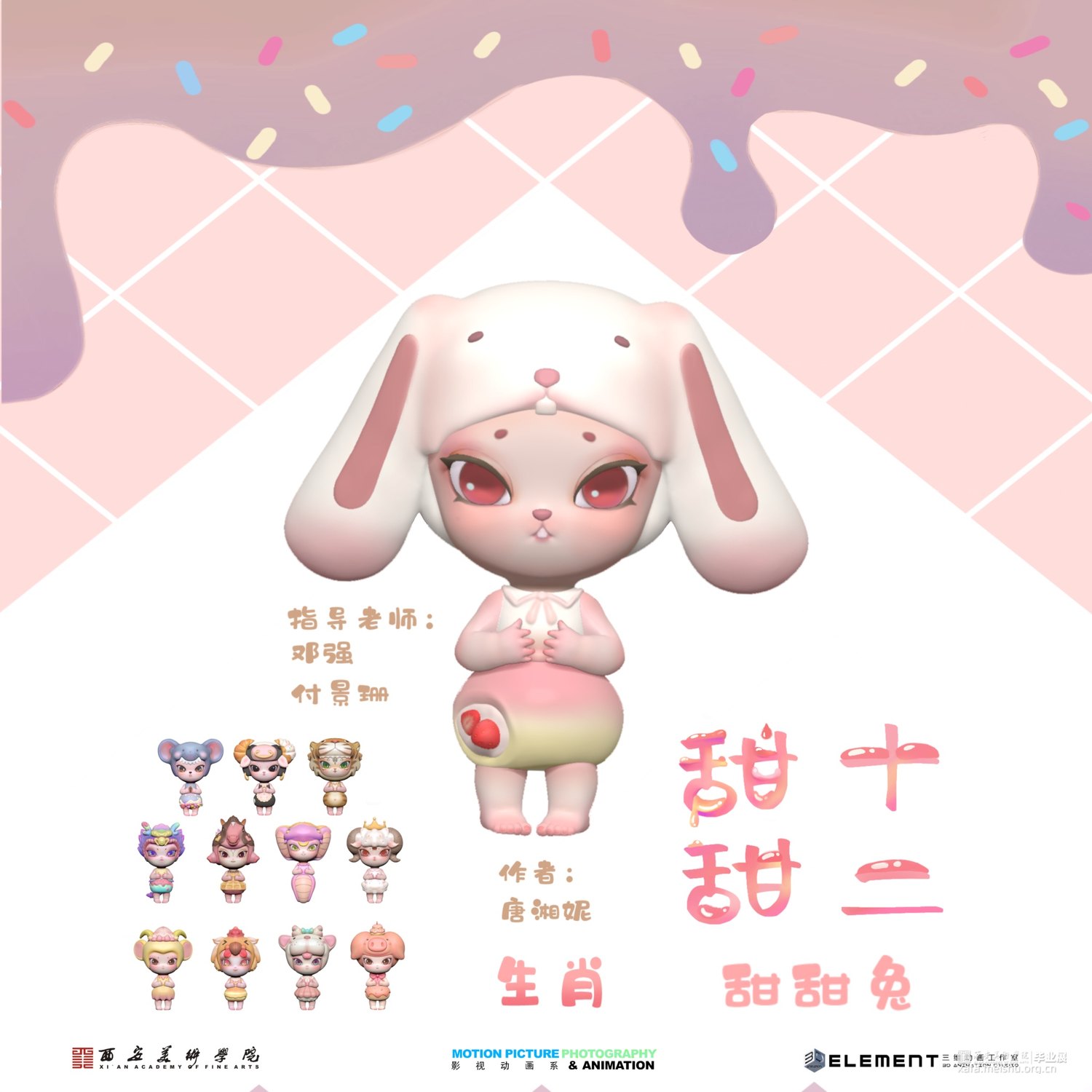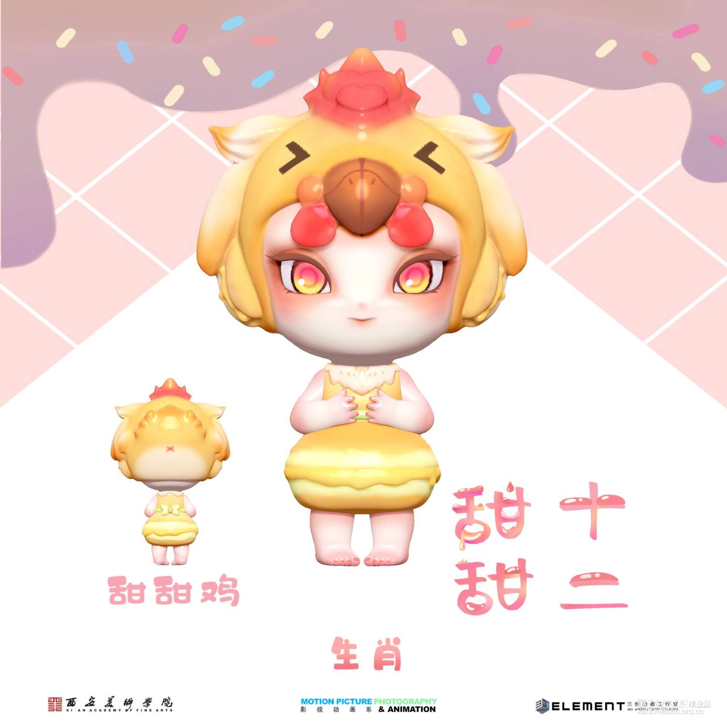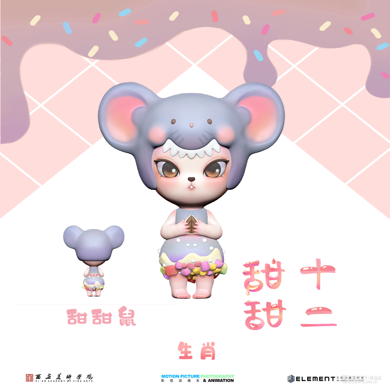 《甜甜十二》打破了以往沉闷的十二生肖印象,首次将甜品元素与十二生肖结合拟人化,粉嫩香甜食欲大动,接地气的同时也弘扬了传统文化,十二生肖不再是博物馆玻璃展厅里高高在上的陈列品,让文物更加贴近生活。在原本的造型上添加了奶油、蛋糕、彩色巧克力碎、面包、水果等等关于甜品里的一些材料。每个娃娃结合一款甜品设计,比如甜甜鼠是平时吃的紫薯水果芋圆甜品想出来的--紫鼠芋圆;甜甜猪是自己过生日吃的生日蛋糕,大家的生日祝福--“猪”你生日快乐;甜甜兔是我最爱吃的甜品雪媚娘觉得两者特征比较相似--雪媚“兔兔”娘,都是白团子所以结合设计的;甜甜龙结合的是五颜六色的甜甜圈等等这样构思。根据设计的造型与相似的甜品结合命名于是就有了