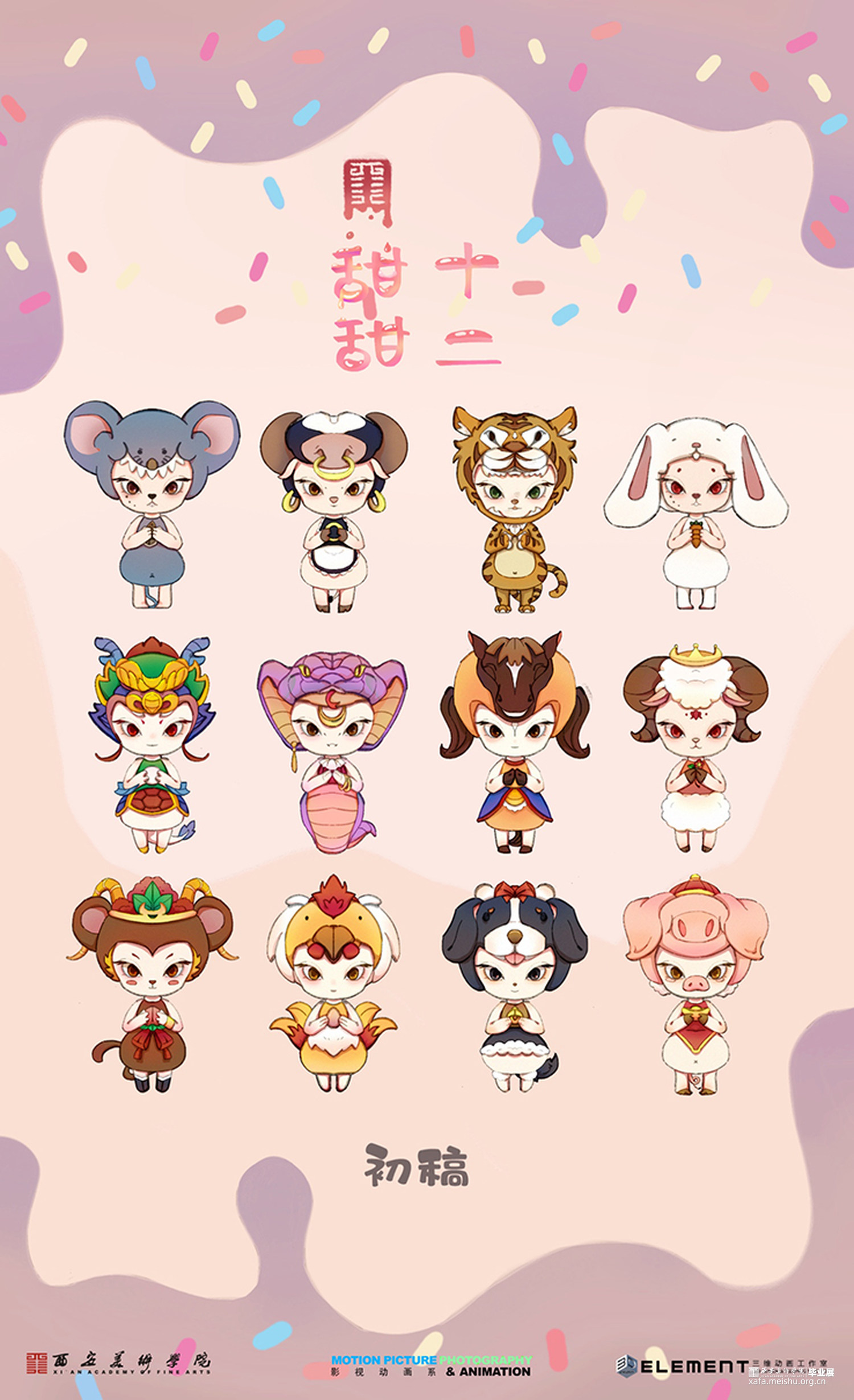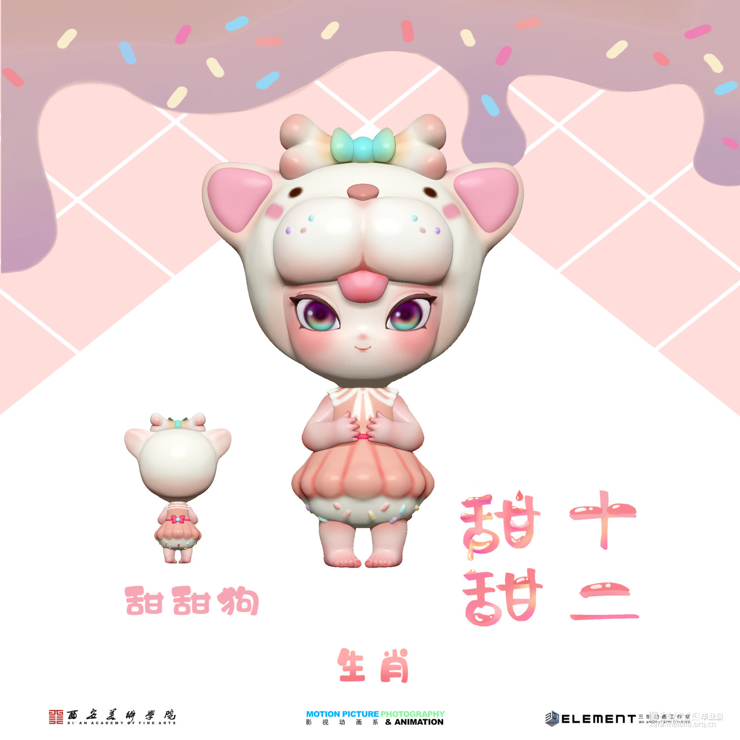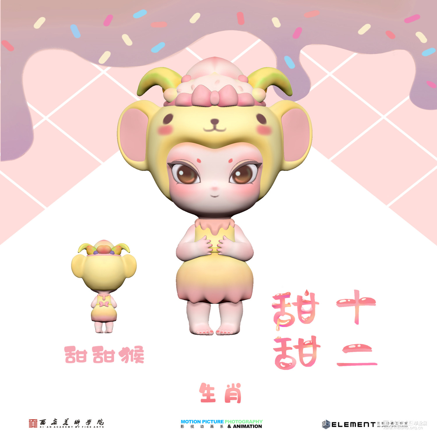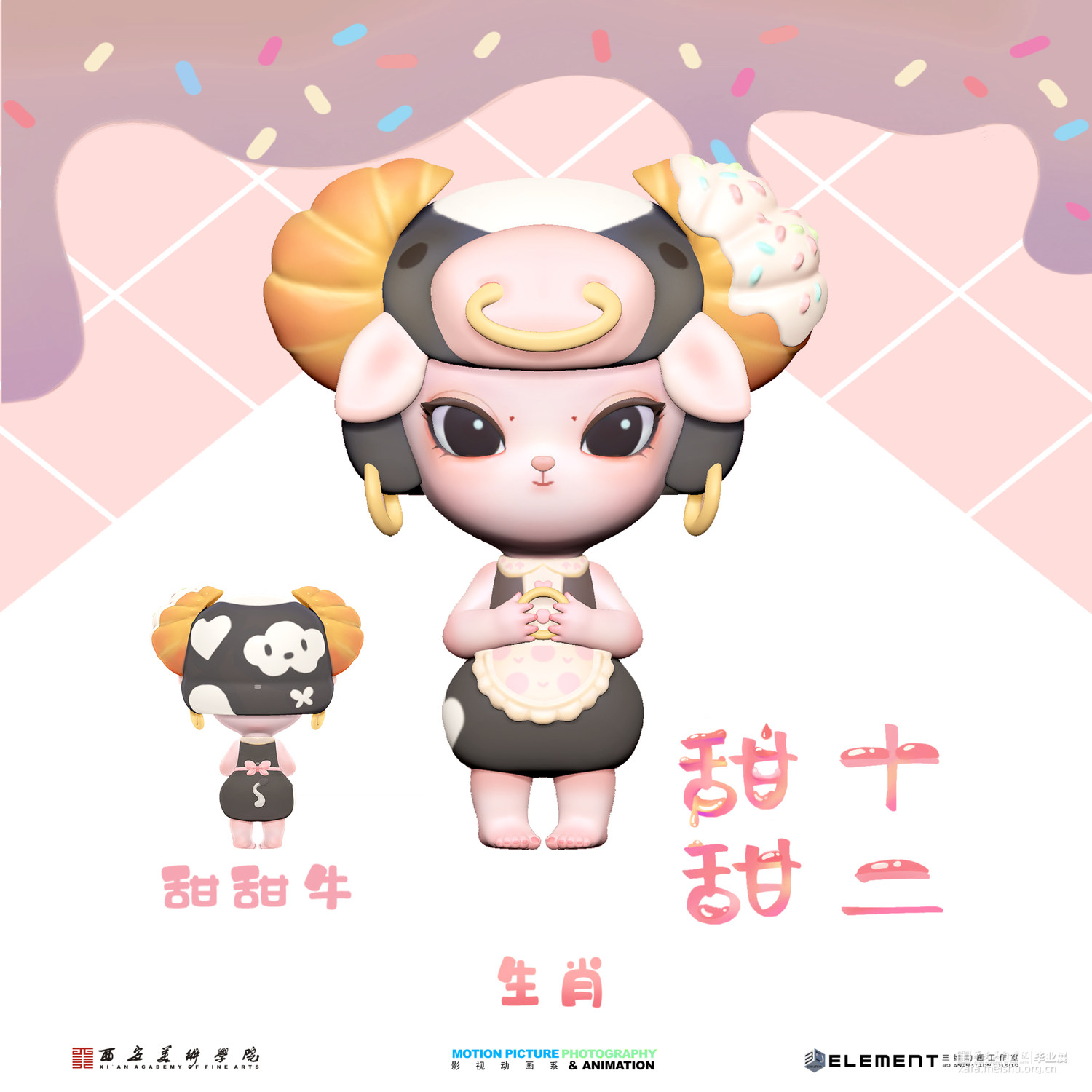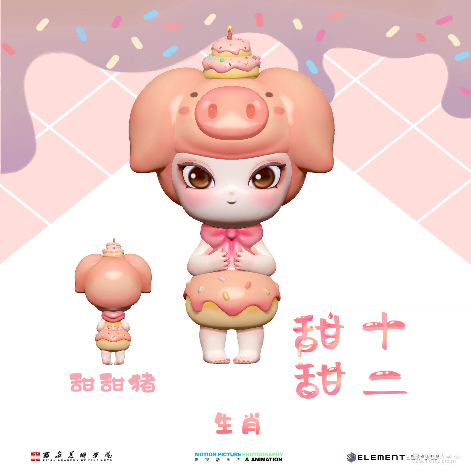 《甜甜十二》打破了以往沉闷的十二生肖印象,首次将甜品元素与十二生肖结合拟人化,粉嫩香甜食欲大动,接地气的同时也弘扬了传统文化,十二生肖不再是博物馆玻璃展厅里高高在上的陈列品,让文物更加贴近生活。在原本的造型上添加了奶油、蛋糕、彩色巧克力碎、面包、水果等等关于甜品里的一些材料。每个娃娃结合一款甜品设计,比如甜甜鼠是平时吃的紫薯水果芋圆甜品想出来的--紫鼠芋圆;甜甜猪是自己过生日吃的生日蛋糕,大家的生日祝福--“猪”你生日快乐;甜甜兔是我最爱吃的甜品雪媚娘觉得两者特征比较相似--雪媚“兔兔”娘,都是白团子所以结合设计的;甜甜龙结合的是五颜六色的甜甜圈等等这样构思。根据设计的造型与相似的甜品结合命名于是就有了