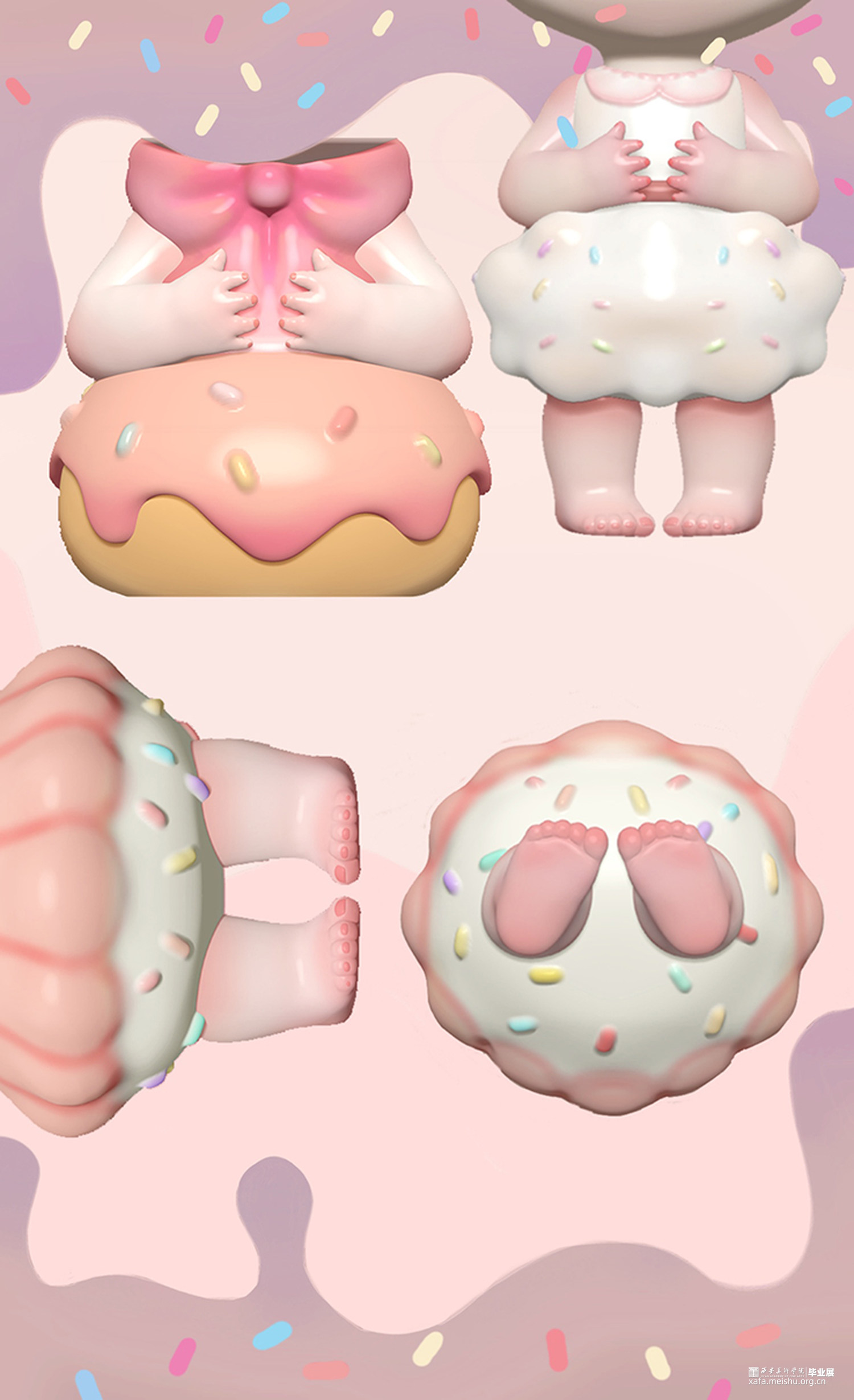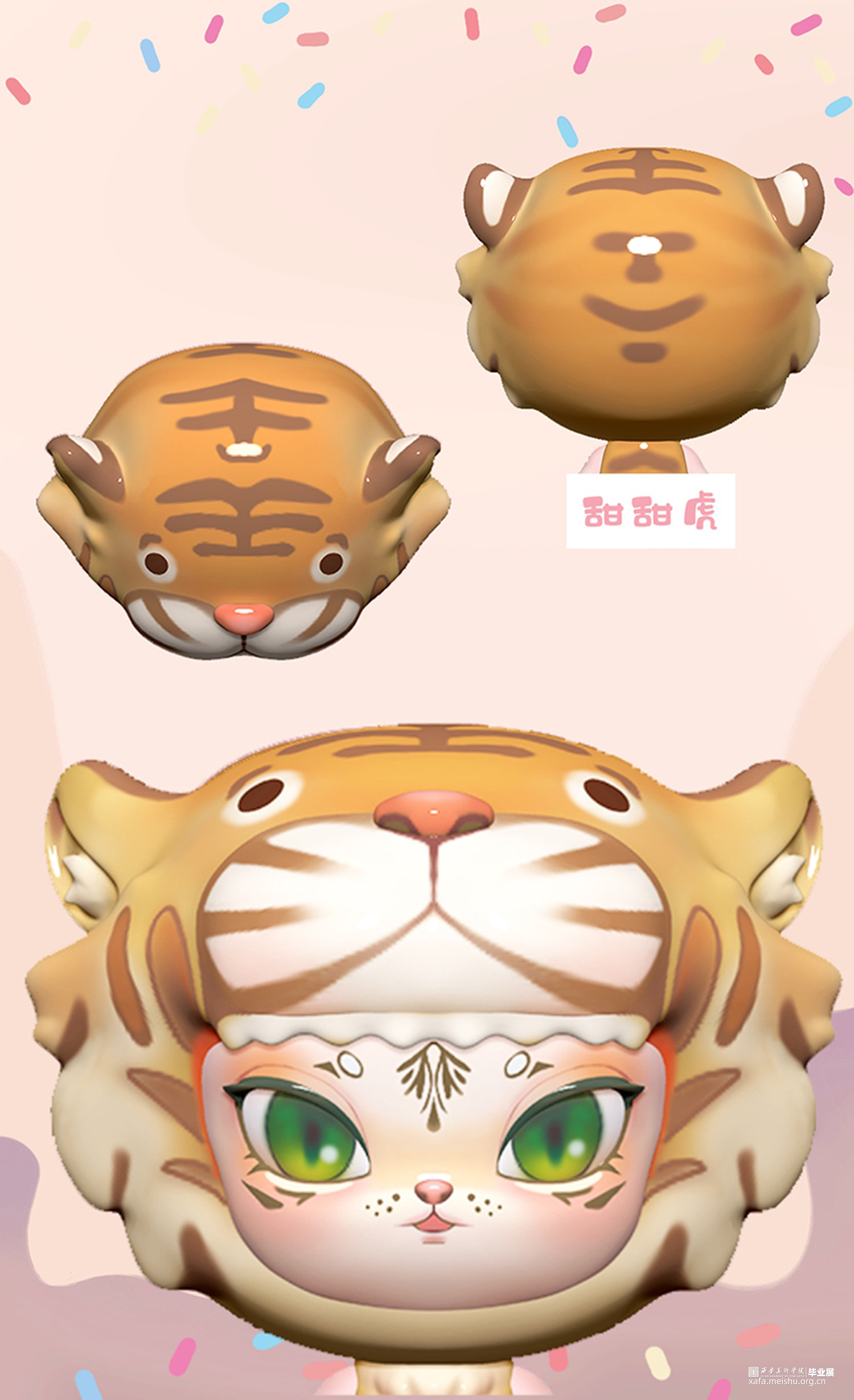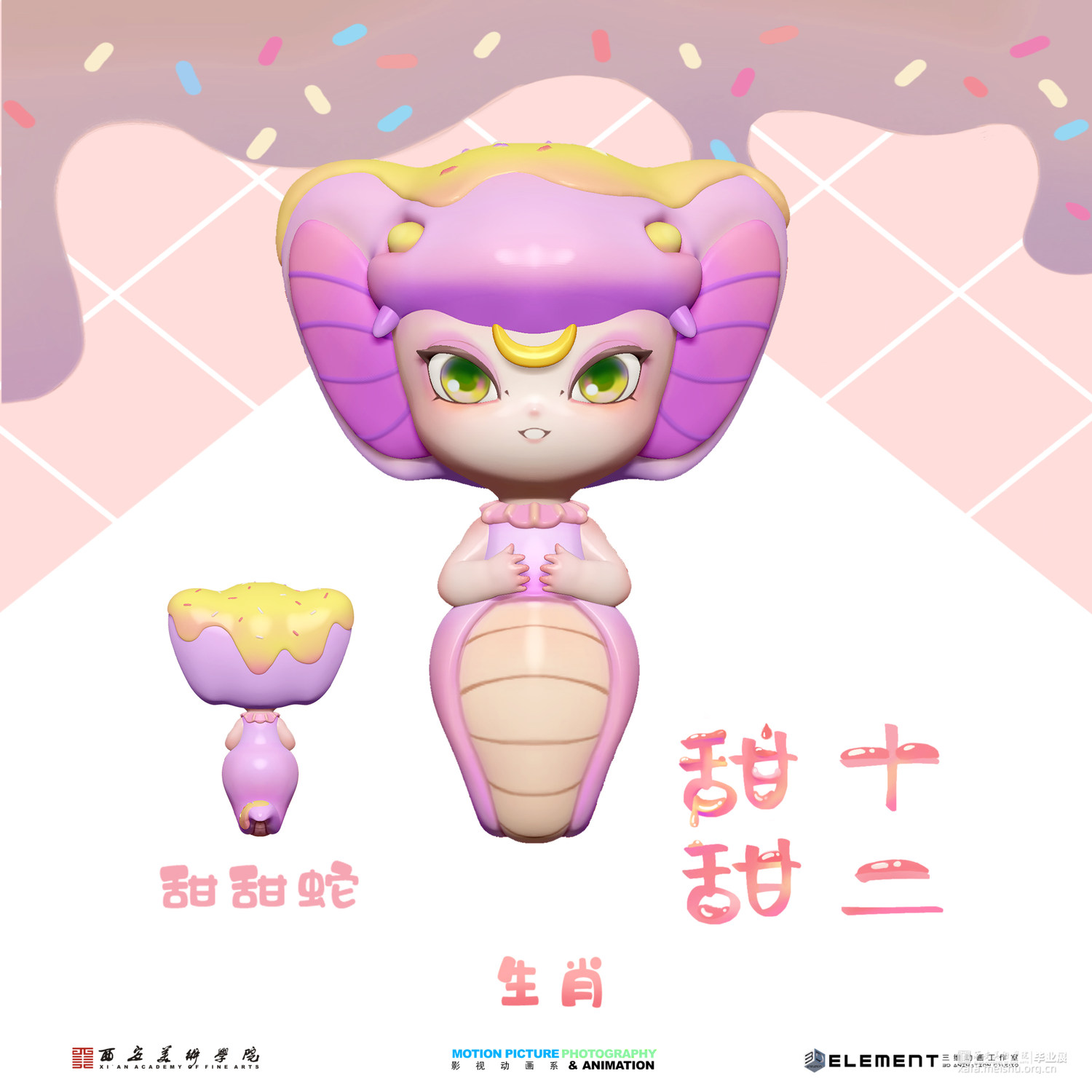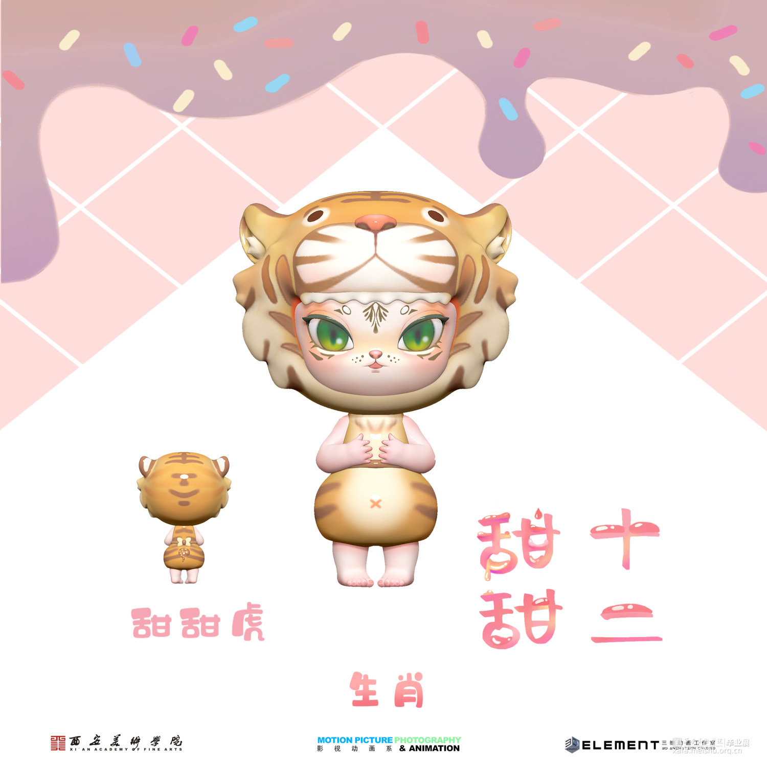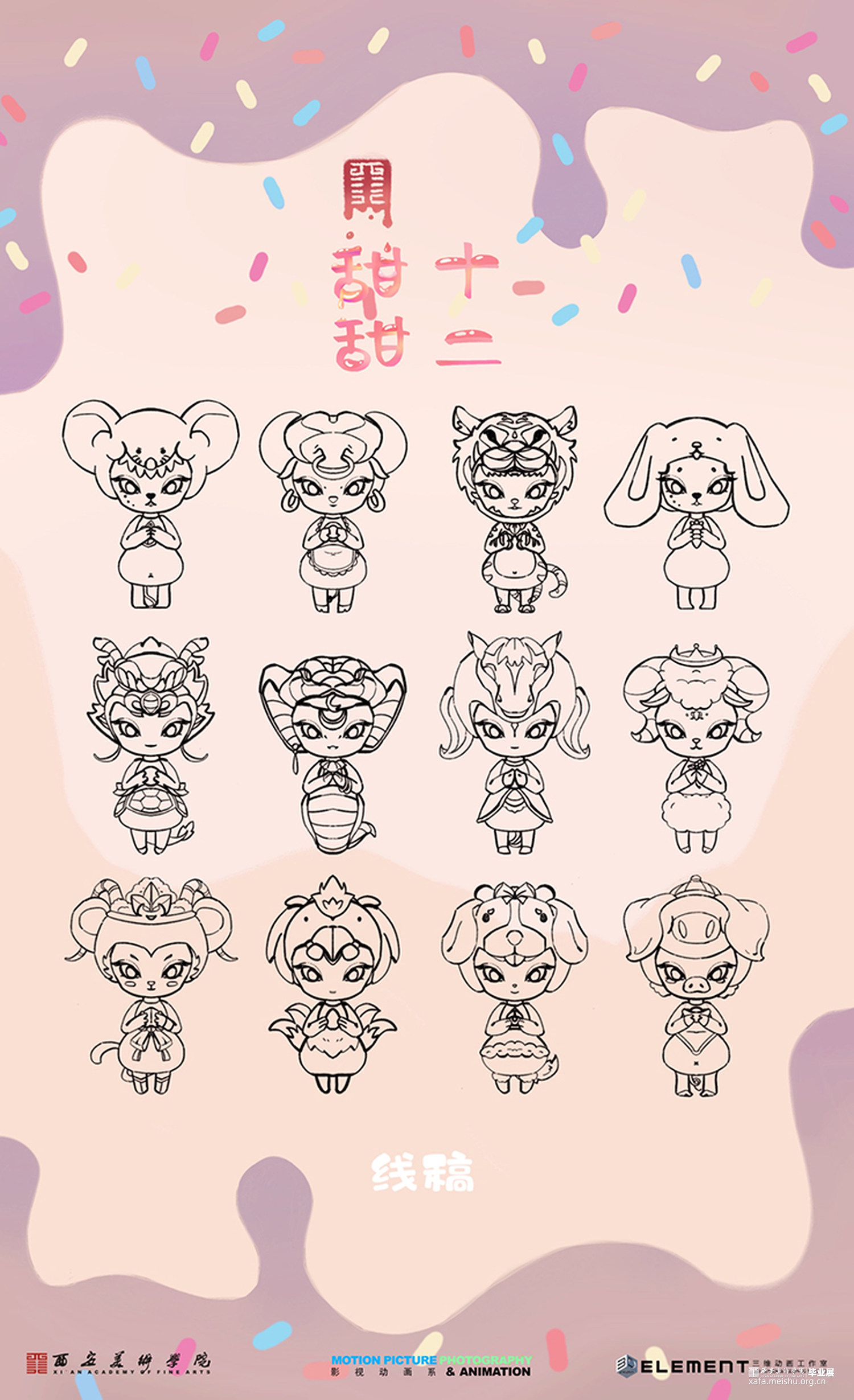《甜甜十二》打破了以往沉闷的十二生肖印象,首次将甜品元素与十二生肖结合拟人化,粉嫩香甜食欲大动,接地气的同时也弘扬了传统文化,十二生肖不再是博物馆玻璃展厅里高高在上的陈列品,让文物更加贴近生活。在原本的造型上添加了奶油、蛋糕、彩色巧克力碎、面包、水果等等关于甜品里的一些材料。每个娃娃结合一款甜品设计,比如甜甜鼠是平时吃的紫薯水果芋圆甜品想出来的--紫鼠芋圆;甜甜猪是自己过生日吃的生日蛋糕,大家的生日祝福--“猪”你生日快乐;甜甜兔是我最爱吃的甜品雪媚娘觉得两者特征比较相似--雪媚“兔兔”娘,都是白团子所以结合设计的;甜甜龙结合的是五颜六色的甜甜圈等等这样构思。根据设计的造型与相似的甜品结合命名于是就有了