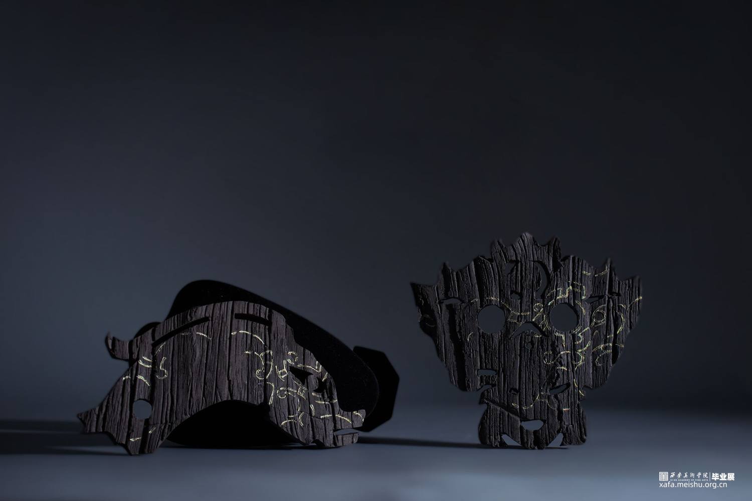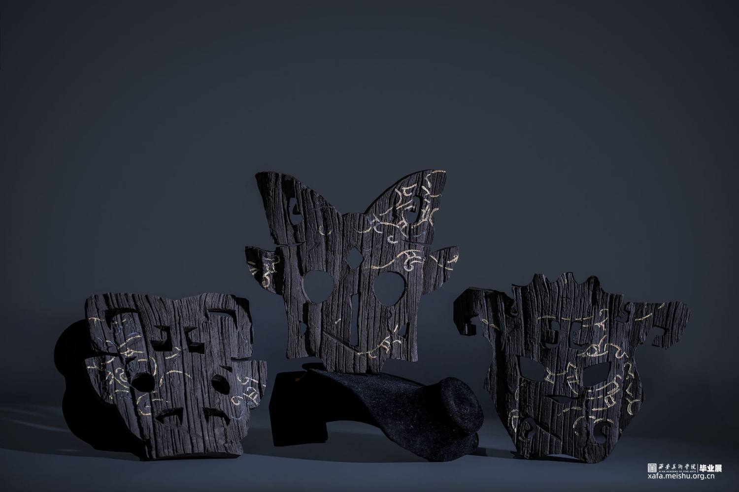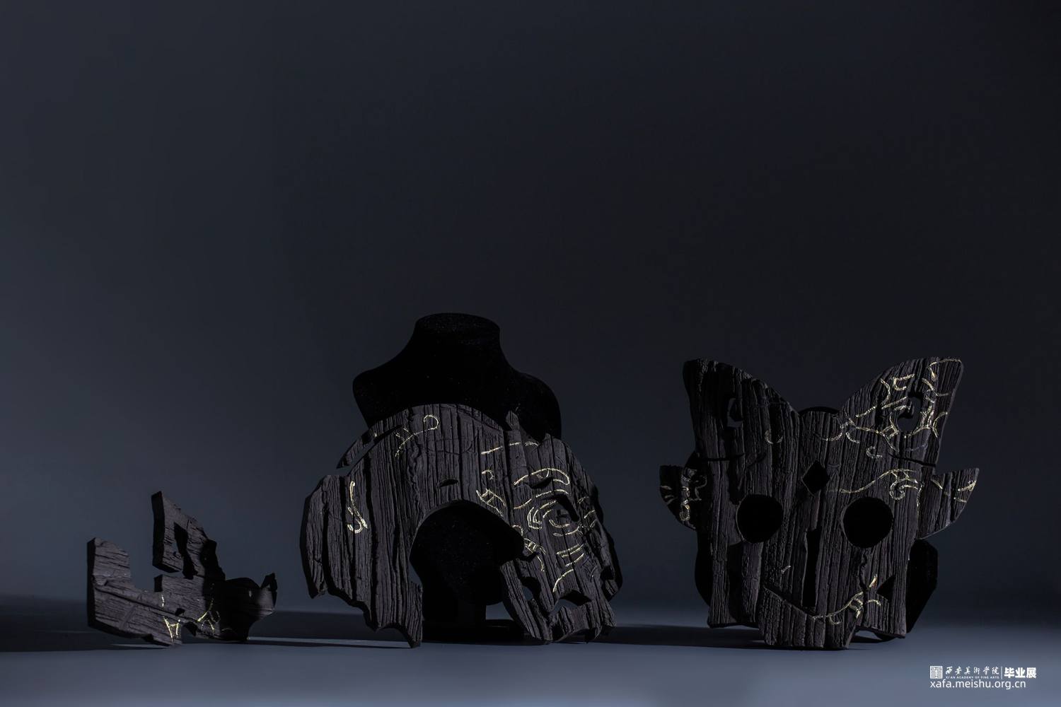 在信息爆炸的今天,时不时的得知一些“森林火灾”的讯息,被烧毁的的树木对人类和自然来说都是毁灭性的灾难。但从美学的角度来看,燃烧过的木头化为木炭后又是奇幻的、美丽的和精彩的。该作品是模拟木炭自然、极具质感的色彩和肌理美,结合陶瓷金缮工艺,借鉴传统文化中的图腾纹样,用陶瓷艺术的形式表达了一组“面具”作品。