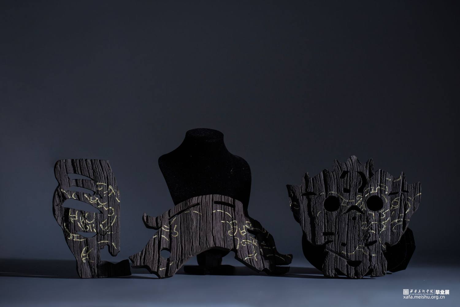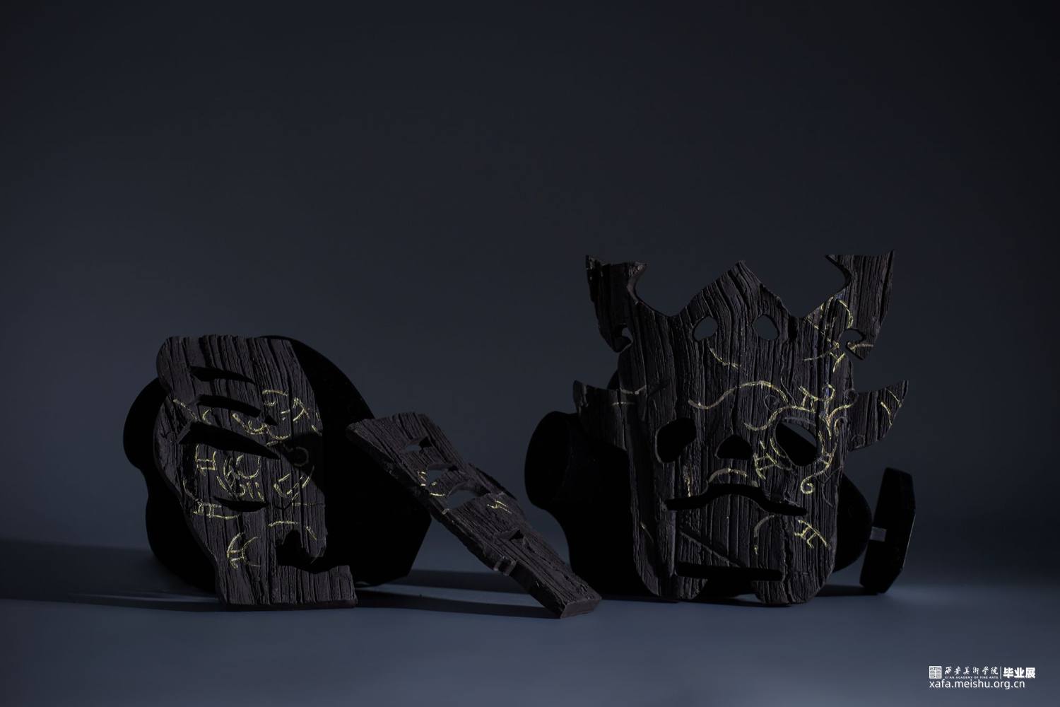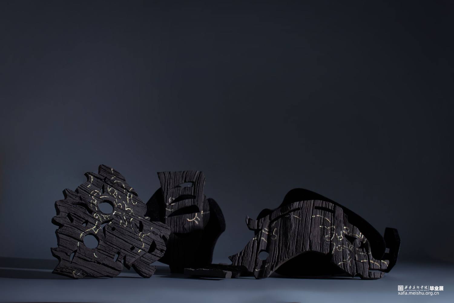 在信息爆炸的今天,时不时的得知一些“森林火灾”的讯息,被烧毁的的树木对人类和自然来说都是毁灭性的灾难。但从美学的角度来看,燃烧过的木头化为木炭后又是奇幻的、美丽的和精彩的。该作品是模拟木炭自然、极具质感的色彩和肌理美,结合陶瓷金缮工艺,借鉴传统文化中的图腾纹样,用陶瓷艺术的形式表达了一组“面具”作品。