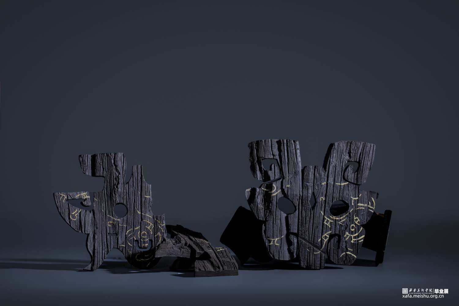 创新点:将木炭的炭黑色及肌理美进行借鉴和转化,大面积的木炭原色结合陶瓷金缮工艺,表达对优秀的青铜文化和图腾纹样的继承与创新。