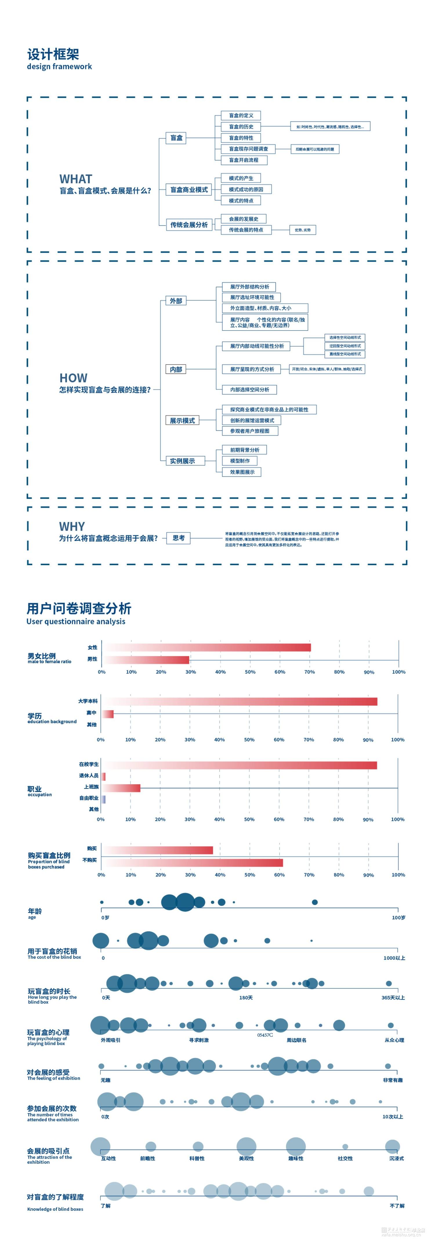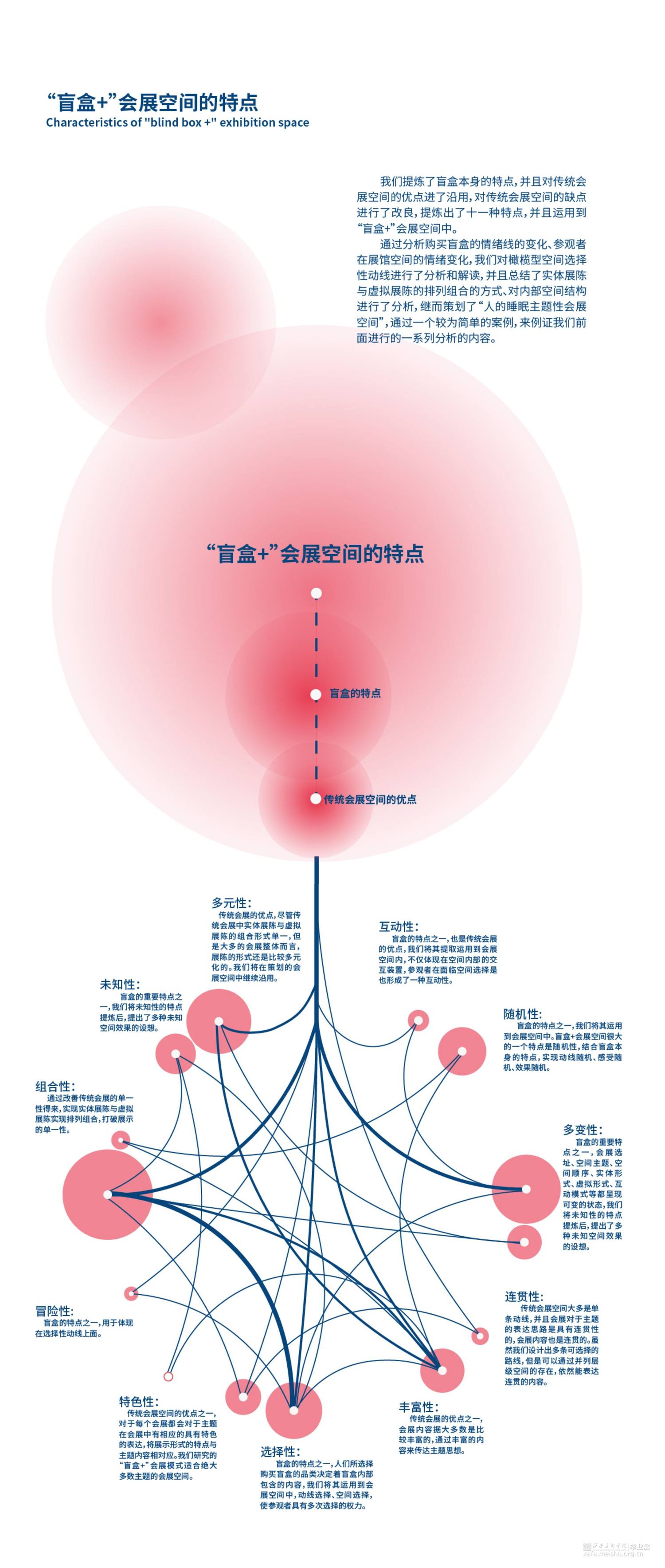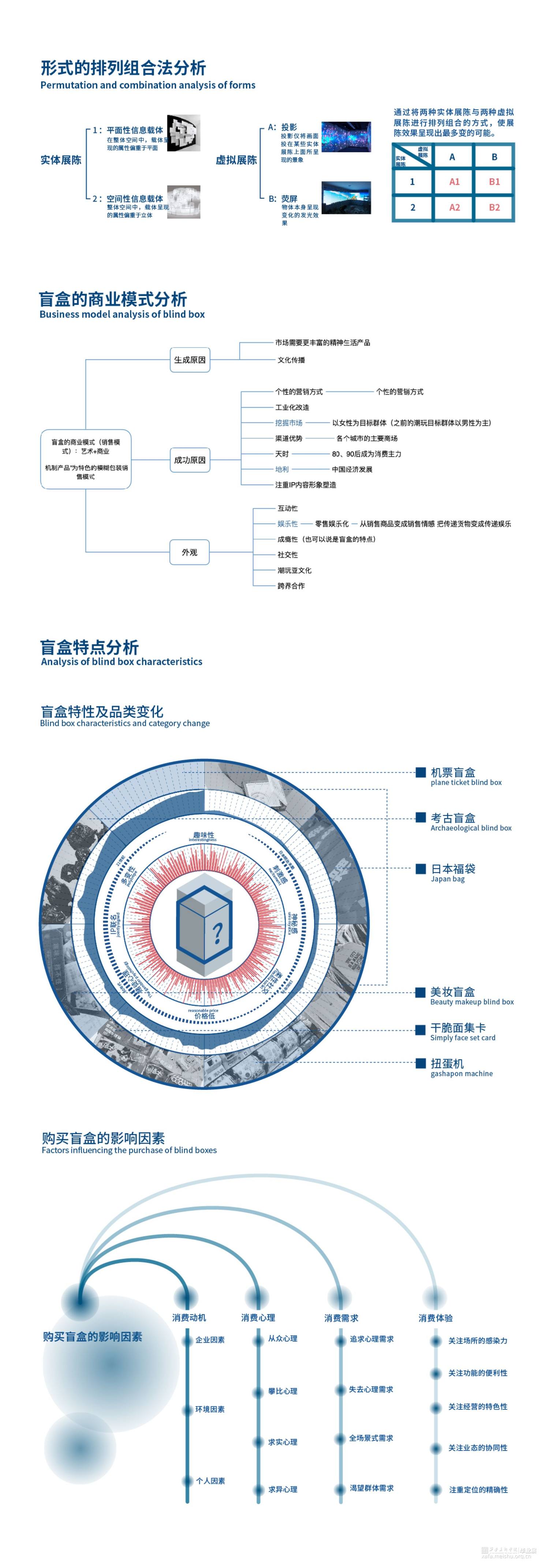 从空间概念的本质出发,将盲盒的特点及概念进行提炼,运用到会展空间中,并且对传统会展空间的优点进行延伸,抛弃传统空间组合形式,打造出一种适用于绝大多数主题会展空间的概念形式,结合排列组合的概念,使会展形式更加多样化,致力于通过同等的空间面积打造出更加多样的观展感受。