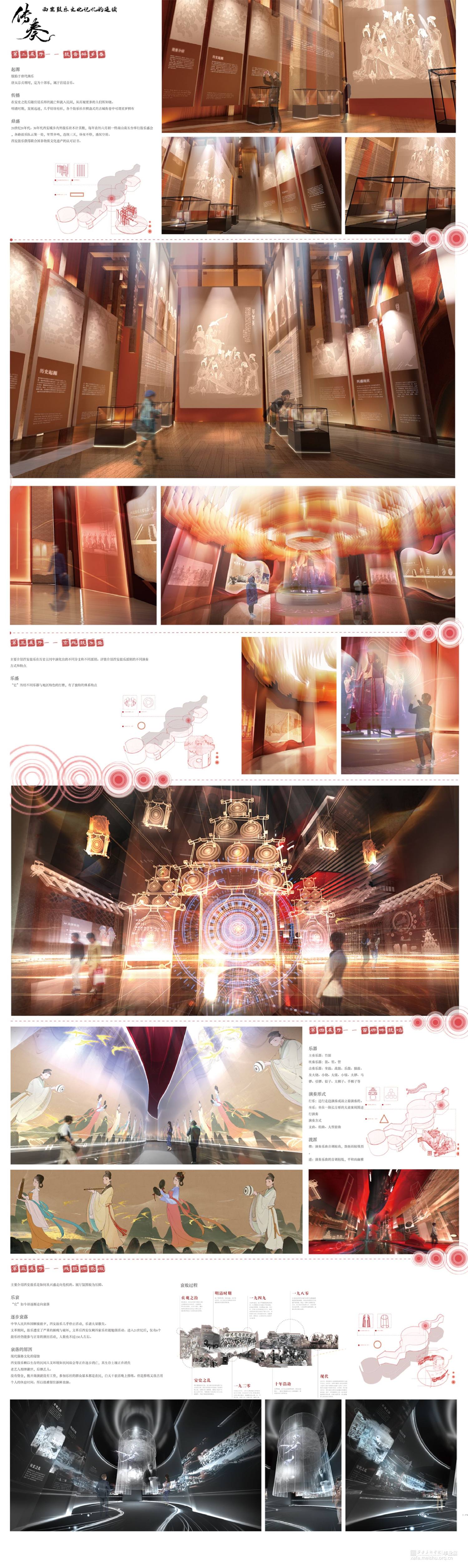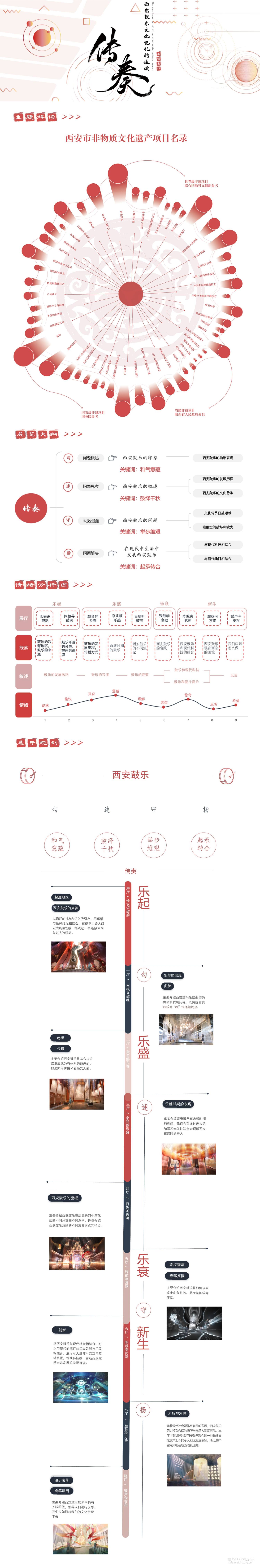 西安鼓乐的演奏方式上,结合沉浸式空间和新媒体技术,绘制和制作了了动态画卷,展现了古人行乐的演奏场景