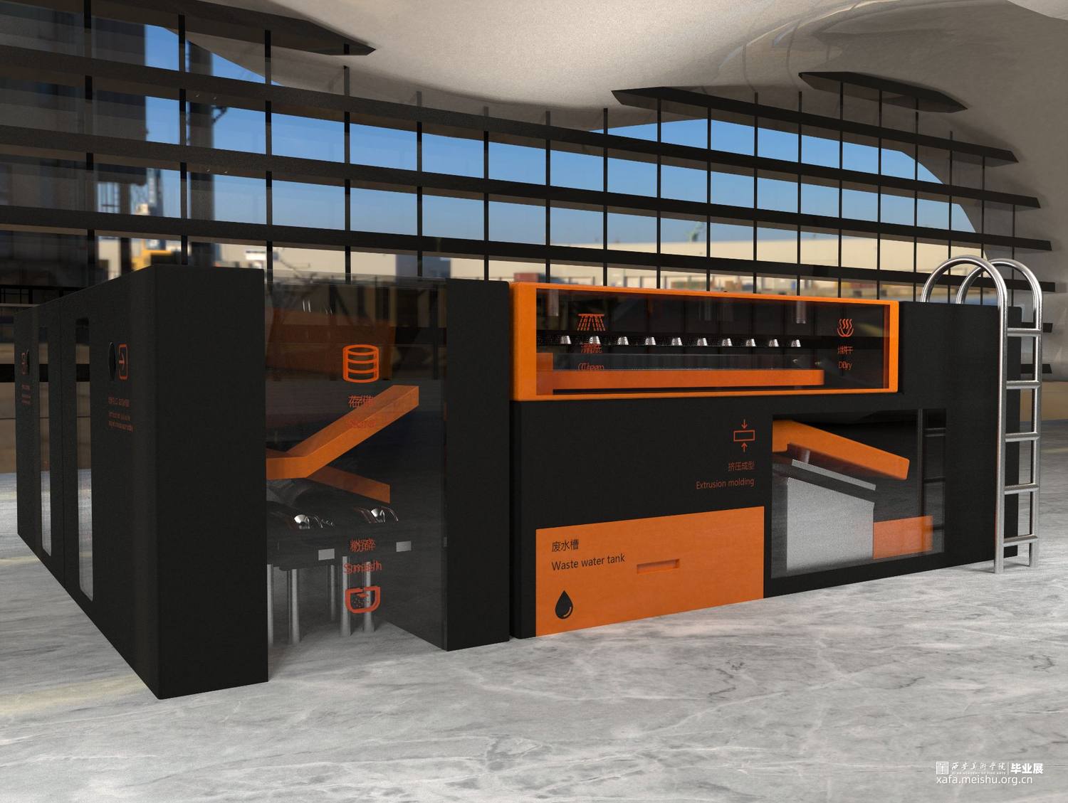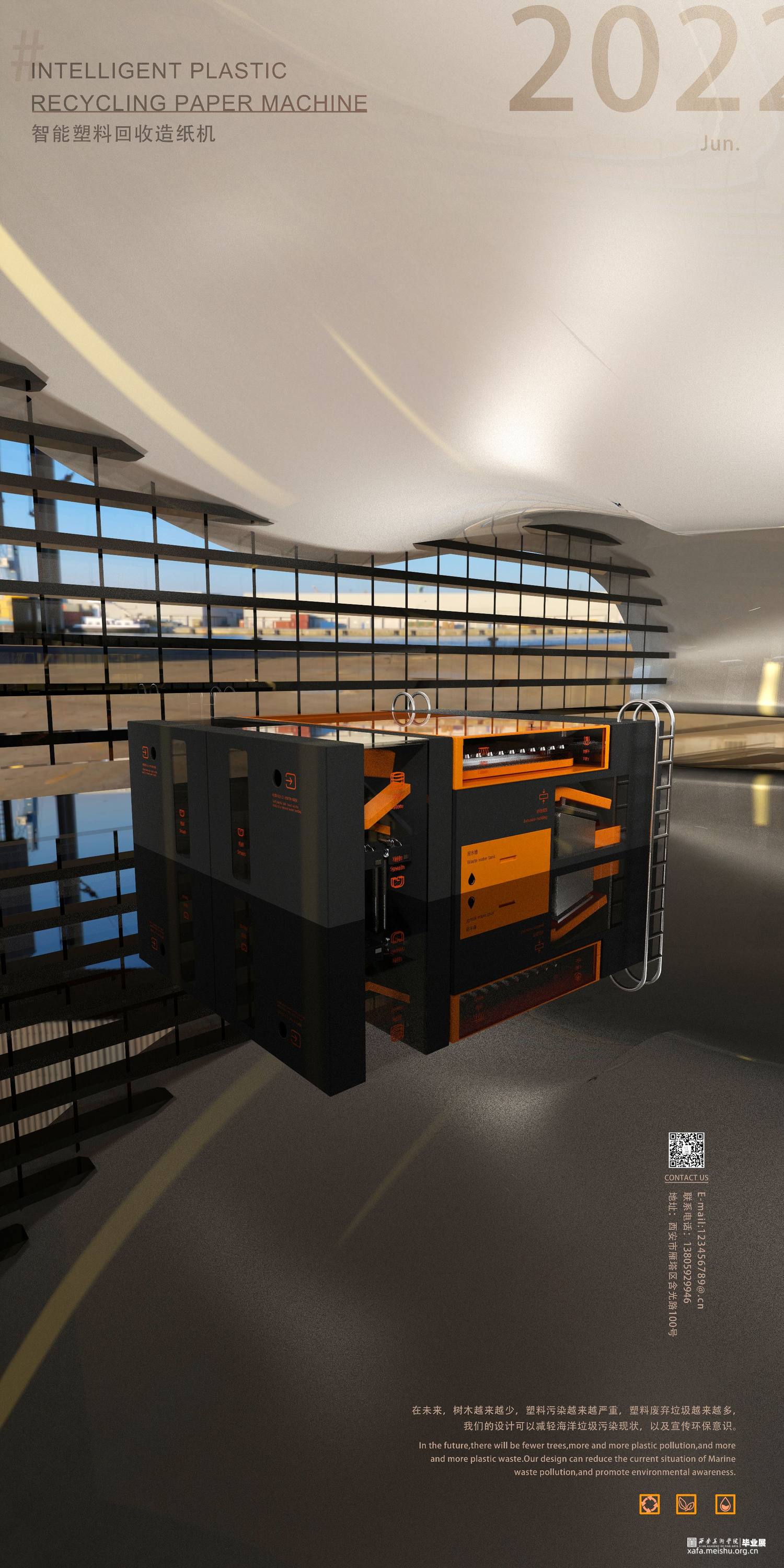 随着塑料在社会生产生活中的广泛运用,废旧塑料越来越多,而塑料本身不易自然降解,给环境带来了很大的负担。学习办公中用的纸,原材料是树木,大量使用的纸给环境带来了很大的破坏。塑料回收造纸既能回收废旧塑料,避免废旧塑料破坏环境,又能制造纸张的替代品,保护树木,一举两得。本作品作为一件体验装置旨在唤起人们保护自然环境的意识和培养自觉回收废旧塑料的习惯。同时作品本身也能起到回收废旧塑料造纸的作用。