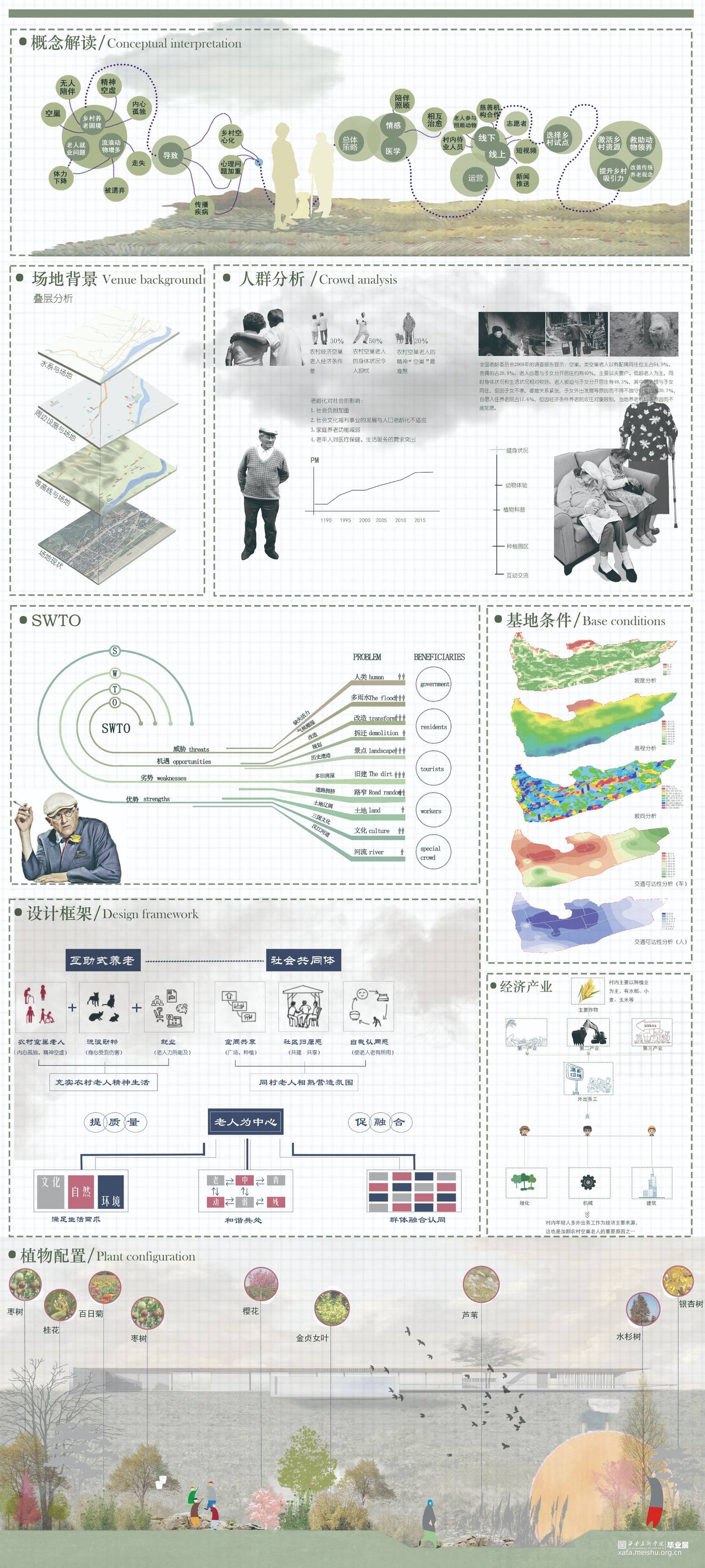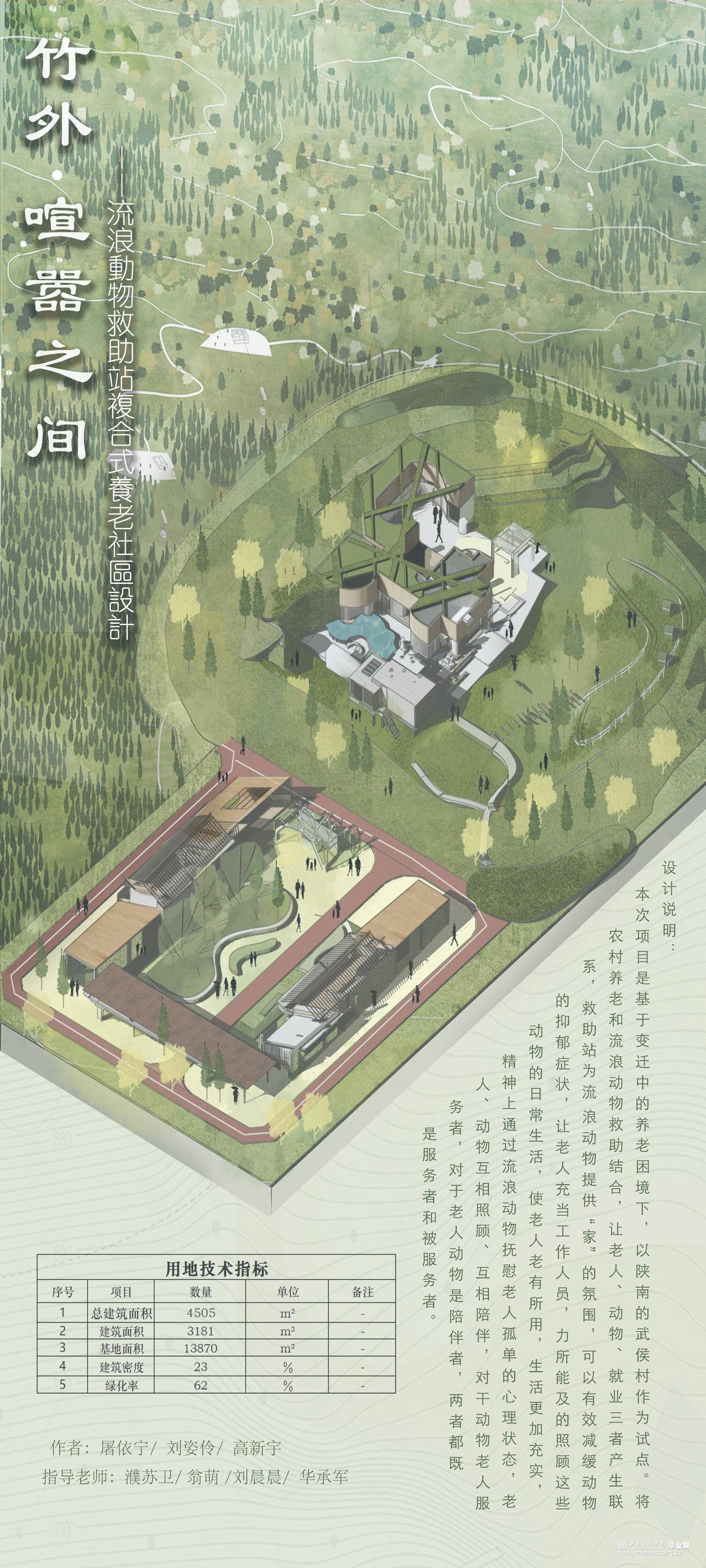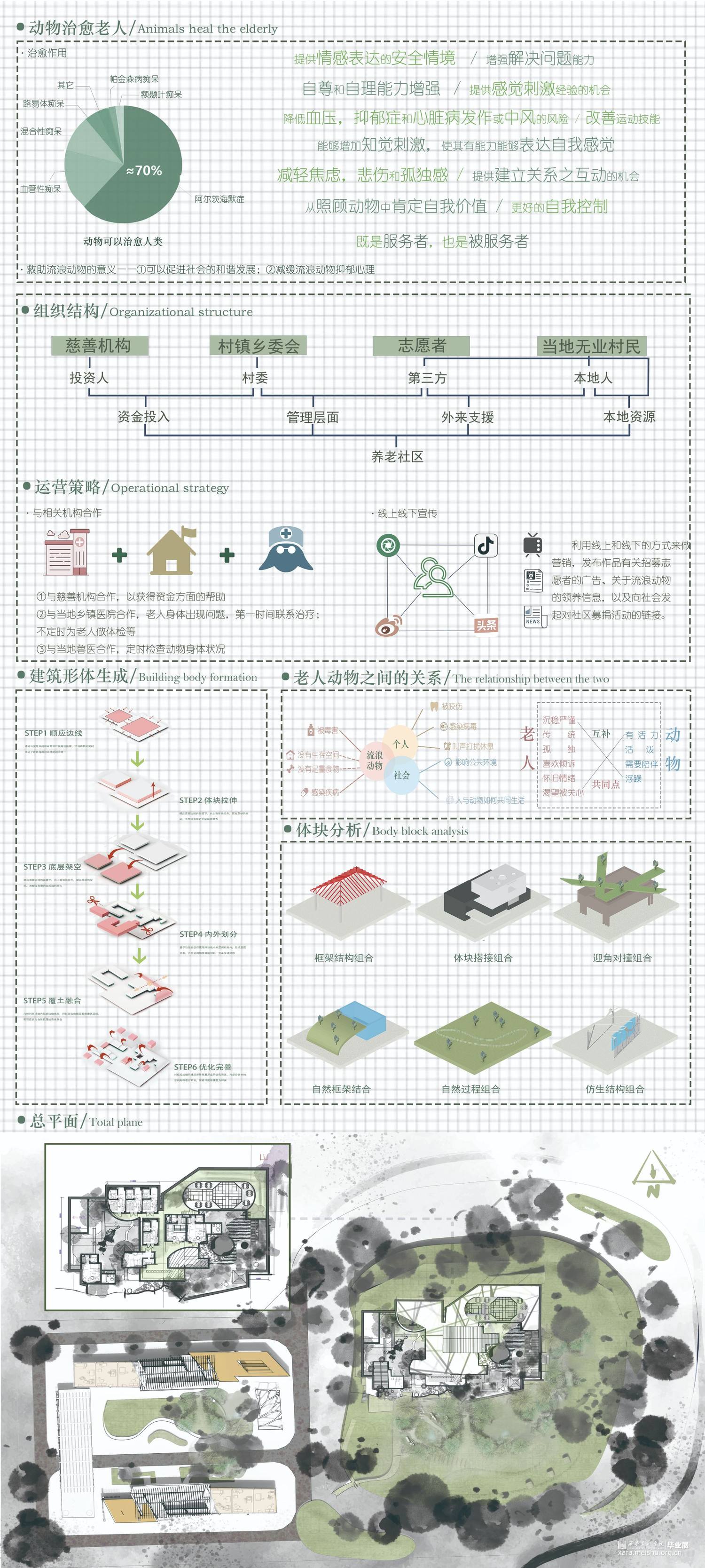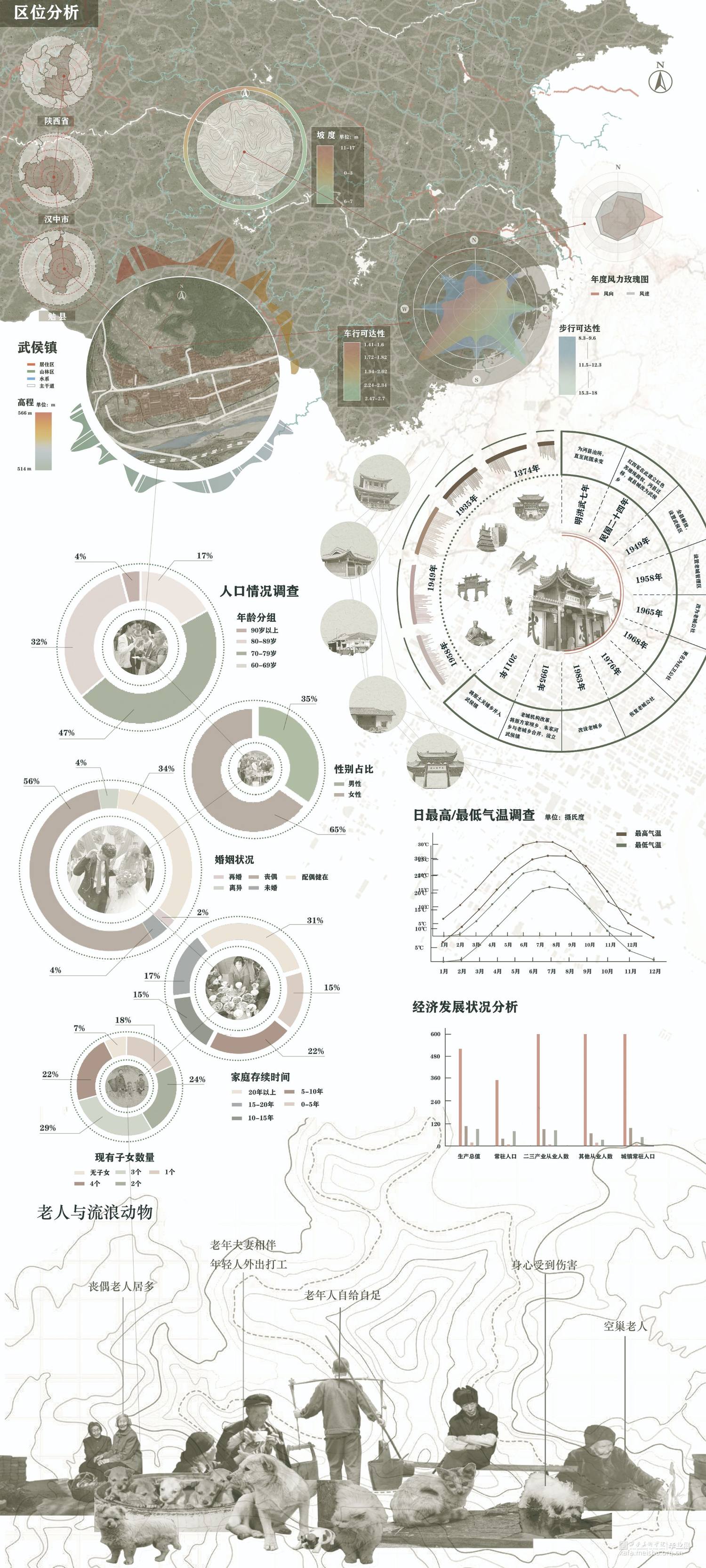 从小生活在农村里见到过不少独居老人的晚年凄惨生活,感触颇深。农村养老困境的加重以及流浪动物日益增长亦是我国目前两大社会问题。于是我们想要农村养老与动物救助结合,把老人、动物、就业三者紧密联系在一起,救助站给予无处可去流浪在大街小巷和阡陌交通的动物提供一个吃饱穿暖的“家”,通过老人力所能及的参与照顾这些动物的生理与心理的生活,使老人老有所用,老有所依,生活更加充实,精神世界也更加丰足。精神上通过流浪动物抚慰老人孤单的心理状态,经济上将养老的部分收益用来救助动物,两者互相照顾、互相陪伴,对于动物,老人是服务者,对于老人,动物是陪伴者。在考虑解决社会问题的同时,也思考如何盘活我国广大乡村的资源,这次设计是将陕南武侯村作为试点,意图在乡村里能够建设一个老人与流浪动物和谐共处、相互治愈的建筑空间。