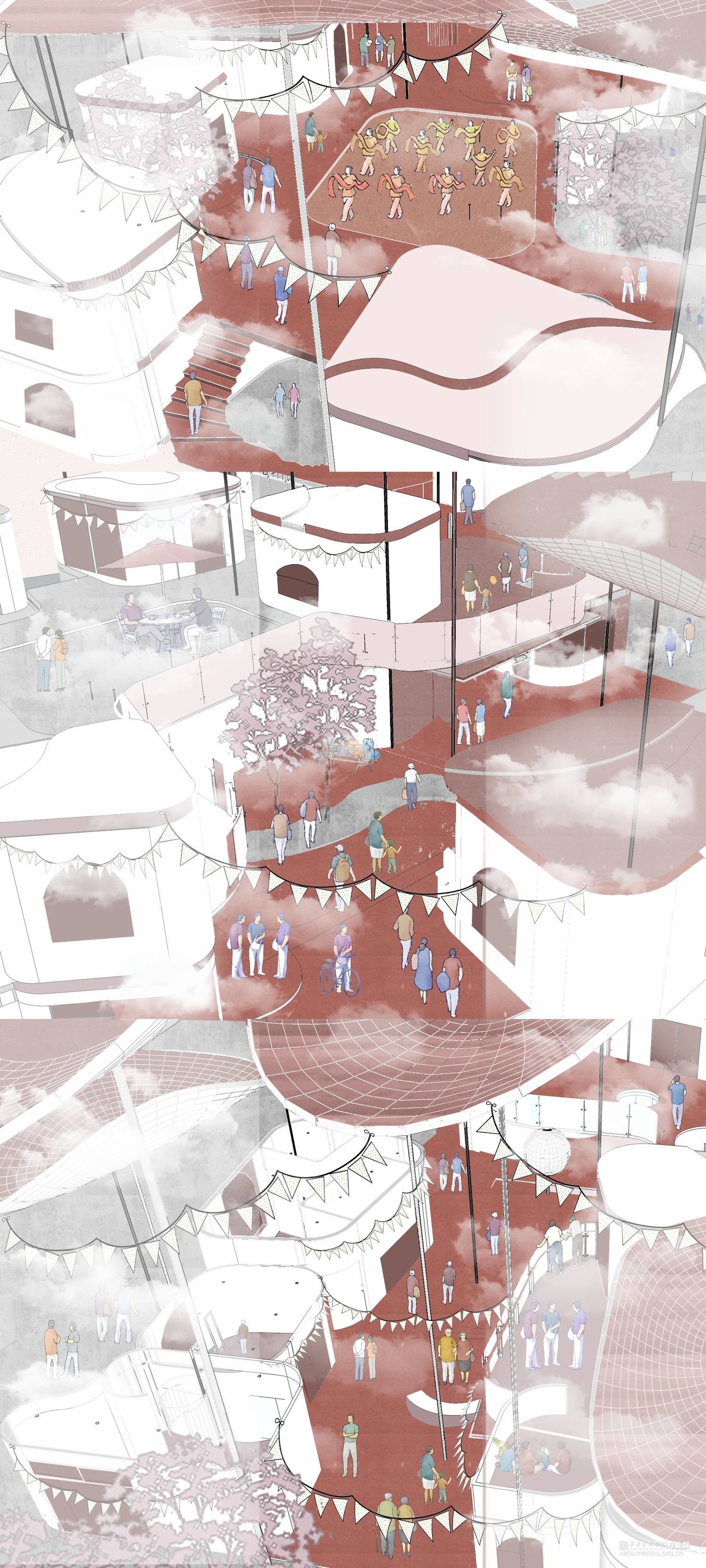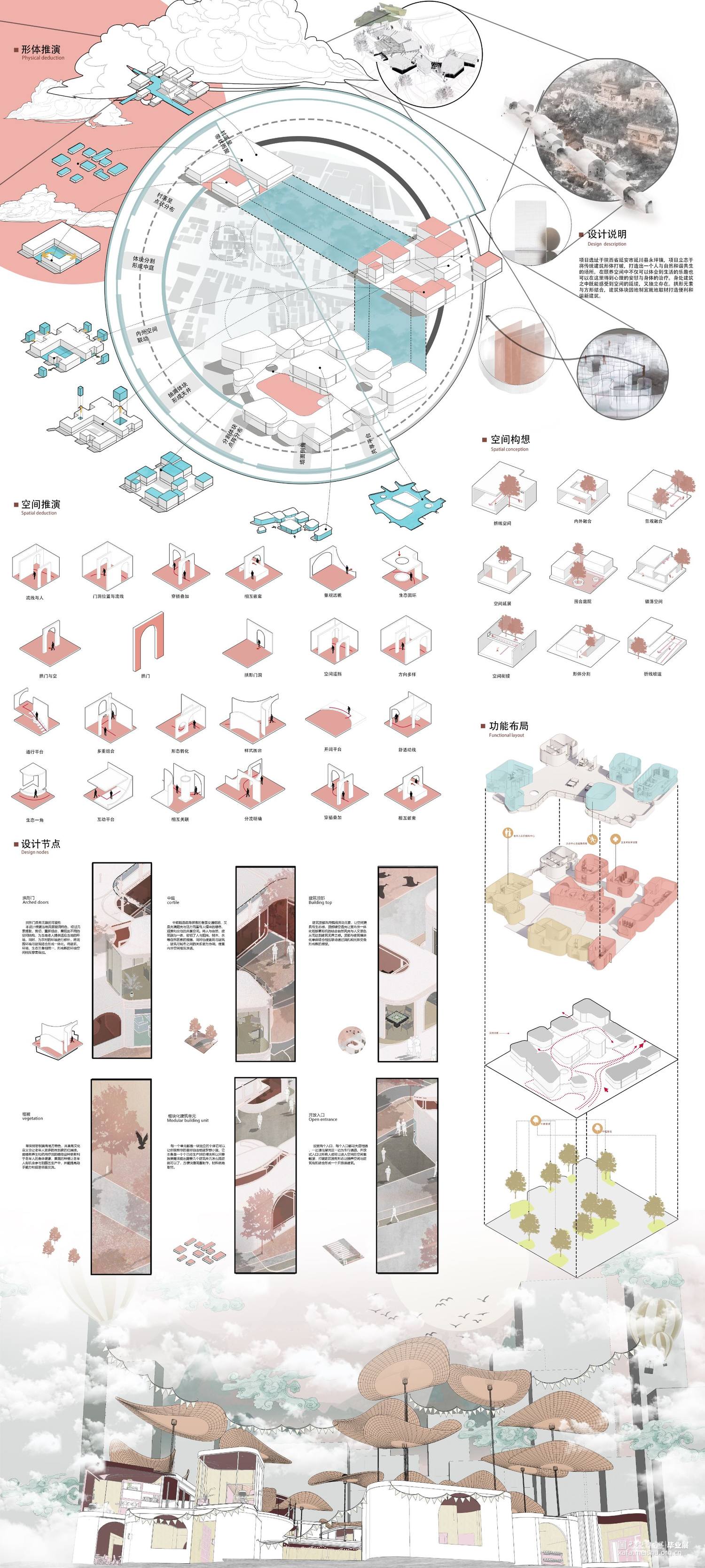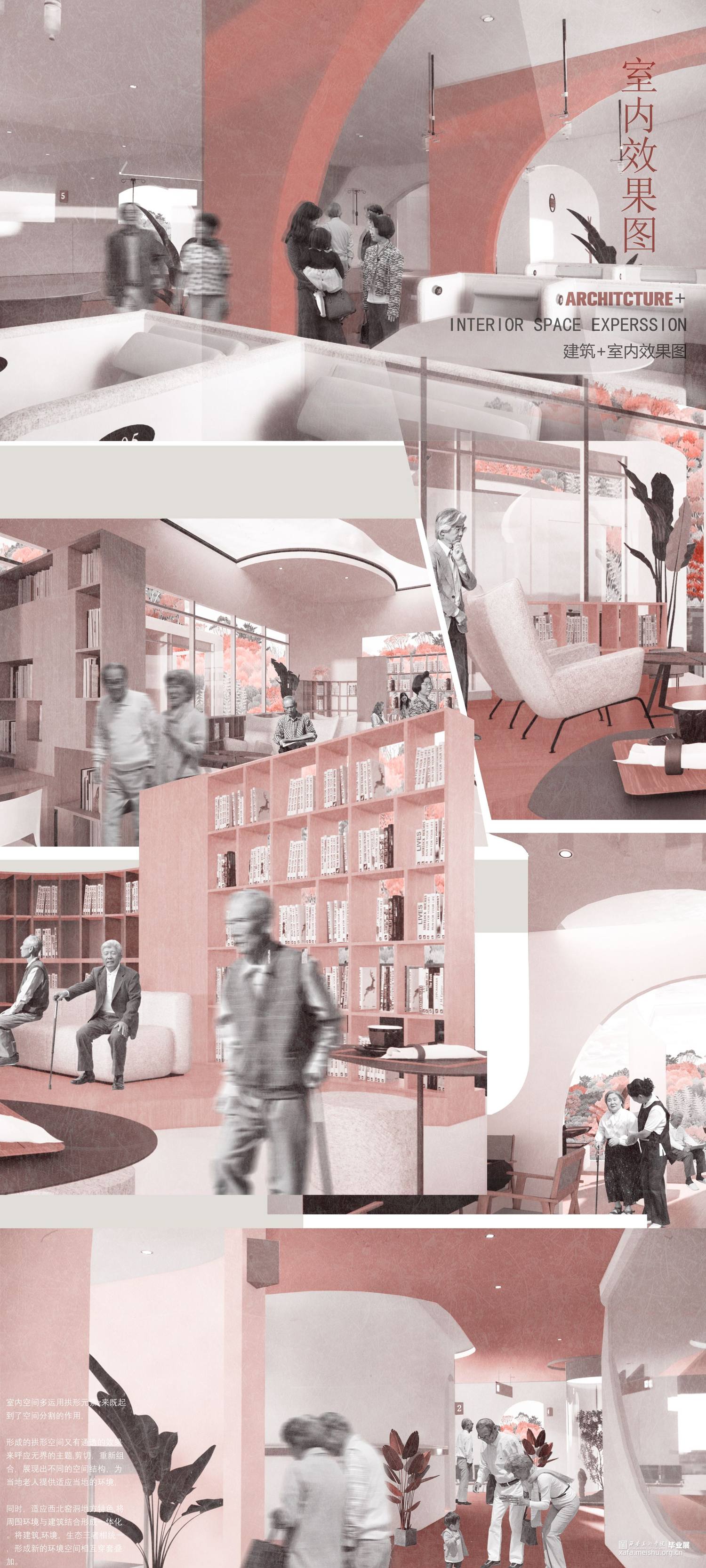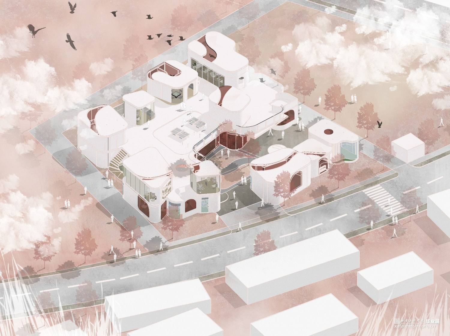 项目选址于陕西省延安市延川县永坪镇,立足乡村振兴以“无界”为主题,通过拆除时间、空间层面的边界,使空间试图赋予更多的乡村老人以接触便利。结合农村老年人生活环境及行为特征,创造出符合老人心理需求的人性化生活环境,为老人提供有归属感的空间。建筑主体将空间点状分布,拱形元素与方形结合,建筑体块因地制宜就地取材打造便利和谐新建筑。形成的拱形空间又有通透的效果来呼应无界的主题,剪切,重新组合,展现出不同的空间结构,为当地老人提供适应当地的环境,同时,适应西北窑洞地方特色,将周围环境与建筑结合形成一体化。将建筑,环境,生态三者相统一,形成新的环境空间相互穿套叠加。