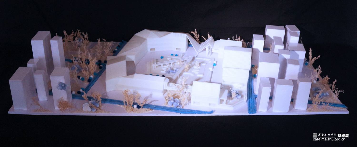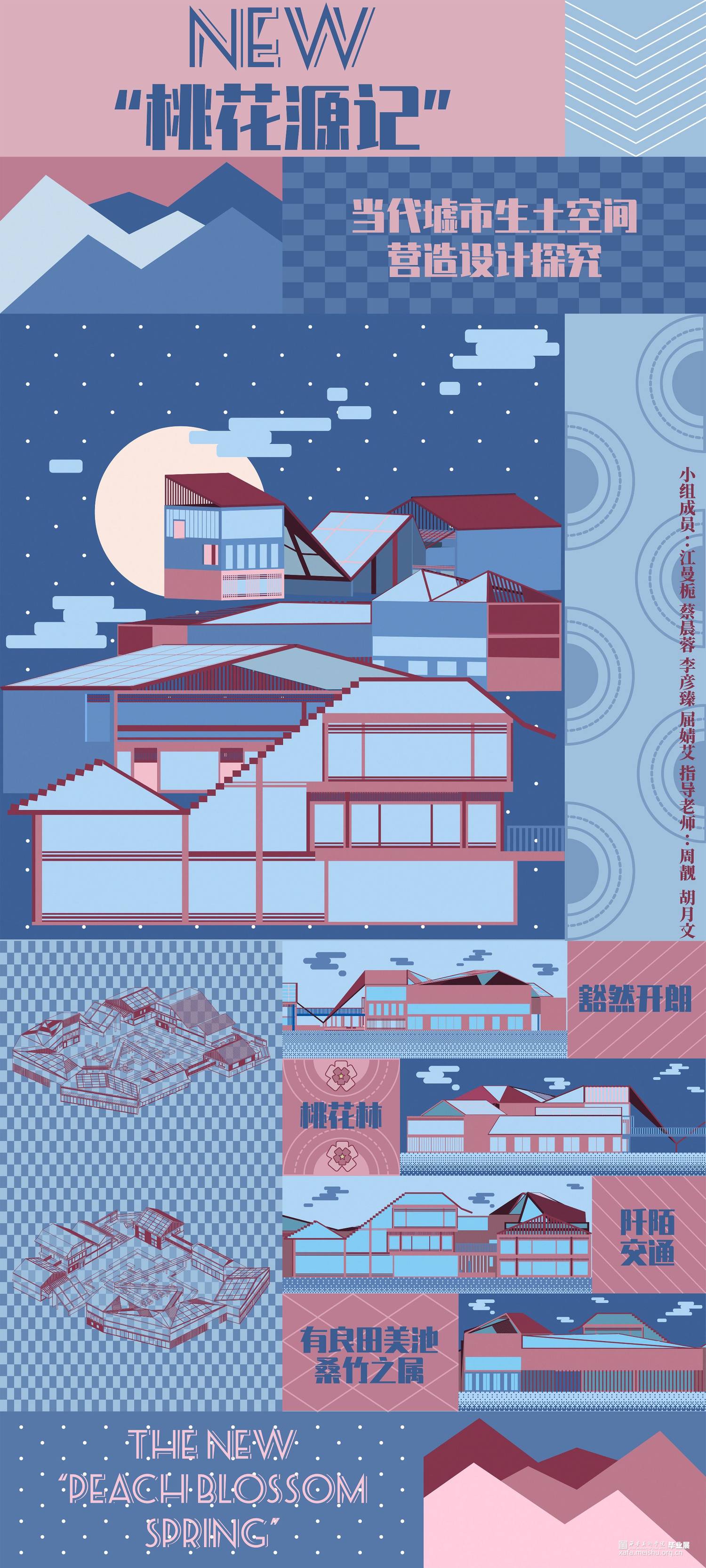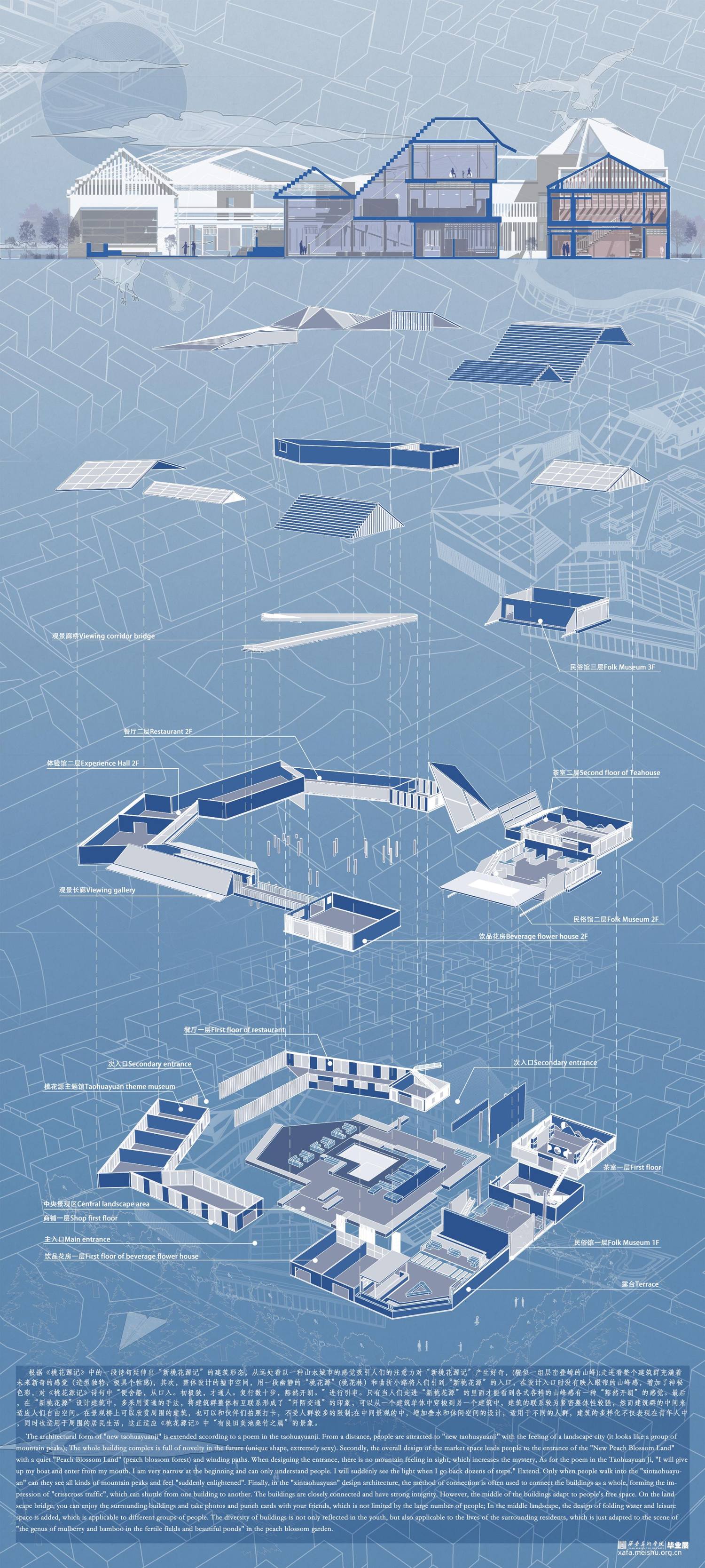 本设计源于《桃花源记》中的一段诗句,从而衍生出“新桃花源记”的建筑形态。首先,远观以一种山水城市的视觉感吸引人们对“新桃花源记”产生参与兴趣,整体设计貌似一组层峦叠嶂的山峰,近看整个建筑群充满着对未来的憧憬;其次,整体设计以墟市空间为设计主题,用幽静的“桃花林”和曲折小路将人们引至“新桃花源”入口,入口时映入眼帘的山峰增加了神秘色彩,对《桃花源记》诗句中“便舍船,从口入。初极狭,才通人。复行数十步,豁然开朗。”进行空间阐释。只有当人们走进“新桃花源”中才能看到层峦叠嶂的山峰,从而带来“豁然开朗”的视觉感受。最后,在“新桃花源”设计中多采用贯通的手法,建筑群整体相互联系形成了“阡陌交通”,可从一个建筑单体中穿梭到另一个建筑,建筑联系紧密且整体性较强,通过建筑群来适应人们自由空间。漫步景观桥可以欣赏周边建筑或和伙伴们拍照打卡,不受人群较多的限制,在中间围合景观中增加叠水和休闲空间的设计,适用于不同的人群。建筑的多样化不仅取悦青年人,同时也适用于周边居民,这正是通过设计最好的呼应了陶渊明《桃花原记》中“有良田美池桑竹之属”描绘的空间景象。