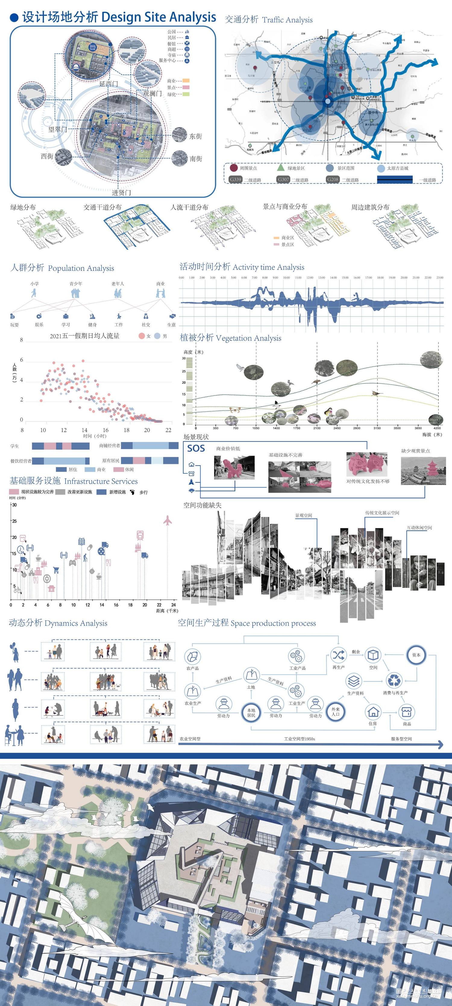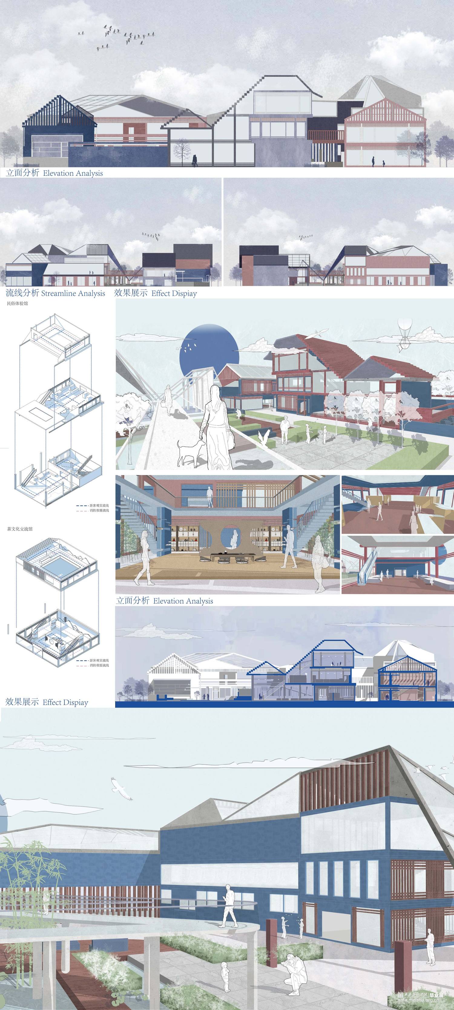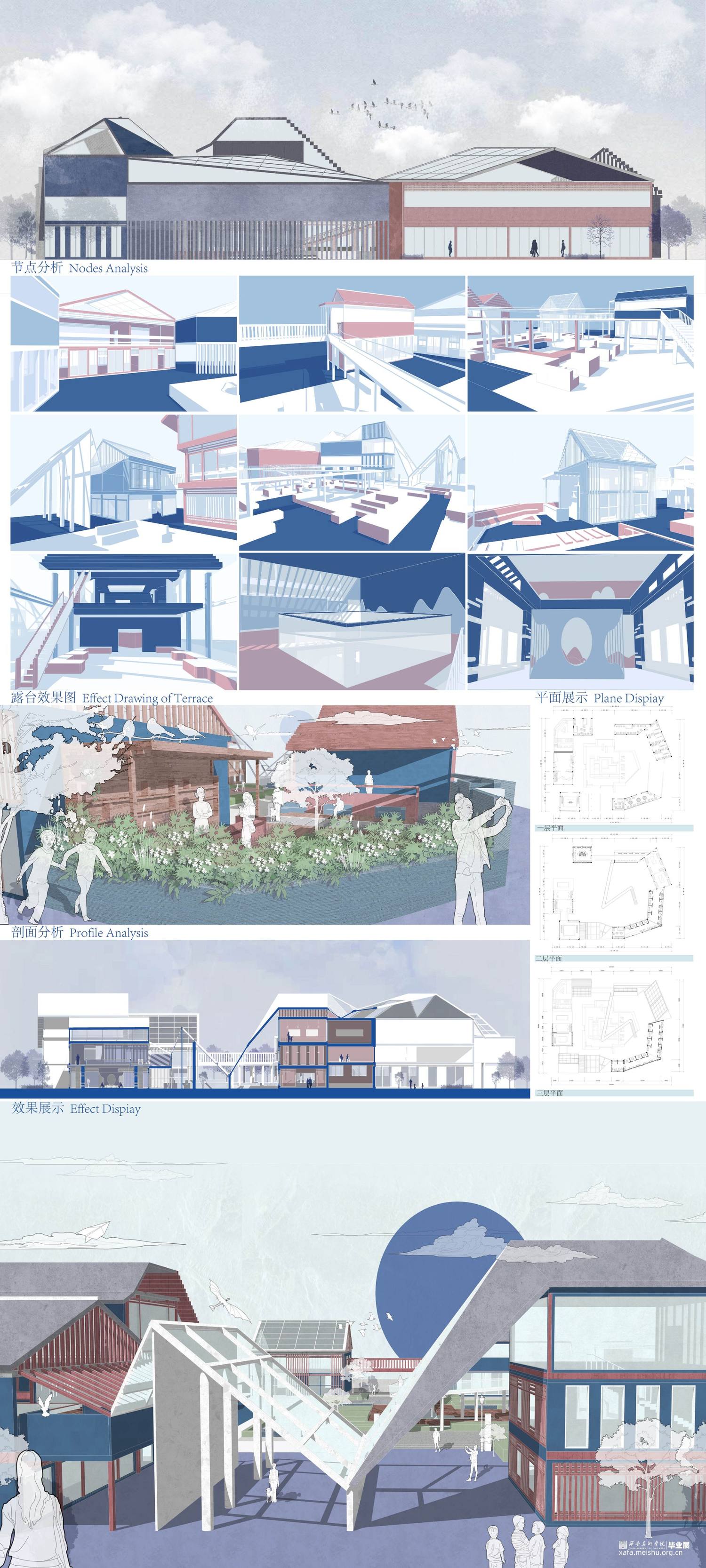 本设计源于《桃花源记》中的一段诗句,从而衍生出“新桃花源记”的建筑形态。首先,远观以一种山水城市的视觉感吸引人们对“新桃花源记”产生参与兴趣,整体设计貌似一组层峦叠嶂的山峰,近看整个建筑群充满着对未来的憧憬;其次,整体设计以墟市空间为设计主题,用幽静的“桃花林”和曲折小路将人们引至“新桃花源”入口,入口时映入眼帘的山峰增加了神秘色彩,对《桃花源记》诗句中“便舍船,从口入。初极狭,才通人。复行数十步,豁然开朗。”进行空间阐释。只有当人们走进“新桃花源”中才能看到层峦叠嶂的山峰,从而带来“豁然开朗”的视觉感受。最后,在“新桃花源”设计中多采用贯通的手法,建筑群整体相互联系形成了“阡陌交通”,可从一个建筑单体中穿梭到另一个建筑,建筑联系紧密且整体性较强,通过建筑群来适应人们自由空间。漫步景观桥可以欣赏周边建筑或和伙伴们拍照打卡,不受人群较多的限制,在中间围合景观中增加叠水和休闲空间的设计,适用于不同的人群。建筑的多样化不仅取悦青年人,同时也适用于周边居民,这正是通过设计最好的呼应了陶渊明《桃花原记》中“有良田美池桑竹之属”描绘的空间景象。