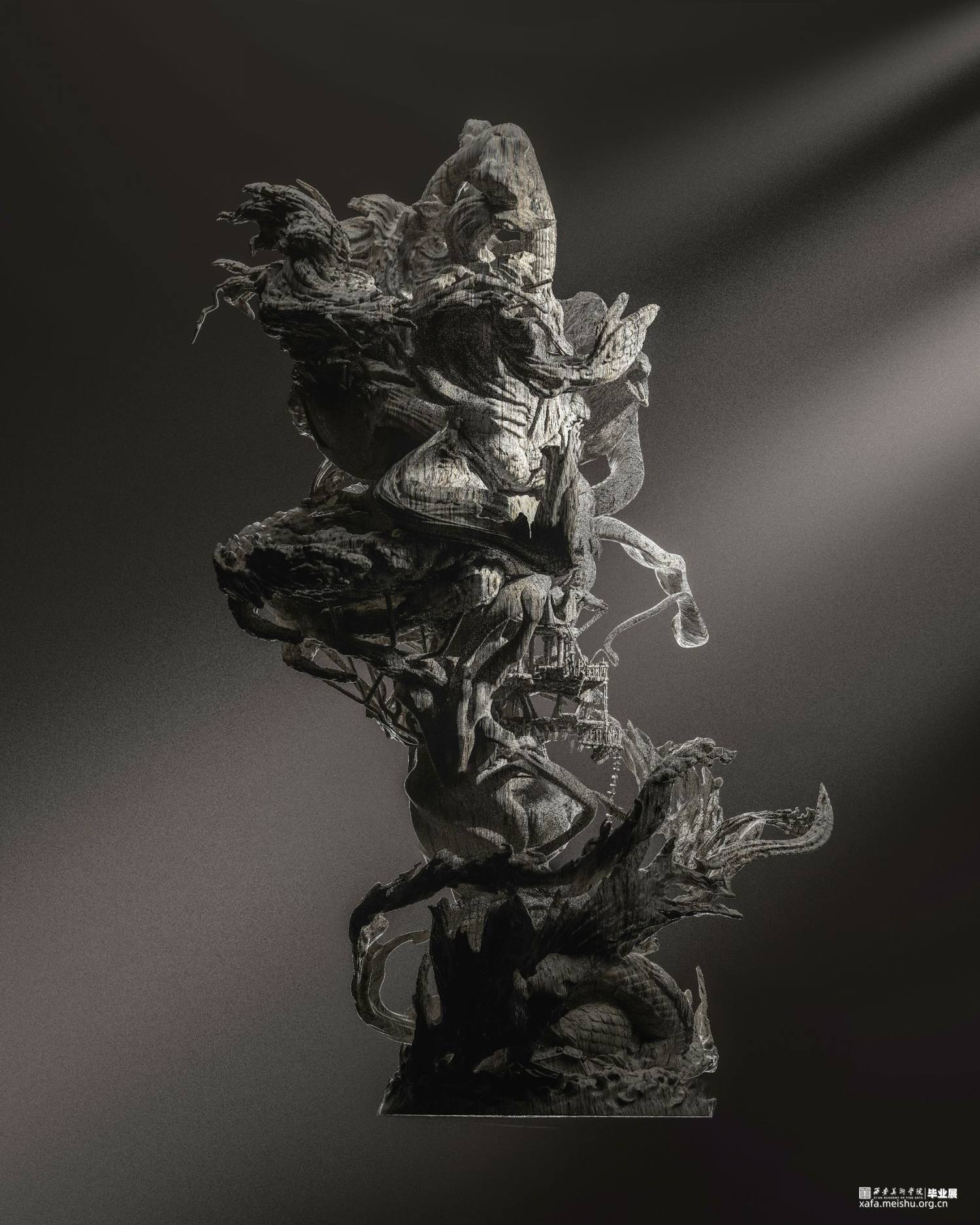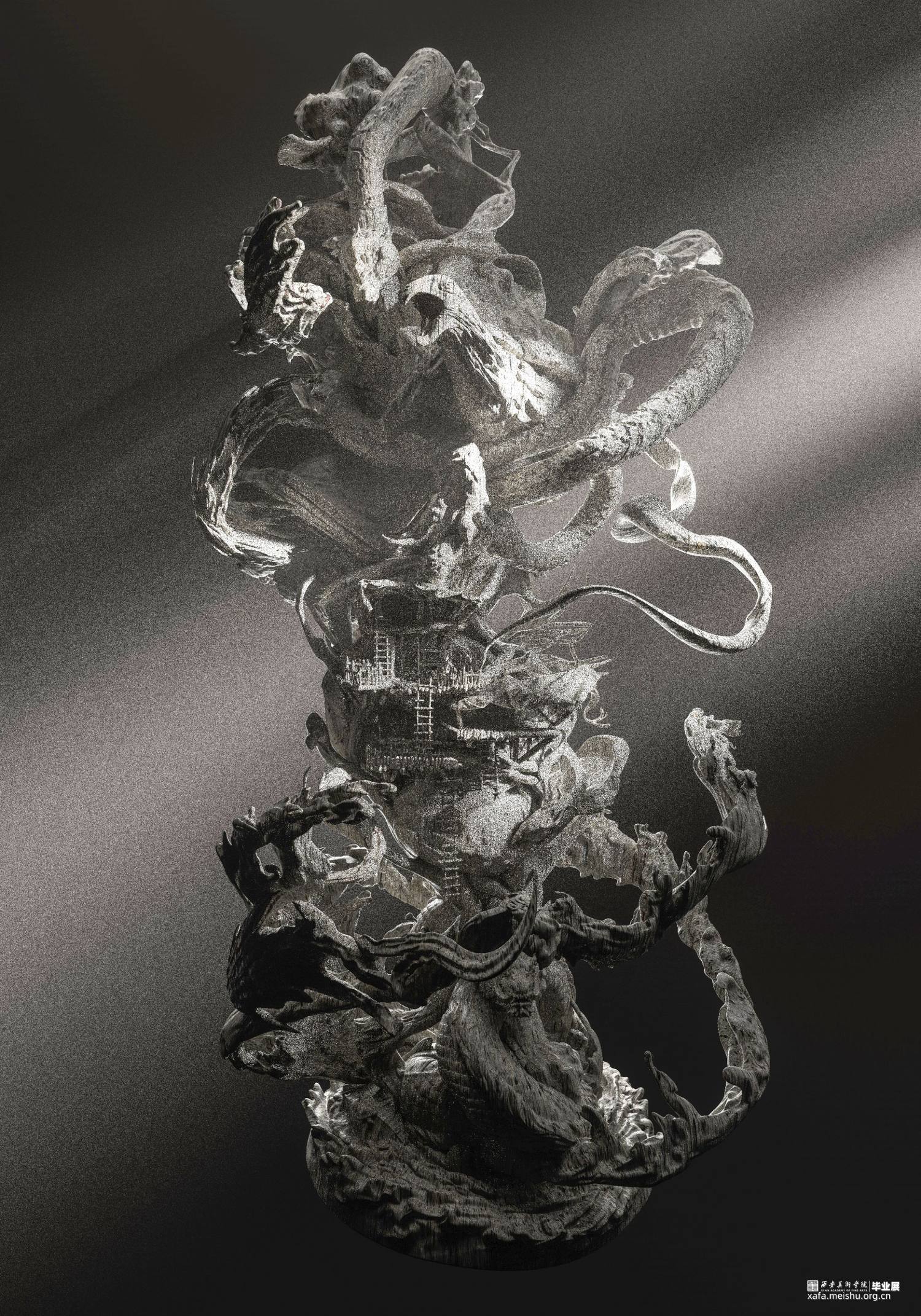 以玄武为主体,归墟处为背景的三维数字模型创作,玄武亦称玄冥,龟蛇合体,为水神,居北海,角长寿,玄冥成了长生不老的象征,冥间亦在北方,故为北方之神。