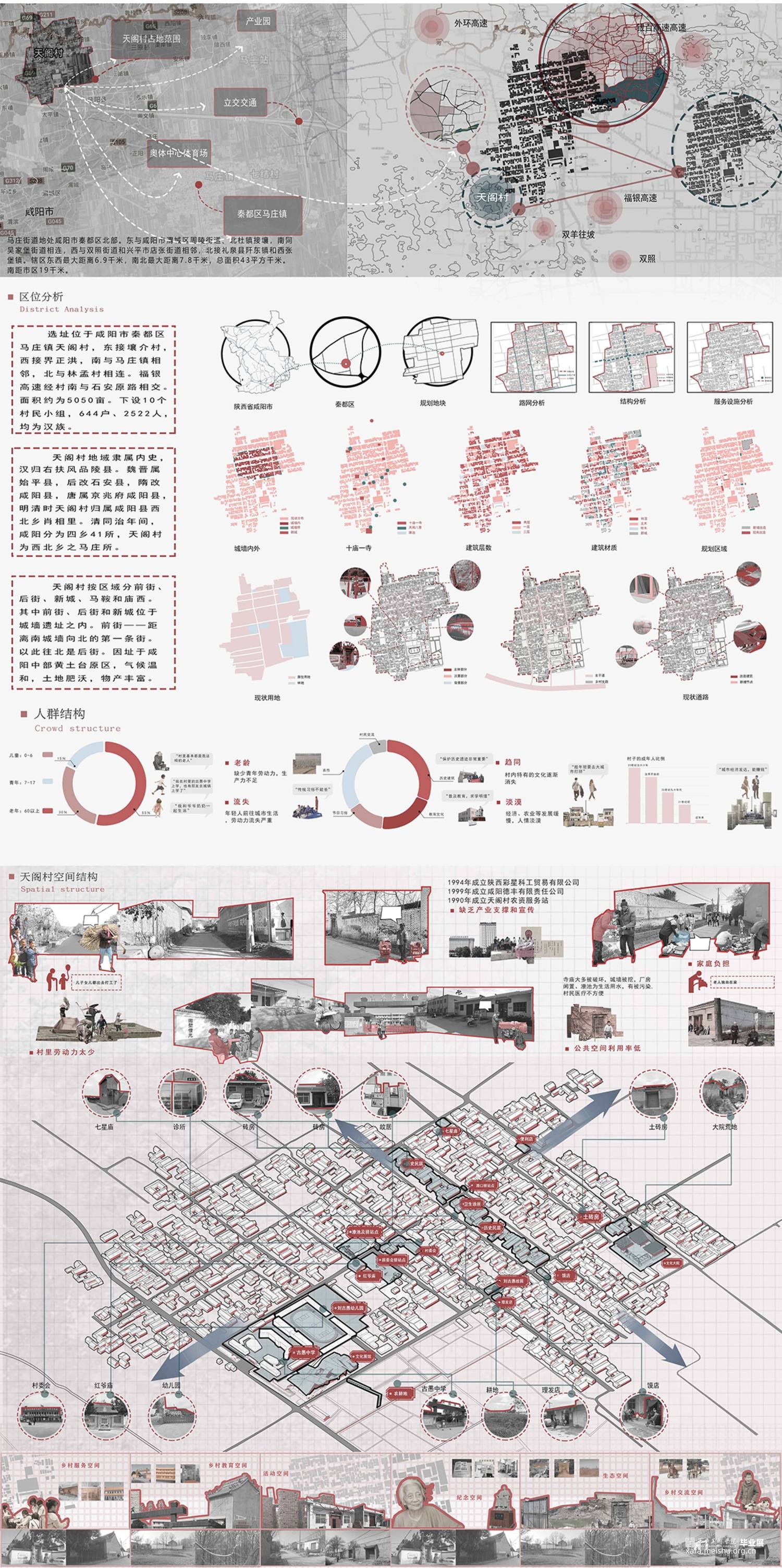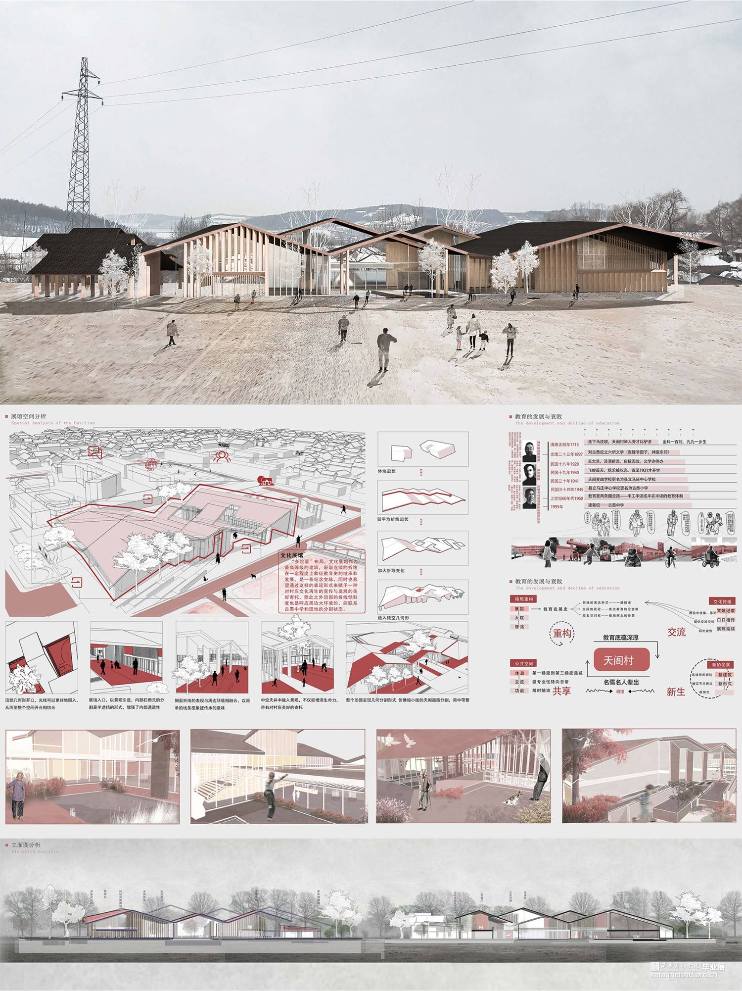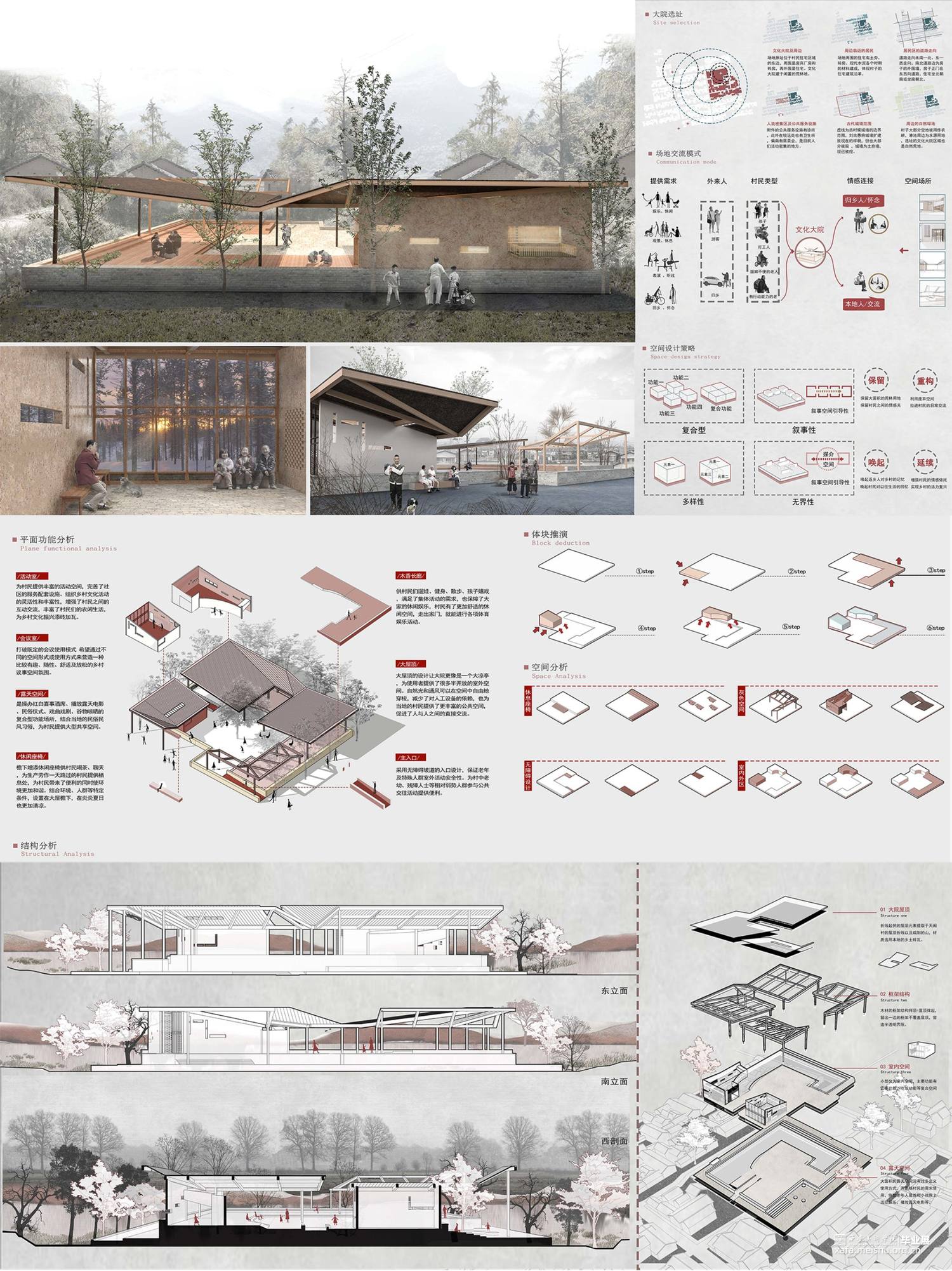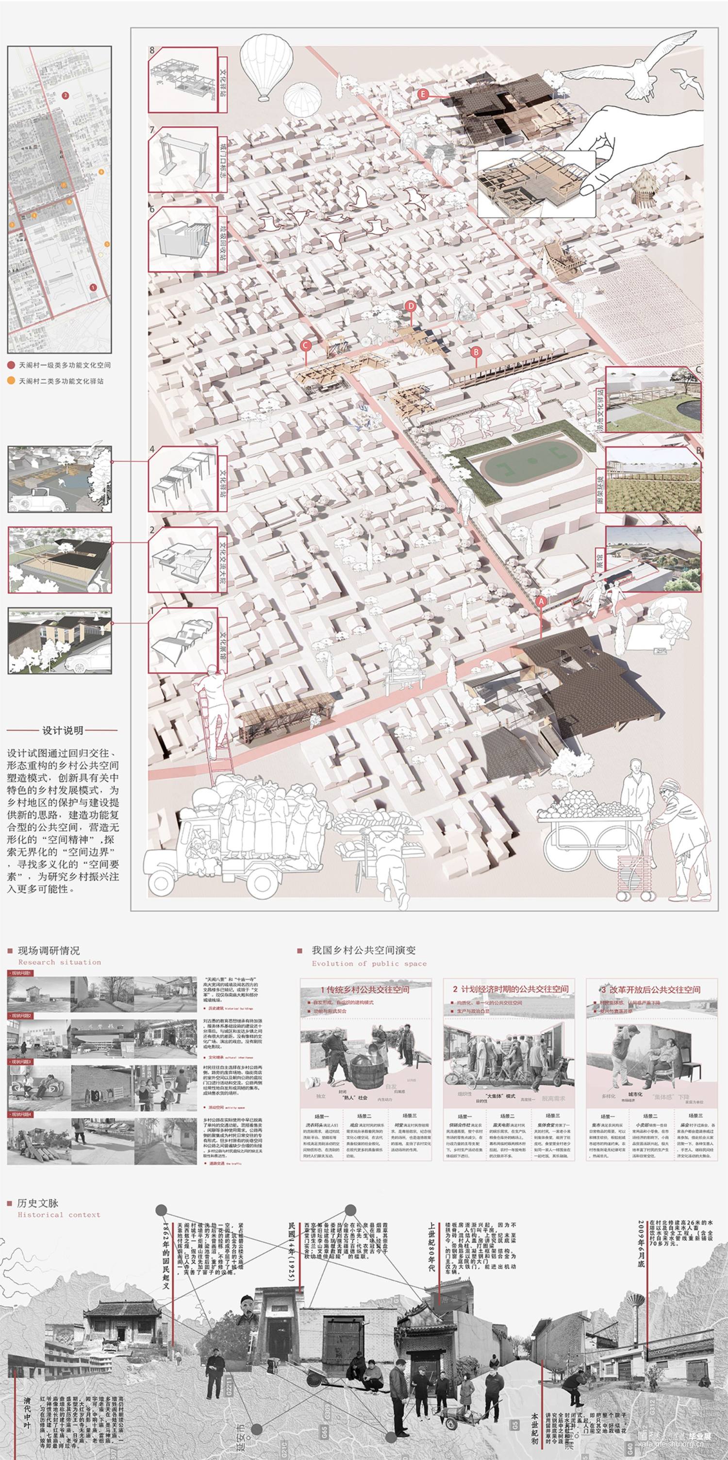 根据《天阁村志·大事记/建筑篇/沿革篇…》梳理空间格局和建筑的历史变迁,在空间关系重构方法将天阁村的节点、道路、聚集地按“点、线、面”三个层次进行梳理,并将其组合形成新的空间关系。利用线(主道路和支路)的贯穿,通过对历史线的梳理,把对以前的记忆和故事串联起来,用主要(建筑、景观、雕塑)表示关键性事件或者是故事 。在重新设计空间关系基础上,找出了天阁村主轴线,寻找两个个突出性节点,进行实际的公共空间设计,展馆和大院具备展览,文化交流以及人们休闲,休息,聊天,开展活动,等复合型功能,并且尽可能融合地貌,模糊室内外的界限,达到无界效果。空间形态重构上将天阁村的空间形态和构筑物、水景、绿地等组织关系进行重新构思,探求了新的组合可能性,产生多个空间之间的无界效果。