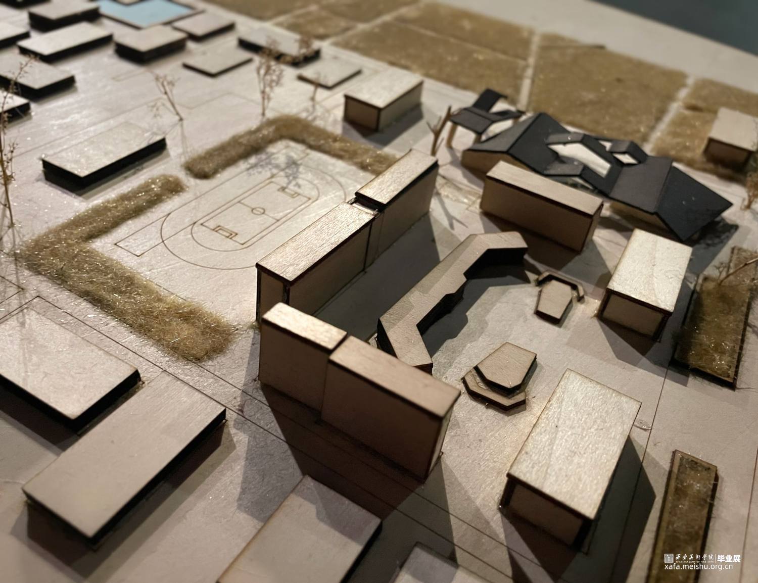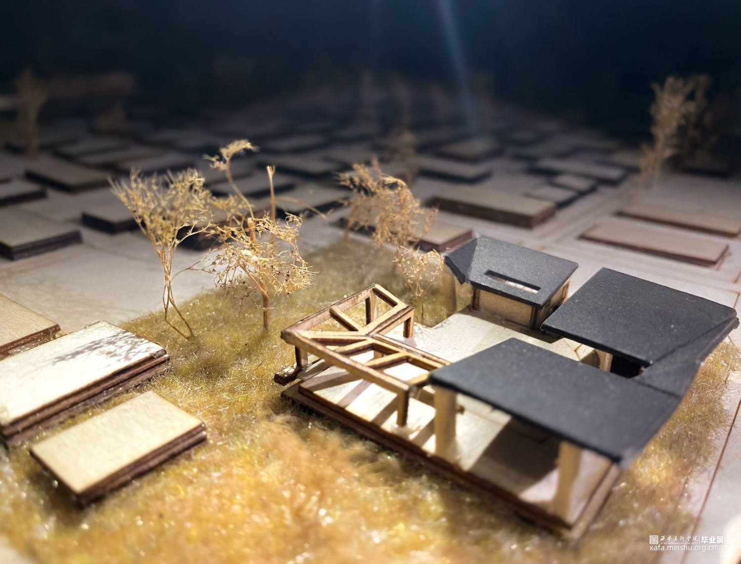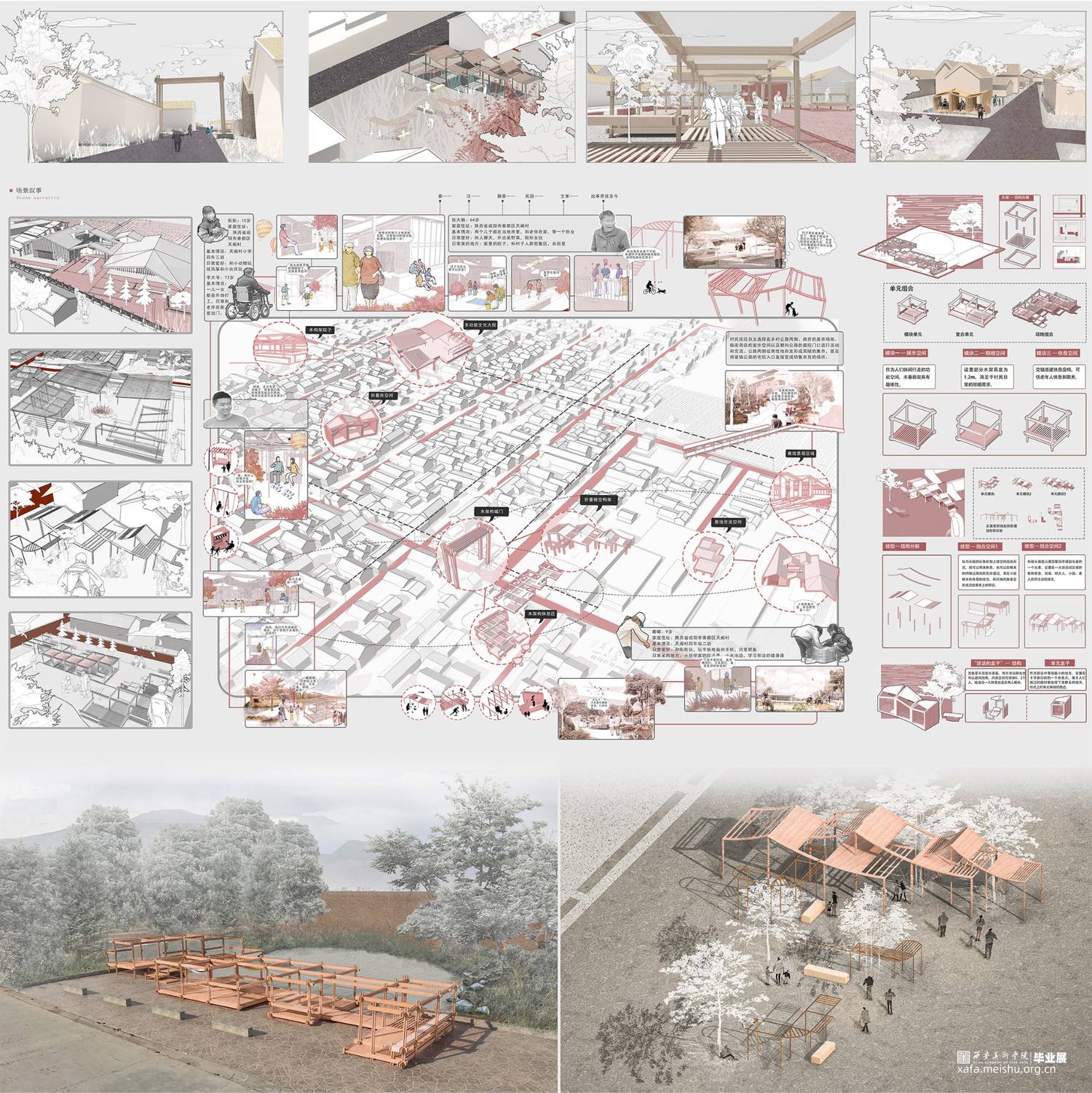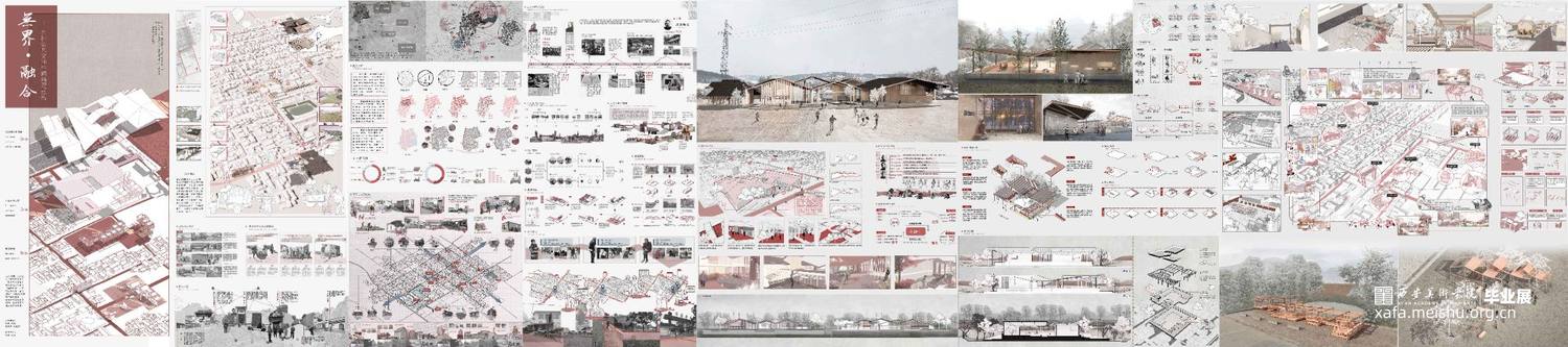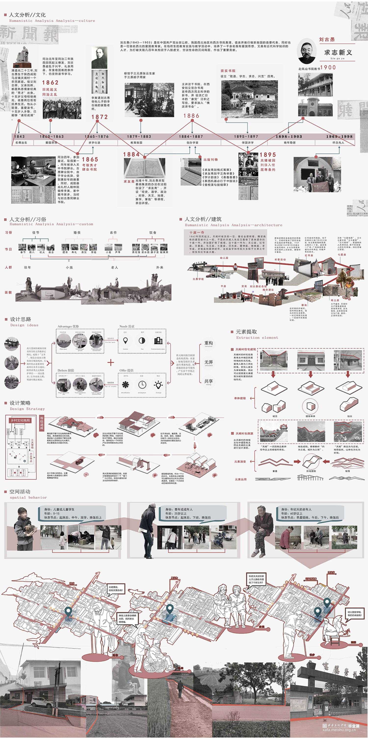 根据《天阁村志·大事记/建筑篇/沿革篇…》梳理空间格局和建筑的历史变迁,在空间关系重构方法将天阁村的节点、道路、聚集地按“点、线、面”三个层次进行梳理,并将其组合形成新的空间关系。利用线(主道路和支路)的贯穿,通过对历史线的梳理,把对以前的记忆和故事串联起来,用主要(建筑、景观、雕塑)表示关键性事件或者是故事 。在重新设计空间关系基础上,找出了天阁村主轴线,寻找两个个突出性节点,进行实际的公共空间设计,展馆和大院具备展览,文化交流以及人们休闲,休息,聊天,开展活动,等复合型功能,并且尽可能融合地貌,模糊室内外的界限,达到无界效果。空间形态重构上将天阁村的空间形态和构筑物、水景、绿地等组织关系进行重新构思,探求了新的组合可能性,产生多个空间之间的无界效果。