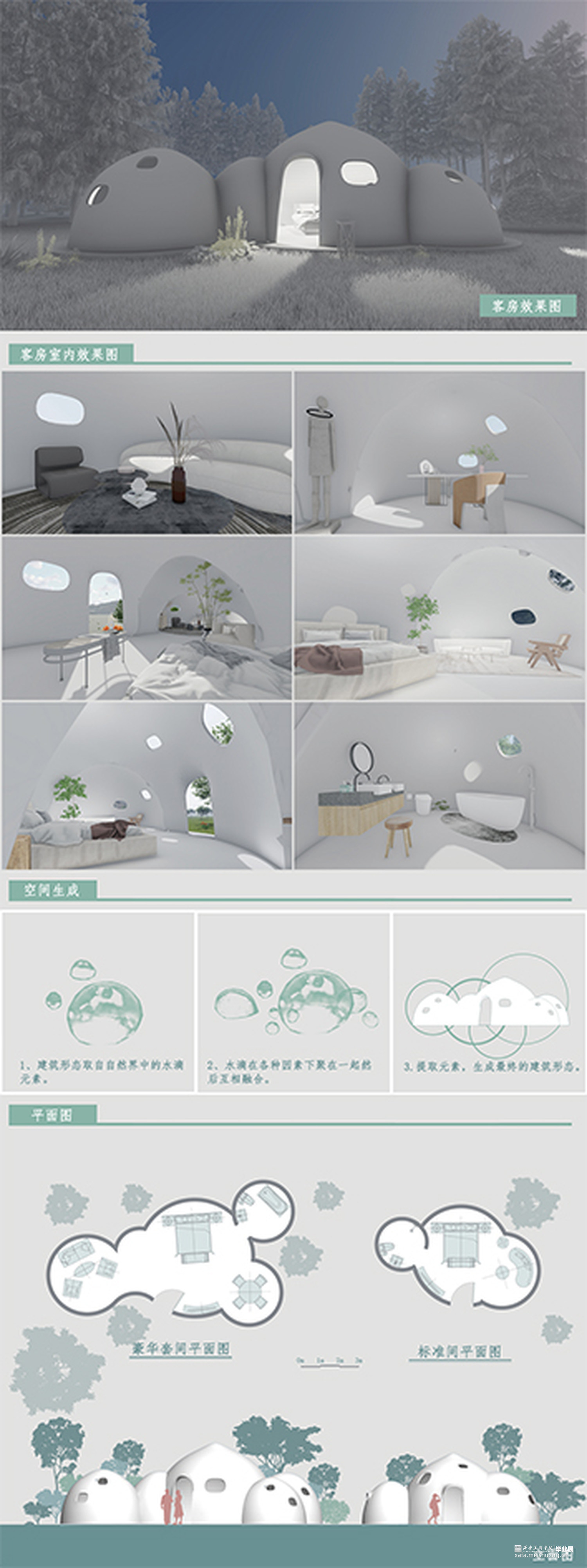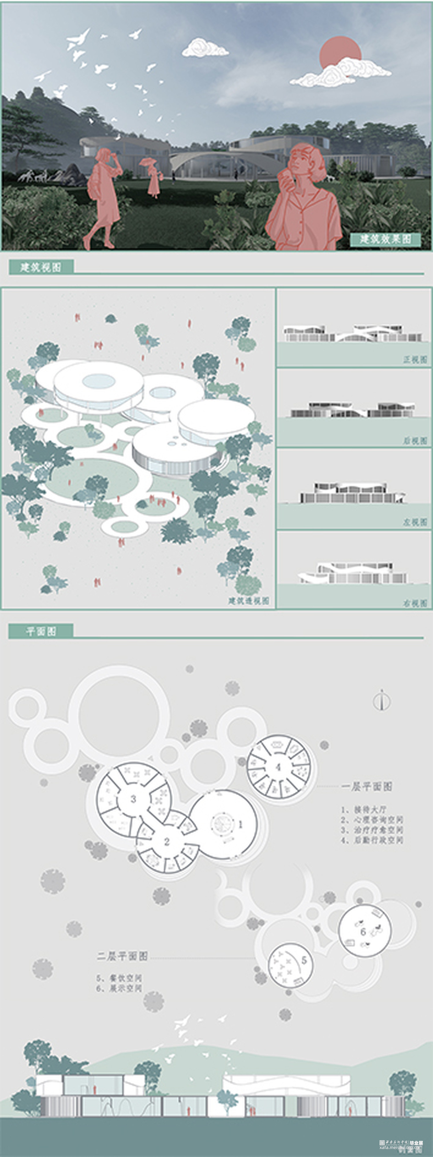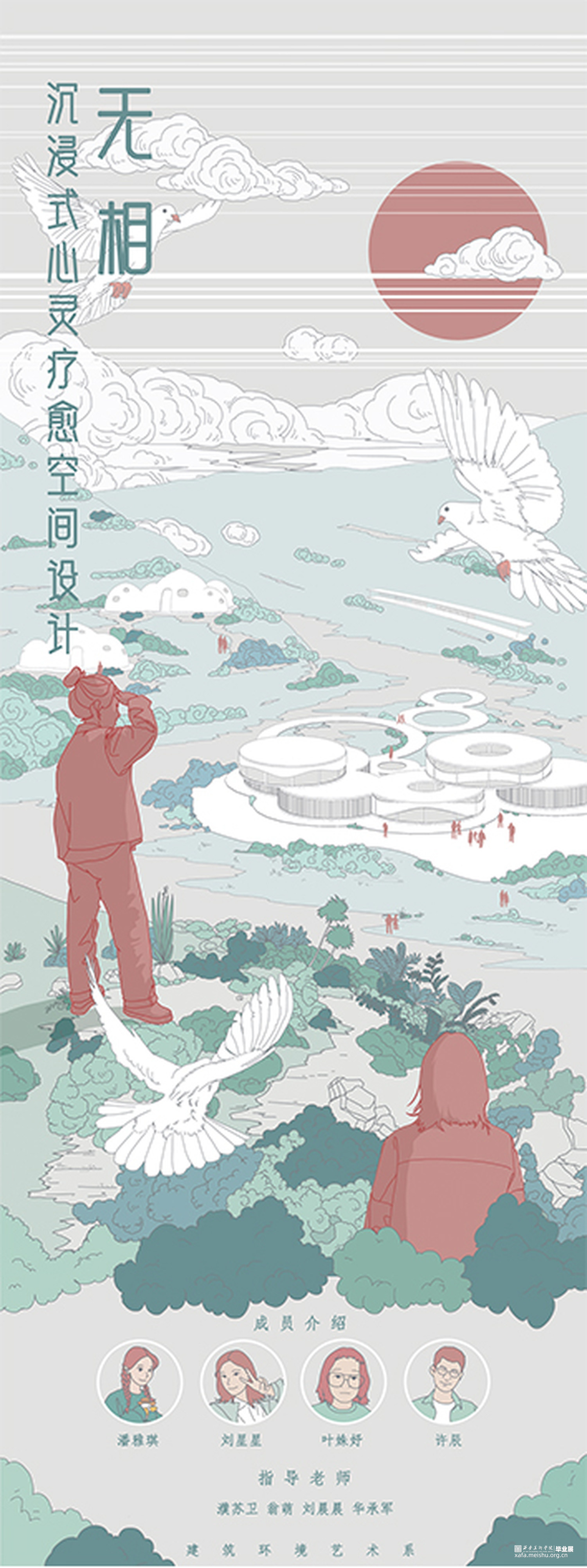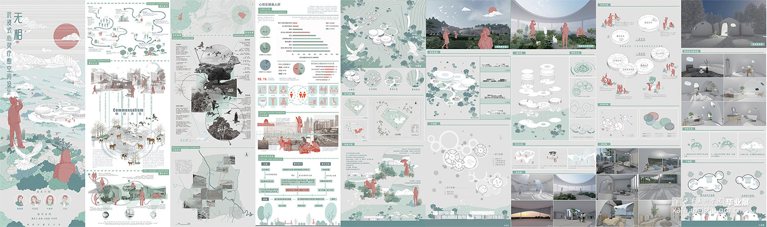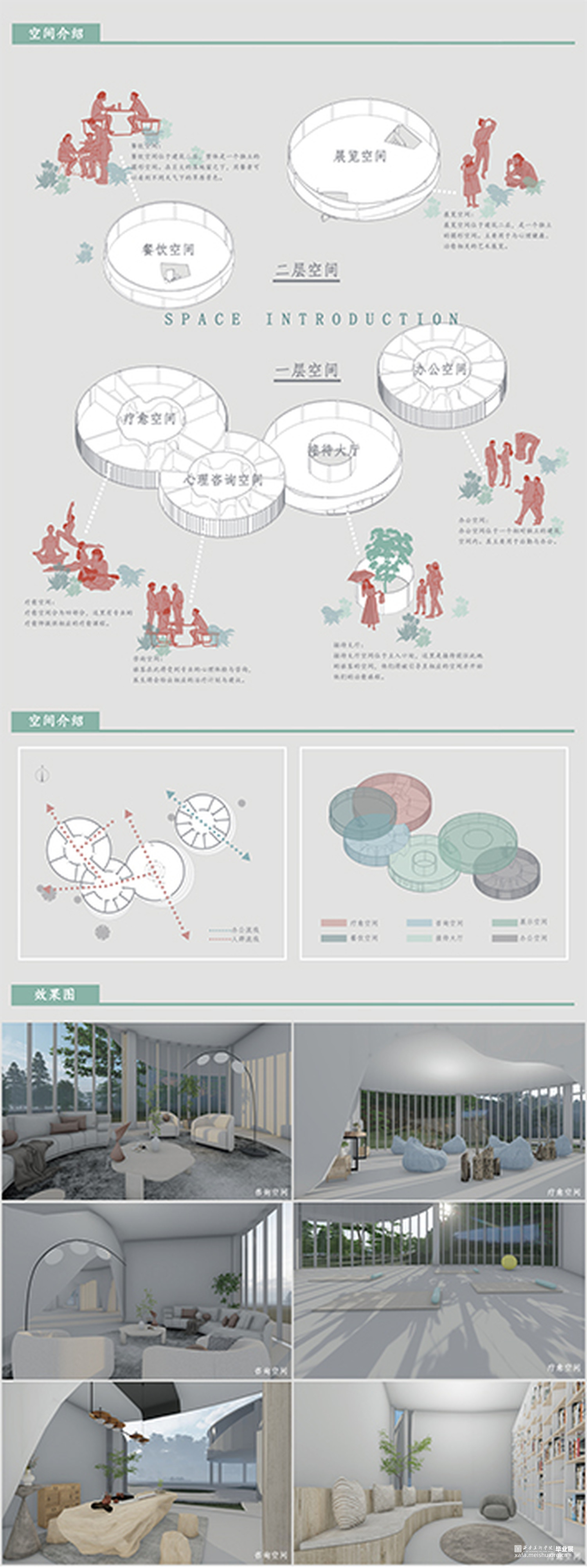 无相——沉浸式心灵疗愈空间设计。旨在设计一个心灵的疗愈空间,为在社会环境等压力下造成心理亚健康的人员提供一个心理治愈的场所。在这个高速发展的现代社会,快节奏的生活,和在这个被科技、电子这些冷冰冰的东西充斥着的城市里,人们惯于接受那些碎片化的关键信息,没有了独立思考,忽视了自我的内在变化,所以心也就乱了。因此,我们想要设计的是一个能让人抛开城市化快节奏生活,慢下脚步,感受自然,独立思考,寻找完整自我的空间。我们将项目的选址定在大自然中,并提出映衬共生这一概念作为我们设计的主题。这所代表的的不仅是我们方案中受