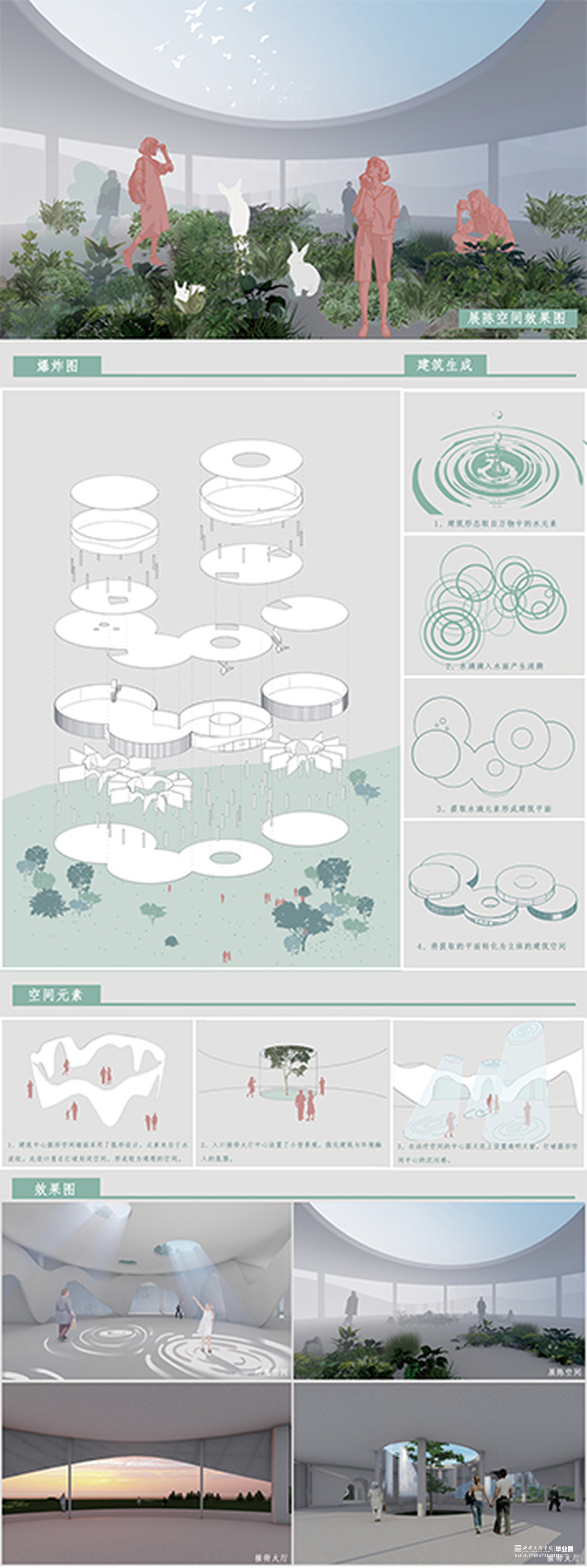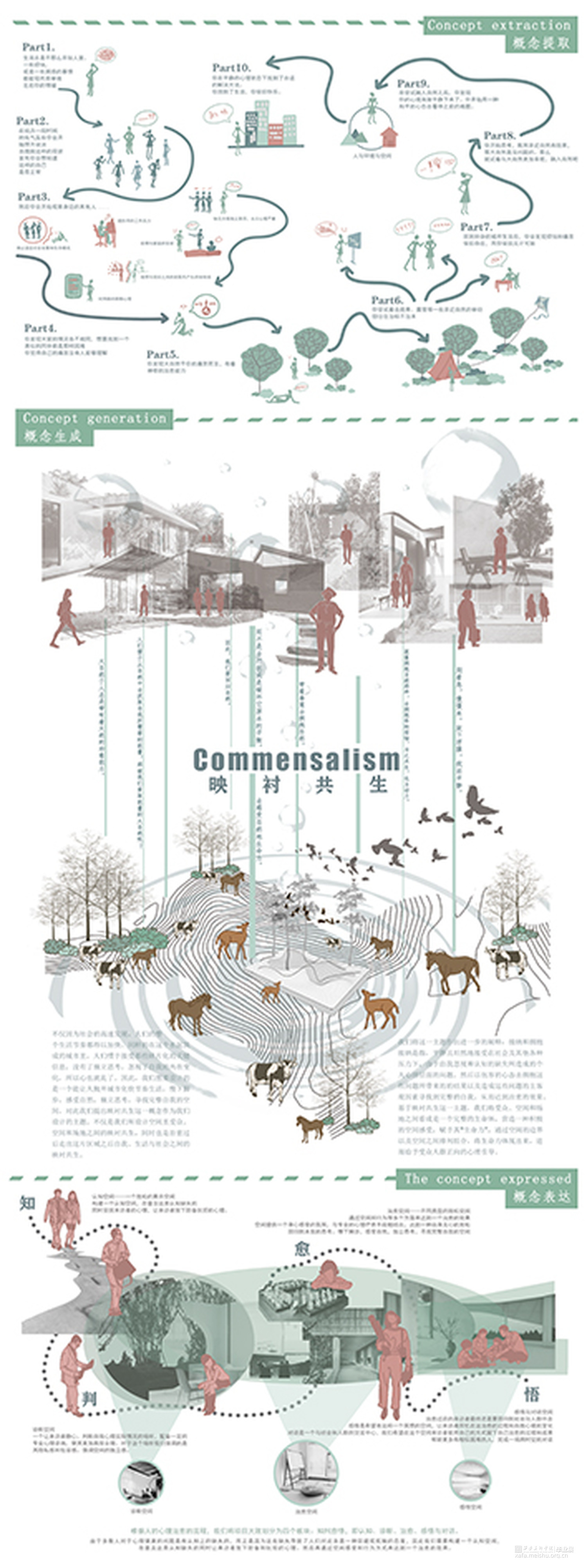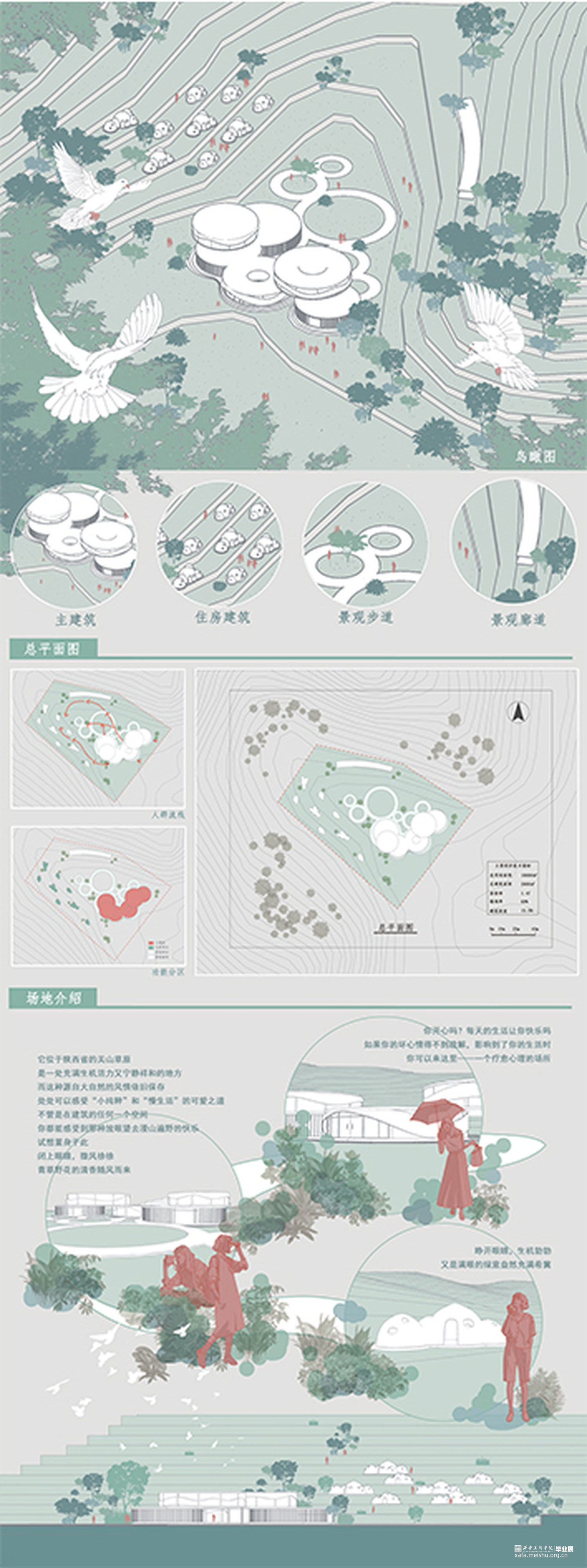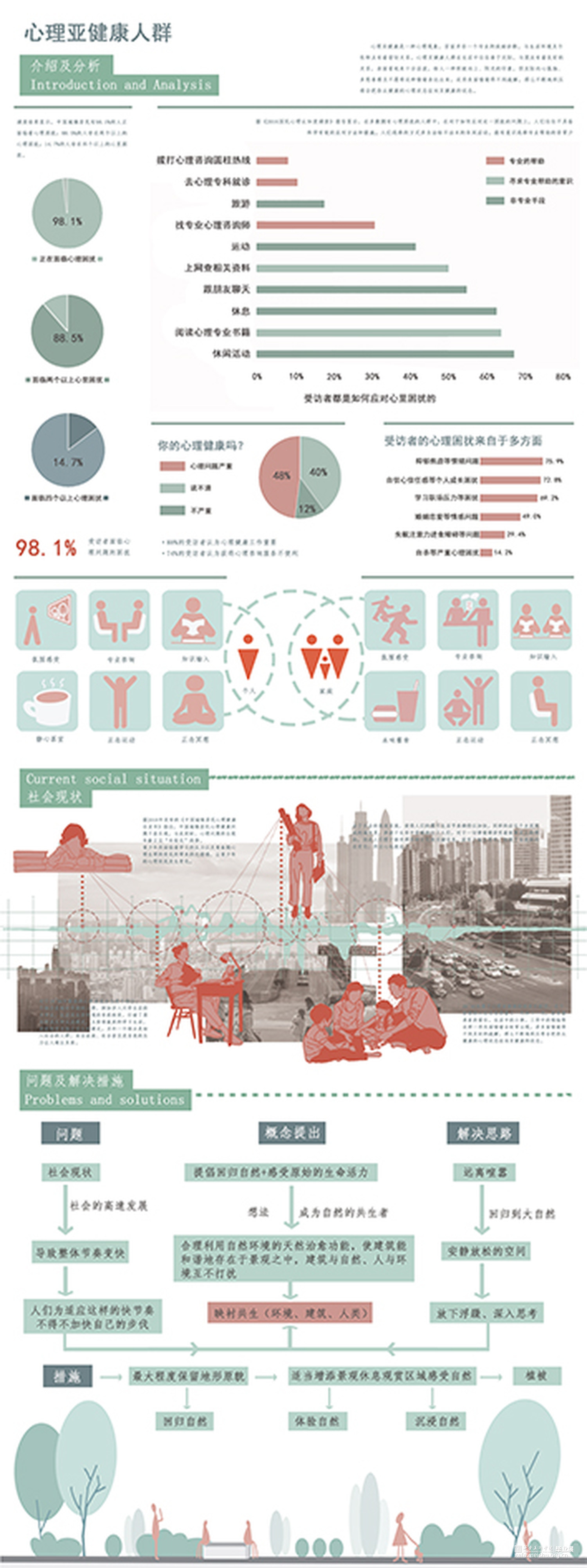无相——沉浸式心灵疗愈空间设计。旨在设计一个心灵的疗愈空间,为在社会环境等压力下造成心理亚健康的人员提供一个心理治愈的场所。在这个高速发展的现代社会,快节奏的生活,和在这个被科技、电子这些冷冰冰的东西充斥着的城市里,人们惯于接受那些碎片化的关键信息,没有了独立思考,忽视了自我的内在变化,所以心也就乱了。因此,我们想要设计的是一个能让人抛开城市化快节奏生活,慢下脚步,感受自然,独立思考,寻找完整自我的空间。我们将项目的选址定在大自然中,并提出映衬共生这一概念作为我们设计的主题。这所代表的的不仅是我们方案中受