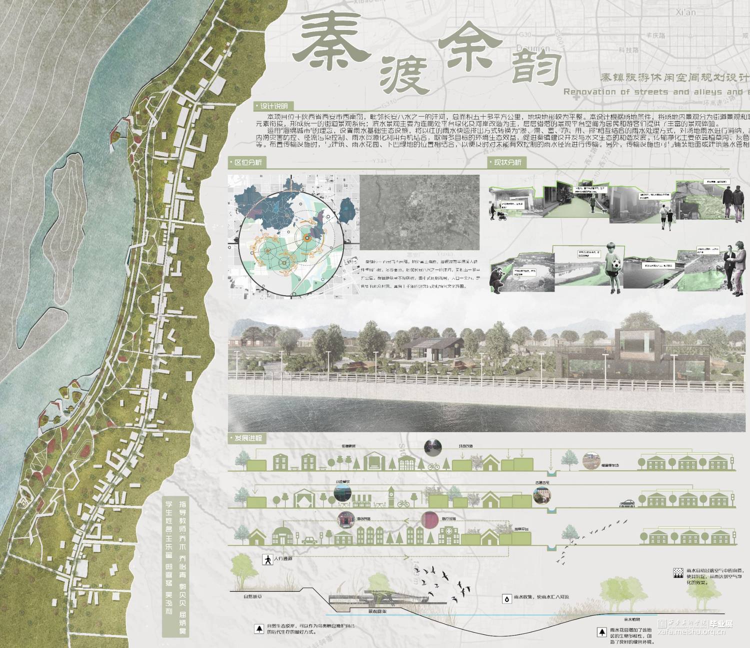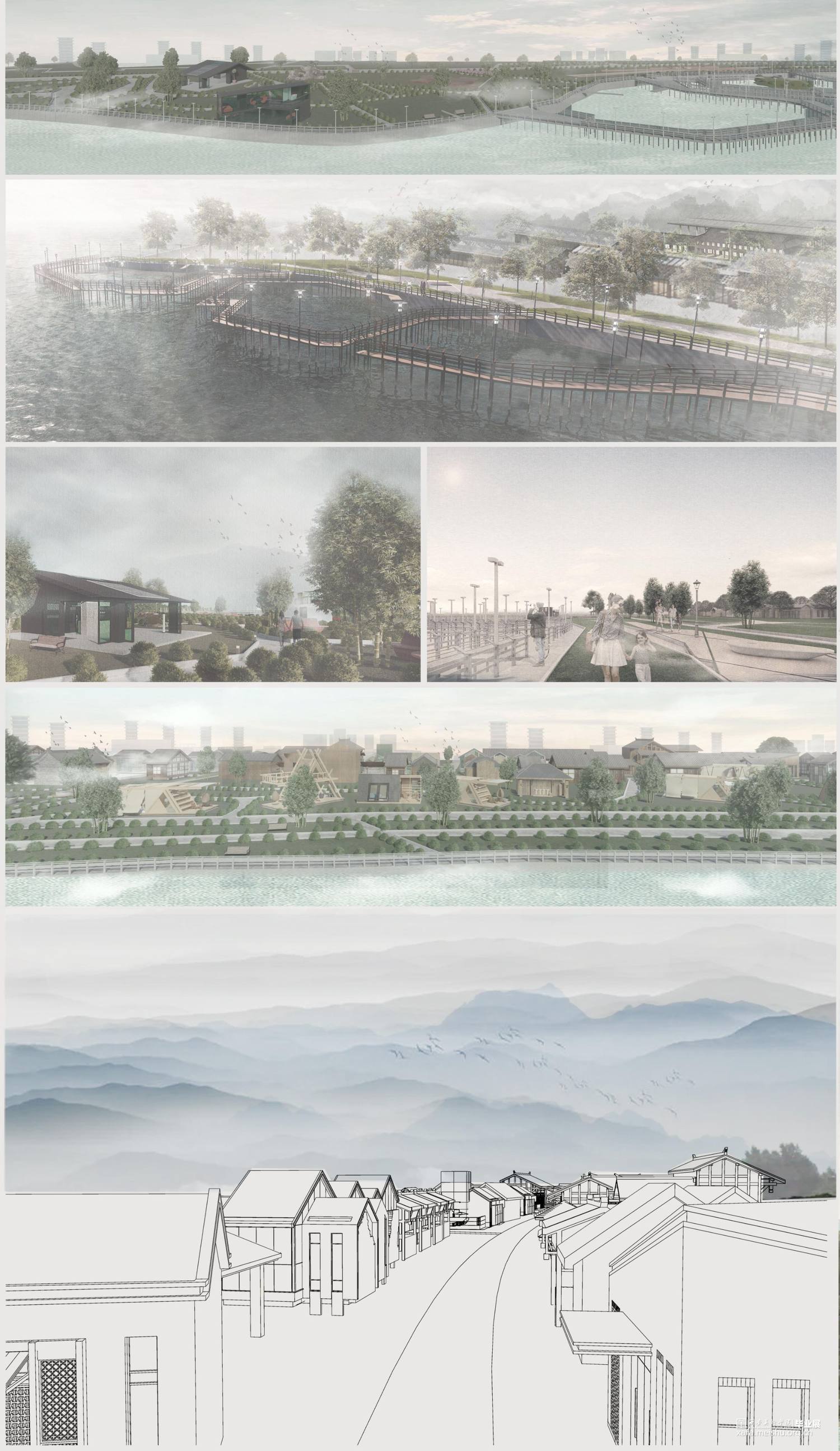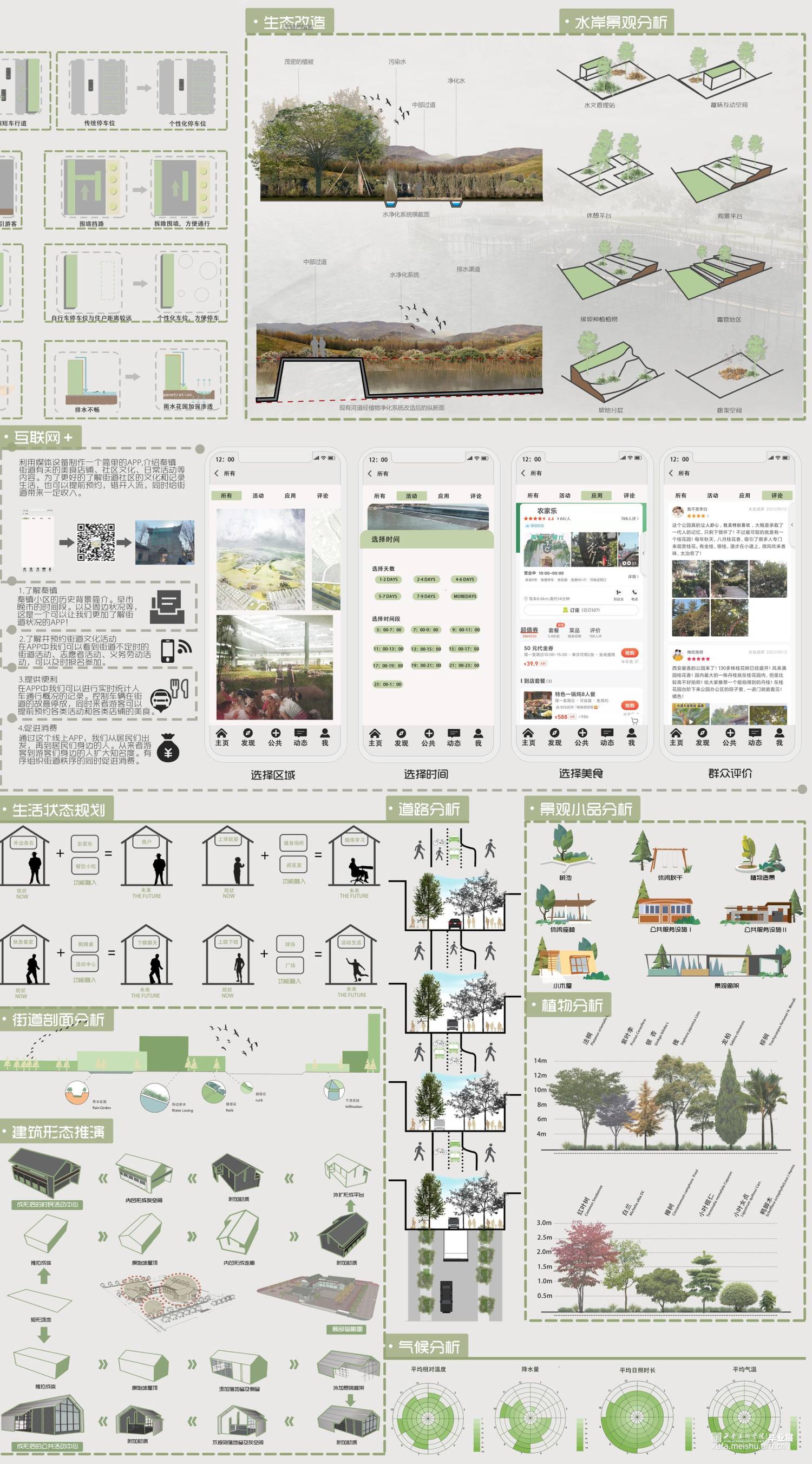 我们想要做的是将秦渡镇的人流提升,将场地变得更有人气,据我们调查所得,秦渡镇老年人,以及小孩子较多,说明劳动力外流,我们想要复兴秦渡镇往日的繁华,重点放在了滨水景观以及最外的一条街道,将其改造成商业街。但由于商业街中还遗留很多的古建古宅,我们将其保留下来,对古建古宅进行保护。滨水地区添加了露营,增加了景观节点,用来丰富场地
