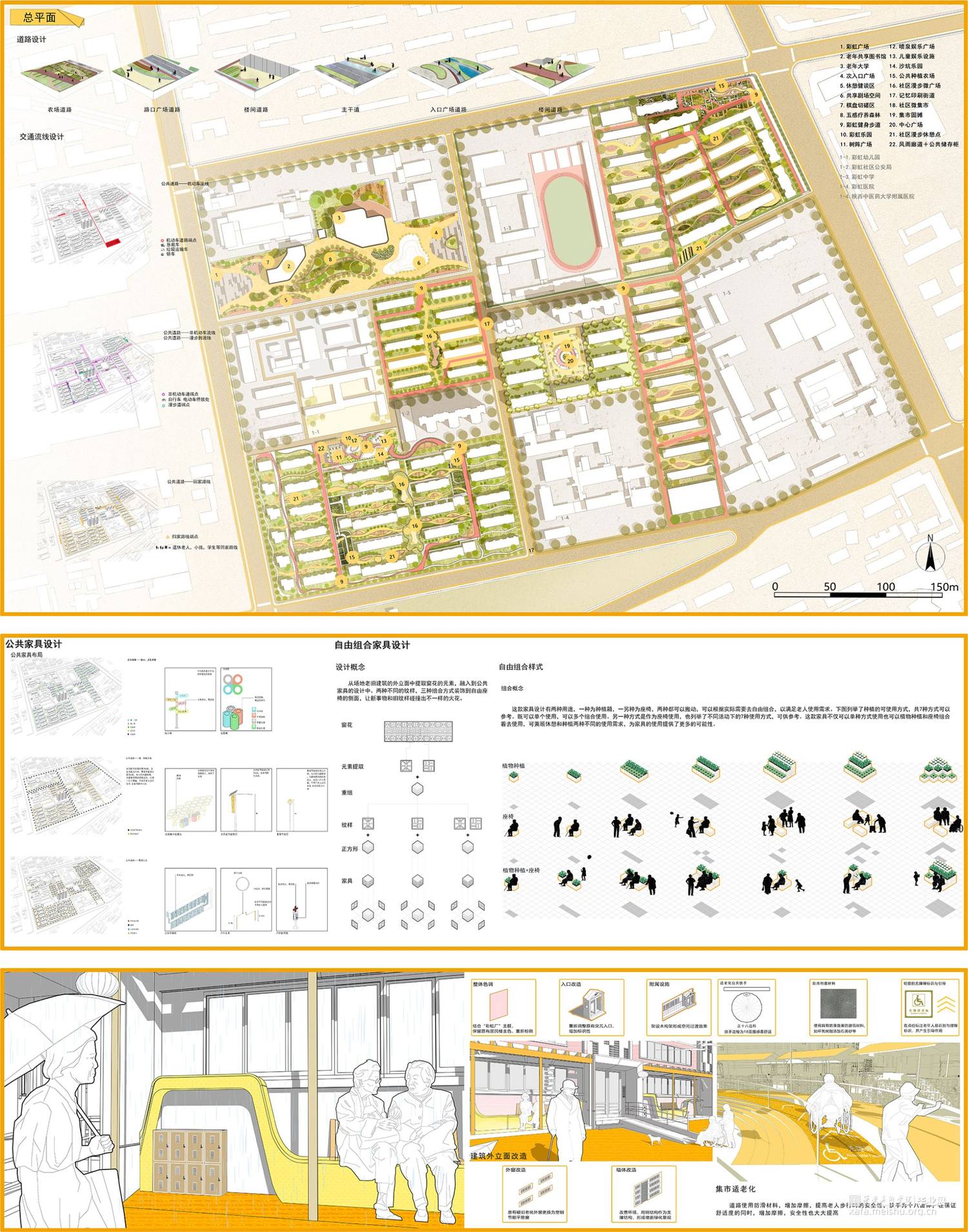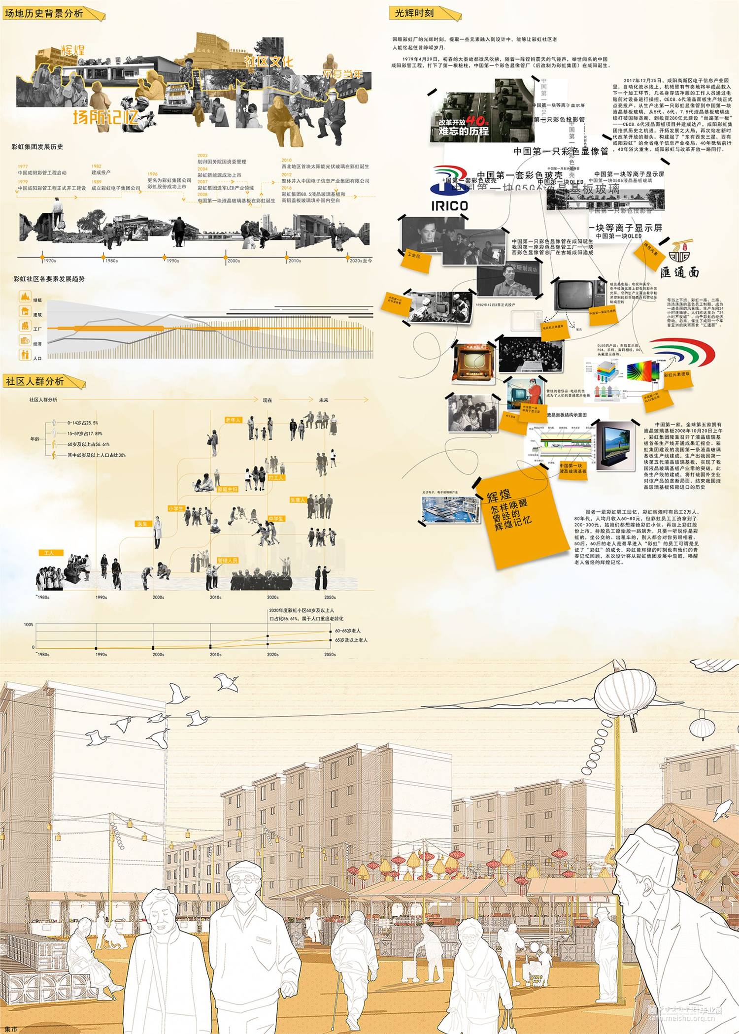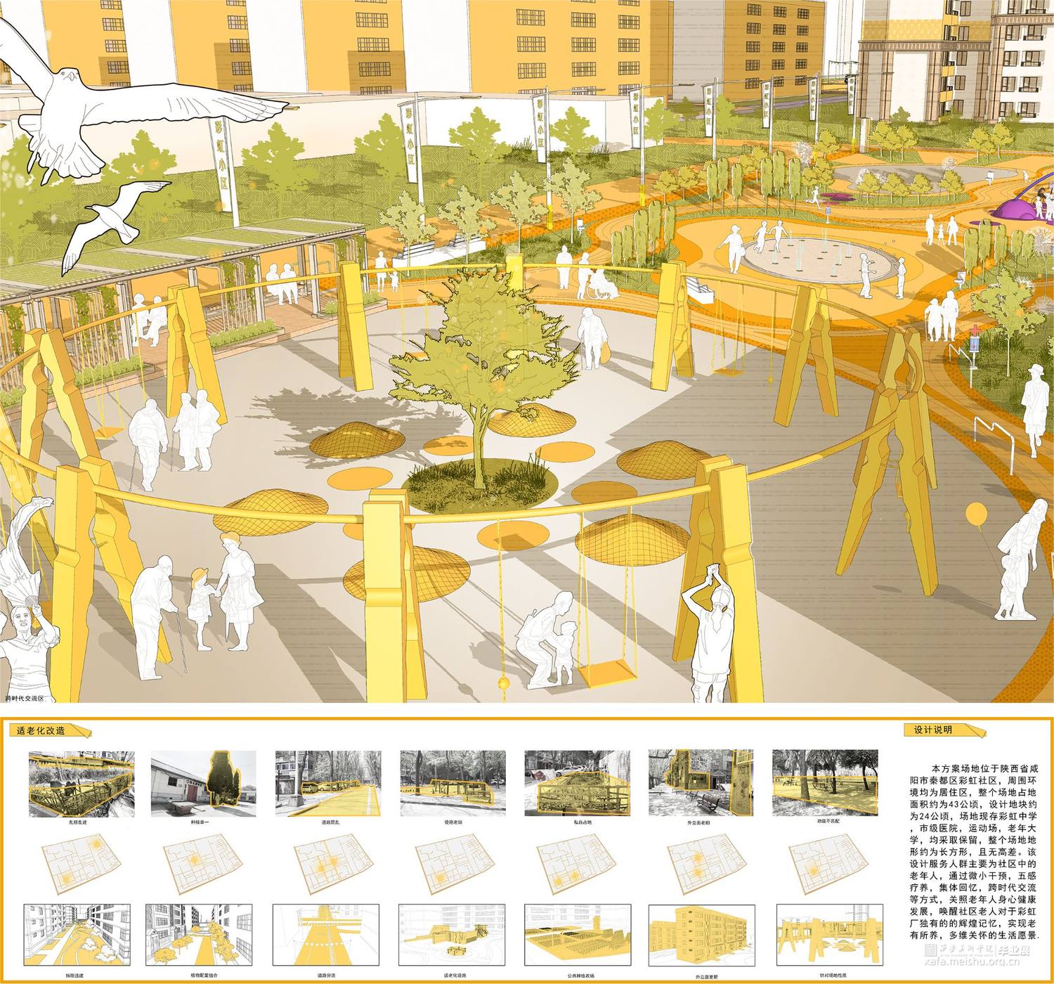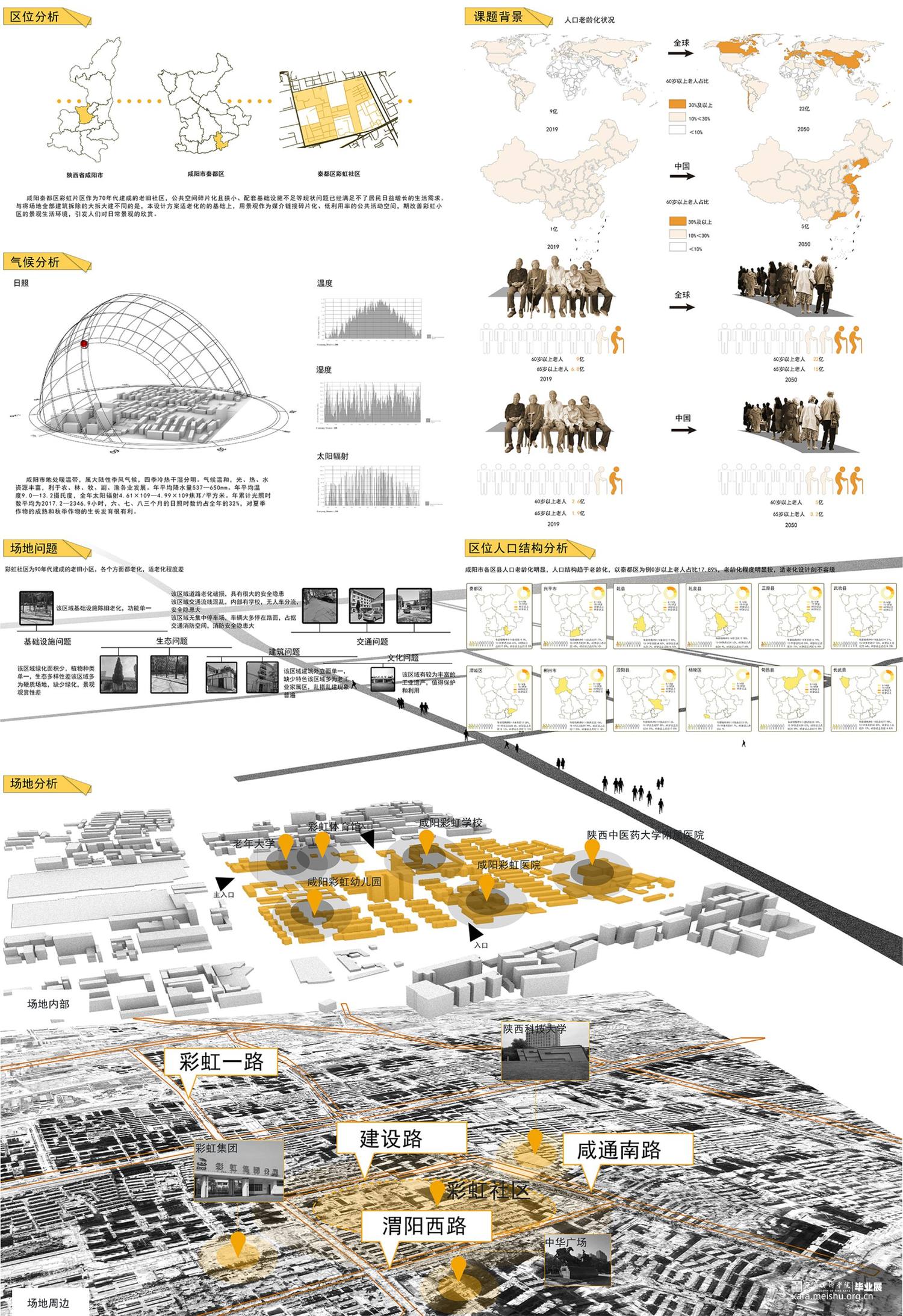 本方案场地位于陕西省咸阳市秦都区彩虹社区,周围环境均为居住区,整个场地占地面积约为43公顷,设计地块约为24公顷,场地现存彩虹中学,市级医院,运动场,老年大学,均采取保留,整个场地地形约为长方形,且无高差。该设计服务人群主要为社区中的老年人,通过微小干预,五感疗养,集回忆,跨时代交流等方式,关照老年人身心健康发展,唤醒社区老人对于彩虹厂独有的的辉煌记忆,实现老有所养,多维关怀的生活愿景。
