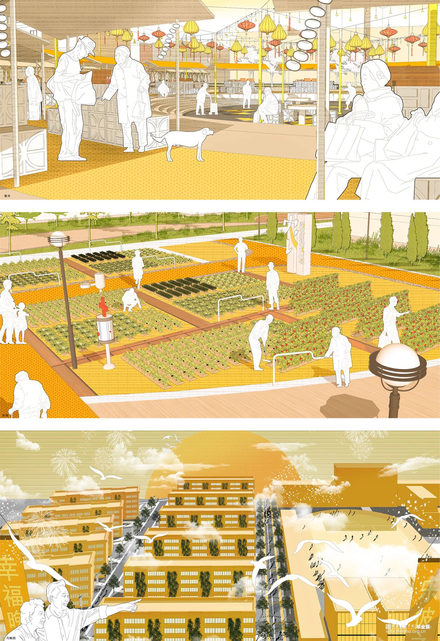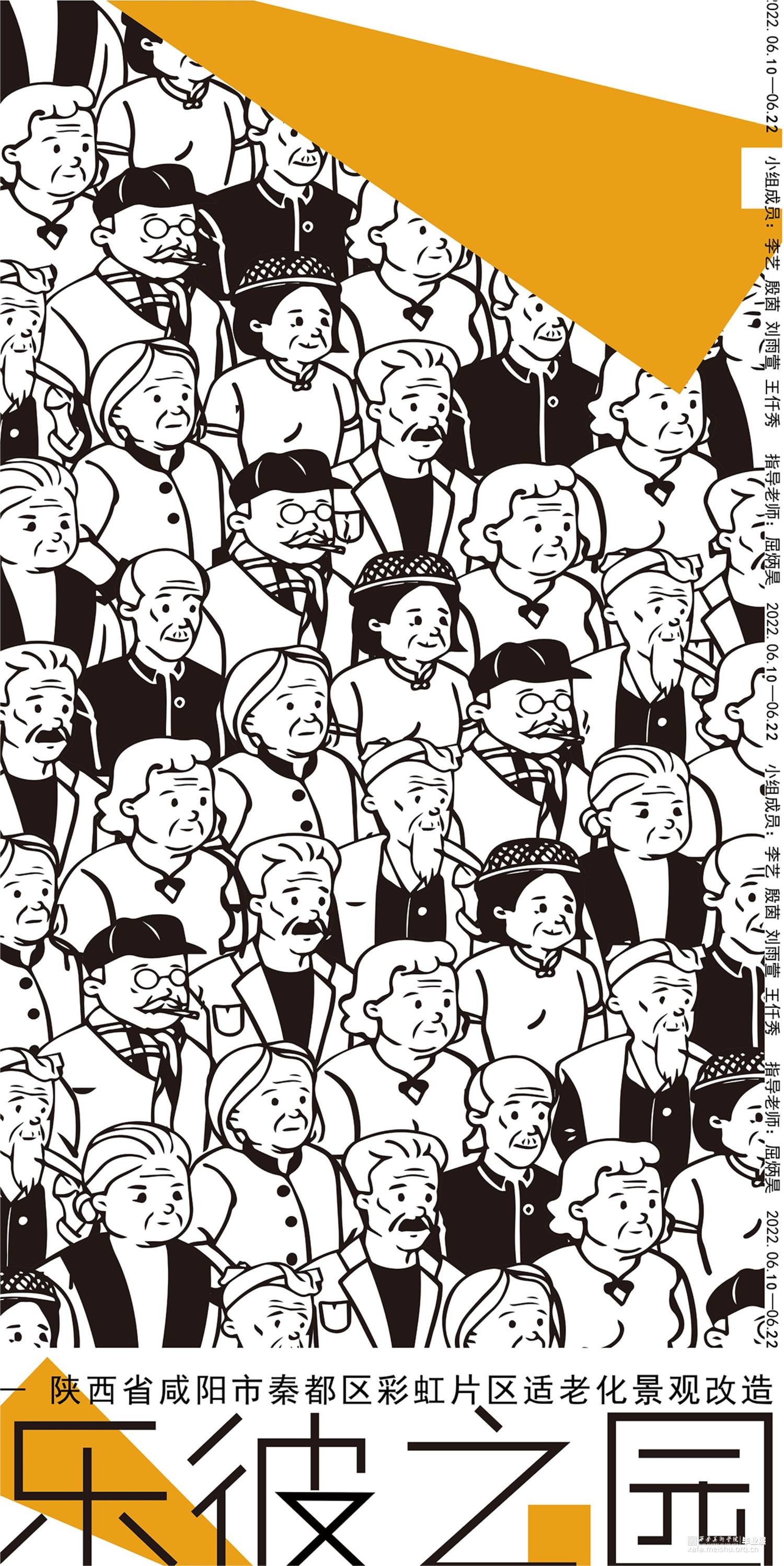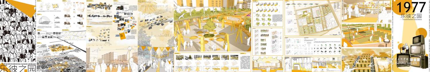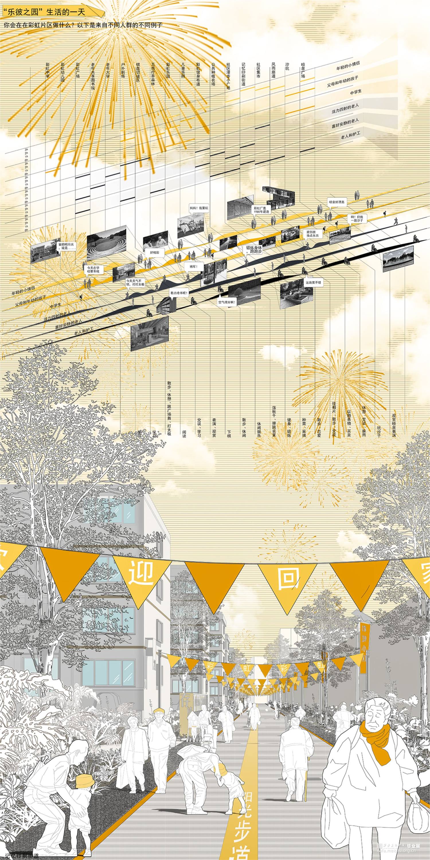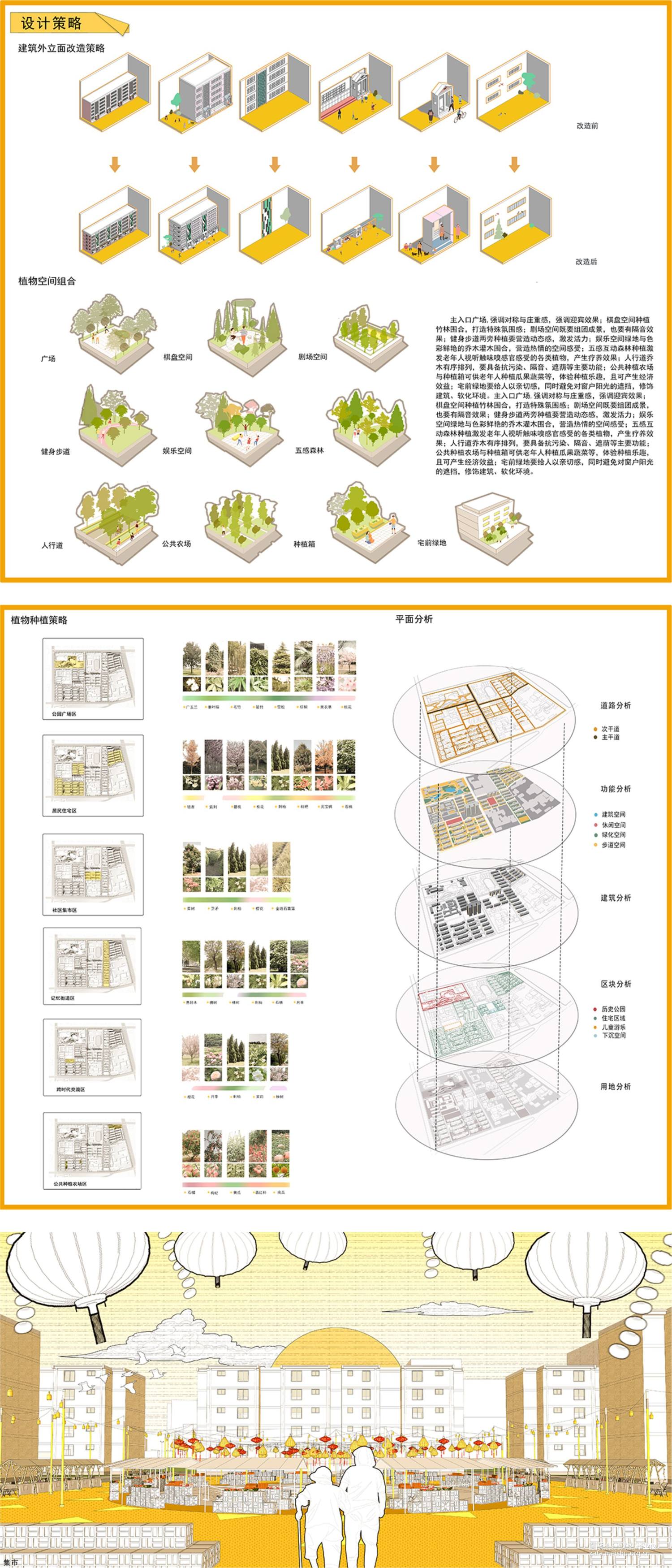 本方案场地位于陕西省咸阳市秦都区彩虹社区,周围环境均为居住区,整个场地占地面积约为43公顷,设计地块约为24公顷,场地现存彩虹中学,市级医院,运动场,老年大学,均采取保留,整个场地地形约为长方形,且无高差。该设计服务人群主要为社区中的老年人,通过微小干预,五感疗养,集回忆,跨时代交流等方式,关照老年人身心健康发展,唤醒社区老人对于彩虹厂独有的的辉煌记忆,实现老有所养,多维关怀的生活愿景。