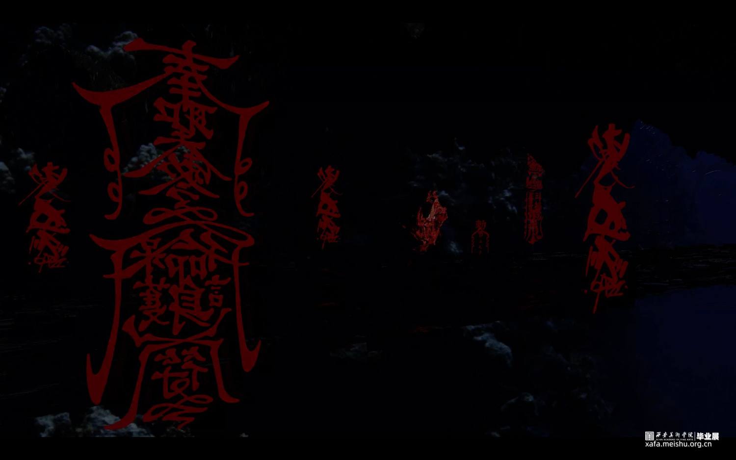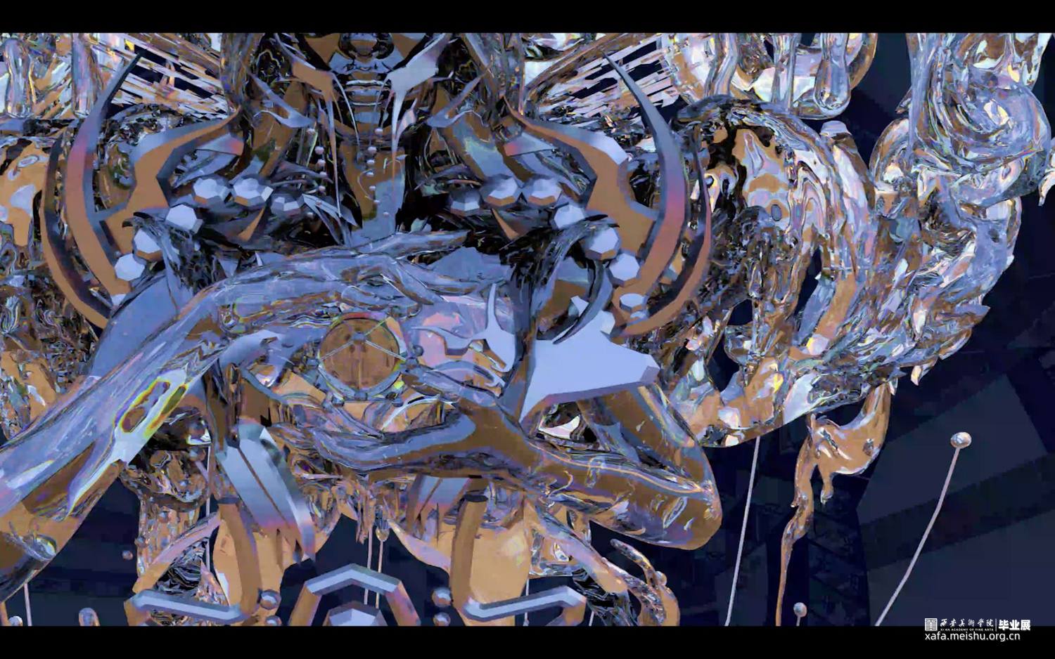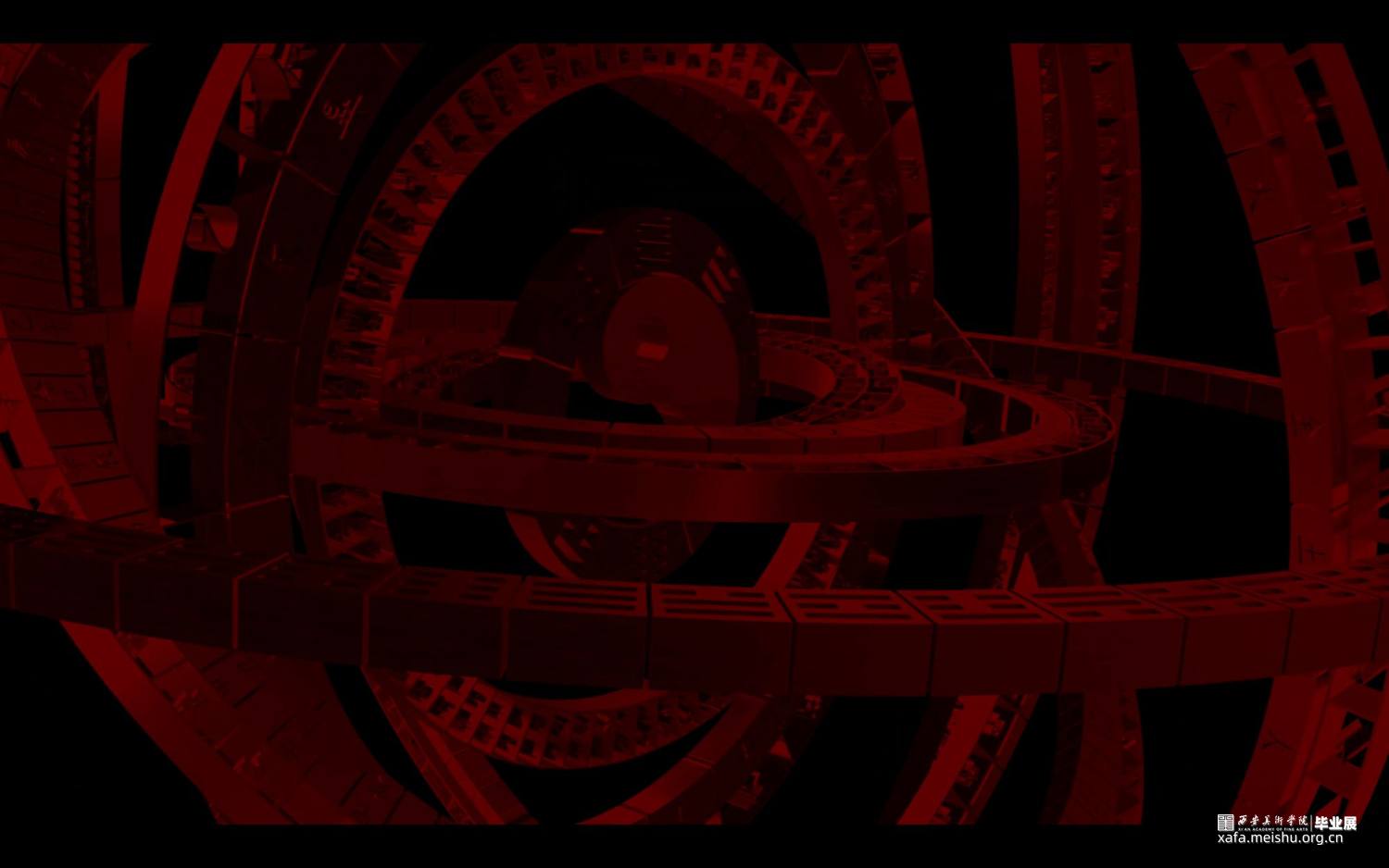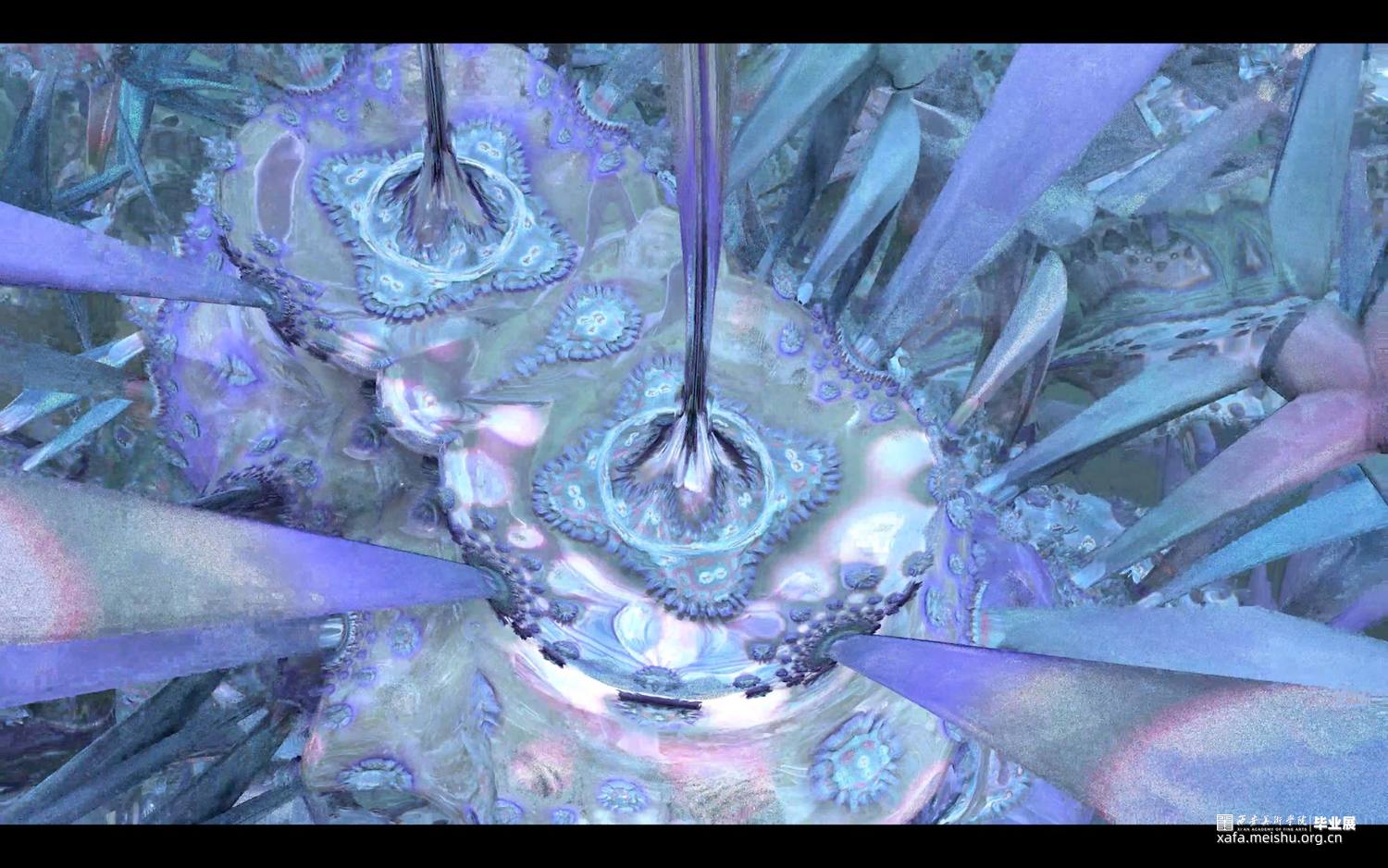 本作品架空历史时间线,基于下元节纪念水官“禹”、祈福消灾的传统习俗,展示了未来信徒在下元节这天的朝拜过程。将场景建构于海底,穿梭于虚构与现实中,探索天、地、水、建筑和符号等元素,在对抽象艺术基础语言元素构成方式进行创作中,发掘抽象艺术语言表现形态的多重延伸可能,并在其中添加自己的意识逻辑,使传统客观的意象转化成主观成像,利用未来视角,消解厚重的历史感和严肃的现实感,描绘出设想的未来电子宗教美学世界。以量子纠缠,数据二重身,万物有灵为背景去臆测未来宗教文化所衍生的科技与仪式间的新兴关系—