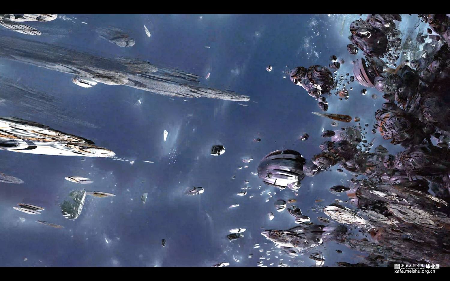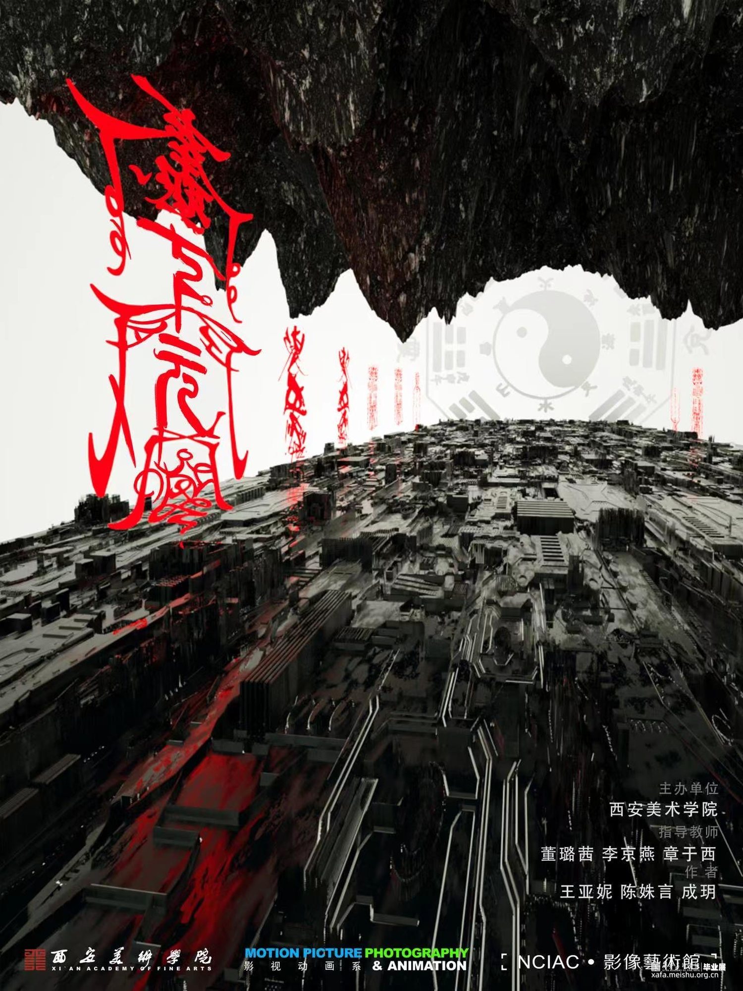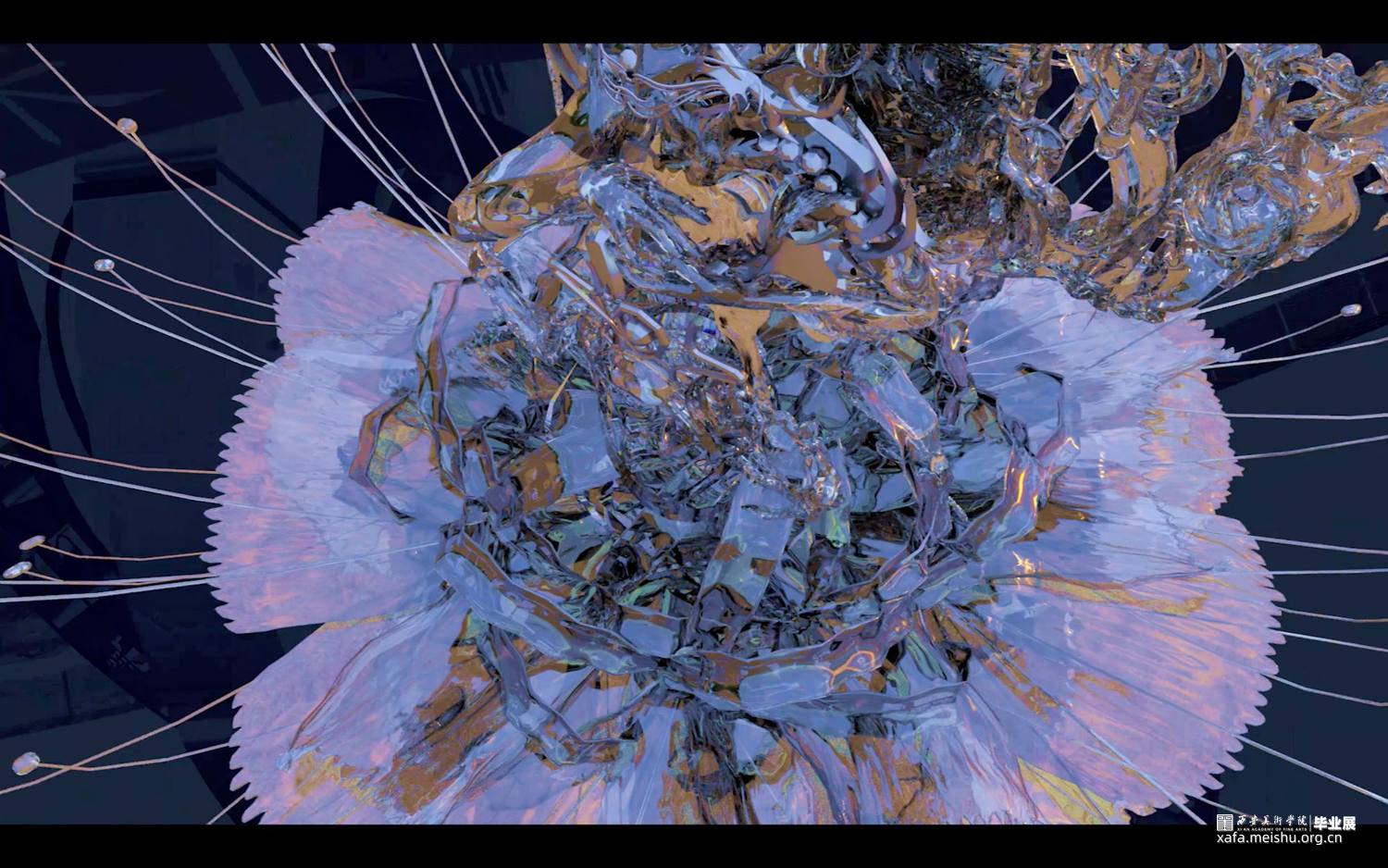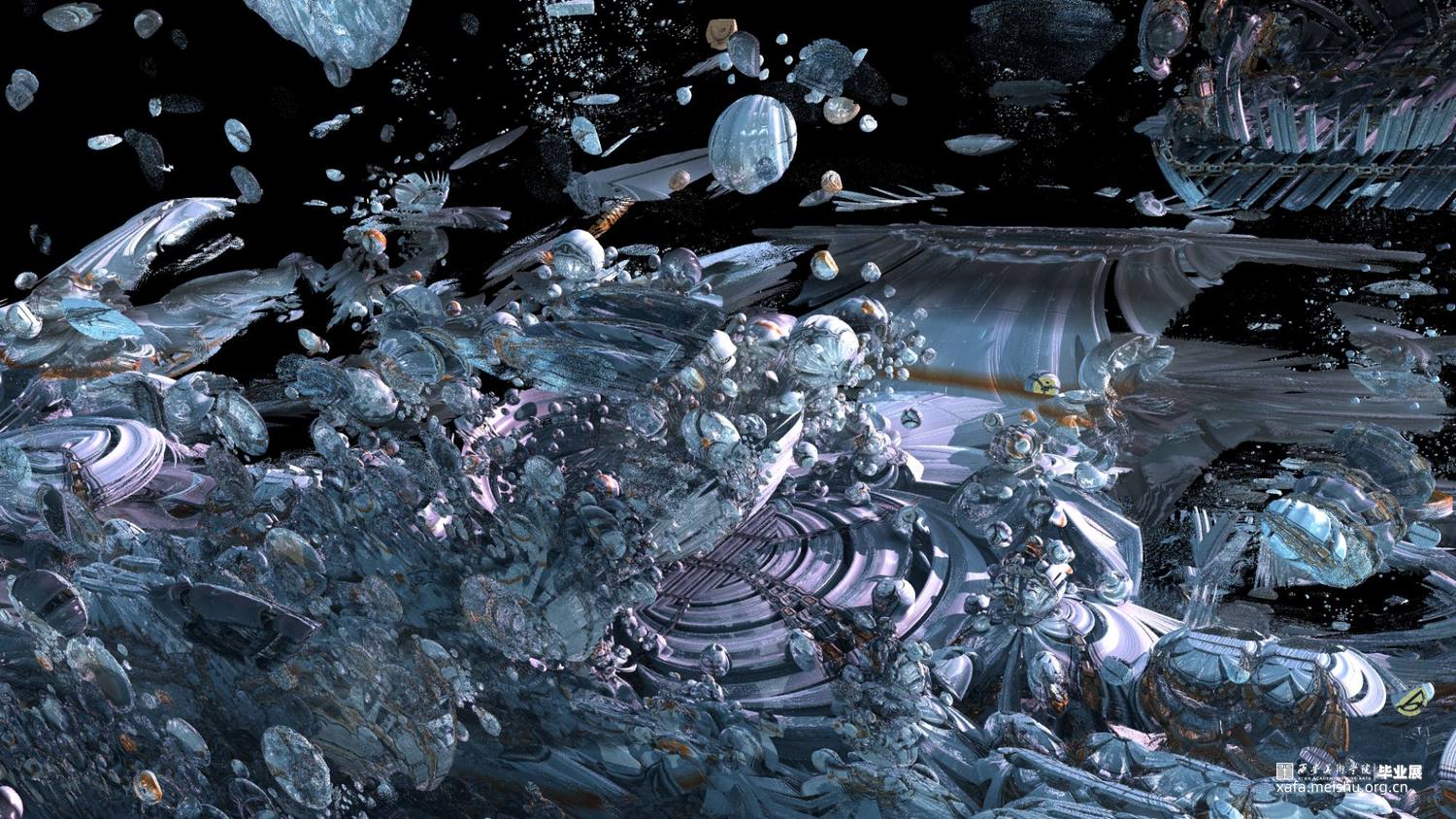 本作品架空历史时间线,基于下元节纪念水官“禹”、祈福消灾的传统习俗,展示了未来信徒在下元节这天的朝拜过程。将场景建构于海底,穿梭于虚构与现实中,探索天、地、水、建筑和符号等元素,在对抽象艺术基础语言元素构成方式进行创作中,发掘抽象艺术语言表现形态的多重延伸可能,并在其中添加自己的意识逻辑,使传统客观的意象转化成主观成像,利用未来视角,消解厚重的历史感和严肃的现实感,描绘出设想的未来电子宗教美学世界。以量子纠缠,数据二重身,万物有灵为背景去臆测未来宗教文化所衍生的科技与仪式间的新兴关系—