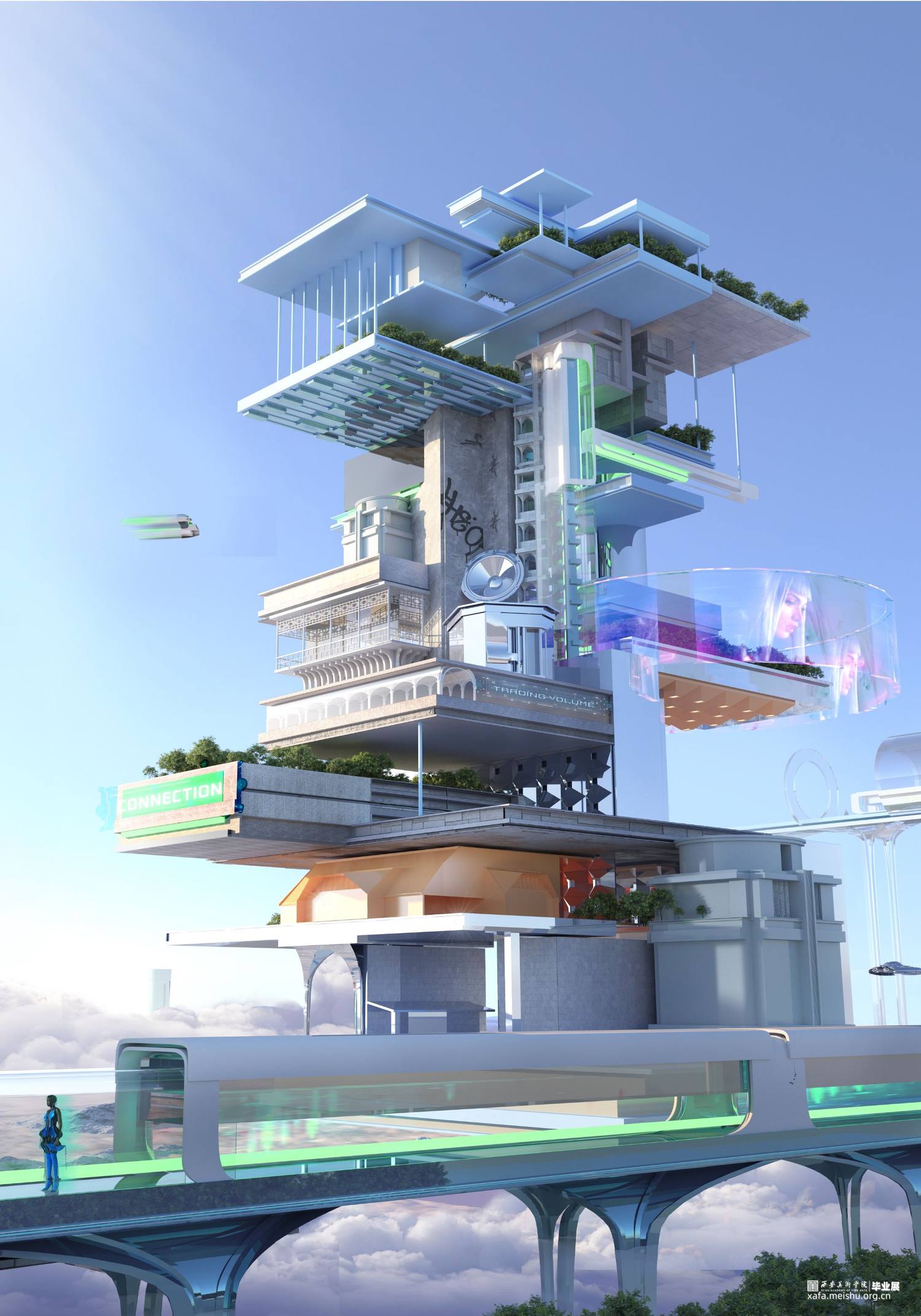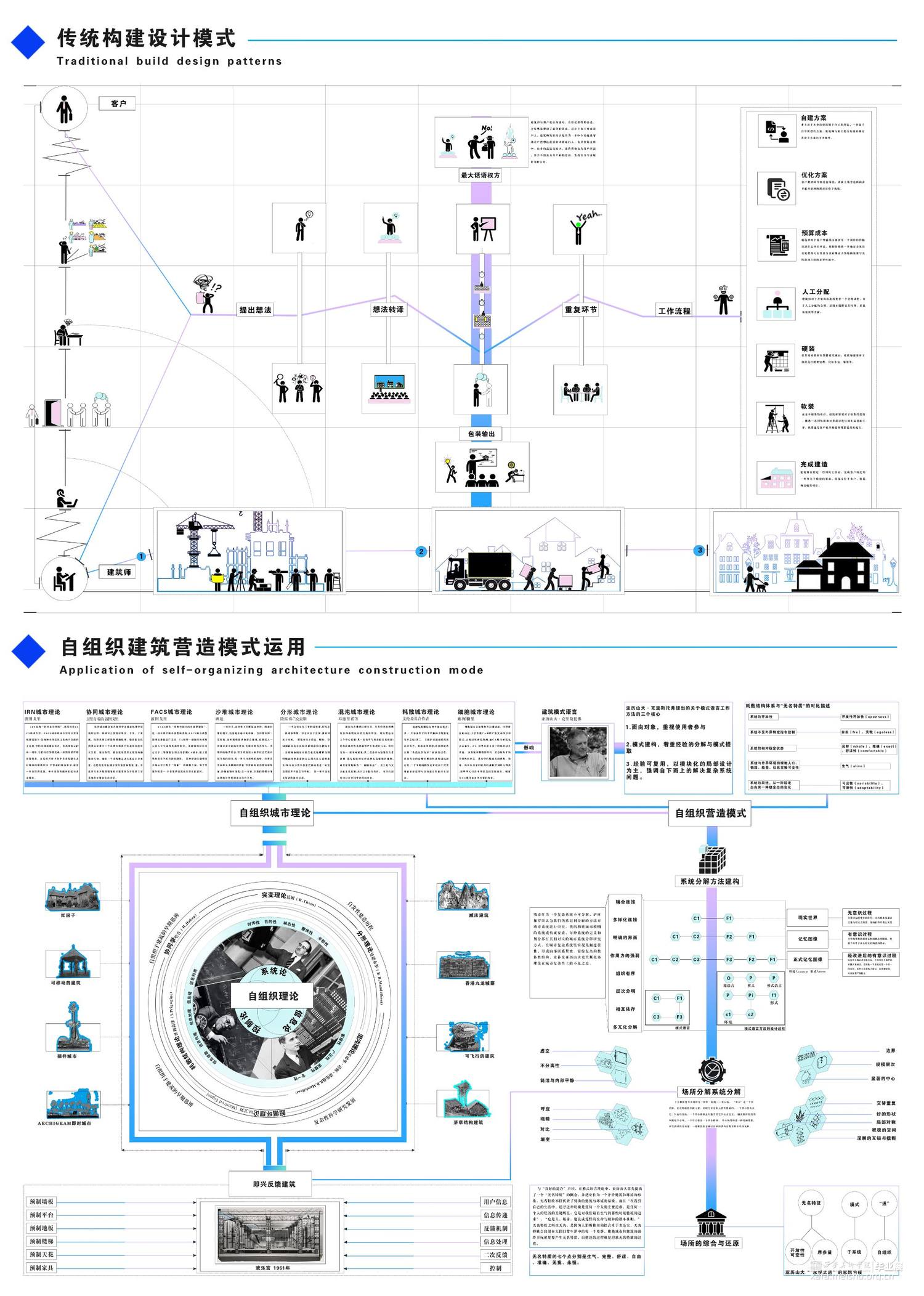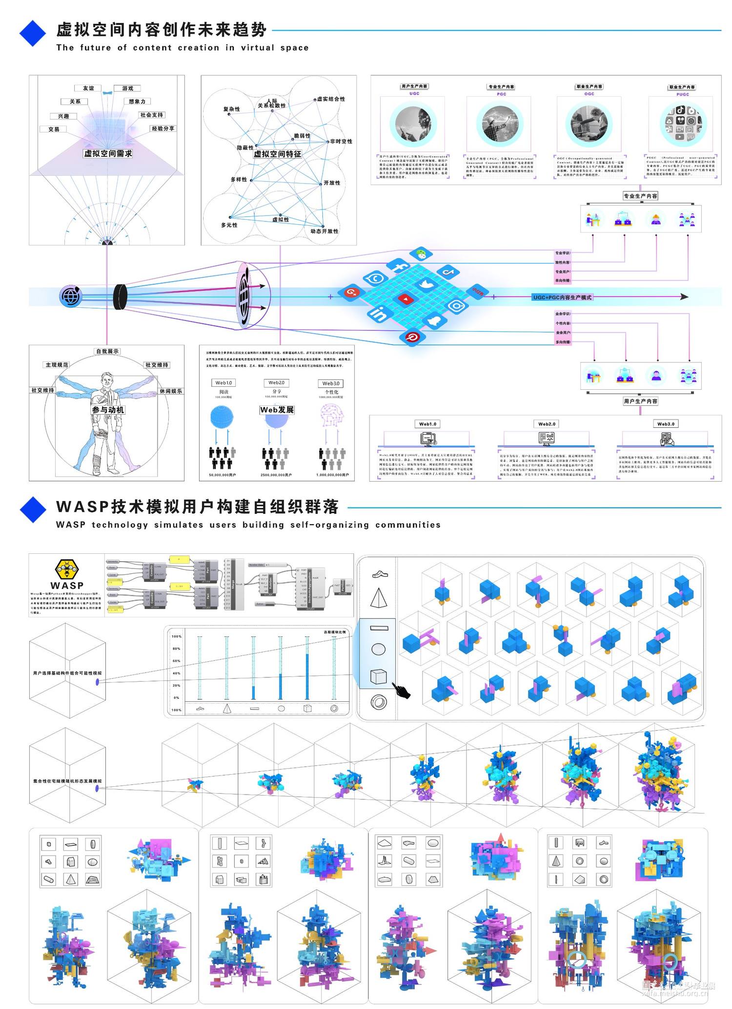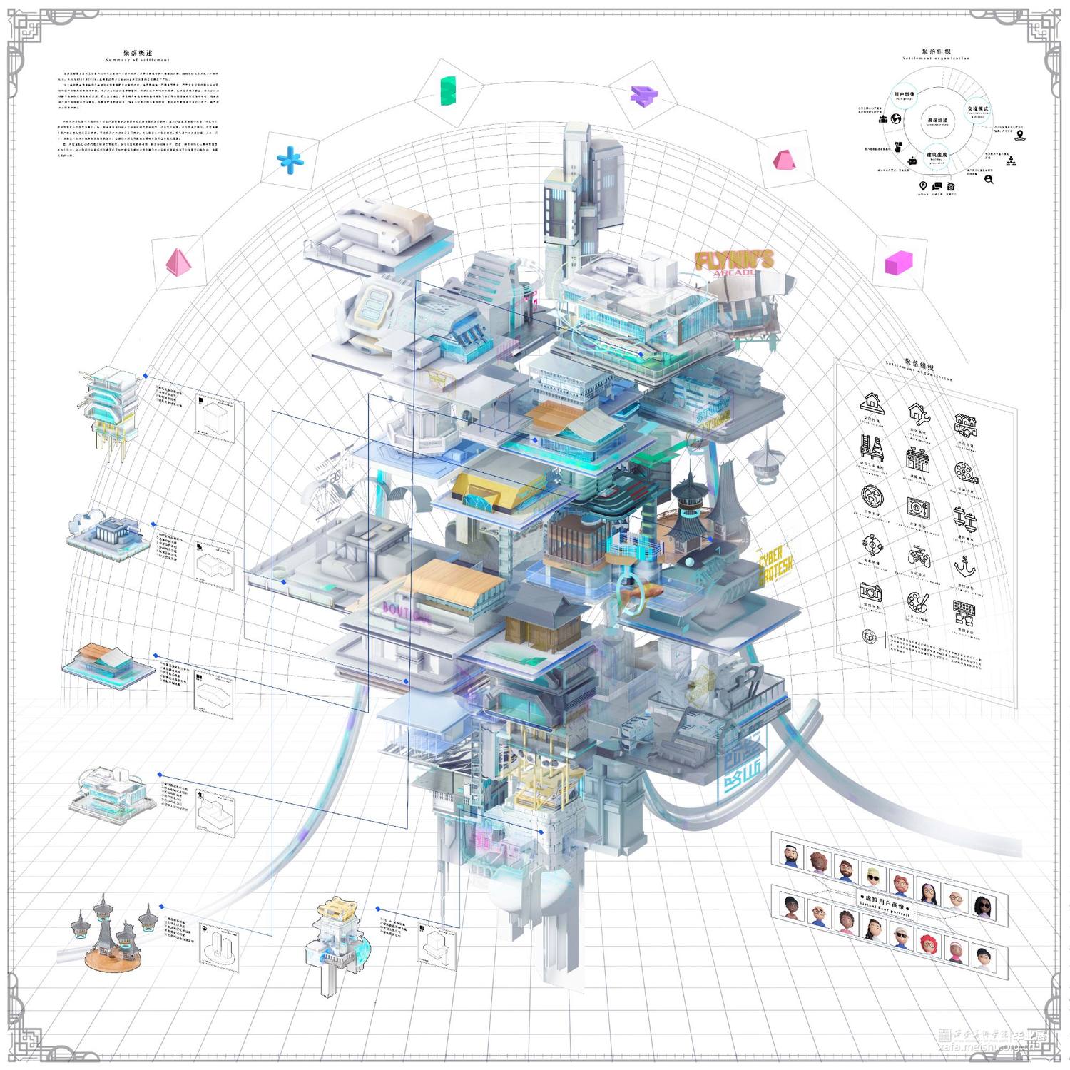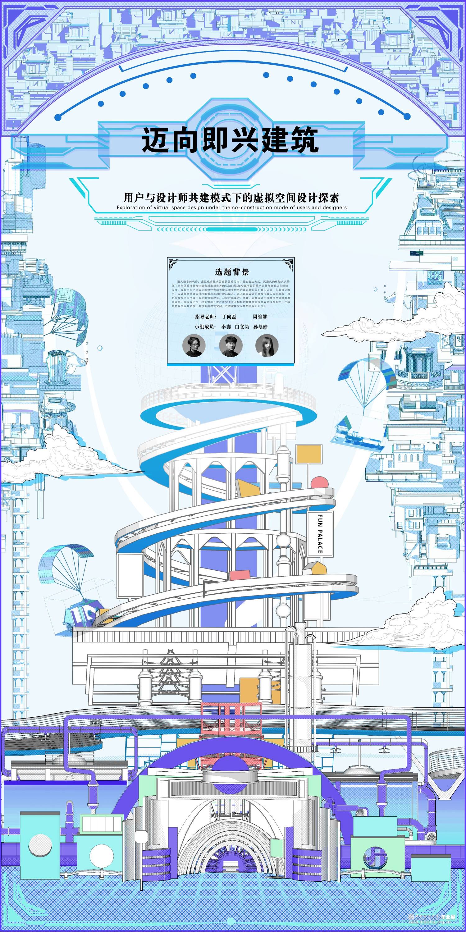随着互联网和智能终端的快速发展,2021年元宇宙的再次提出又引来了一系列用户对于虚拟空间体验的热潮。虚拟现实技术为建筑领域带来了新的表达方式,沉浸式的体验大大降低了空间体验的地域限制与虚拟世界的认知门槛,抛开元宇宙这一宏观的名词,其本质则是人类在追求极致体验的过程中对技术不断提出更高要求的必然产物。如今虚拟地产运营与交易在迅速的发展,同时带来的虚拟现实科技,还是一个并未被广泛接受的技术,不同平台,不同媒介由于算力、技术的差距,带来的体验也良莠不齐。那么数字世界中建筑空间设计者又能否重新定义建筑的价值?本次设计便以此为背景,设计师将作为建造过程的引导者和经验总结者,而不再是设计的直接决策人或实施者,用户在虚拟空间中自下而上的创造建筑,过程中与设计师商讨、共建,最终设计出真正符合用户需求的虚拟建筑。我们将建筑自组织理论为基点,主要分析了建筑自组织从现实到虚拟的转变和发展趋势,进而探讨用户与设计师共建模式在虚拟建筑设计中的可能性。从本质上说,我们需要将建筑学介入到新孕育的虚拟世界中,开发在视觉上令人愉悦的虚拟构造系统;使用户在感知层面体验高品质、高水准的虚拟建筑空间。