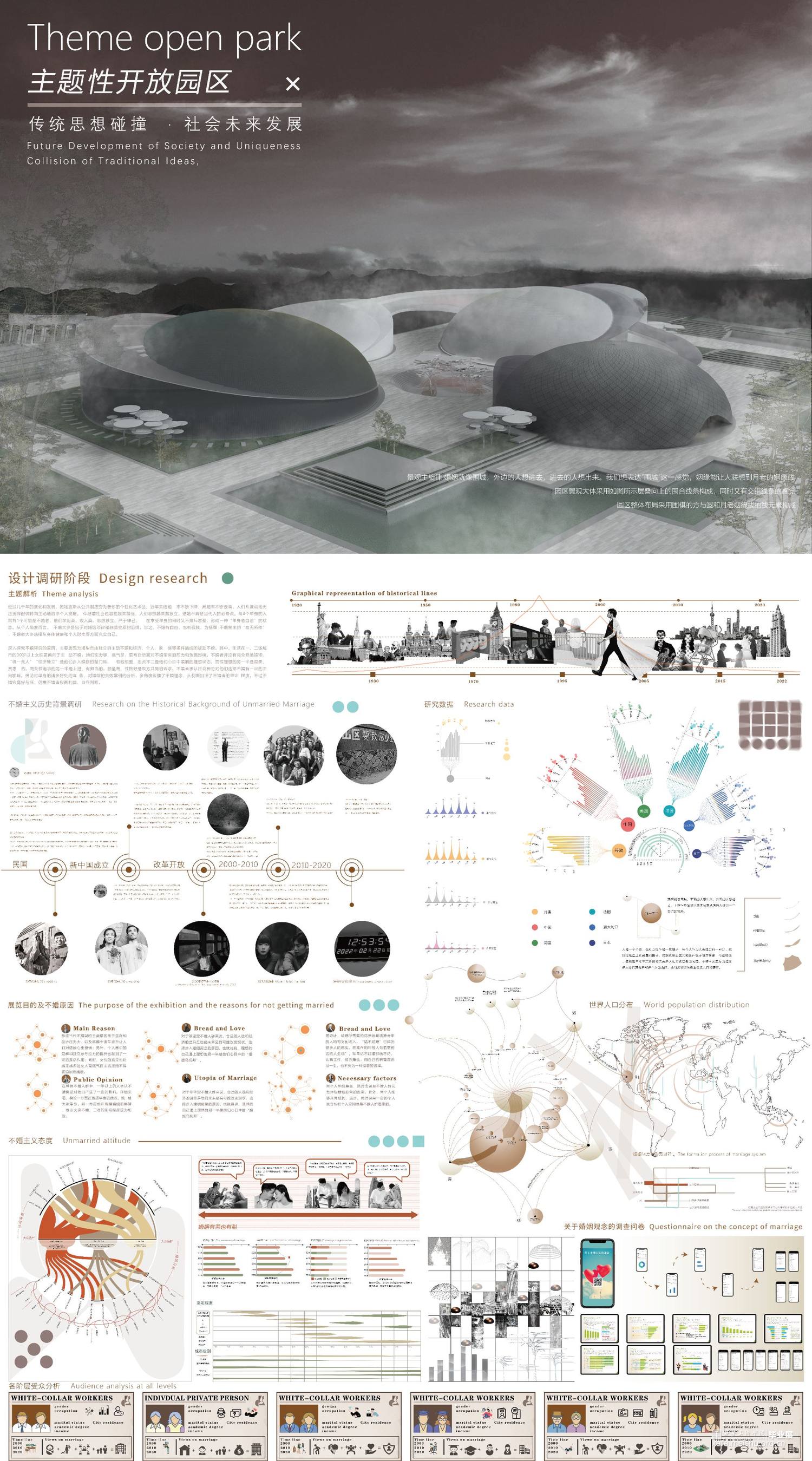 “独一无二”婚姻观念主题性展示空间想要表达的是婚姻就像围城,里面的人想出来,外面的人想进去,主题性场馆设计及周边景观想给人提供一个交流的场所。人是一个个体,也可以比作是一枚棋子,每个人作为人类社会的一部分,就好比棋盘上的部署的棋子,婚姻的状态其实和黑白棋子博弈相像,你进我退,最终能否和平共处实现共赢是人们应该思考的问题,不婚主义展厅的理念是无论结婚与否都是个人的选择,我们应该以积极的态度去面对婚姻。
